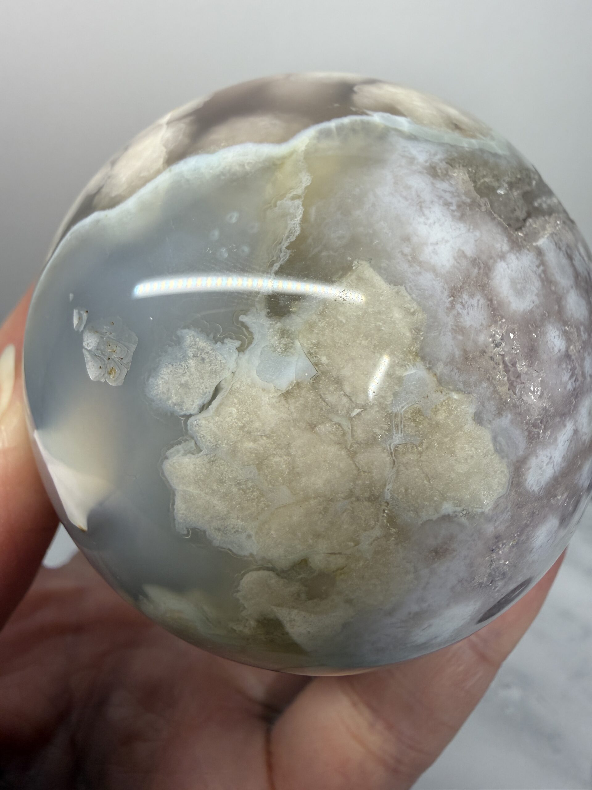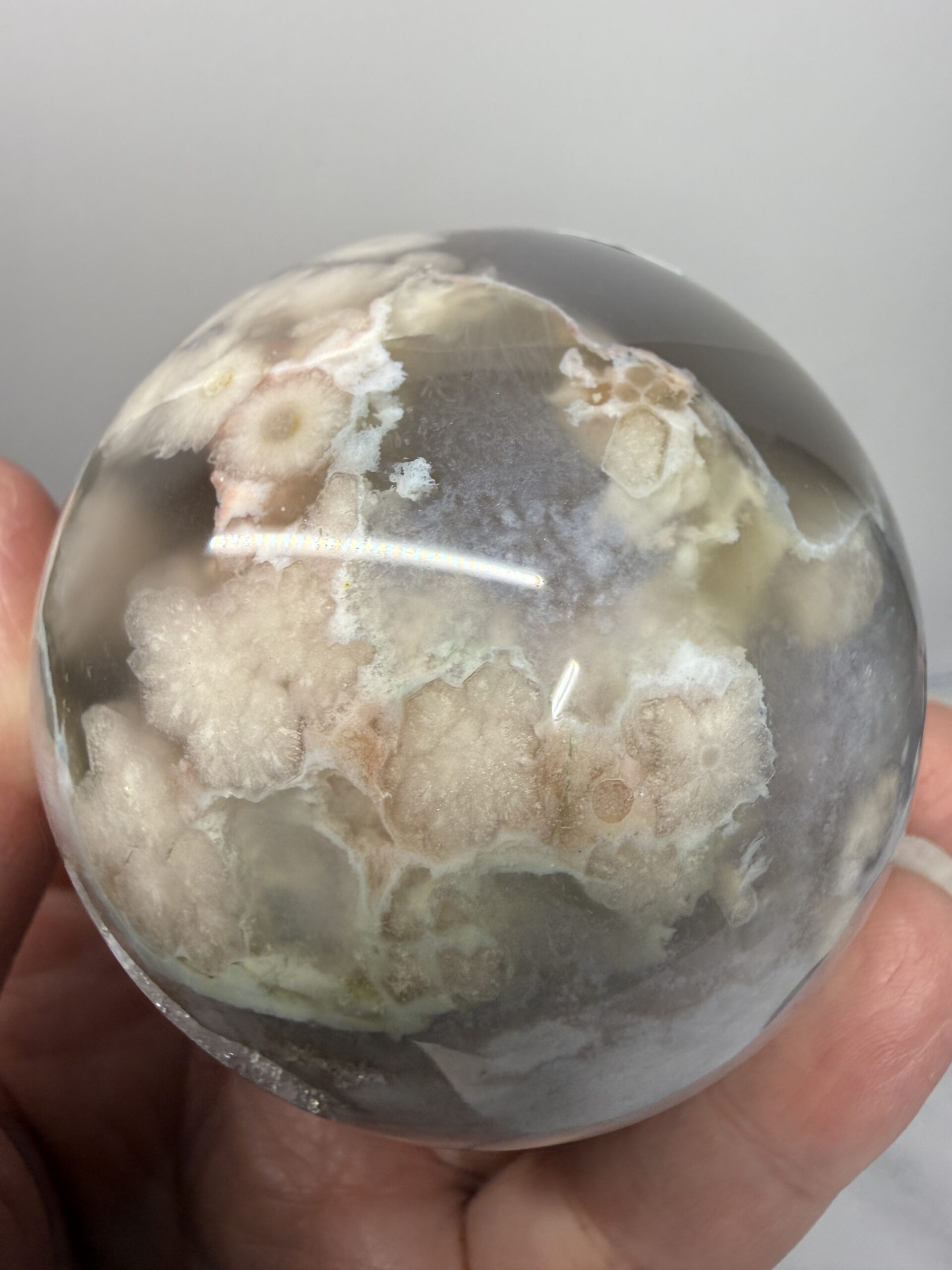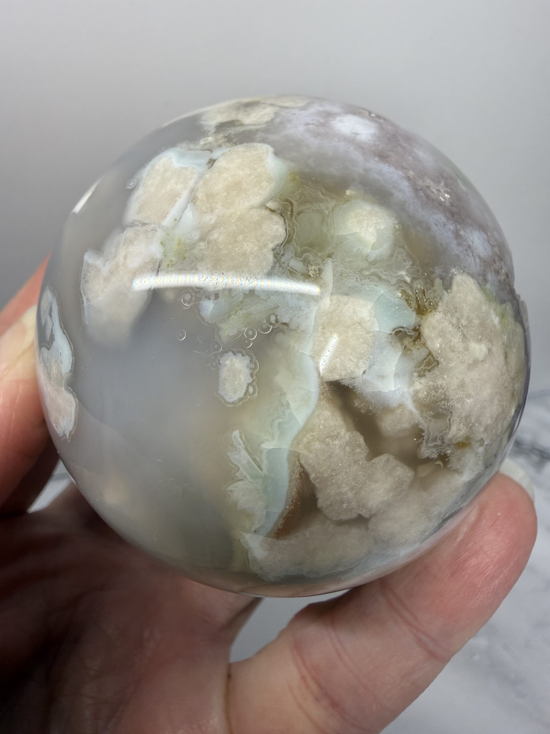 Blue Green Flower Agate is a rare variety of chalcedony with inclusions resembling floral formations, typically displaying soothing tones of light blue, grey, and soft green with cream-colored “blossoms”. Primarily found in Madagascar, this calming stone promotes peace, emotional healing, and personal growth.Â