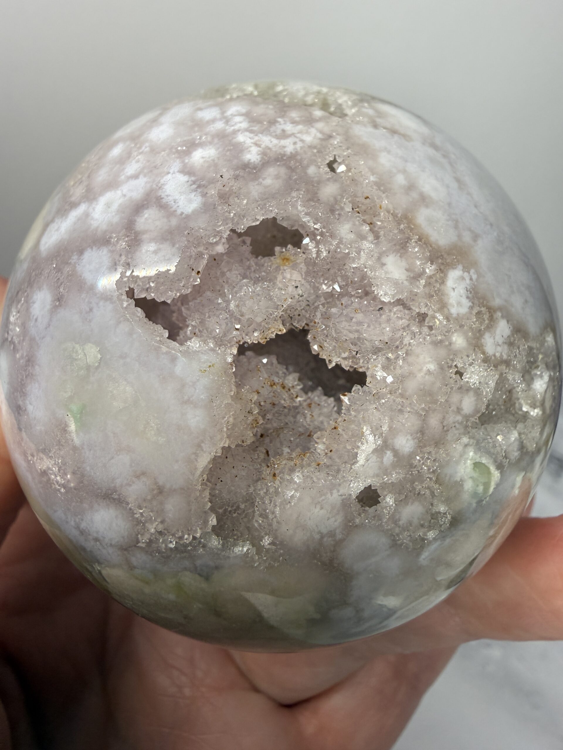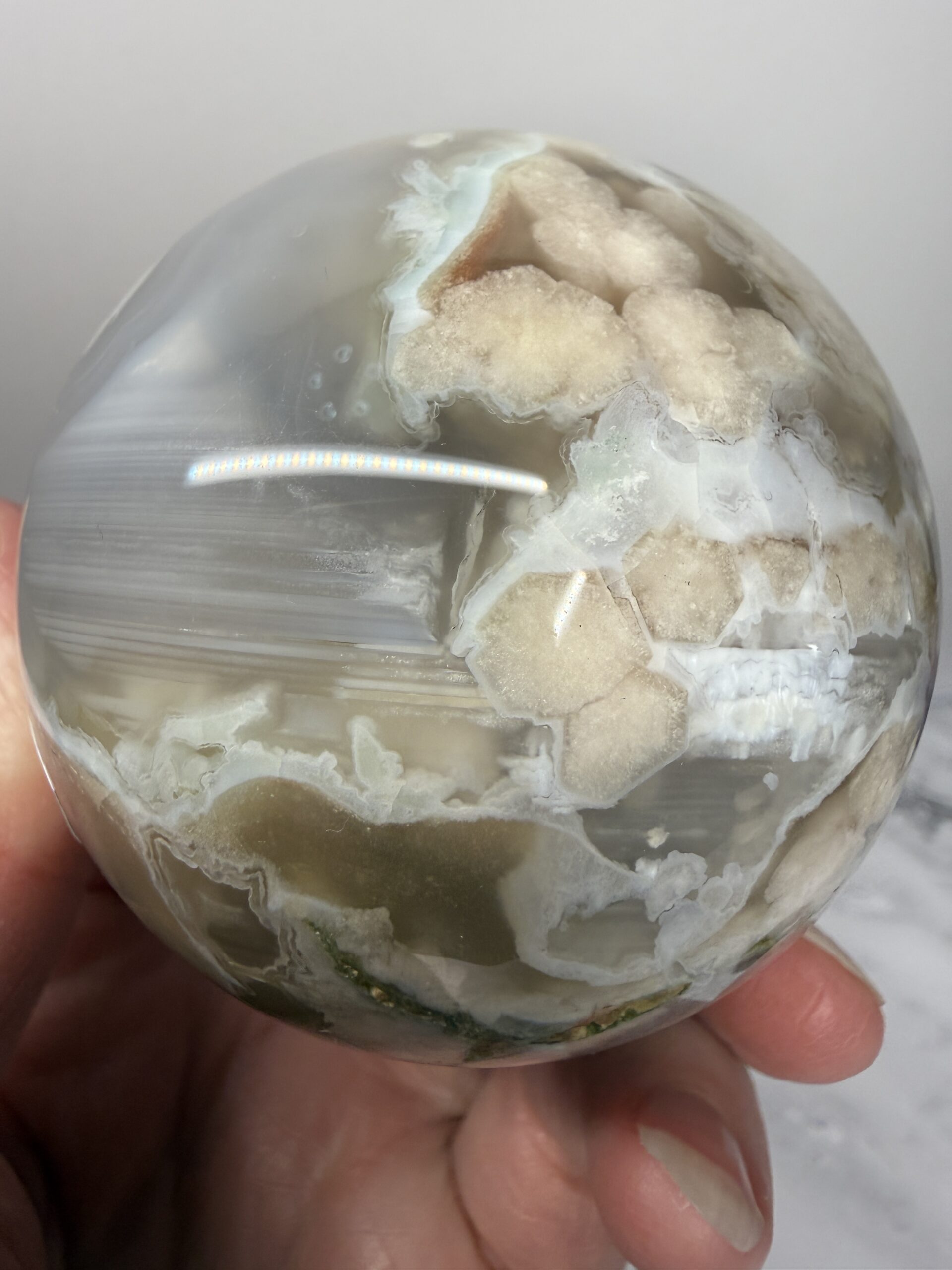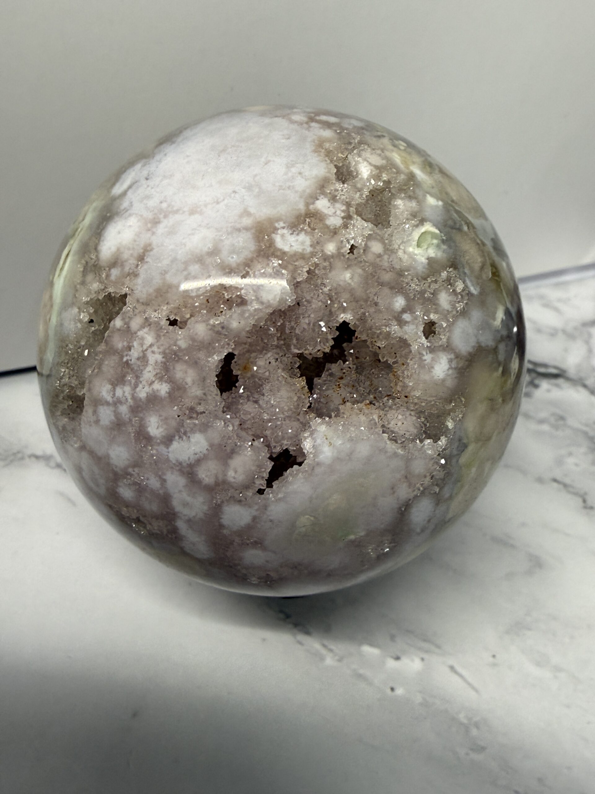 Blue Green Flower Agate is a rare variety of chalcedony with inclusions resembling floral formations, typically displaying soothing tones of light blue, grey, and soft green with cream-colored “blossoms”. Primarily found in Madagascar, this calming stone promotes peace, emotional healing, and personal growth.Â