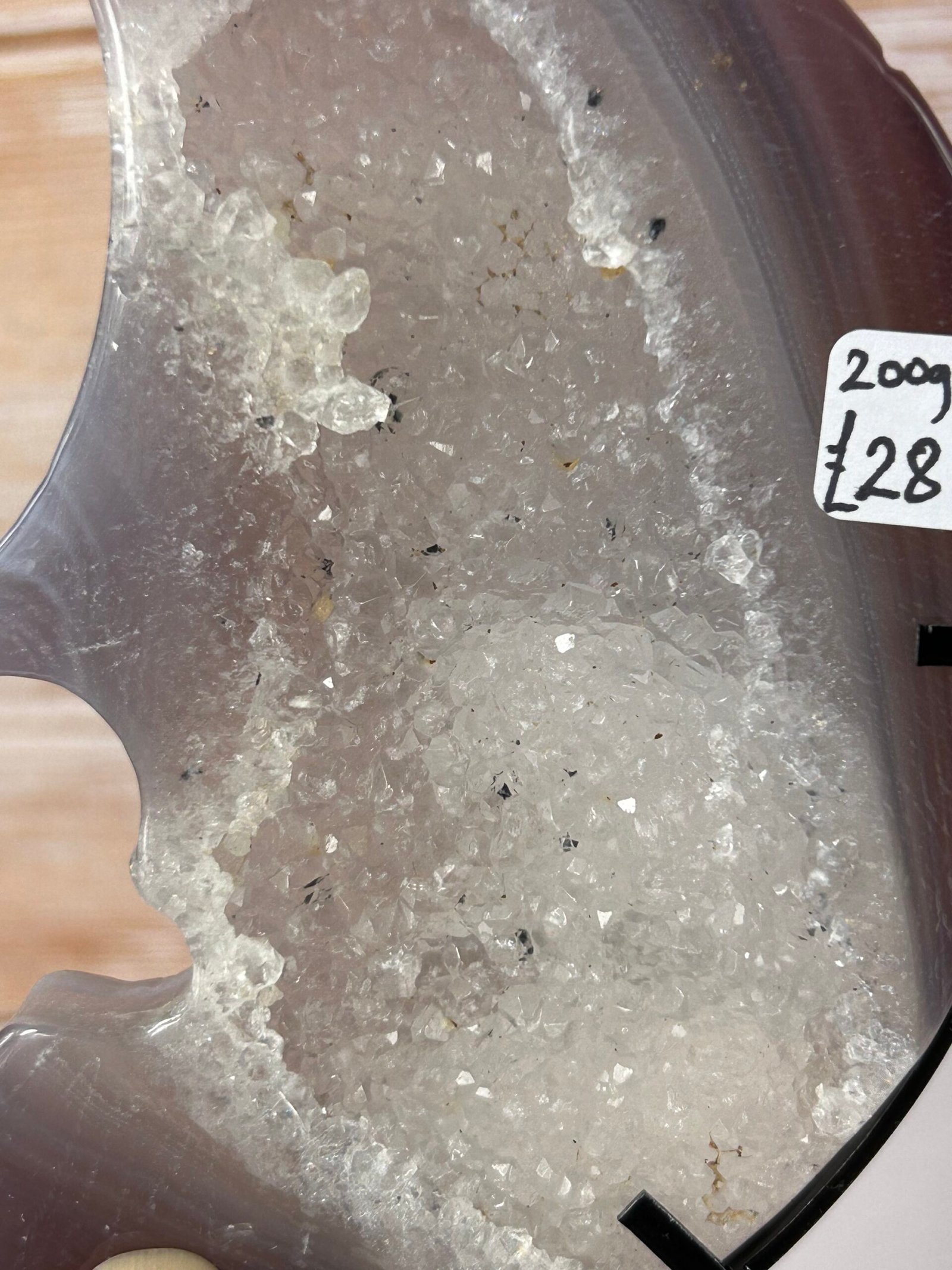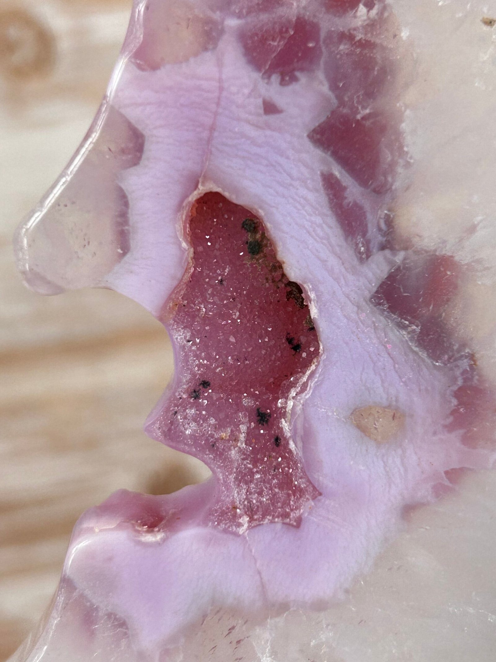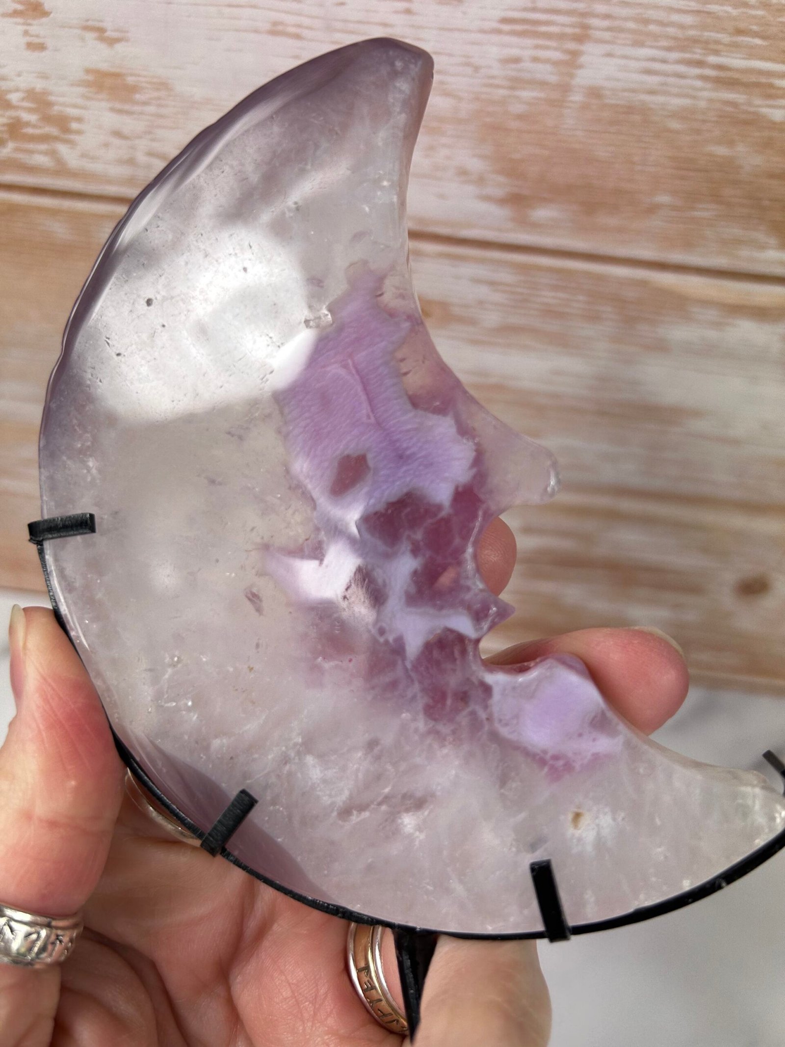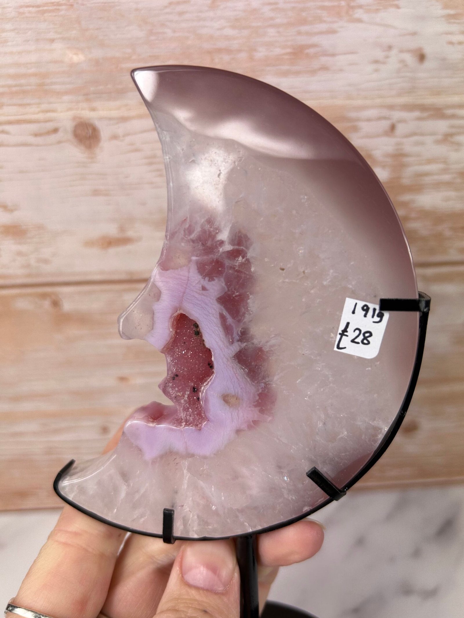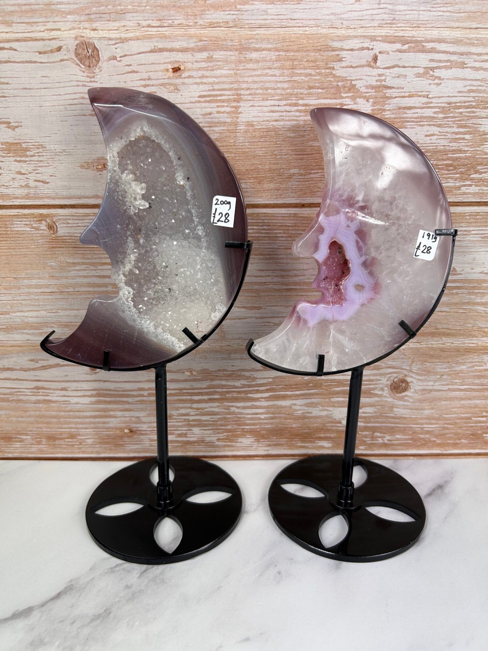 These beautiful crescent moons with sparkly druse centres have been enhanced with pink/purple to bring out the banding.