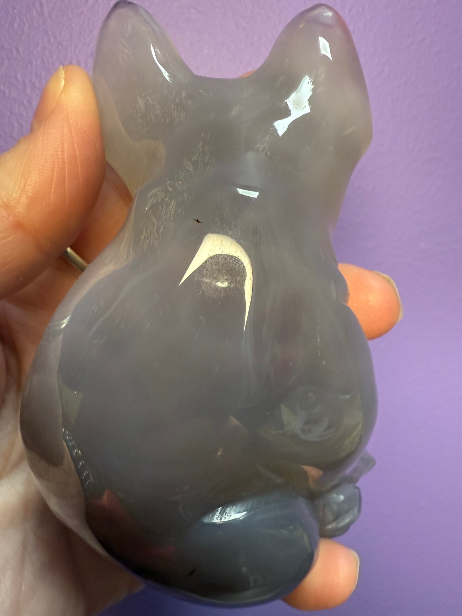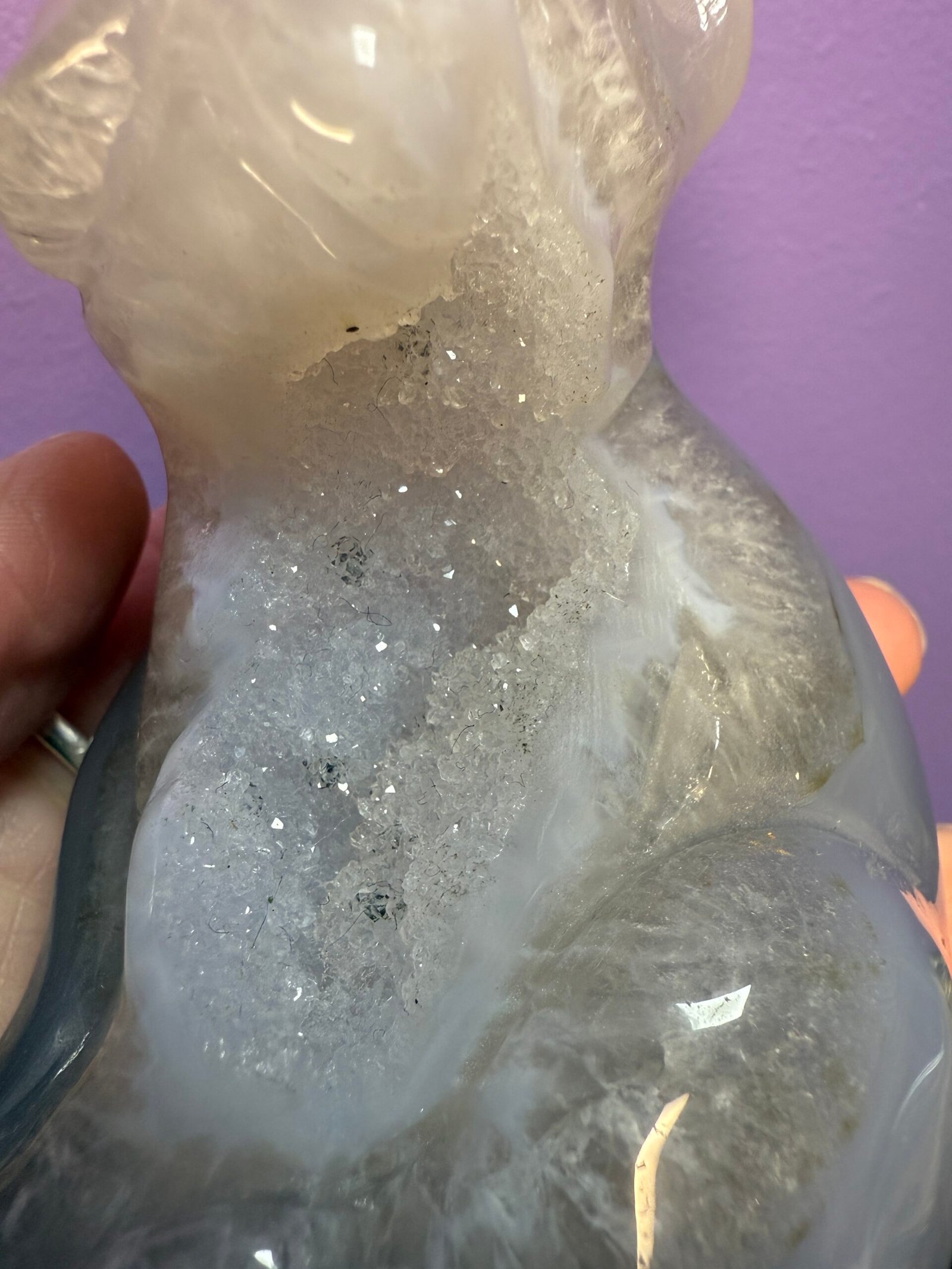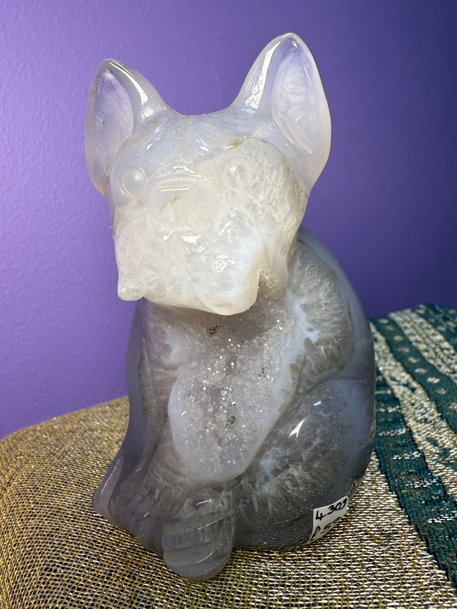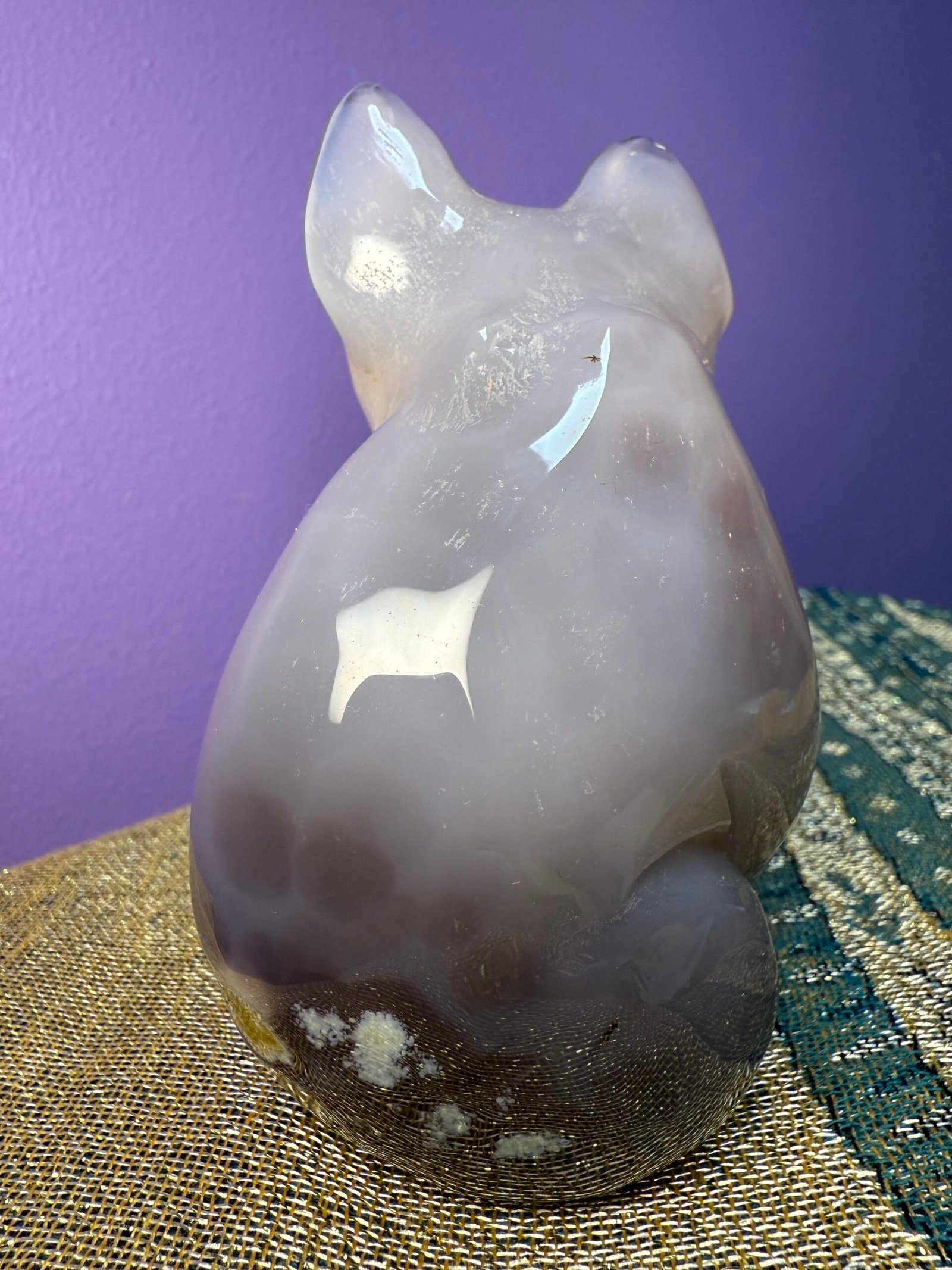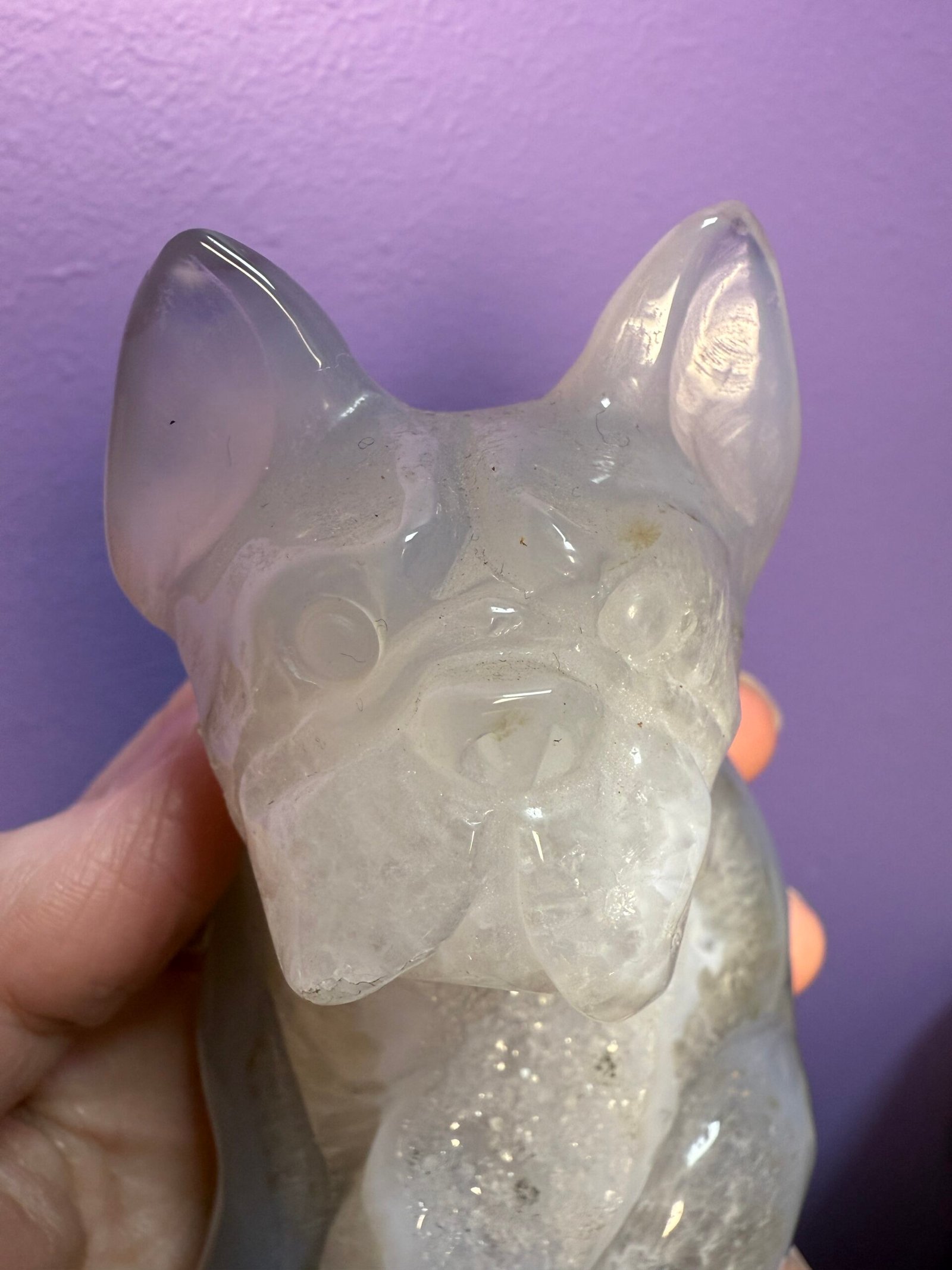 This beautiful Agate dog, possibly a French bull dog, has a sparkling druse belly.