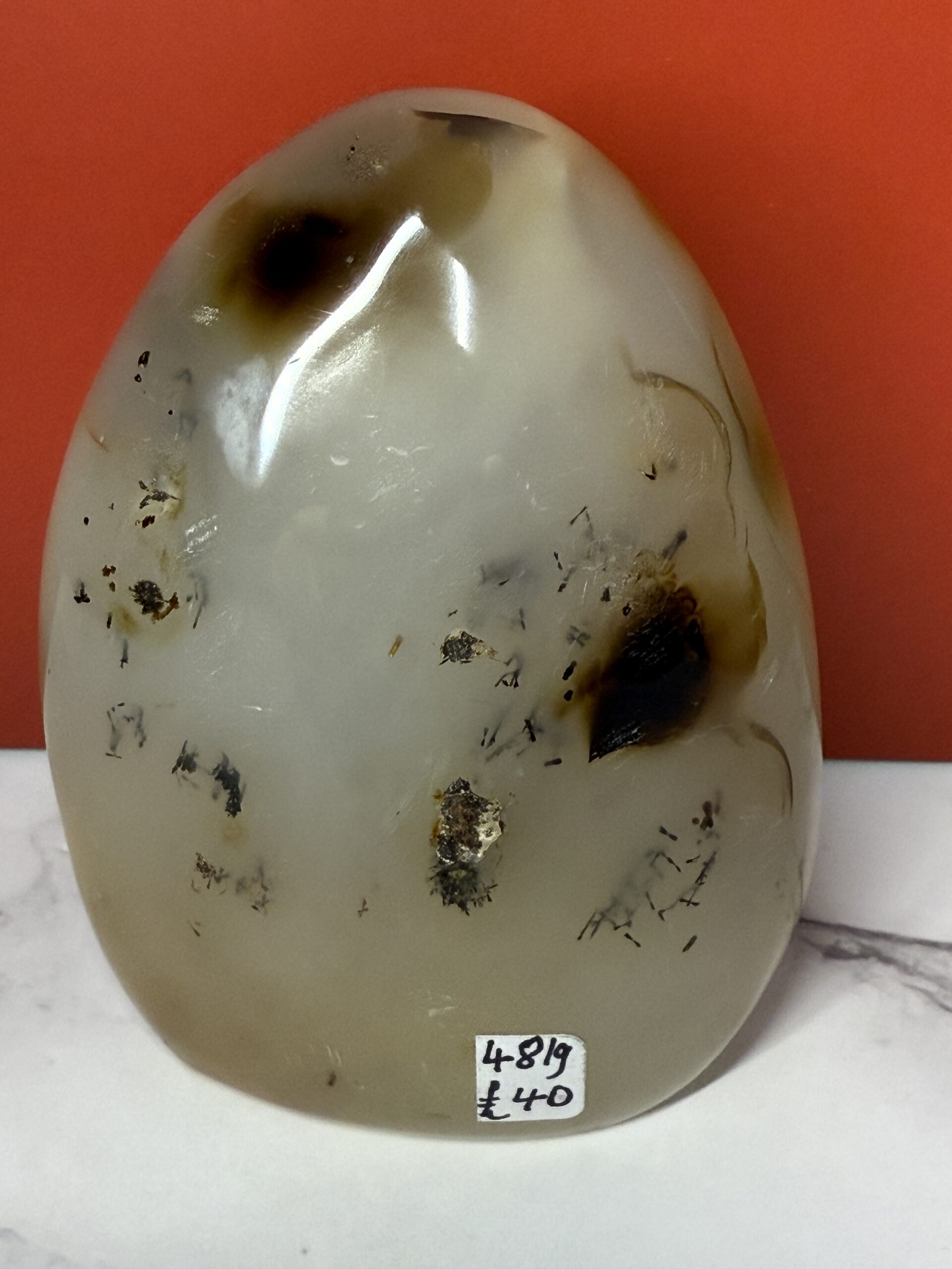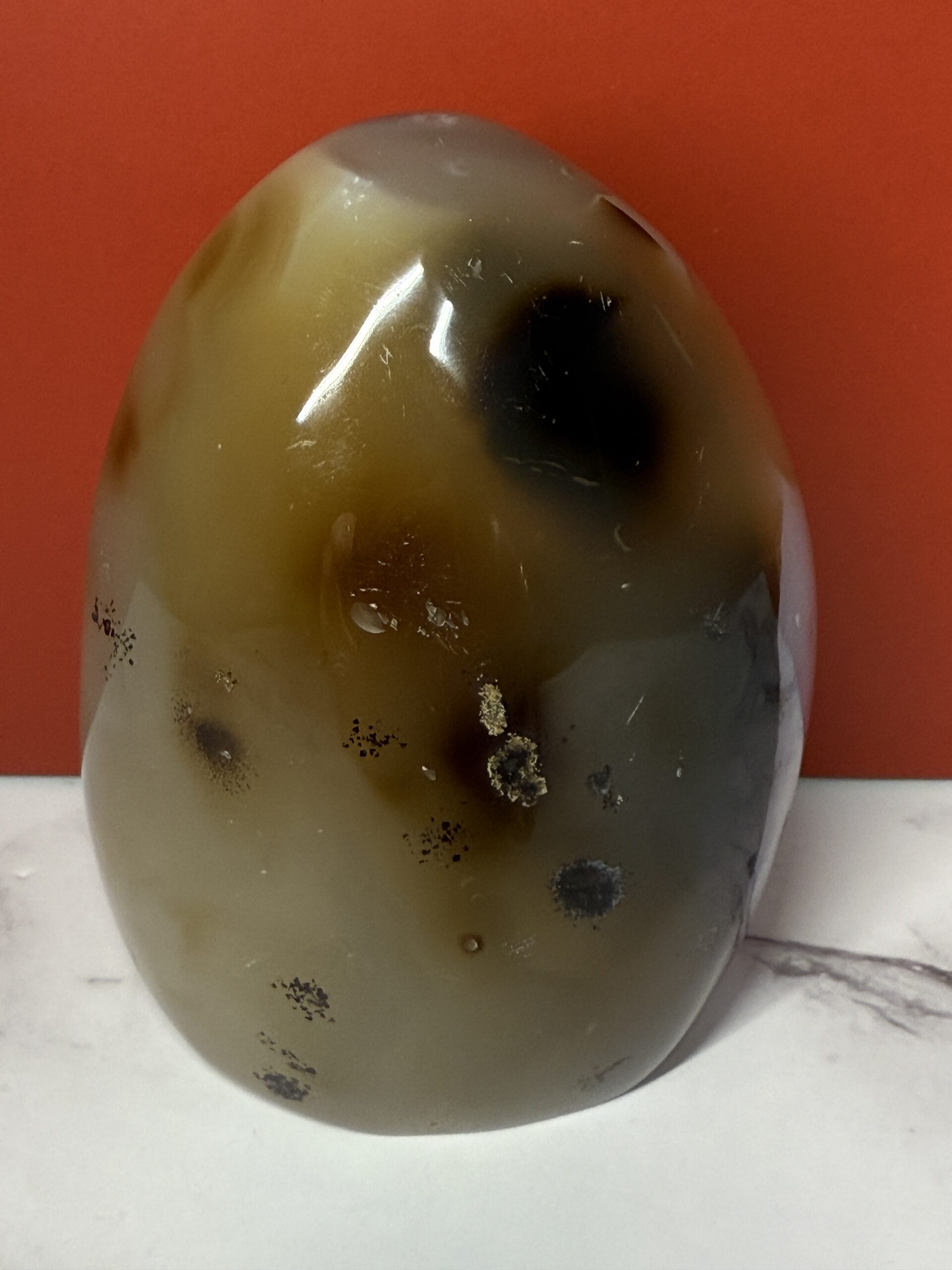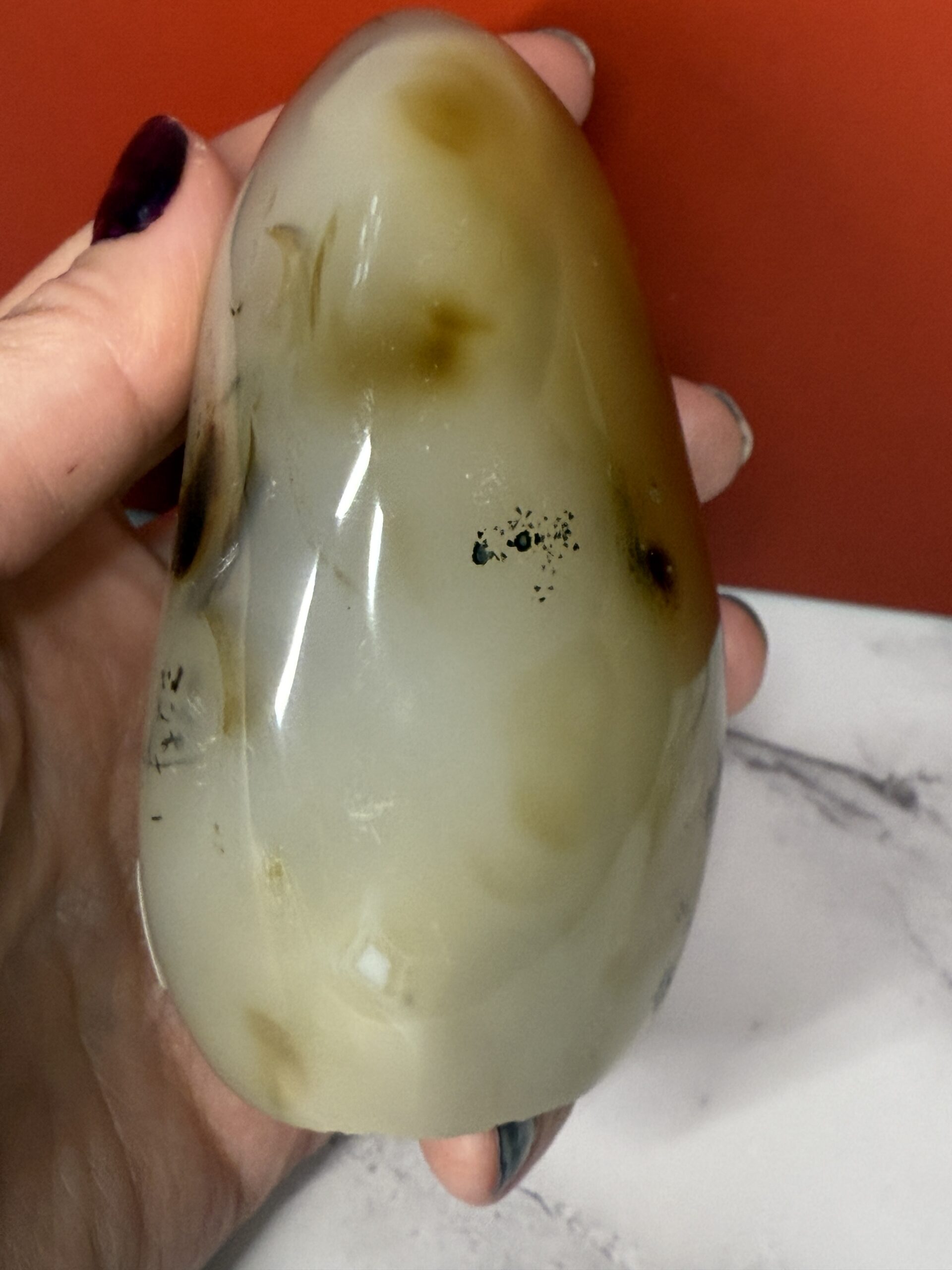 this beautiful freeform has lovely dendritic inclusions and banding.