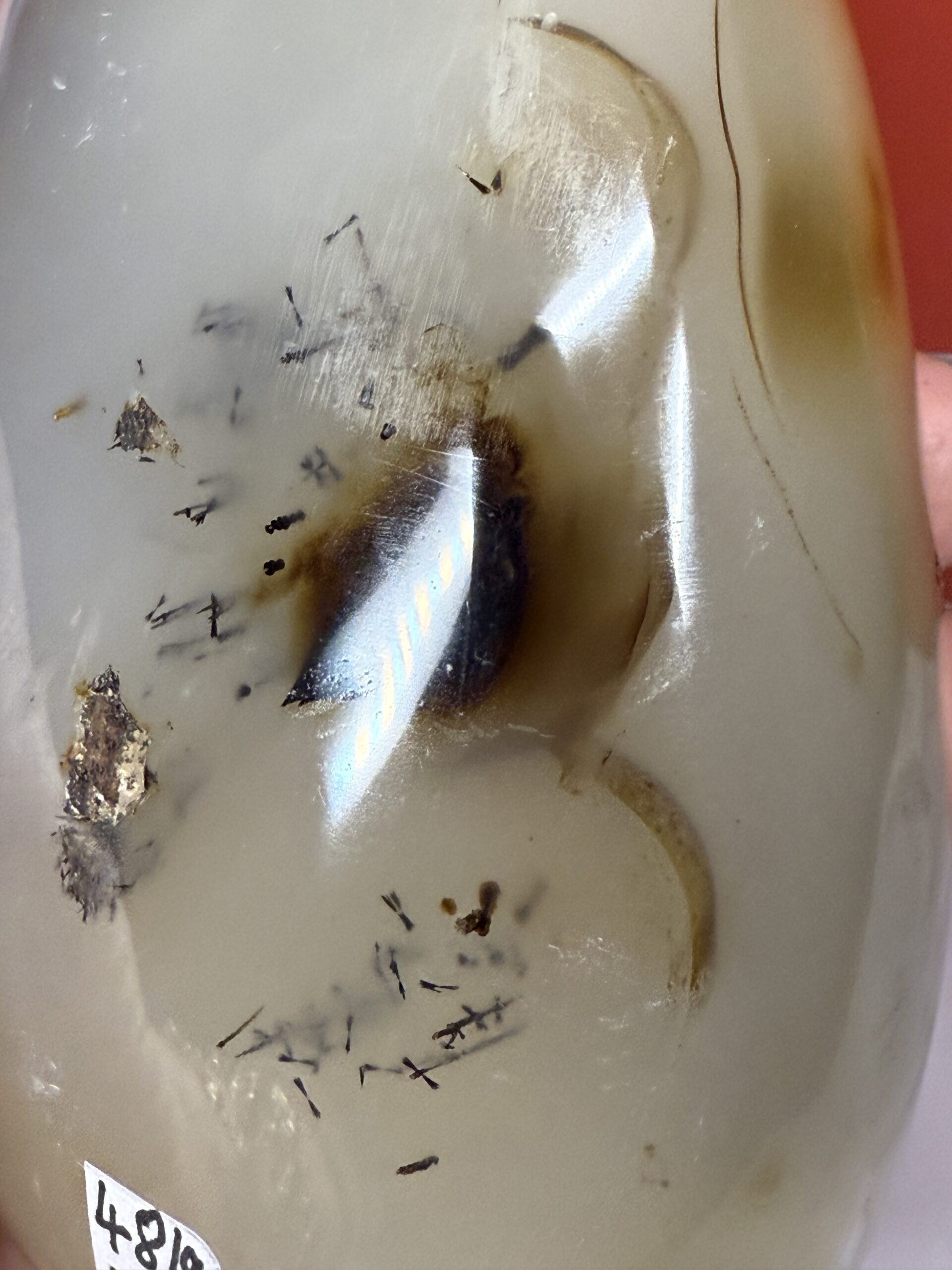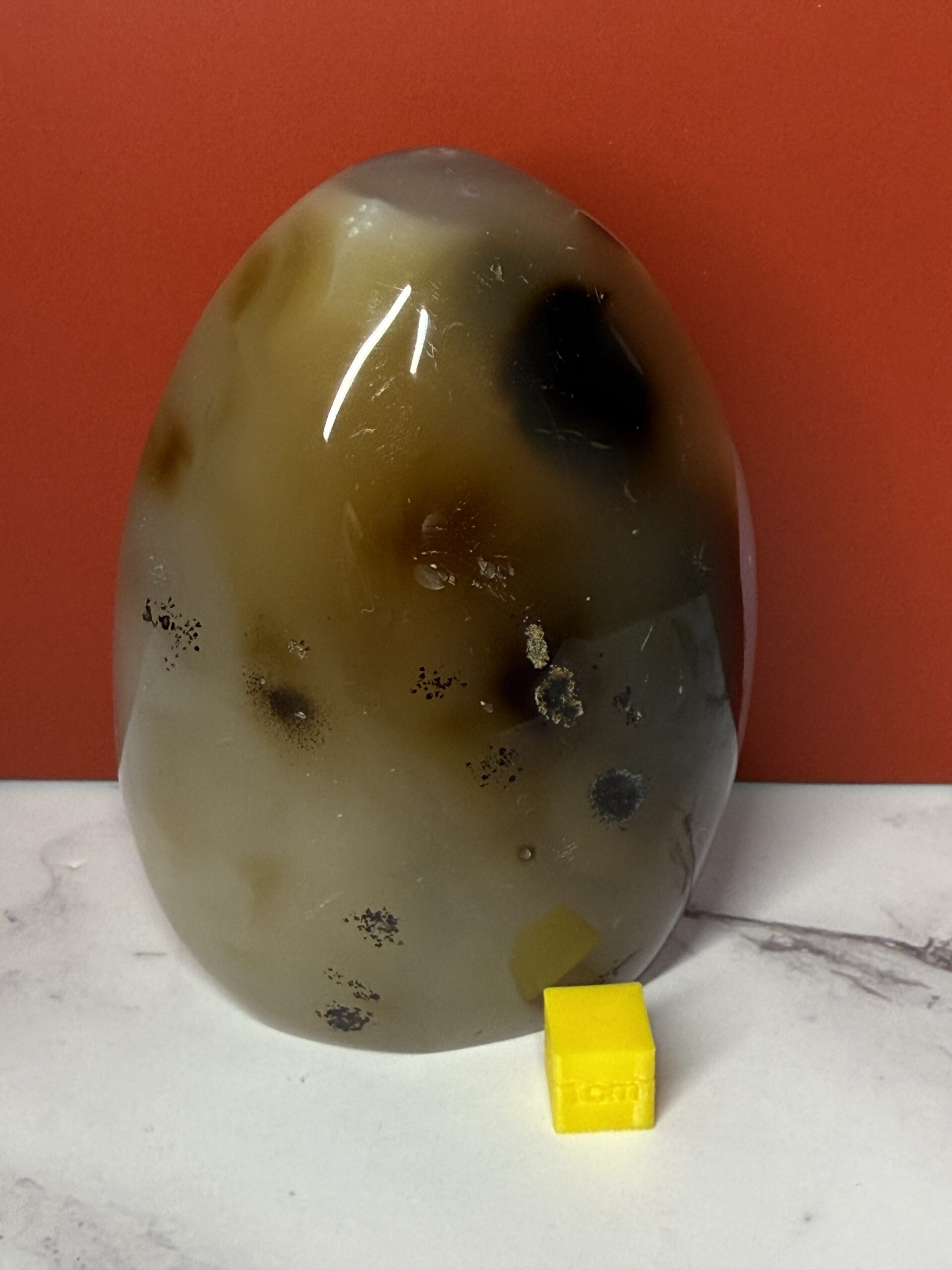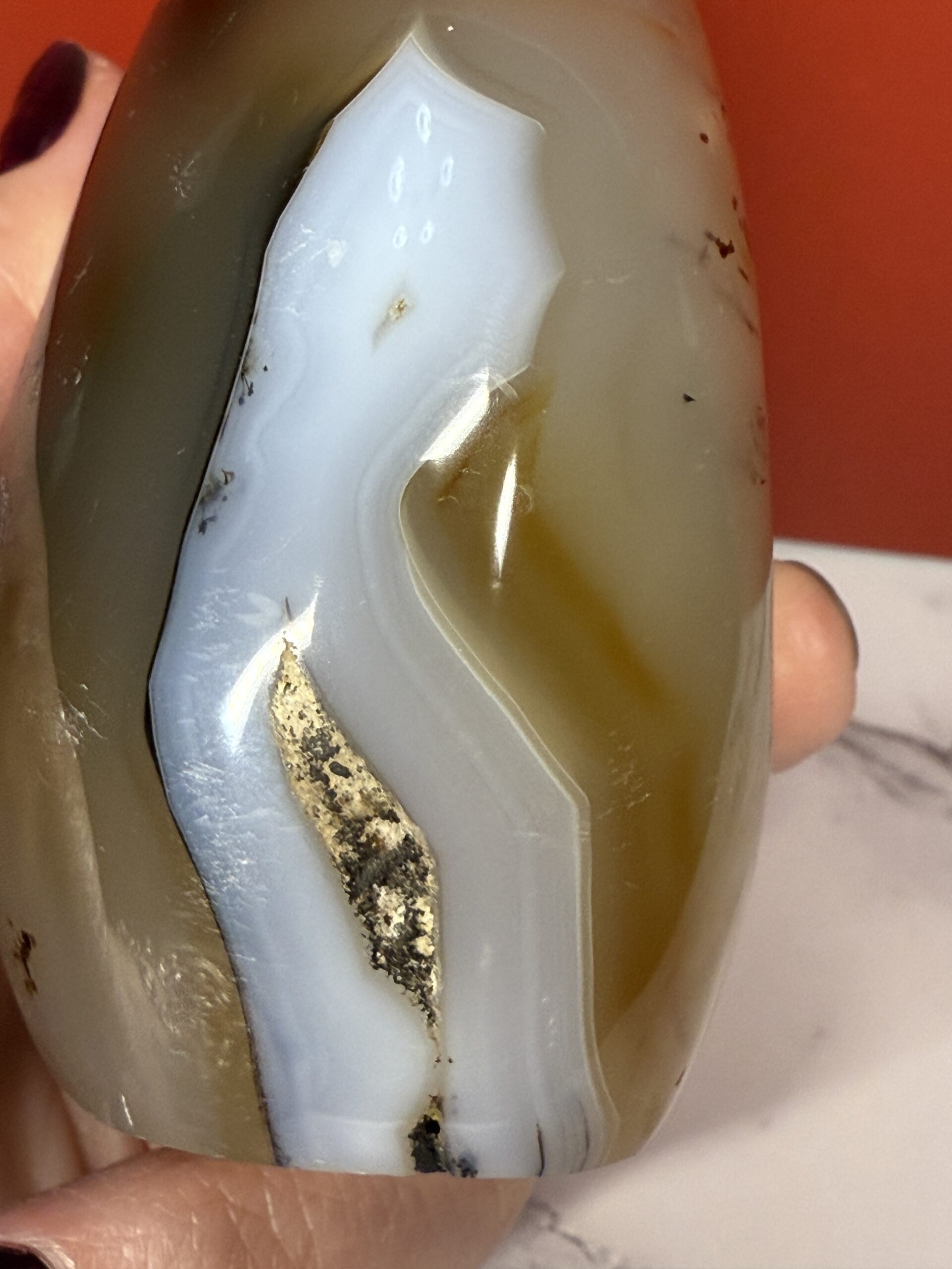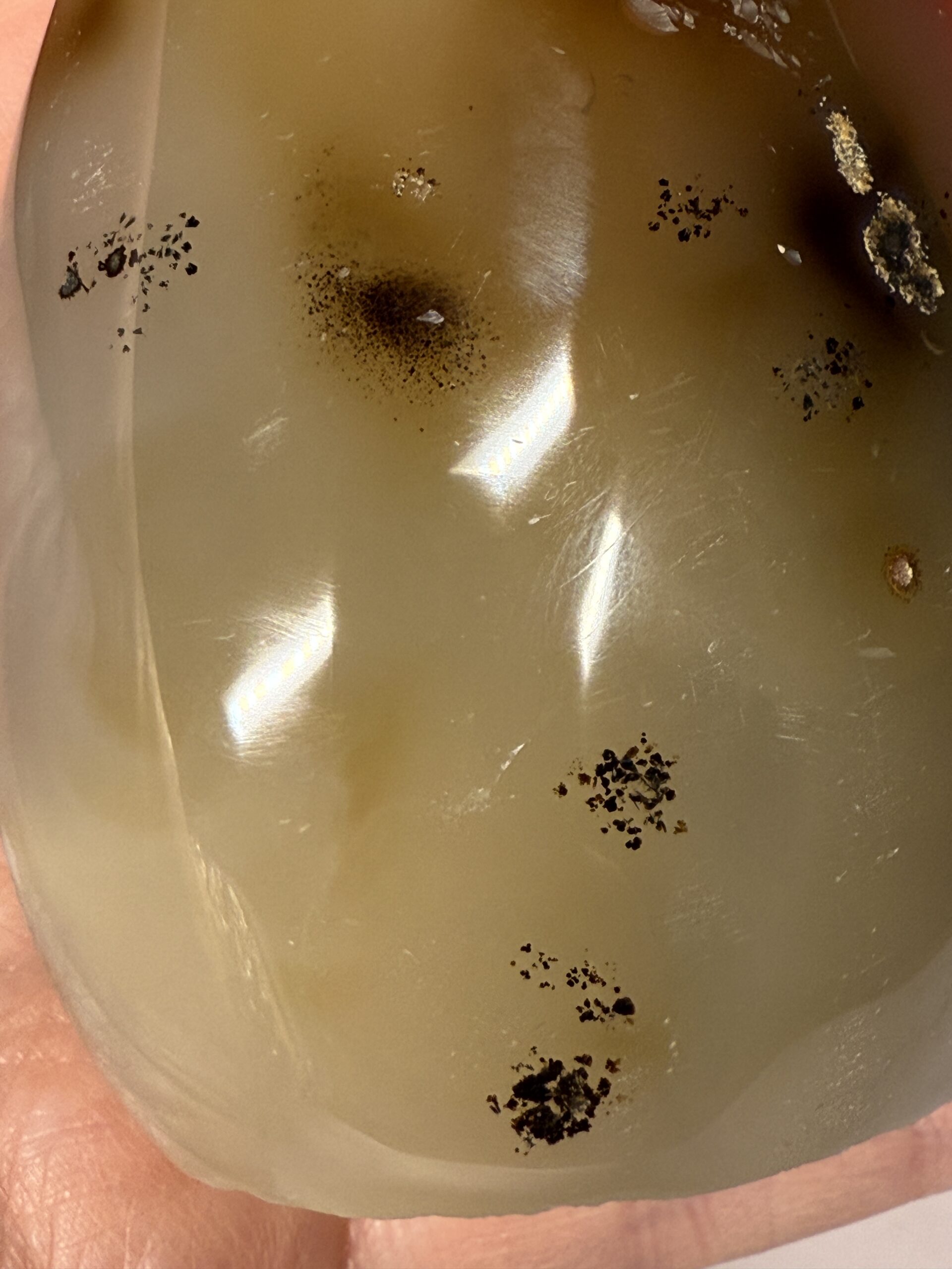 this beautiful freeform has lovely dendritic inclusions and banding.
