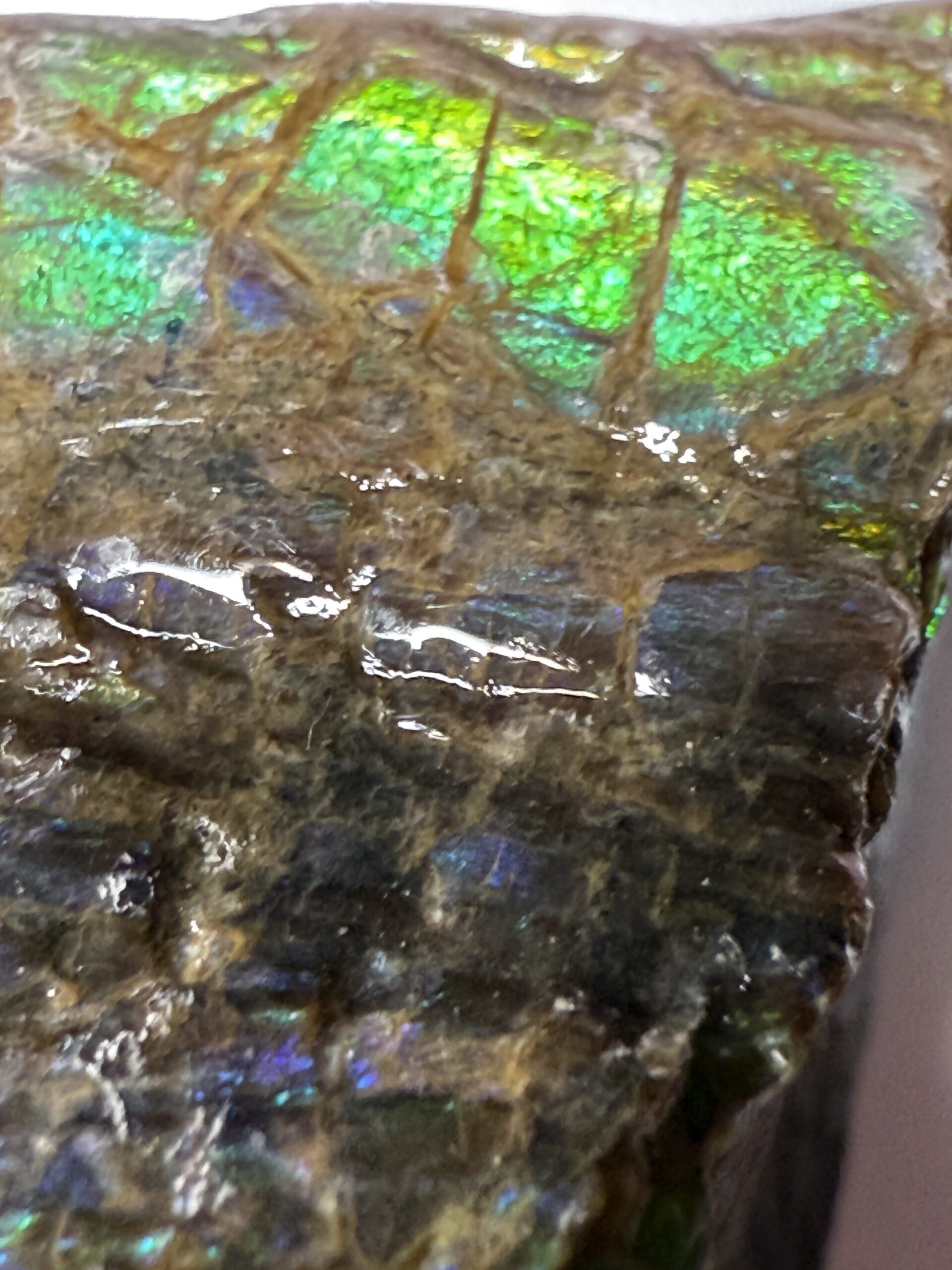 Ammolite is composed of the fossilised shells of Ammonites. The different layers of the shell, which is formed of Aragonite, yield different colours – blues and purples are the top layers, which are the hardest to find as they are the first ones to erode or get damaged. Then comes greens and yellows, and finally reds are the deepest layer.