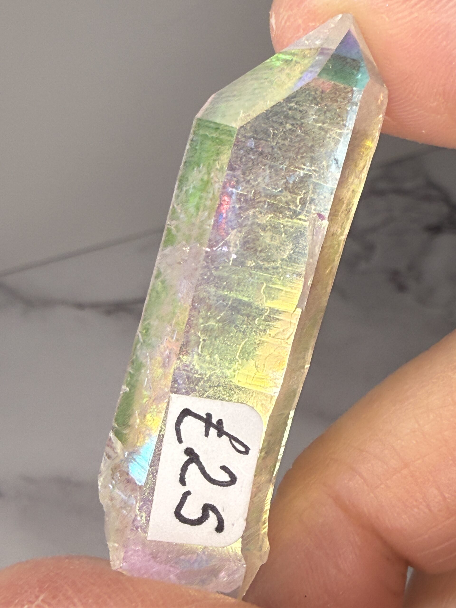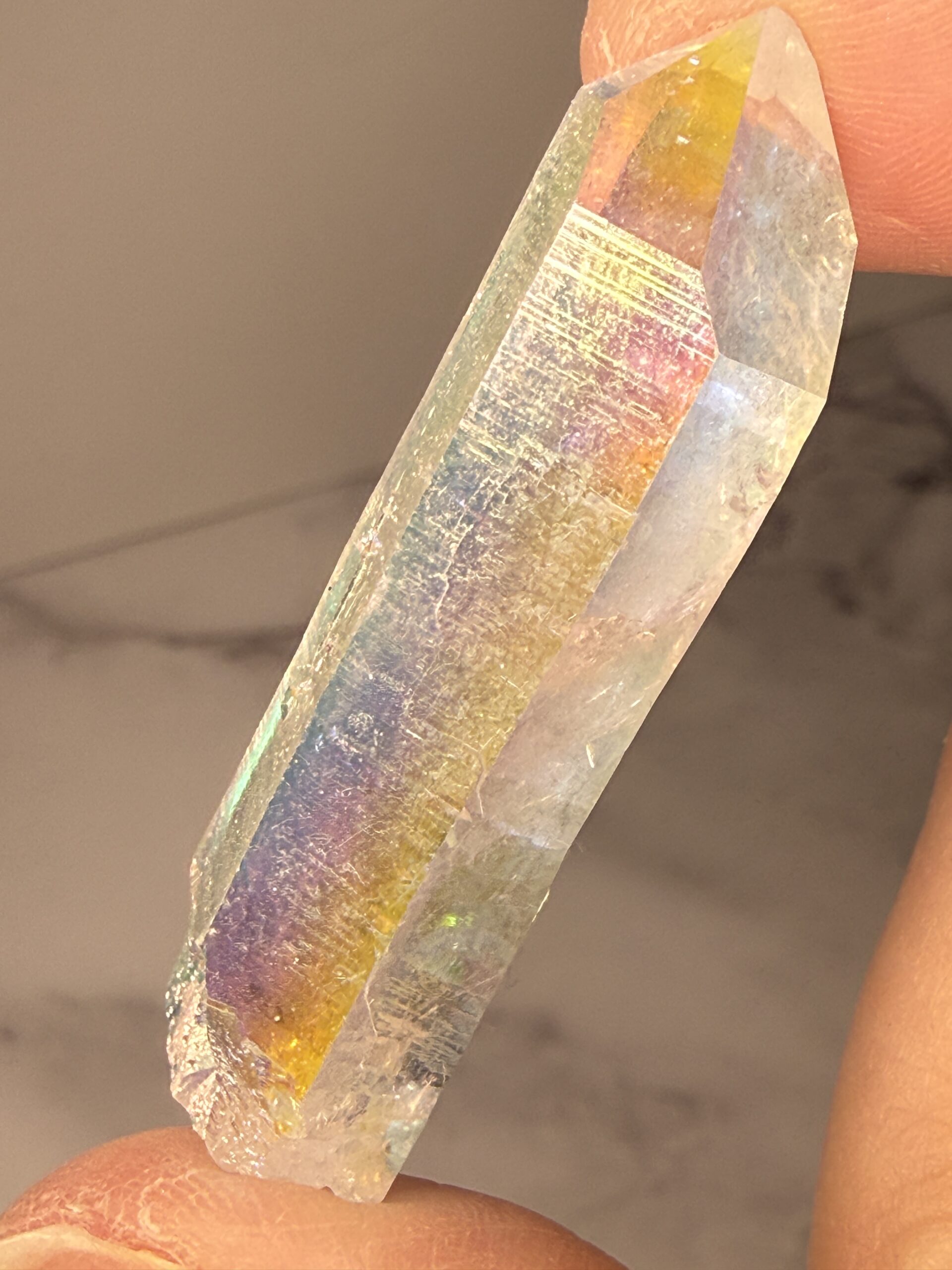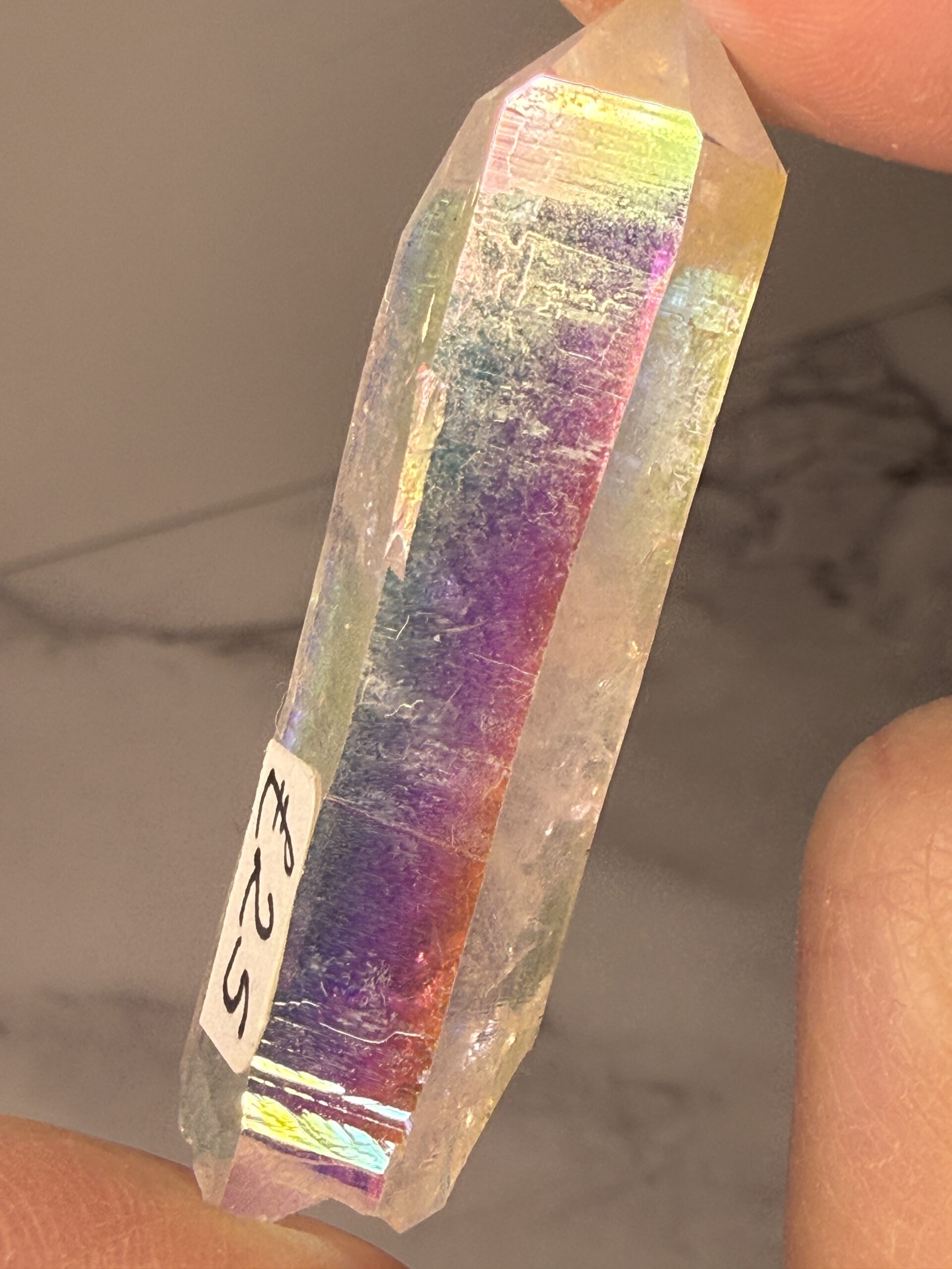 Angel Aura Quartz is Clear Quartz which has been bonded with Platinum and Silver, sometimes Gold or other trace metals.