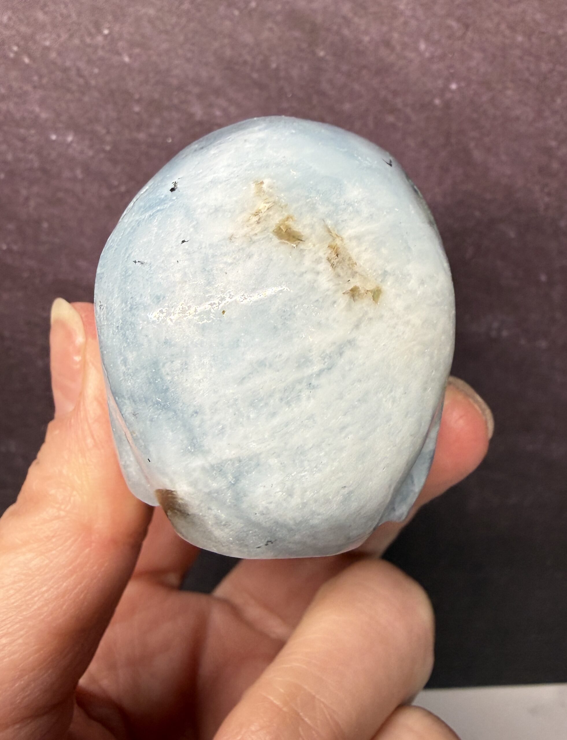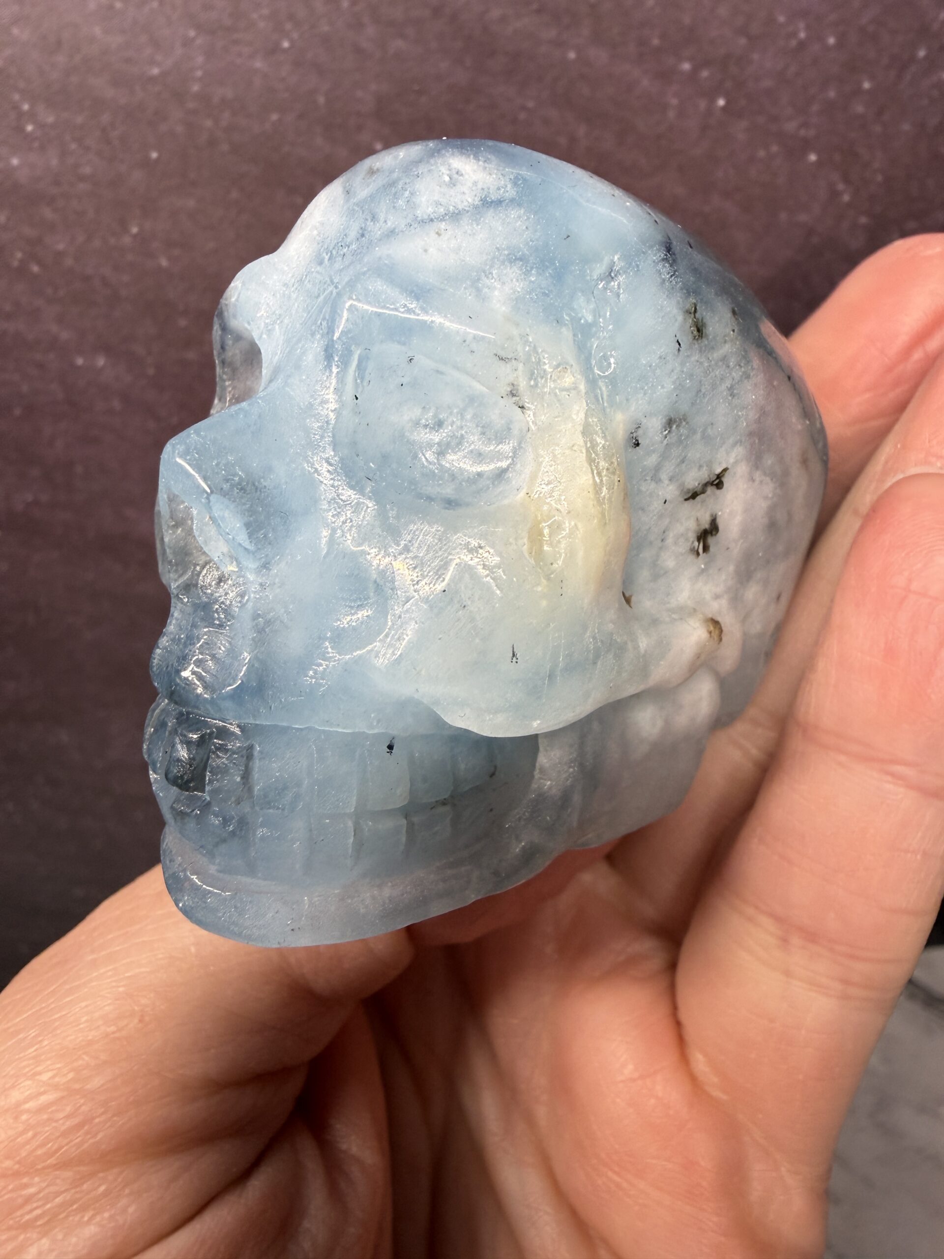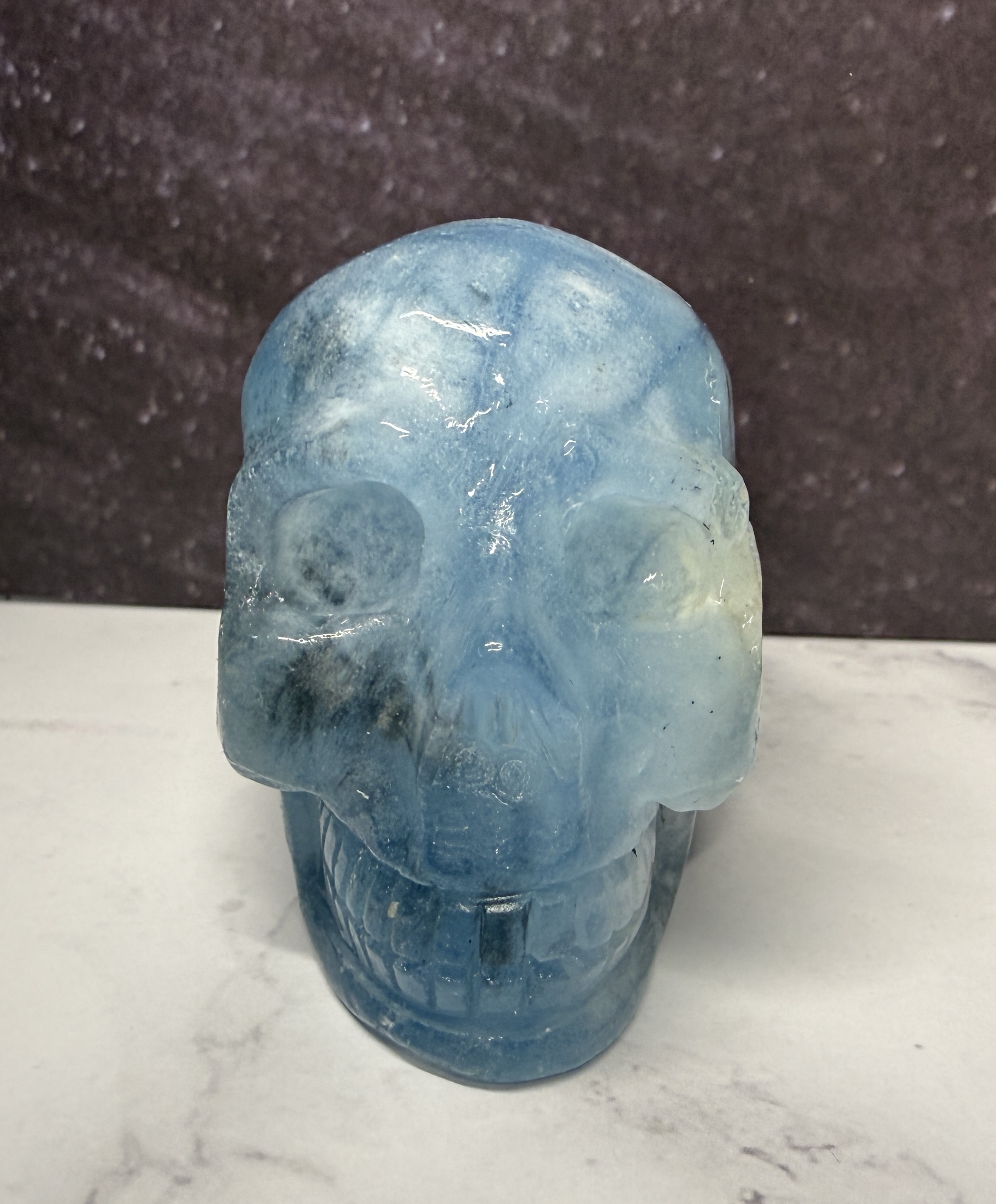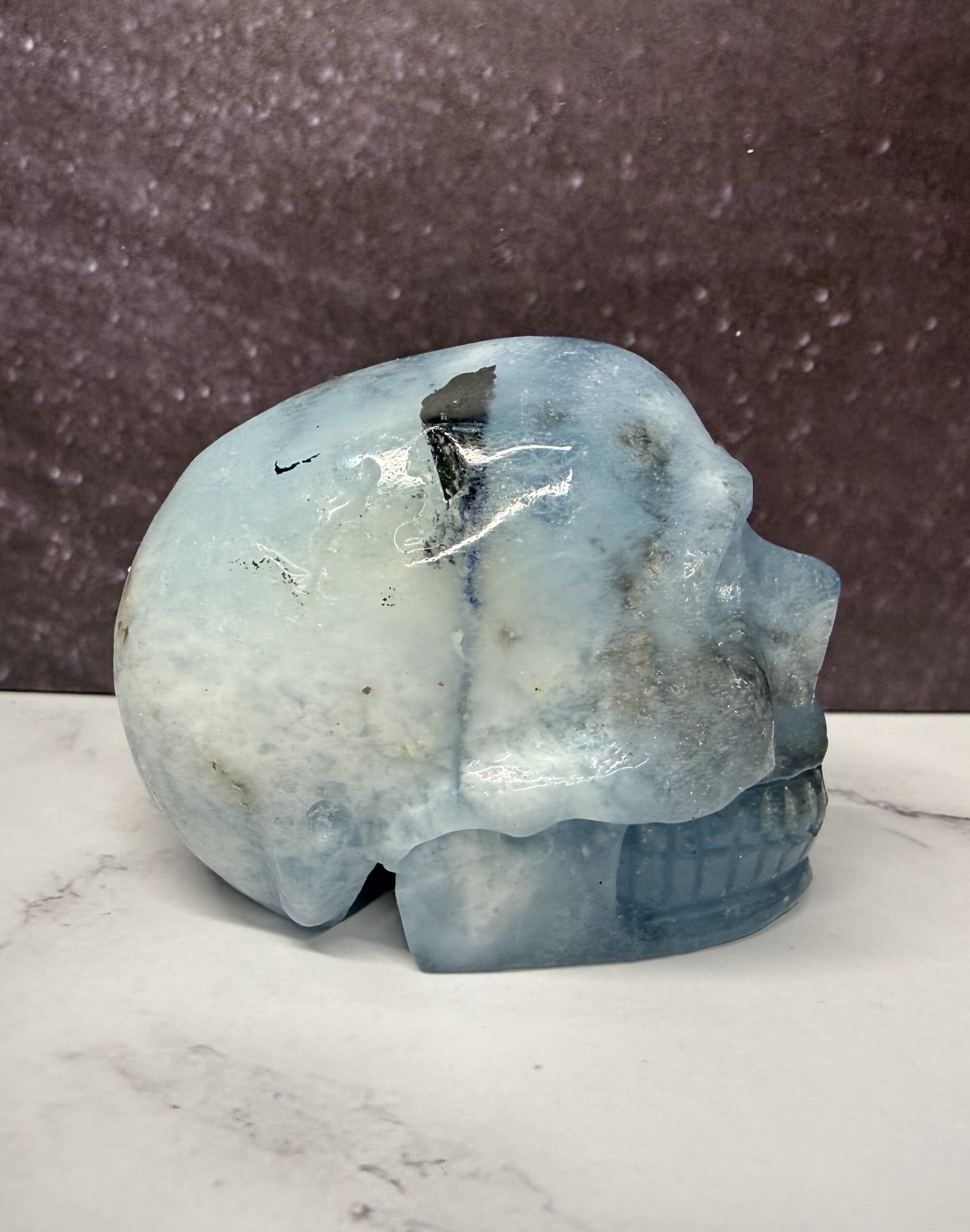 This beautiful Aquamarine skull carving has lovely inclusions, giving it an interesting and unique style.
