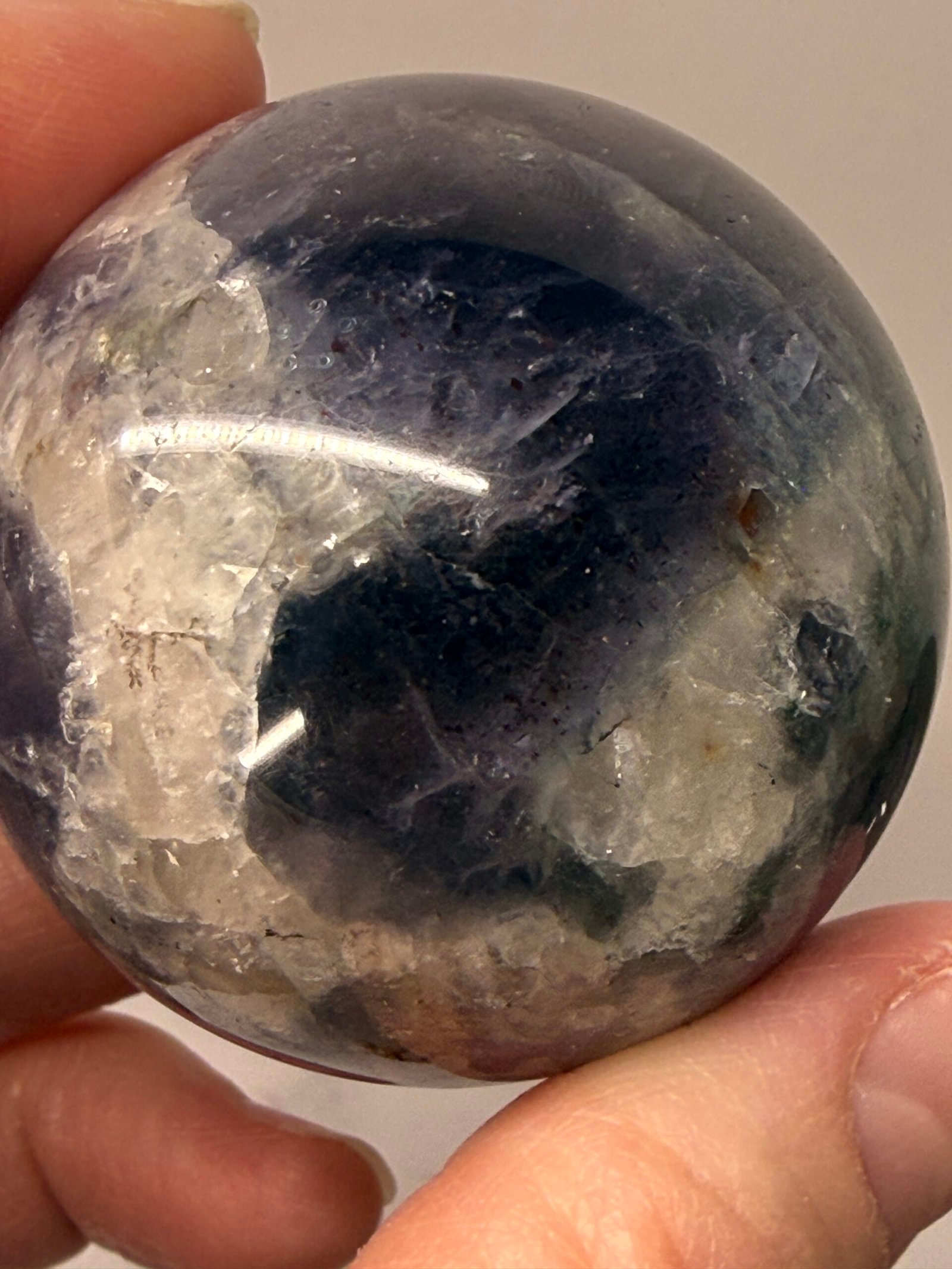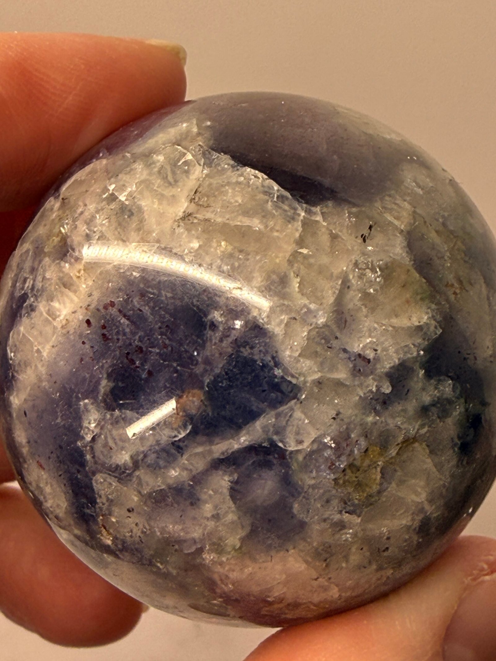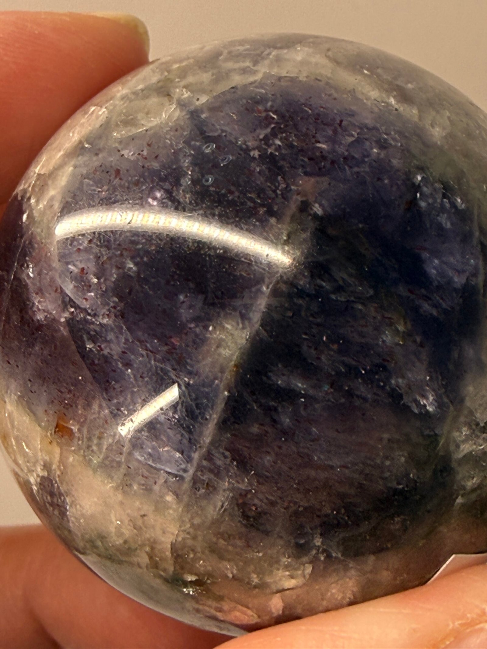 Bloodshot iolite with water sapphire refers to a specific, rare type of iolite (cordierite)that contains hematite inclusions, causing red flashes (bloodshot), while its blue-violet color and pleochroism earn it the trade name “water sapphire” due to its resemblance to sapphire but with a watery appearance. The red flashes come from hematite platelets creating sparkle (aventurescence)and the watery look is from its strong color change (pleochroism) from blue to gray/brown, distinguishing it from true sapphire.