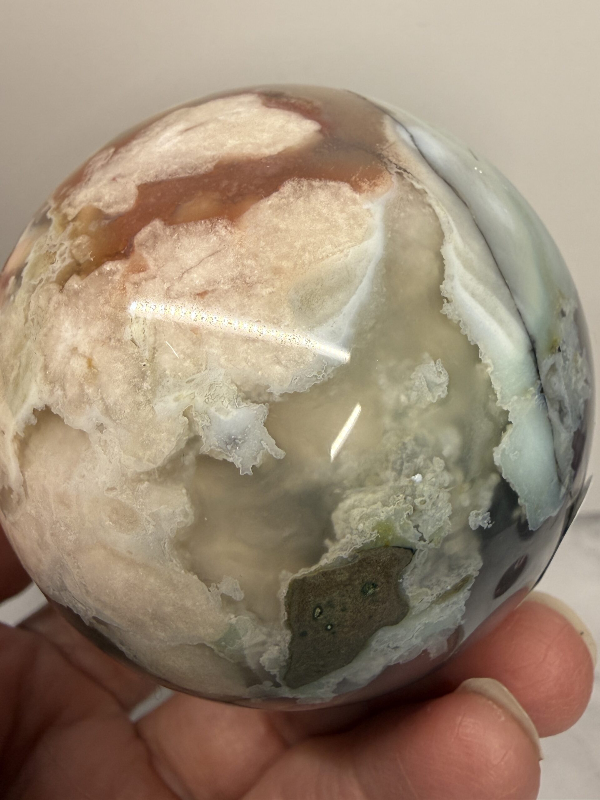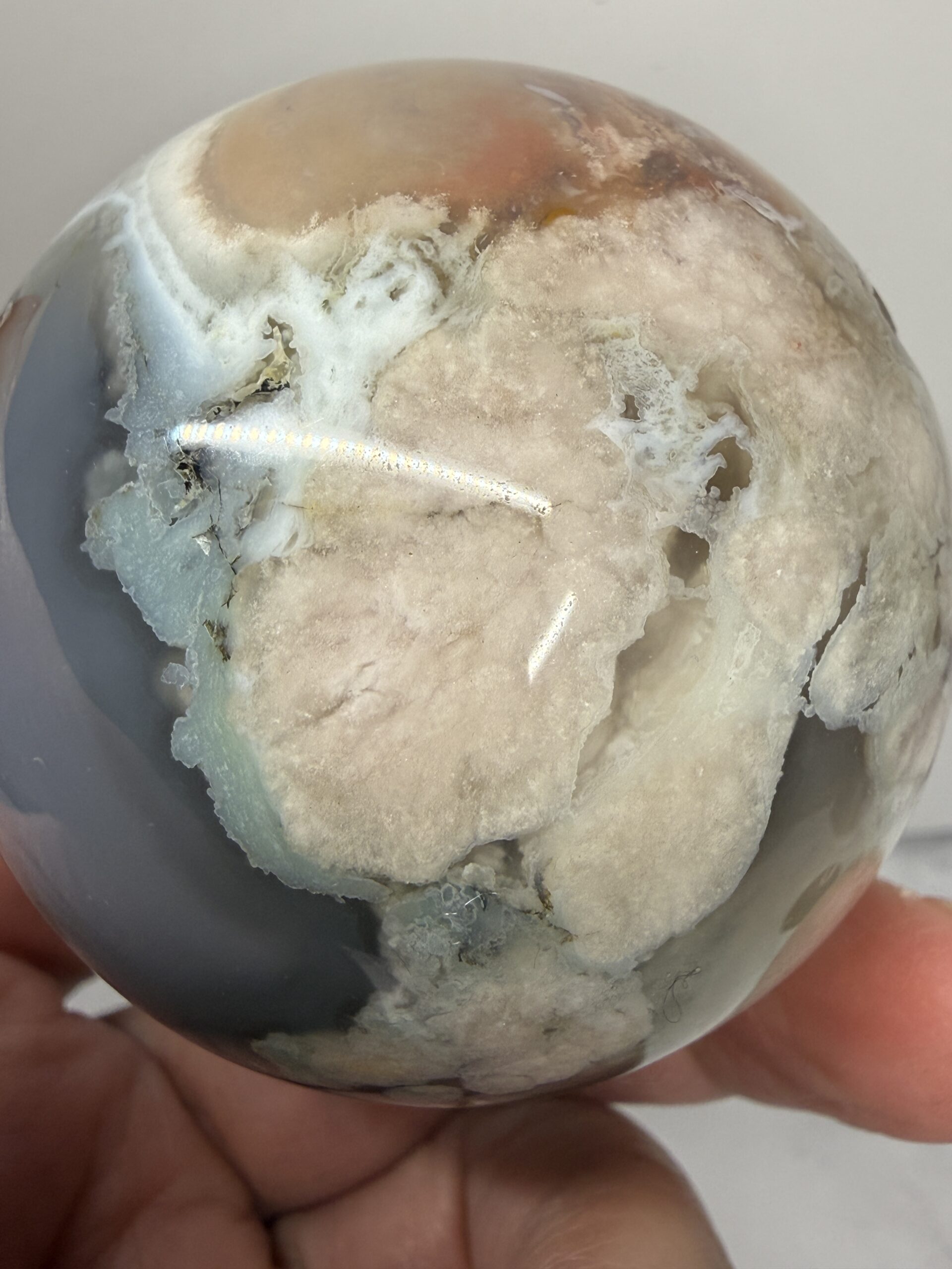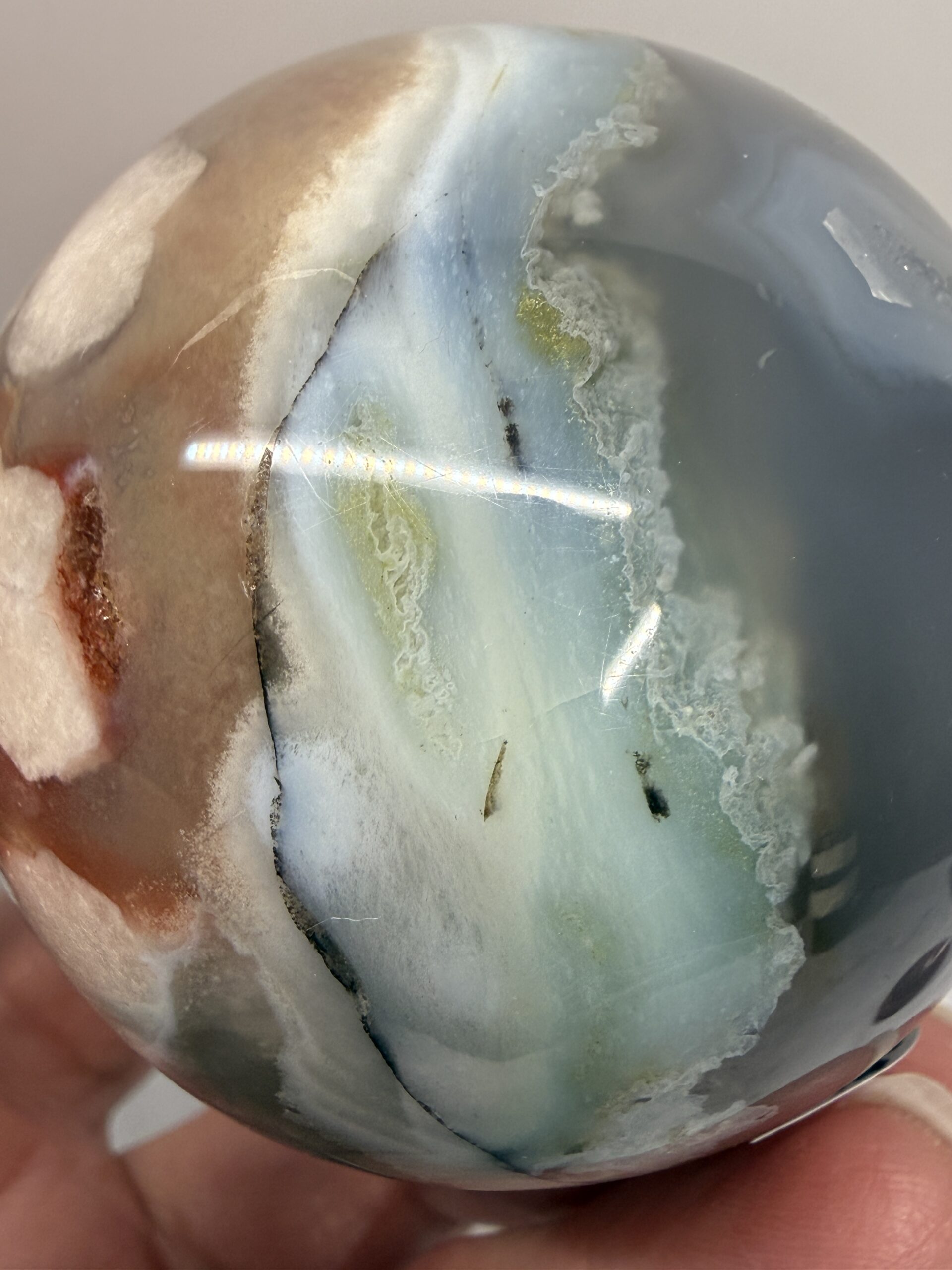 Blue Green Flower Agate is a rare variety of chalcedony with inclusions resembling floral formations, typically displaying soothing tones of light blue, grey, and soft green with cream-colored “blossoms”. Primarily found in Madagascar, this calming stone promotes peace, emotional healing, and personal growth.Â
