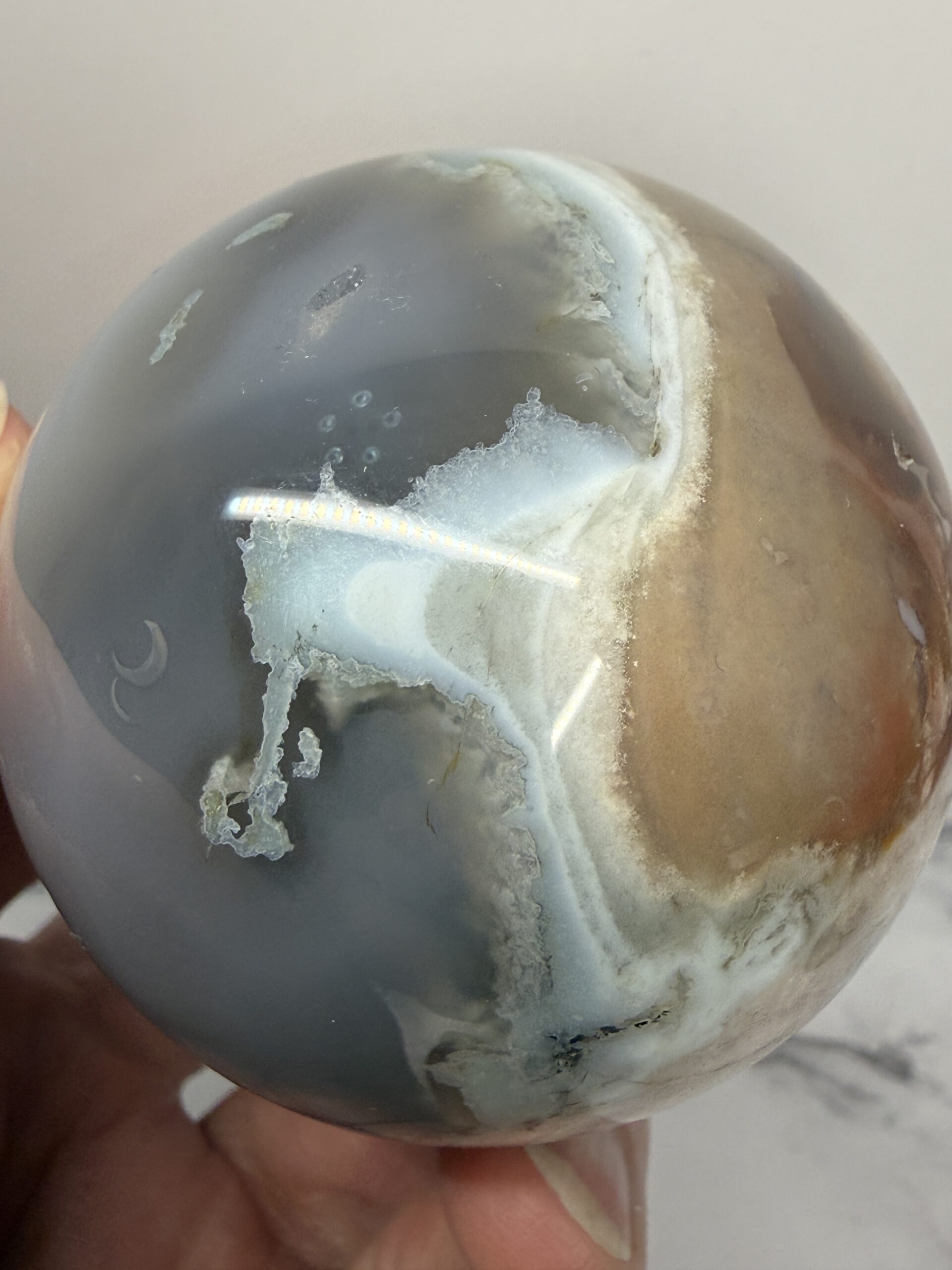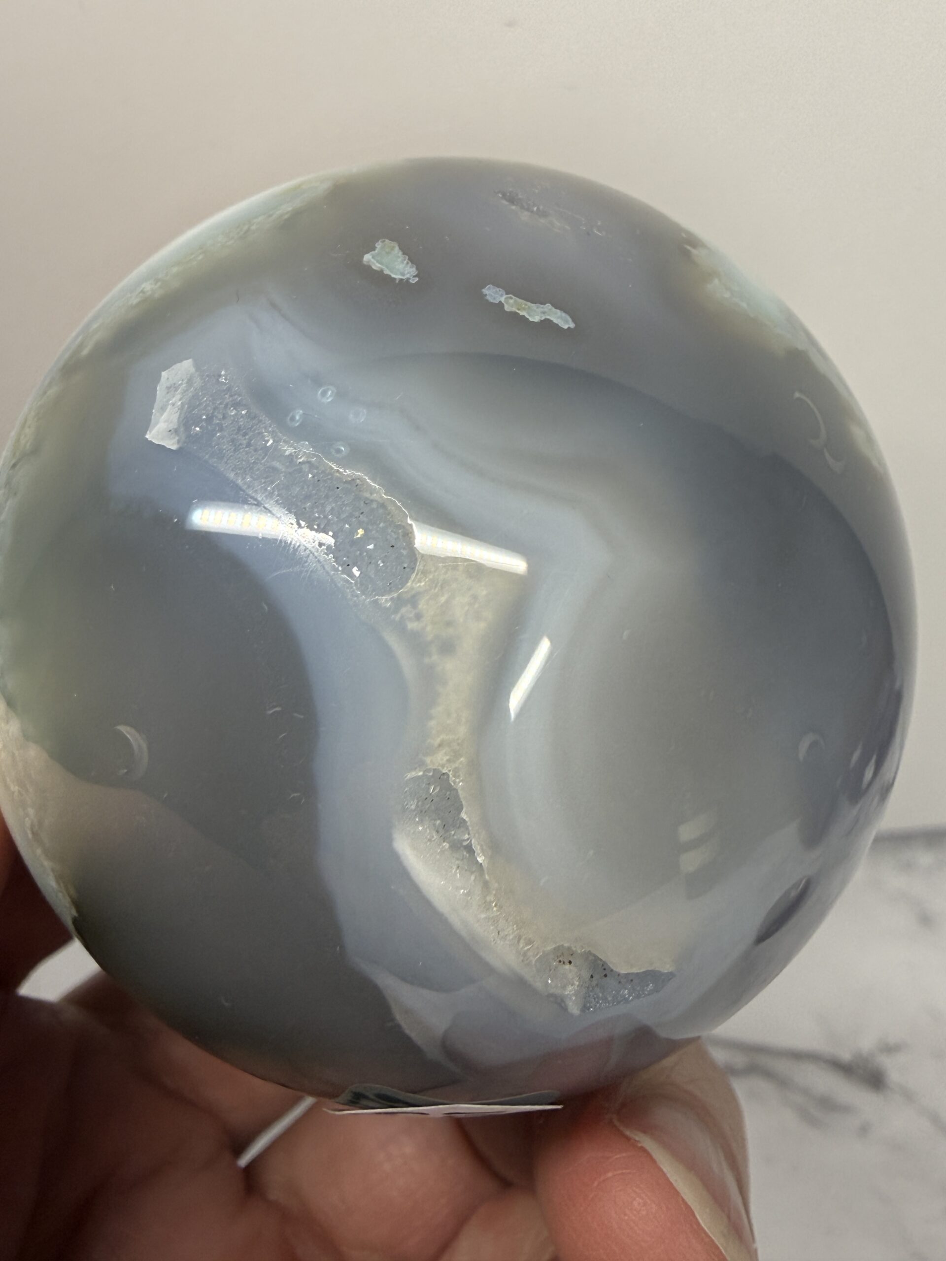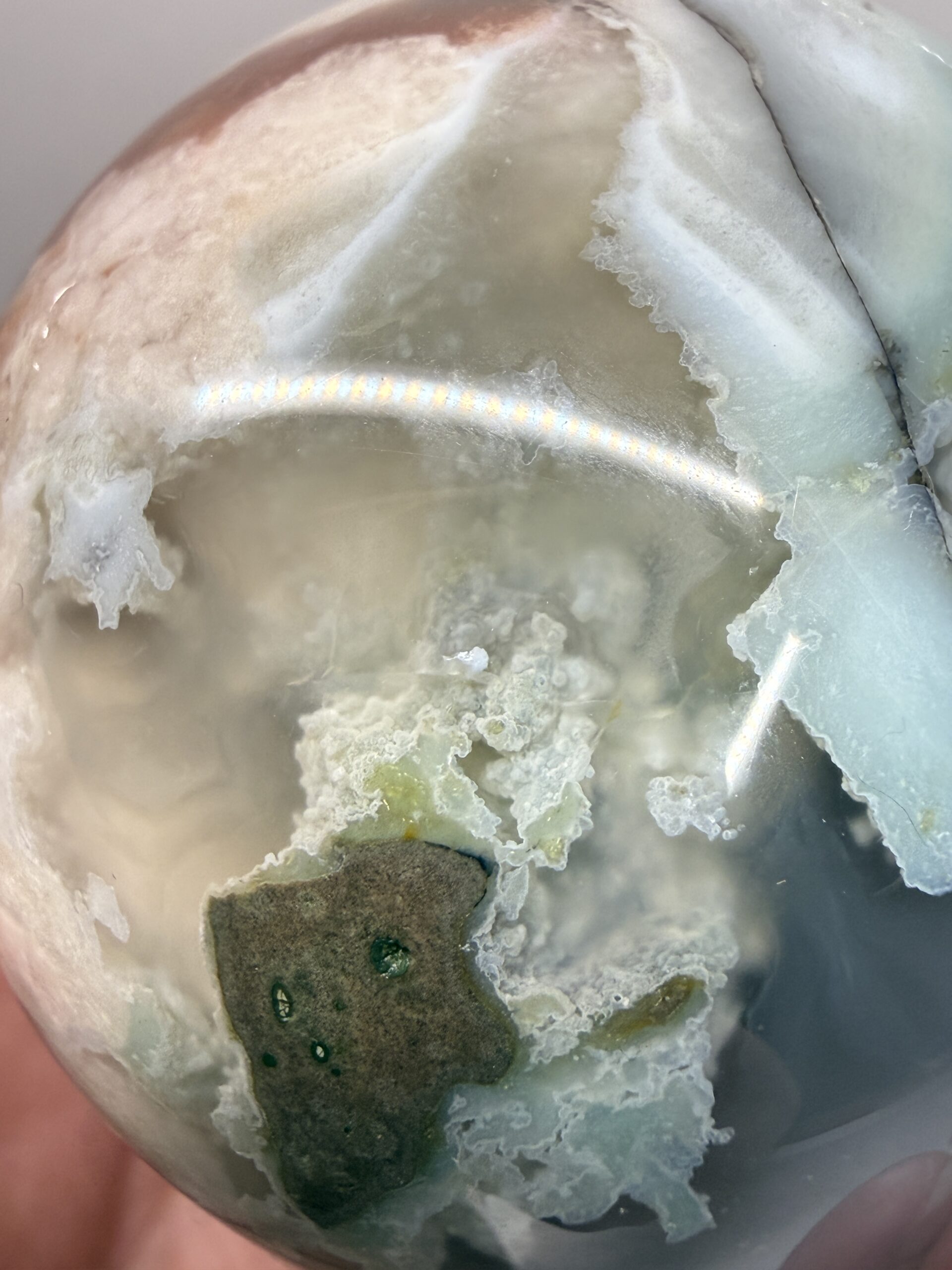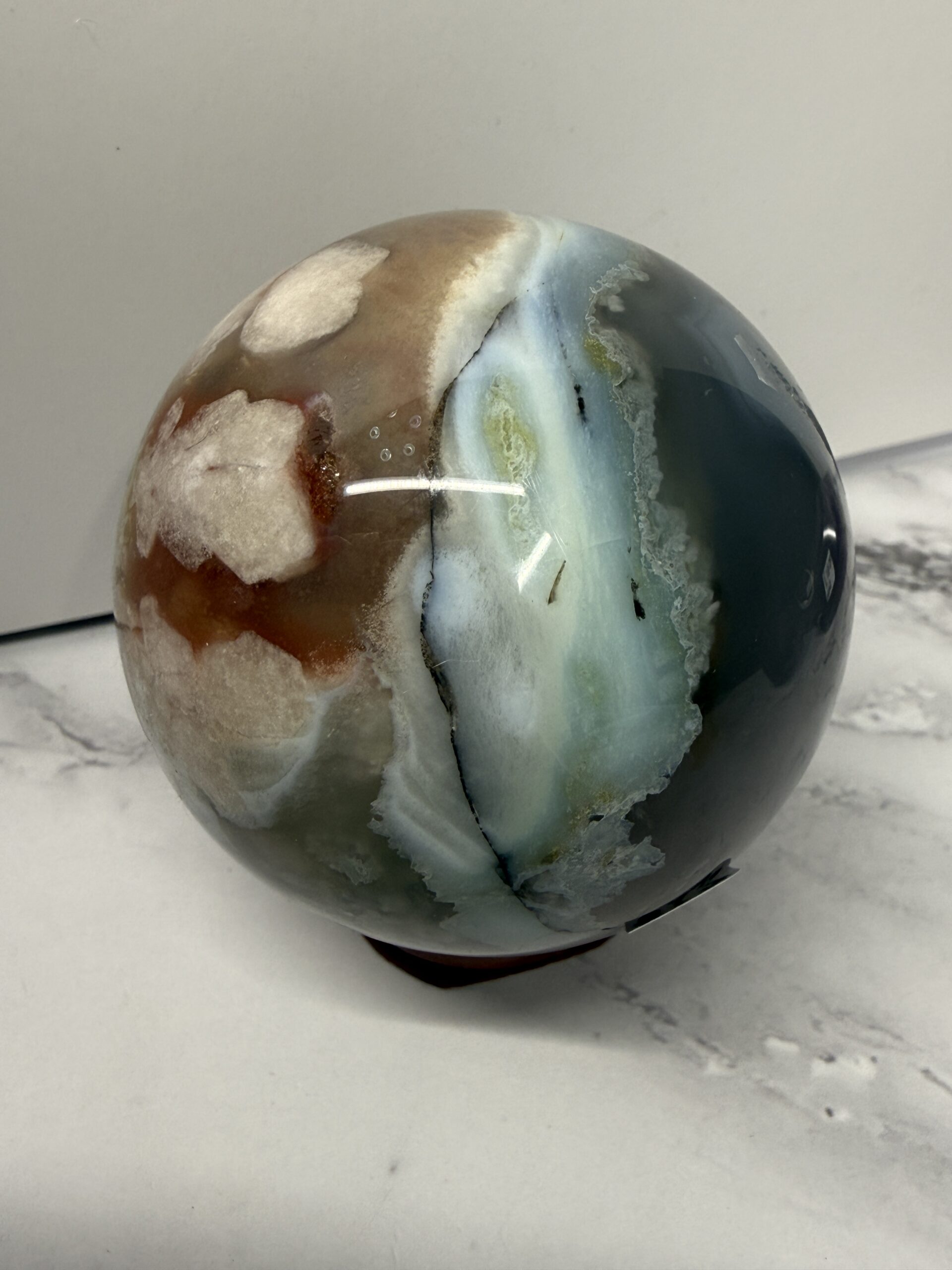 Blue Green Flower Agate is a rare variety of chalcedony with inclusions resembling floral formations, typically displaying soothing tones of light blue, grey, and soft green with cream-colored “blossoms”. Primarily found in Madagascar, this calming stone promotes peace, emotional healing, and personal growth.Â