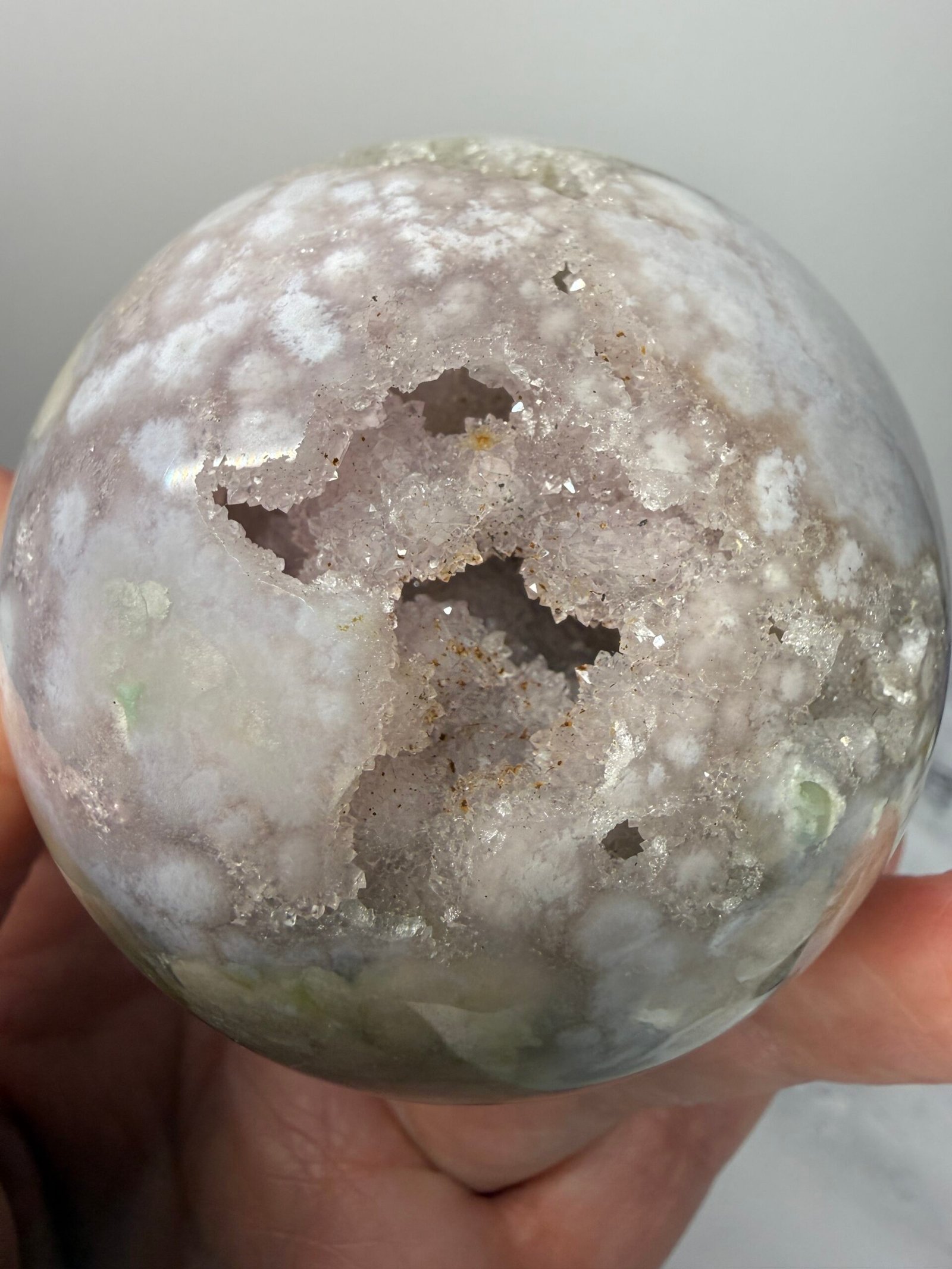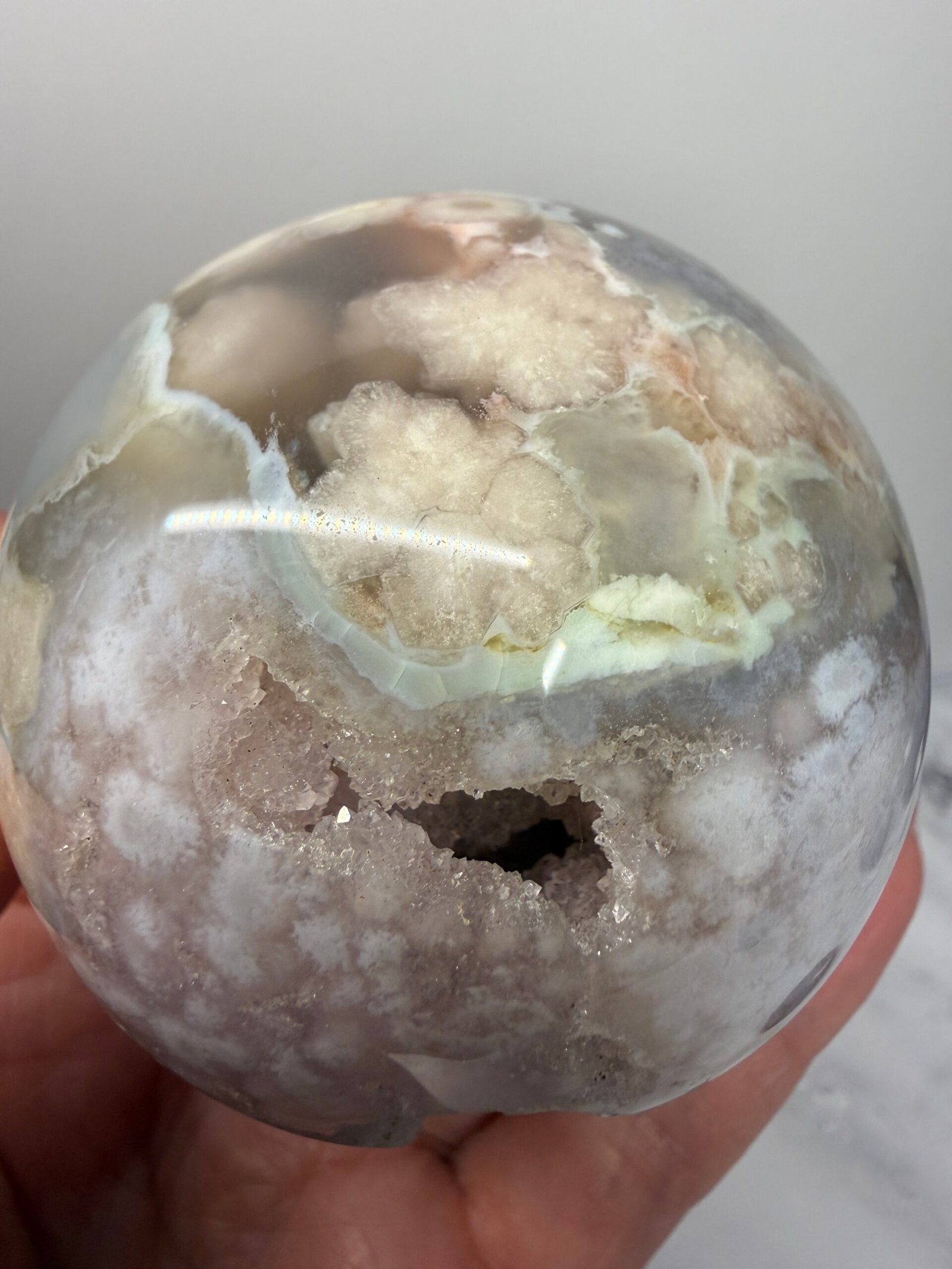 Blue Green Flower Agate is a rare variety of chalcedony with inclusions resembling floral formations, typically displaying soothing tones of light blue, grey, and soft green with cream-colored “blossoms”. Primarily found in Madagascar, this calming stone promotes peace, emotional healing, and personal growth.