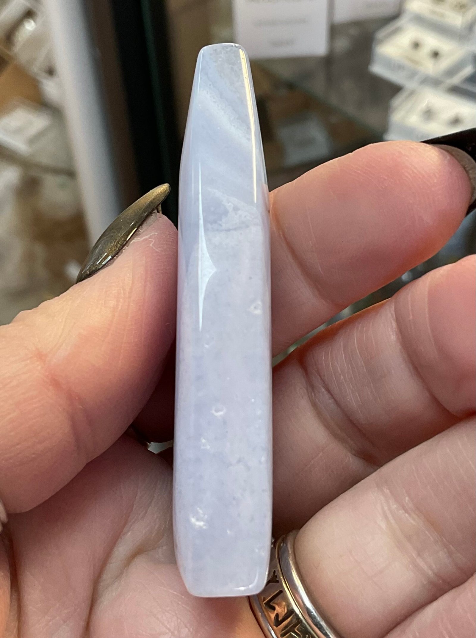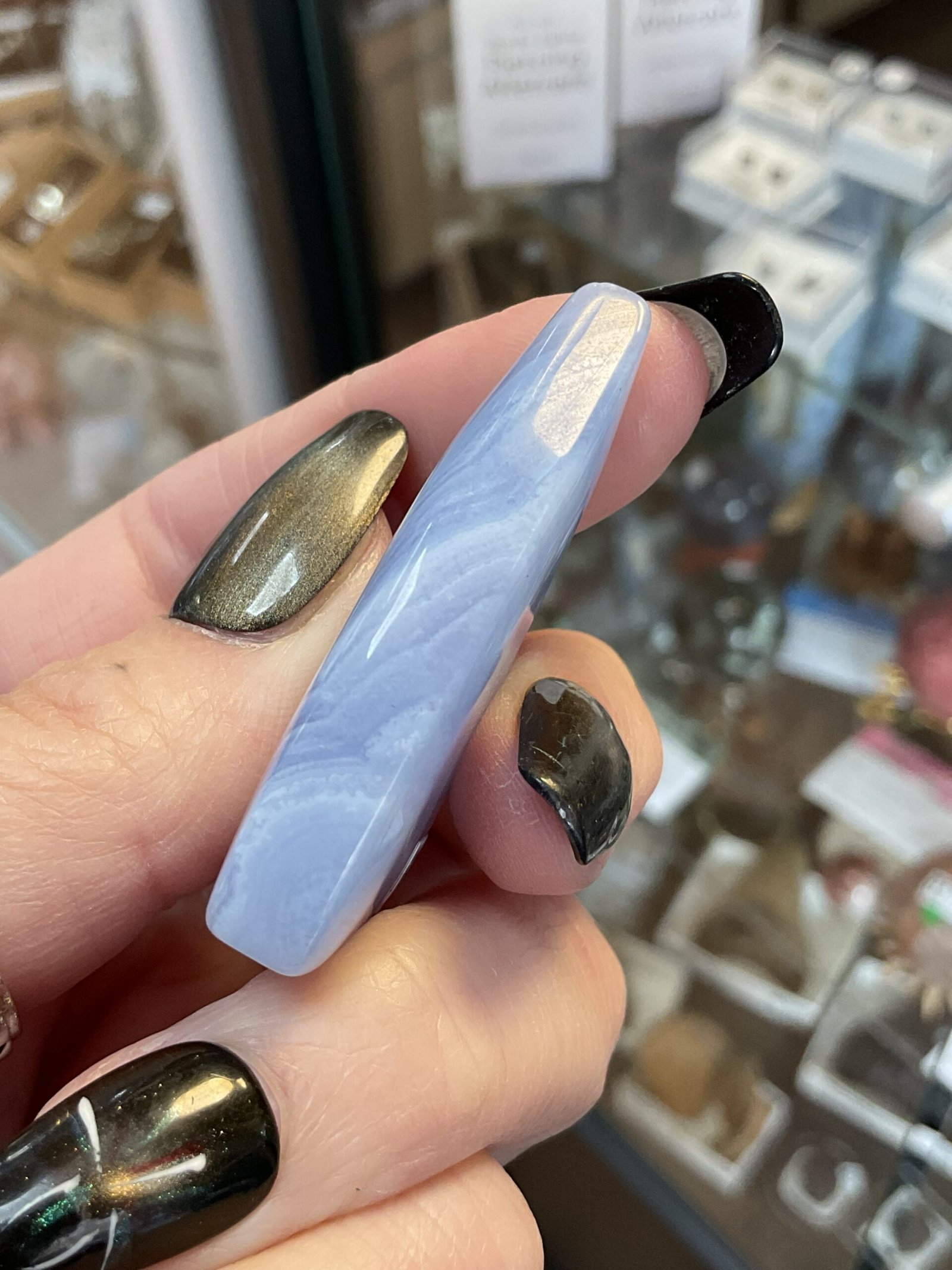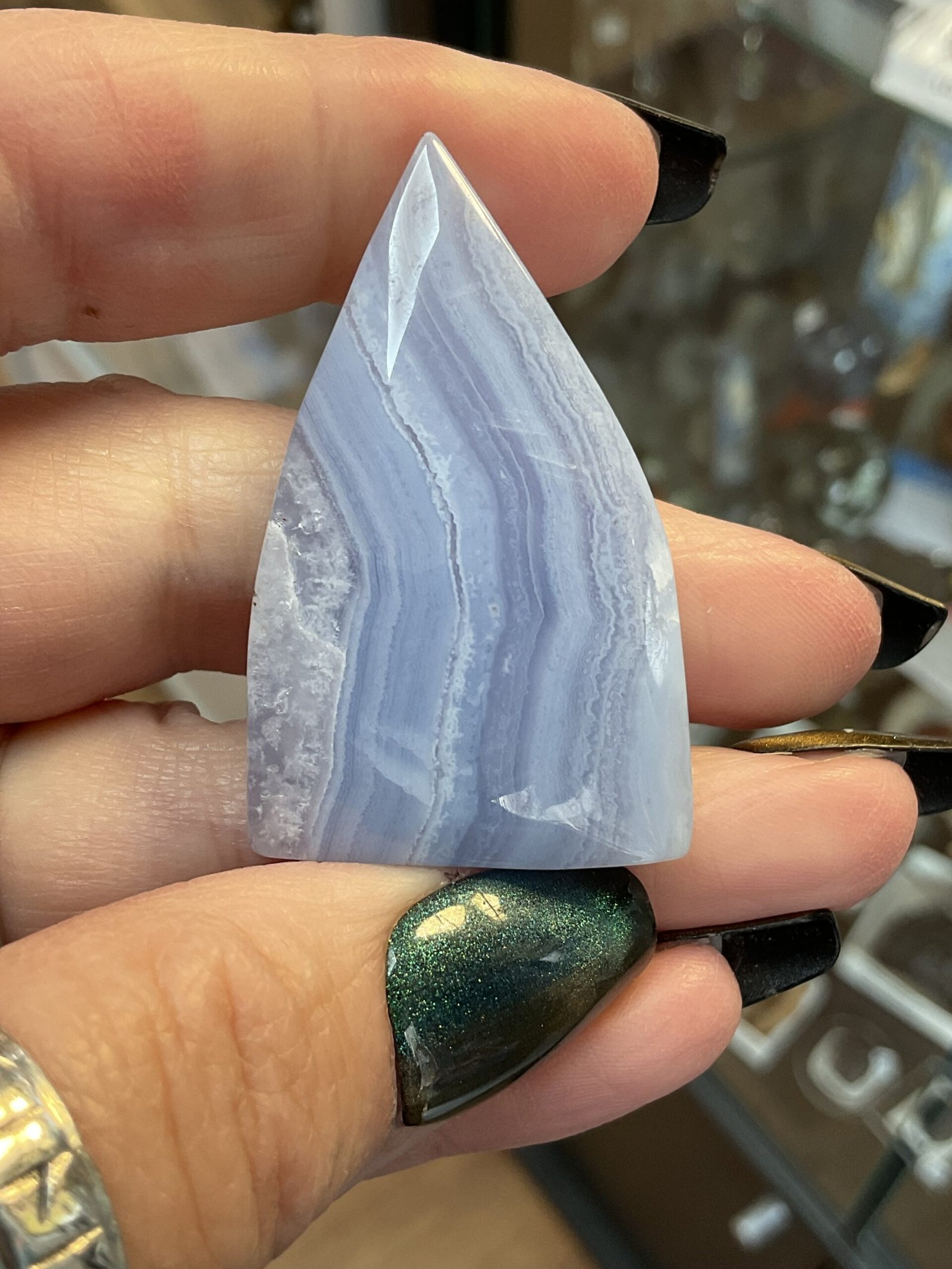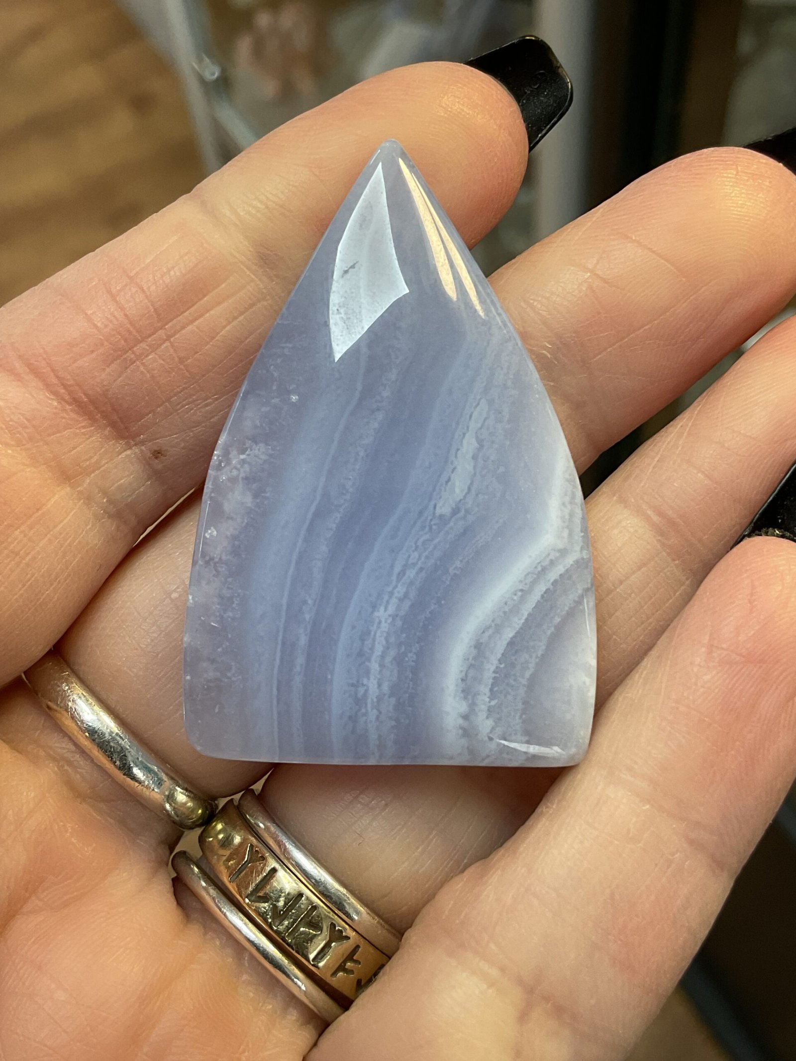 Blue Lace Agate is an incredibly soothing stone, giving one a sense of inner peace, serenity, and tranquility. It is effective in calming an overactive mind, relieving insomnia, and soothing tension headaches. It allows one to speak clearly and calmly, and not concern themselves with the opinions of other people. This stone is believed to work at a very slow and steady pace, making it beneficial to use over the long term.
