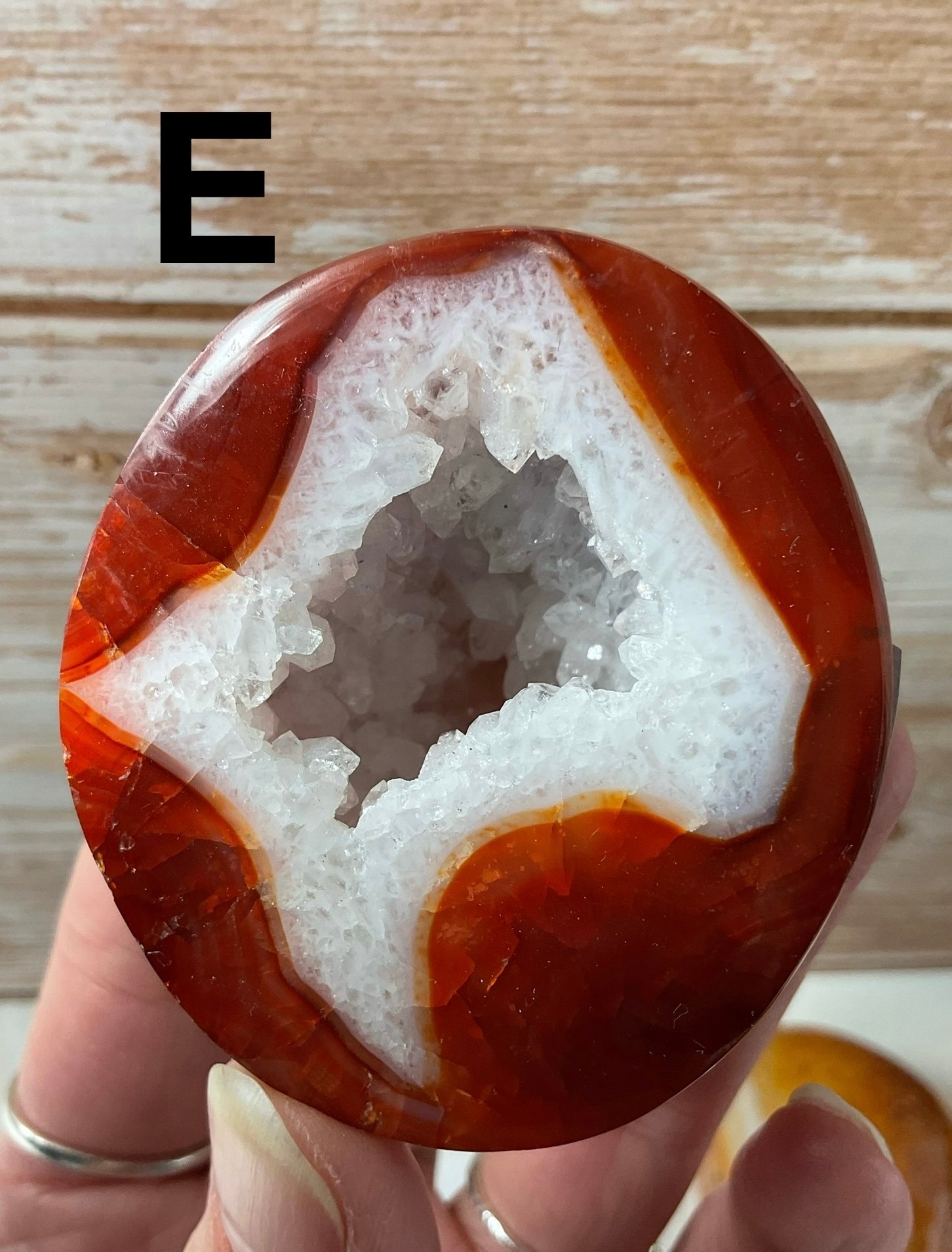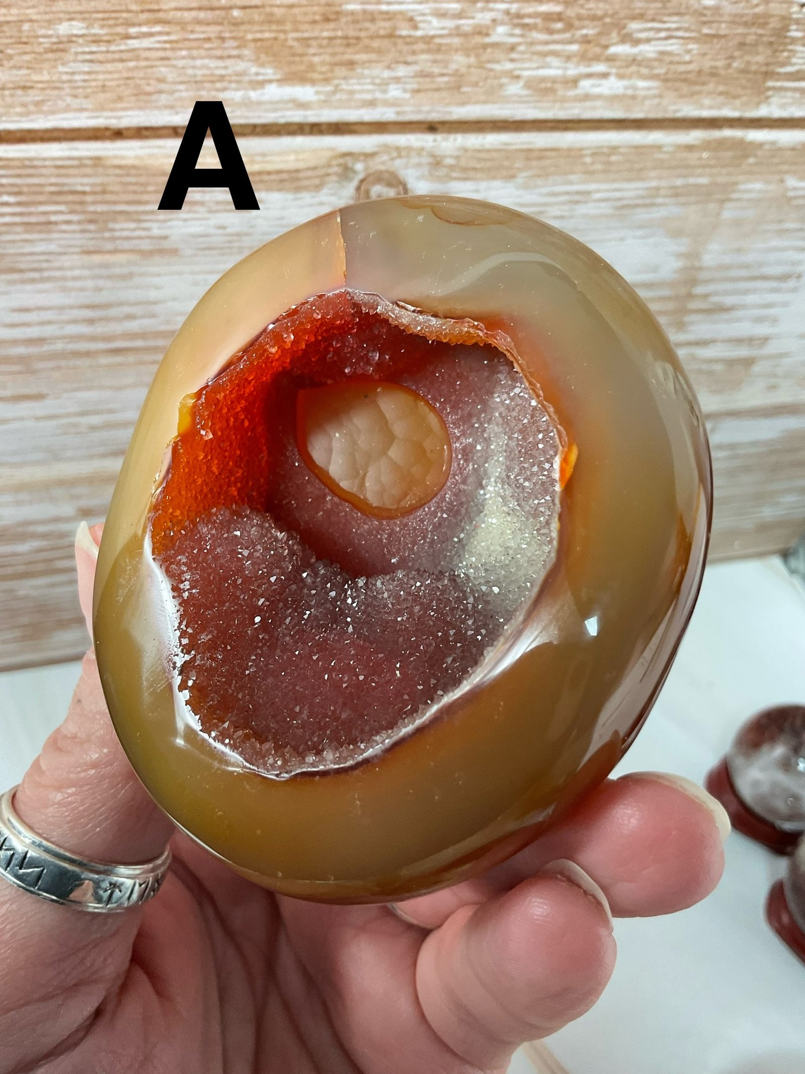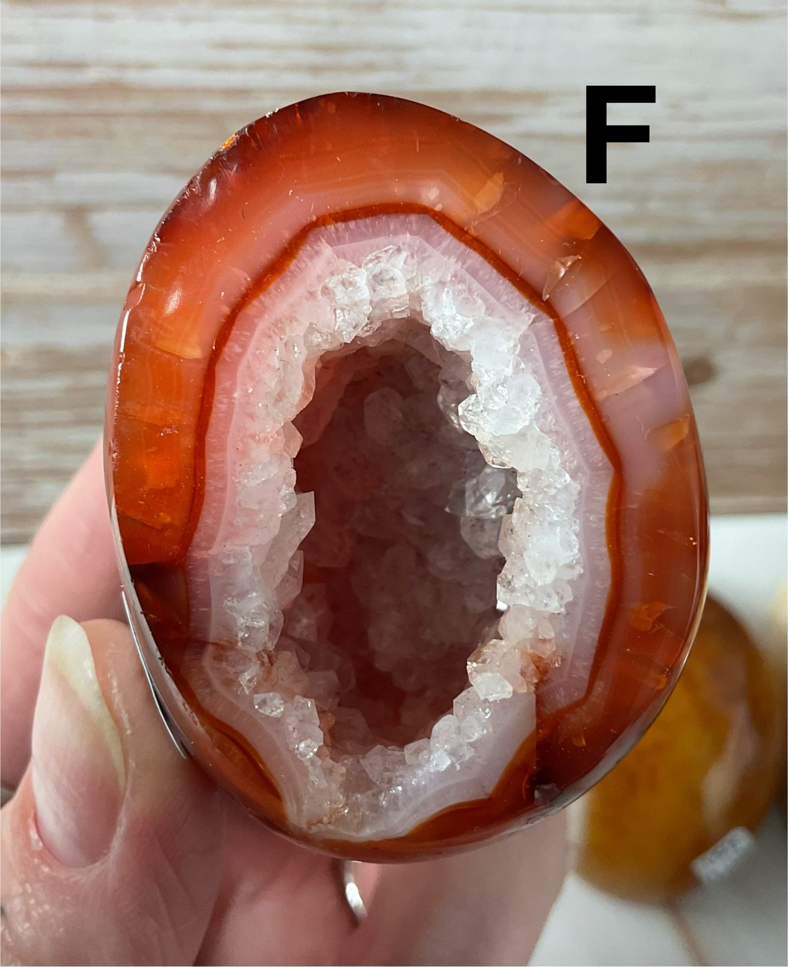 Carnelian geodes with sparkly druse and patterning.
