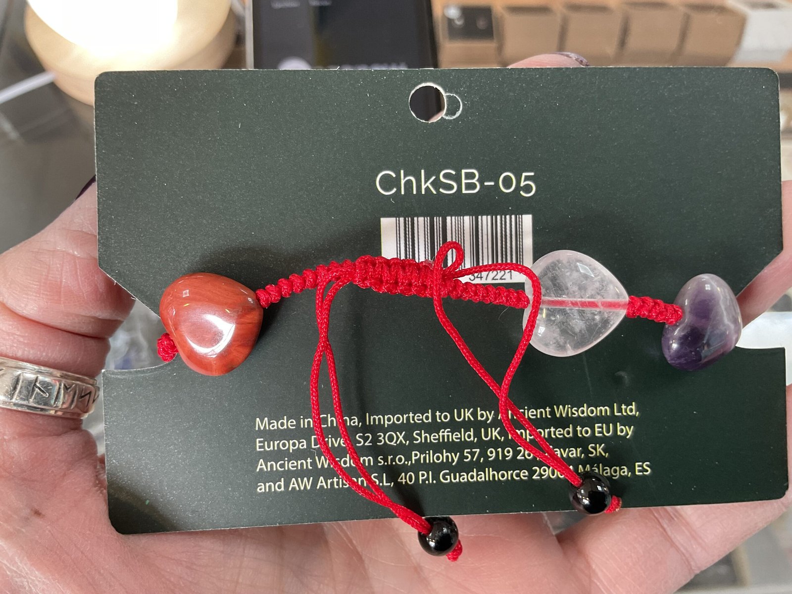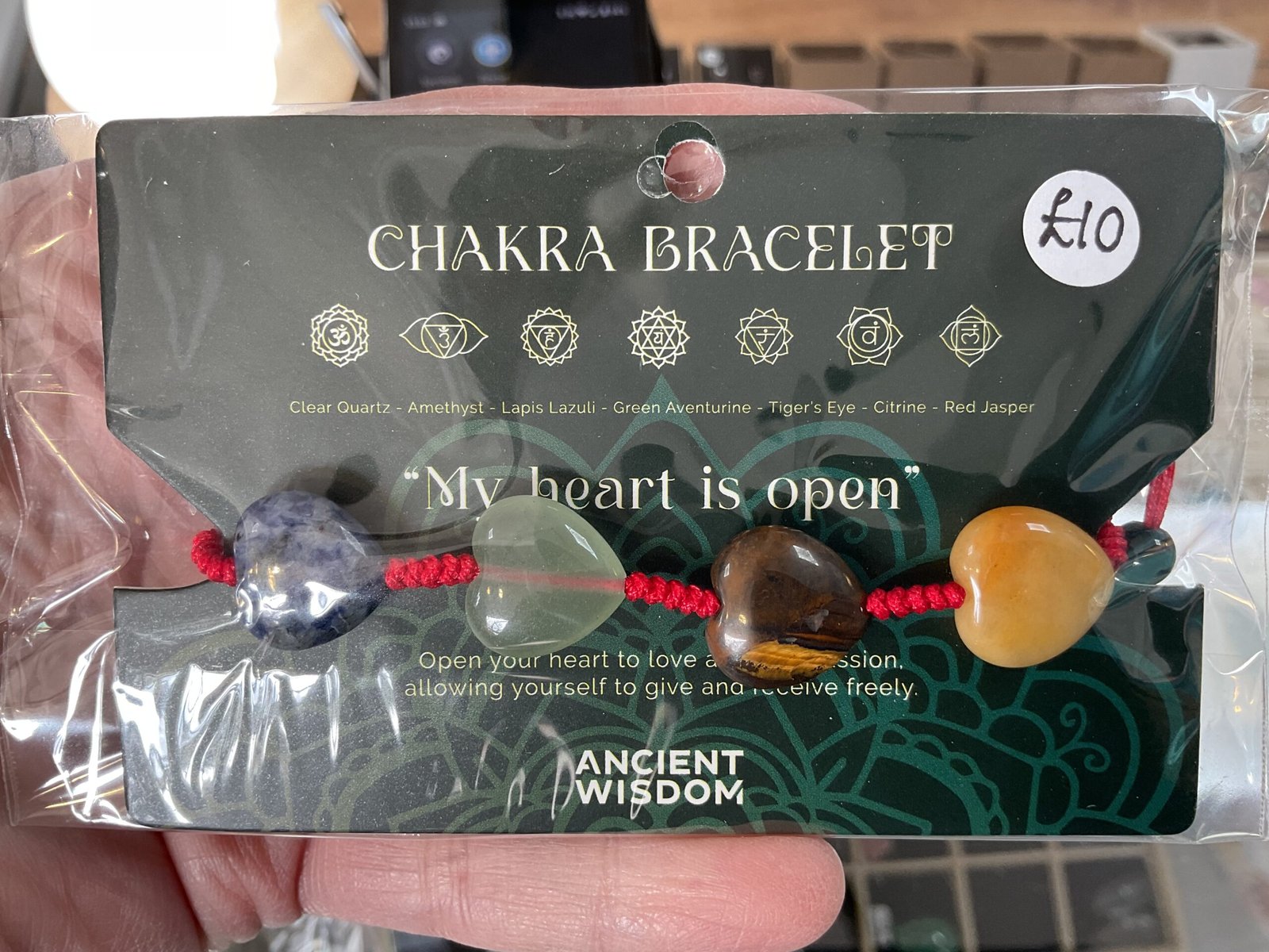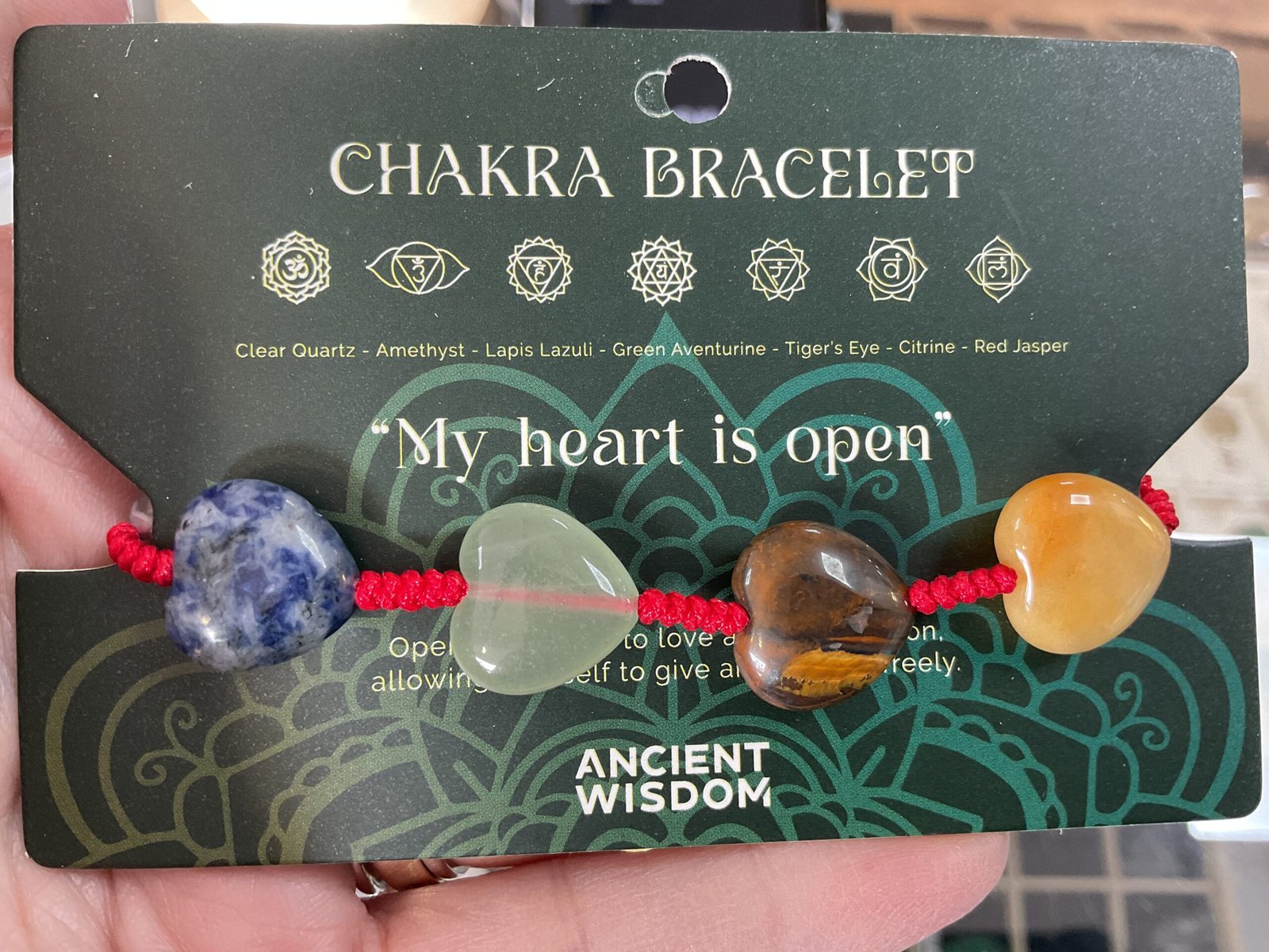 “My heart is open” Chakra string bracelet with hearts shaped gemstones, to represent each of the chakras.