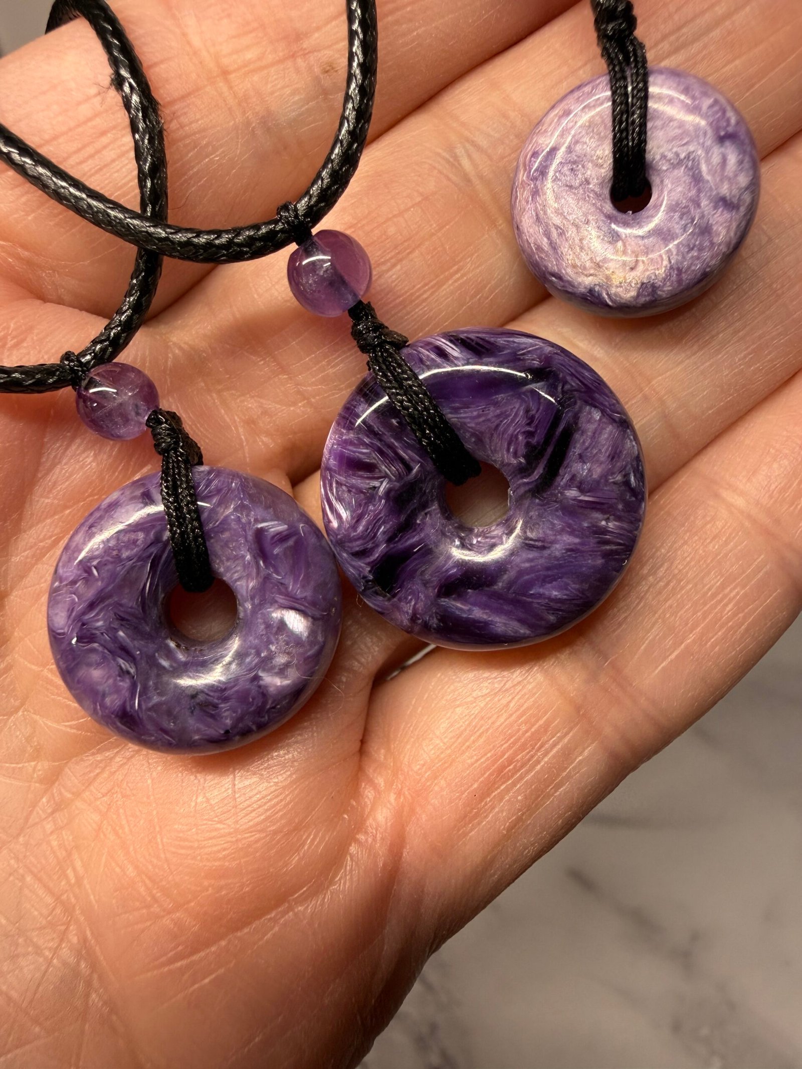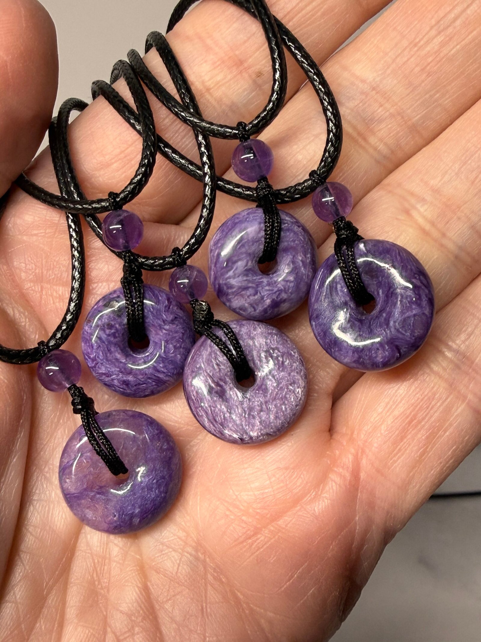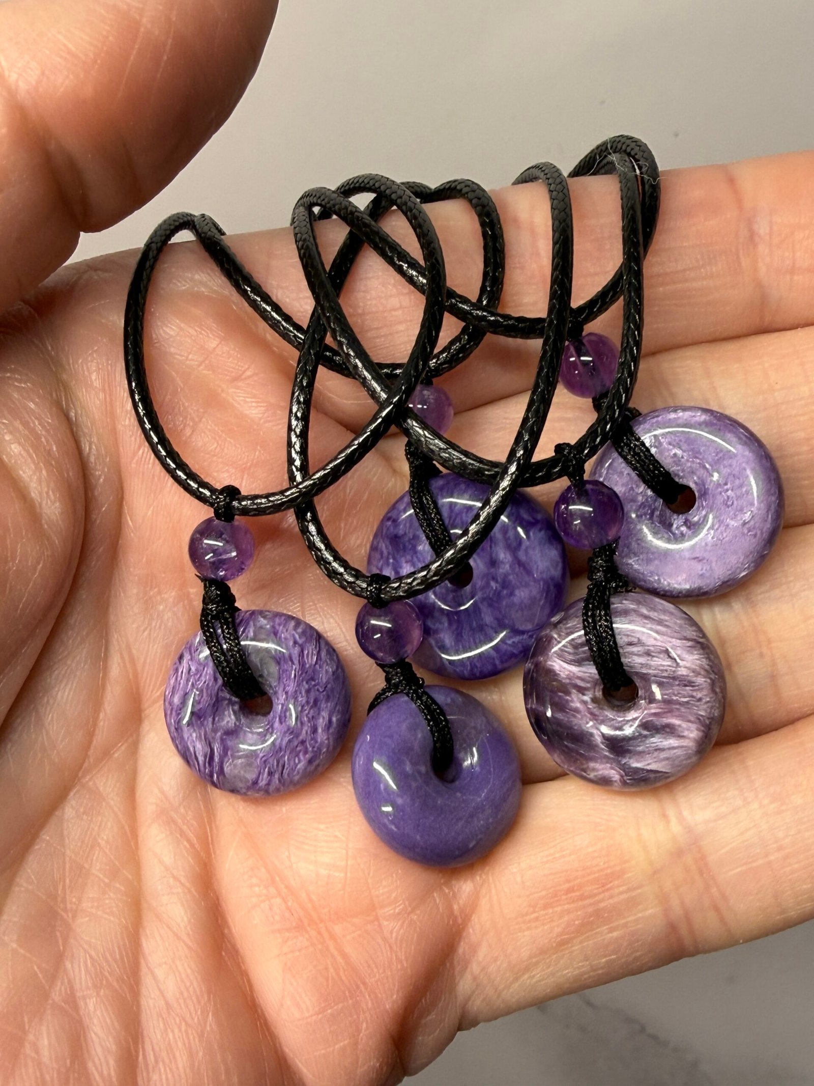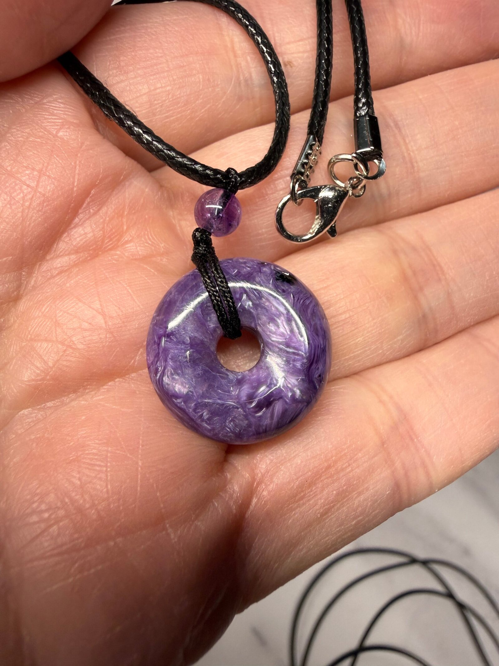 One intuitively chosen pendant with genuine Charoite donut and amethyst bead on a black chord. Plus info card.