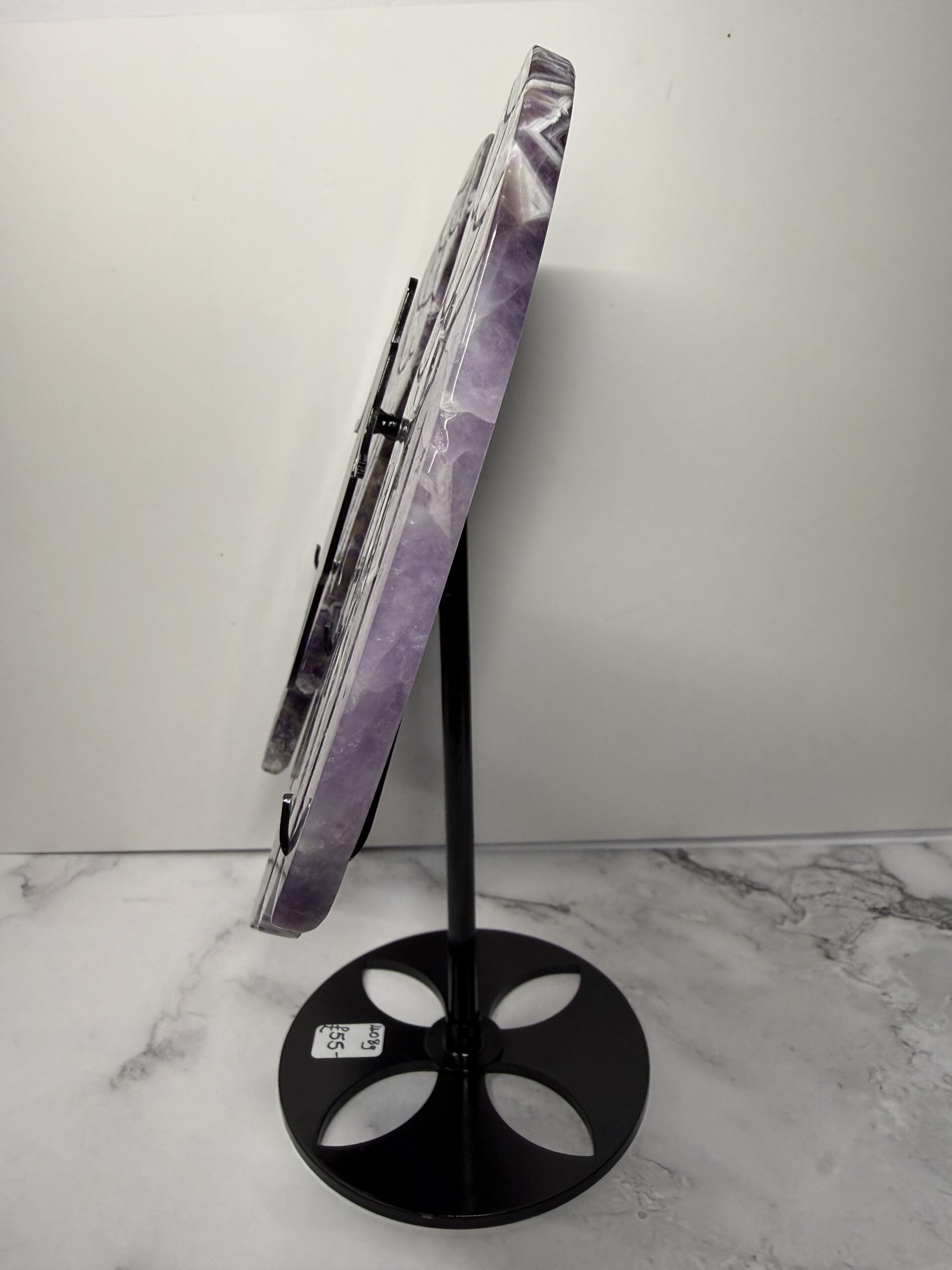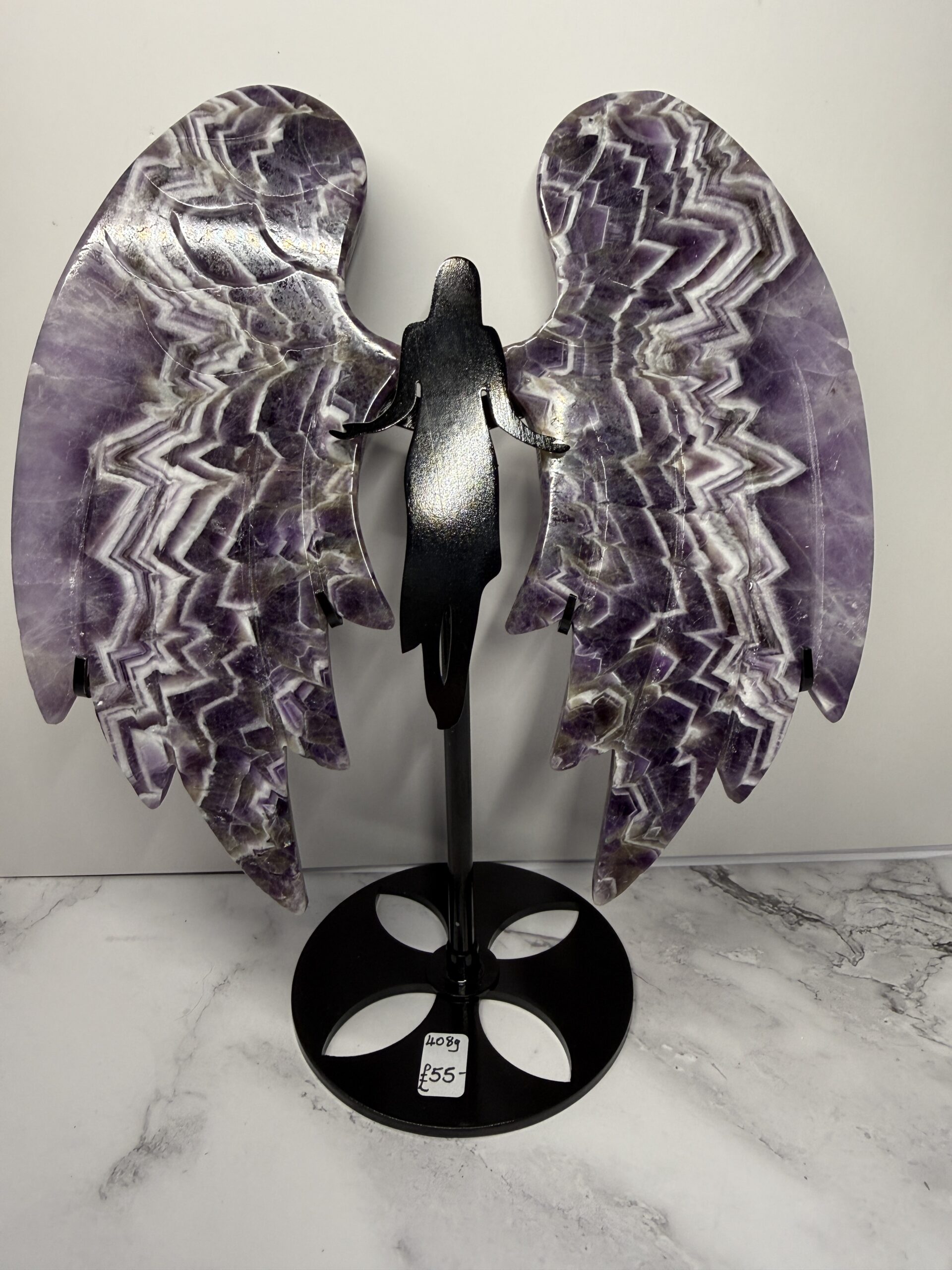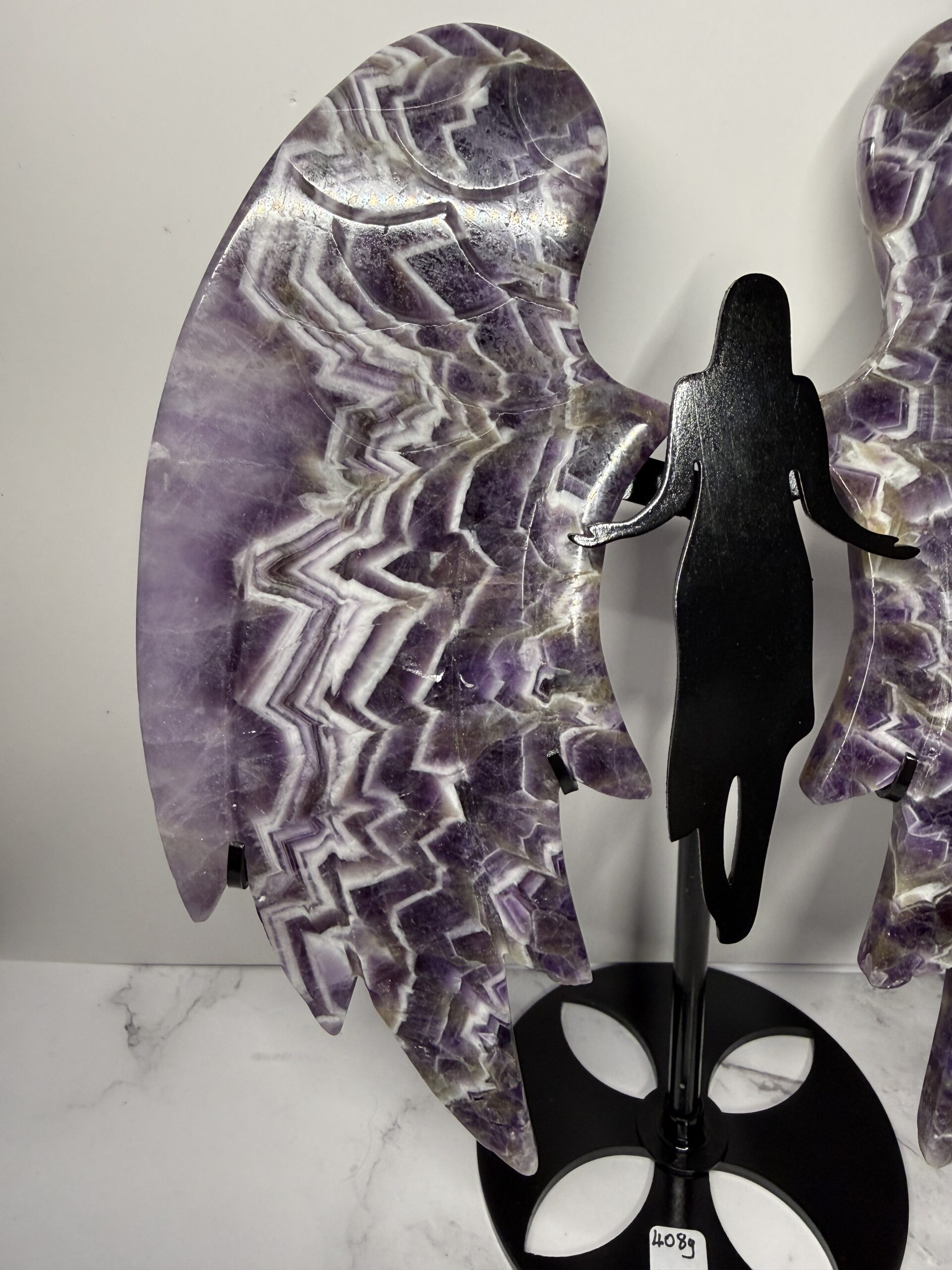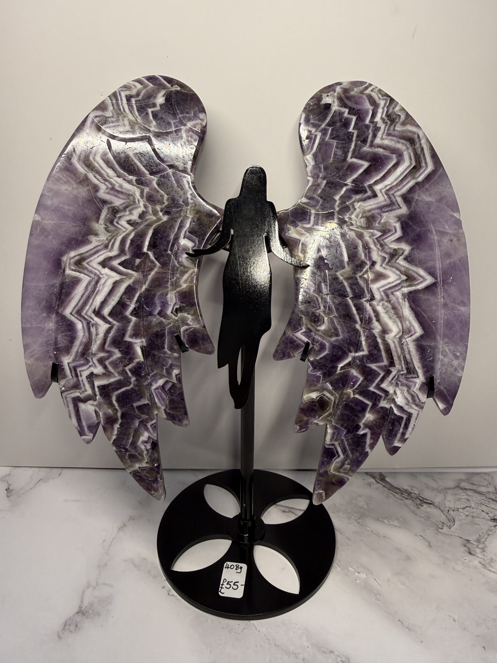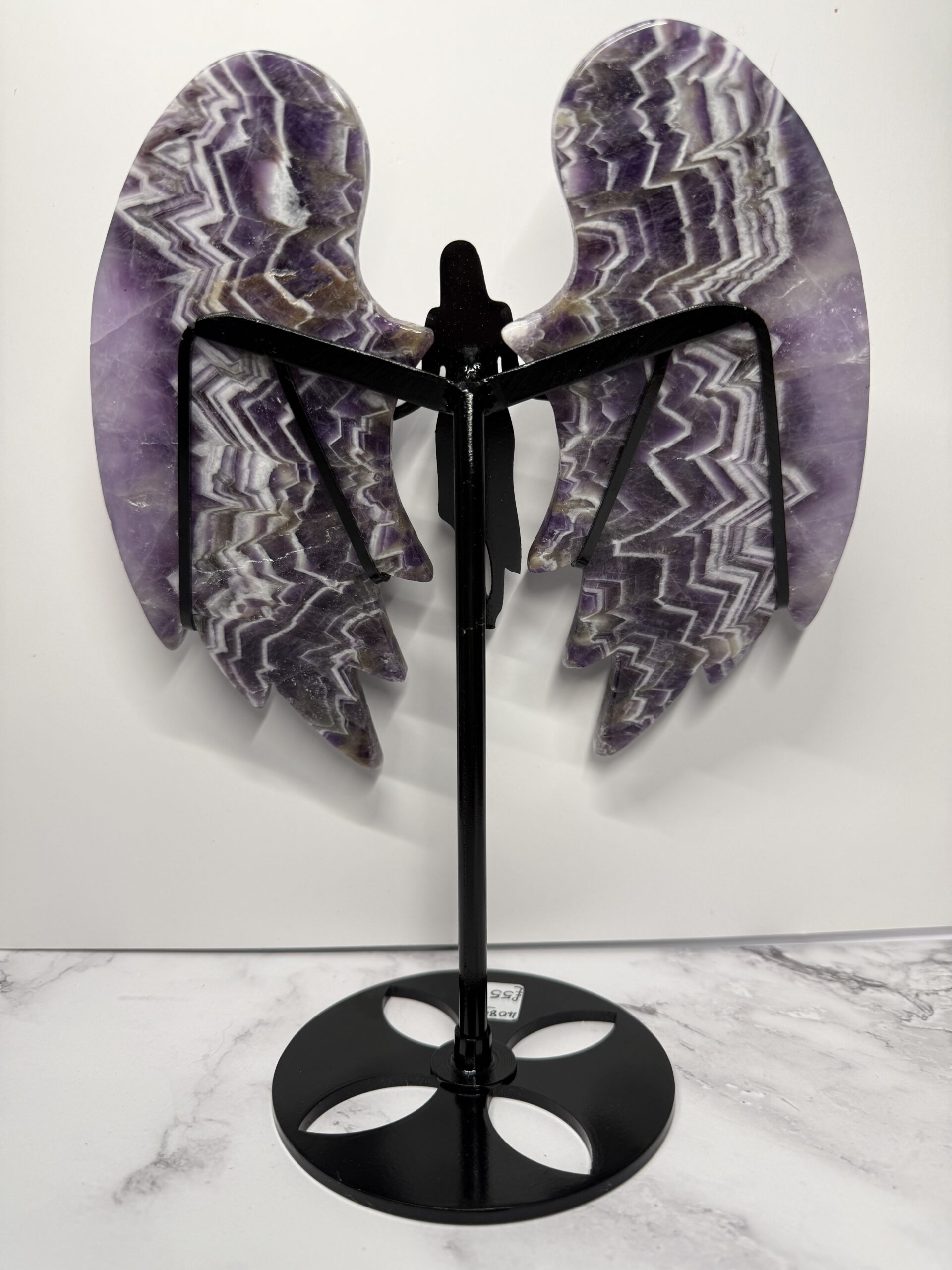 Beautifully Chevroned amethyst wings with black metal custom stand.
