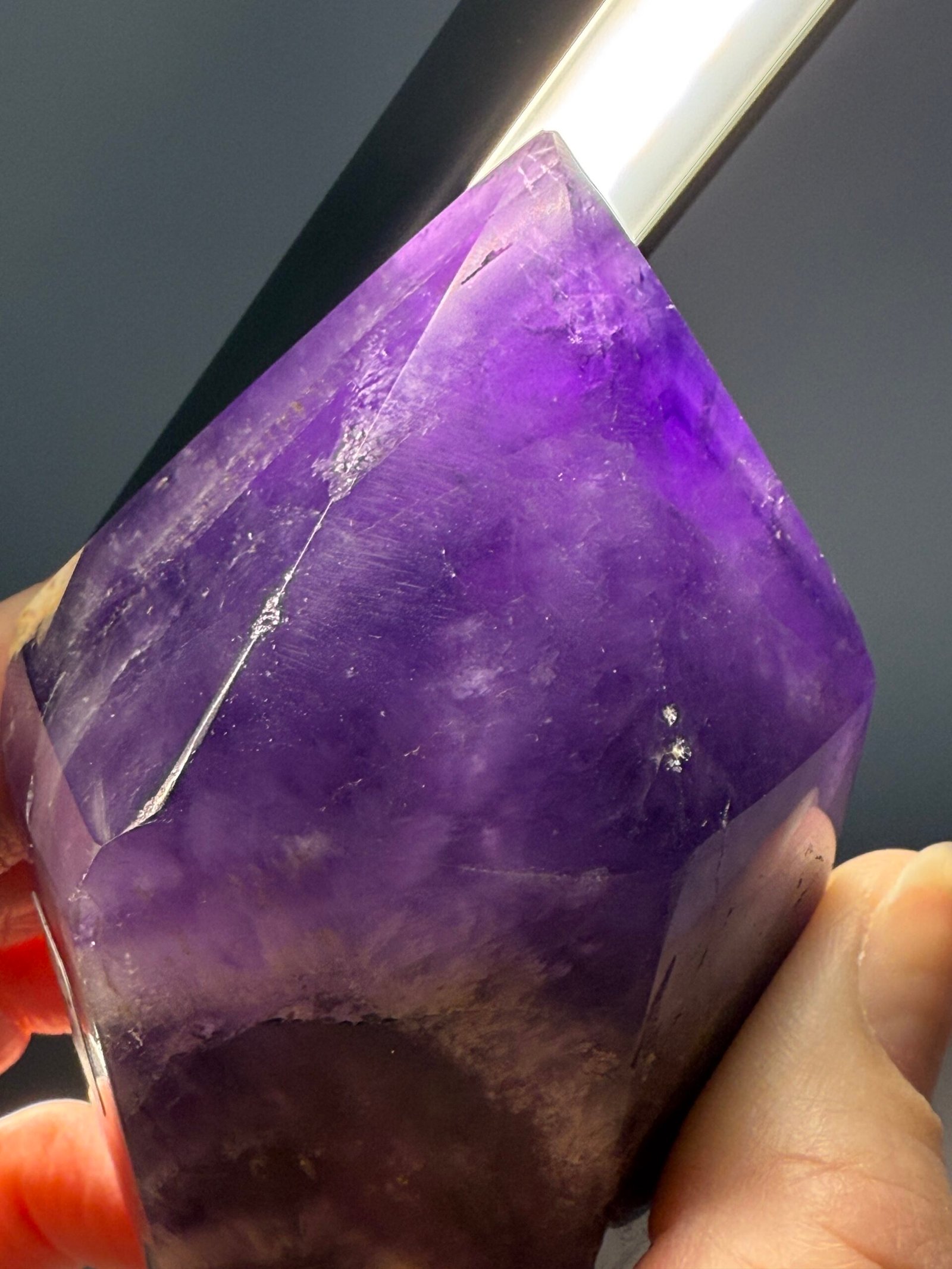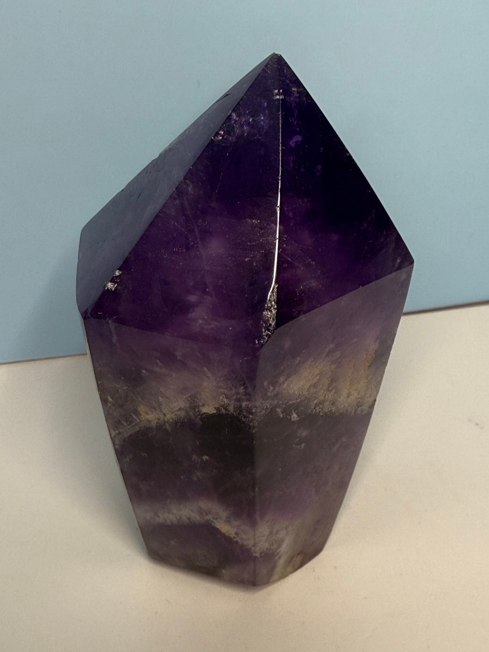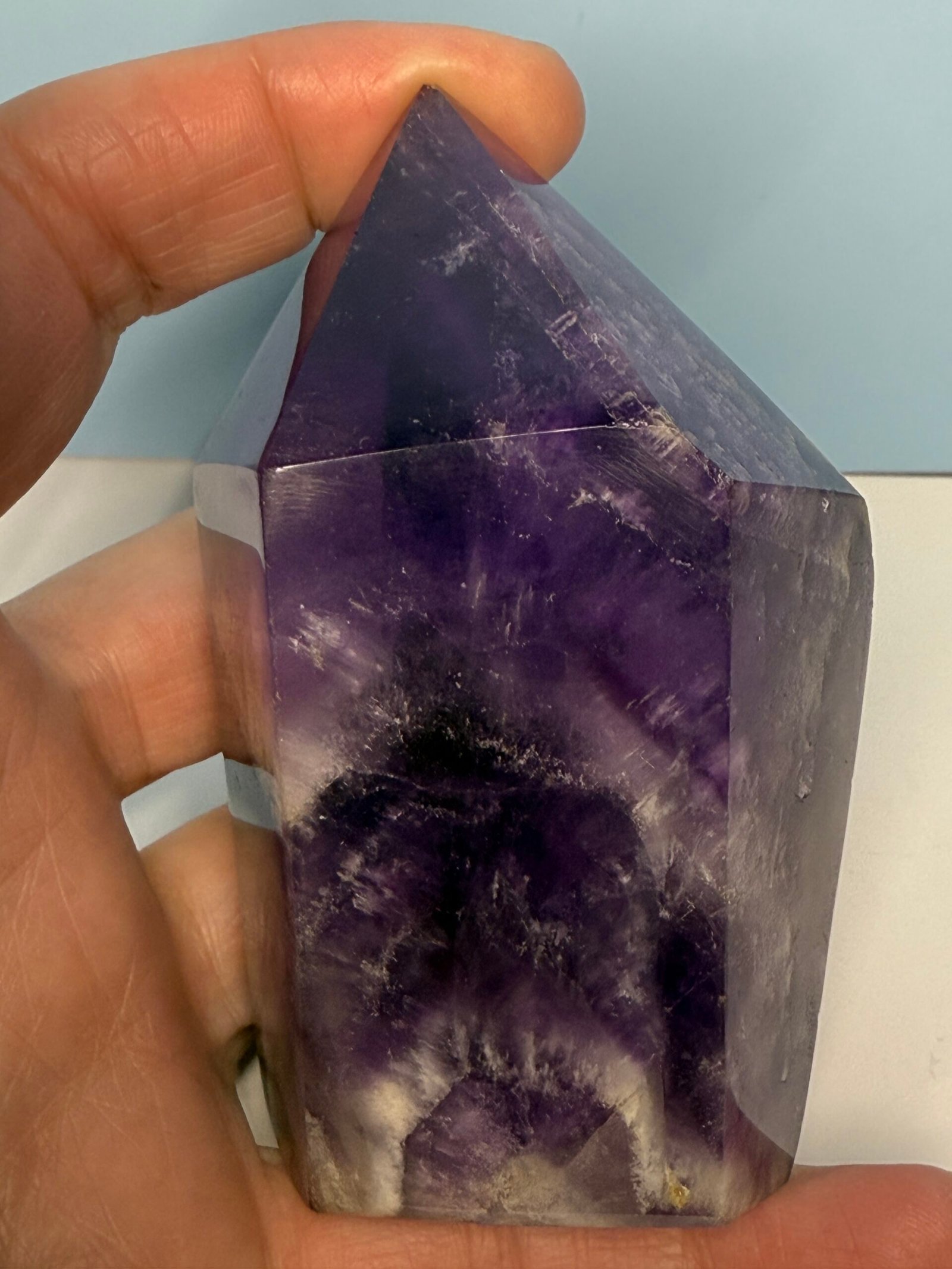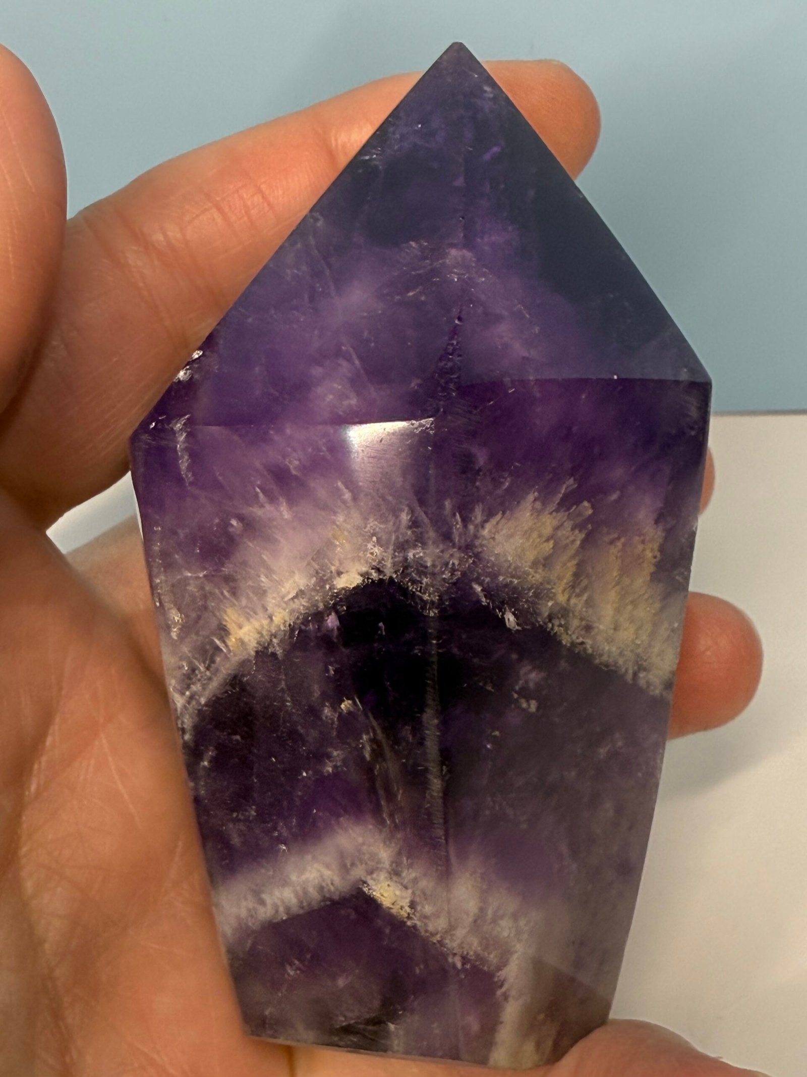 Chevron Amethyst combines the high spirituality of Amethyst, and the gentle support of White Quartz, creating a unique energy for self-reflection and personal growth. It gives one the courage they need to follow their spiritual callings and reach their highest potential. It cleanses the aura and protects one from psychic attacks. It promotes a deep and peaceful sleep, making it beneficial for those who suffer with insomnia.