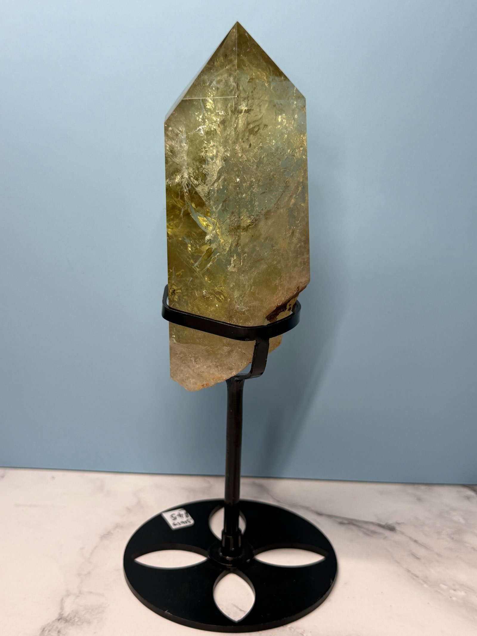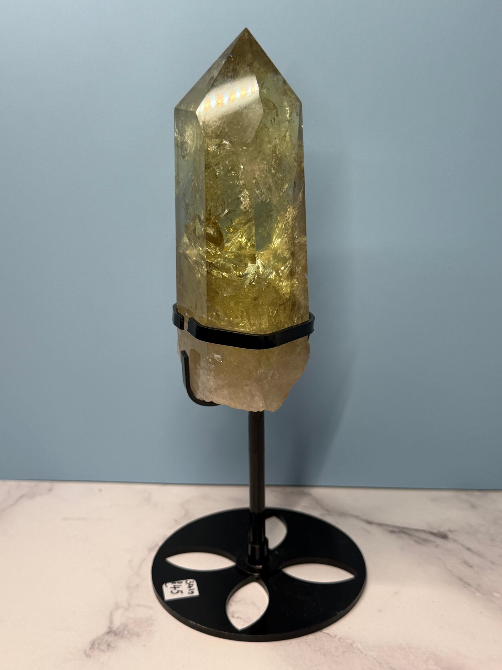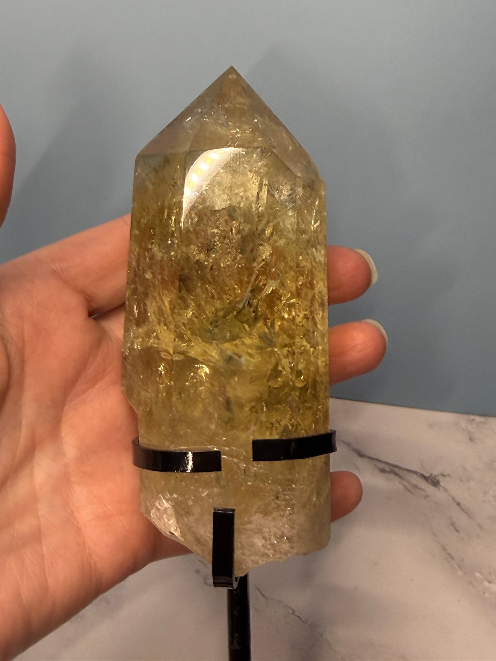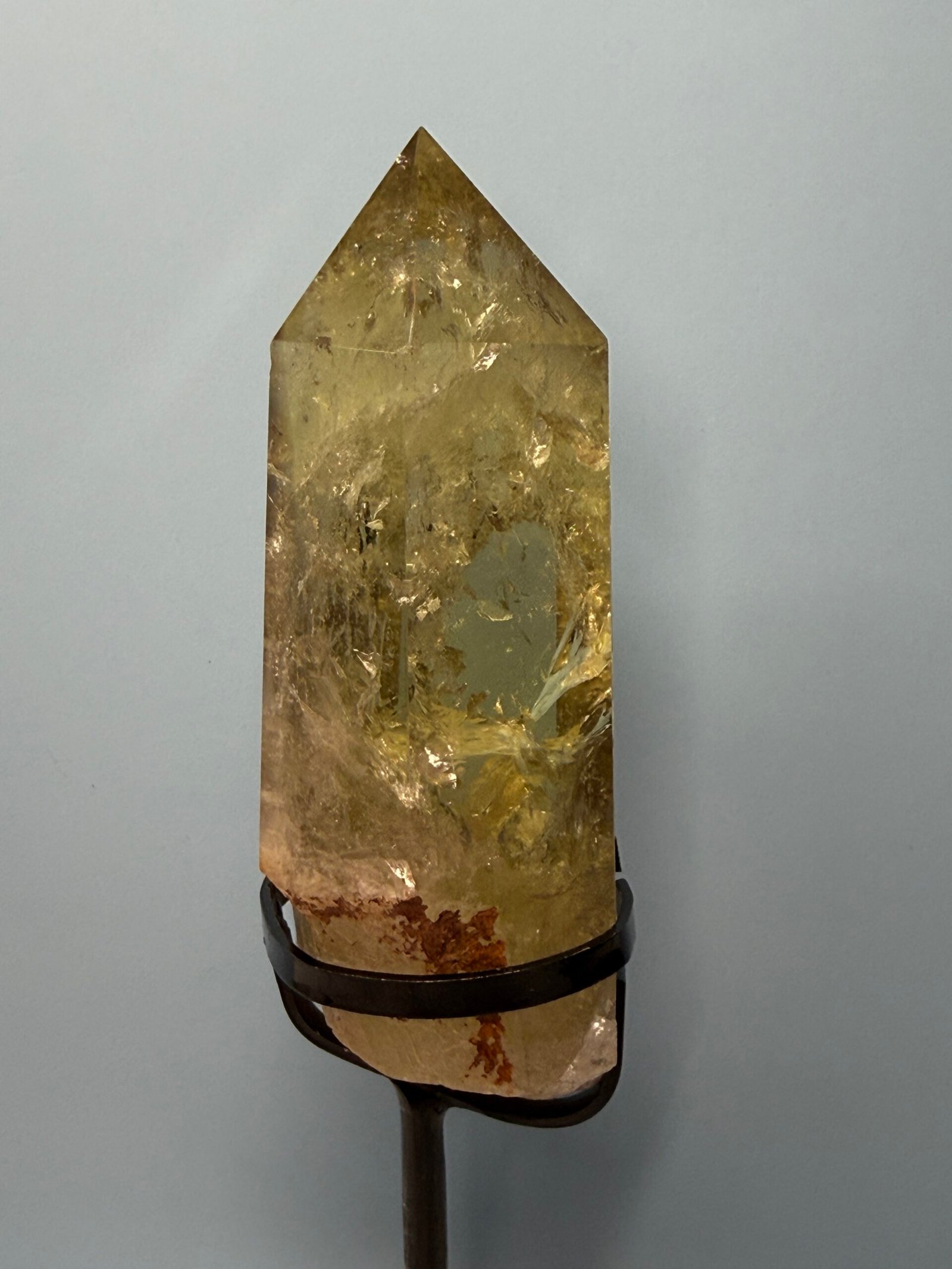 This is heat treated citrine. A wonderfully soft smoky yellow citrine with an unpolished end that nestles in a black metal custom stand.