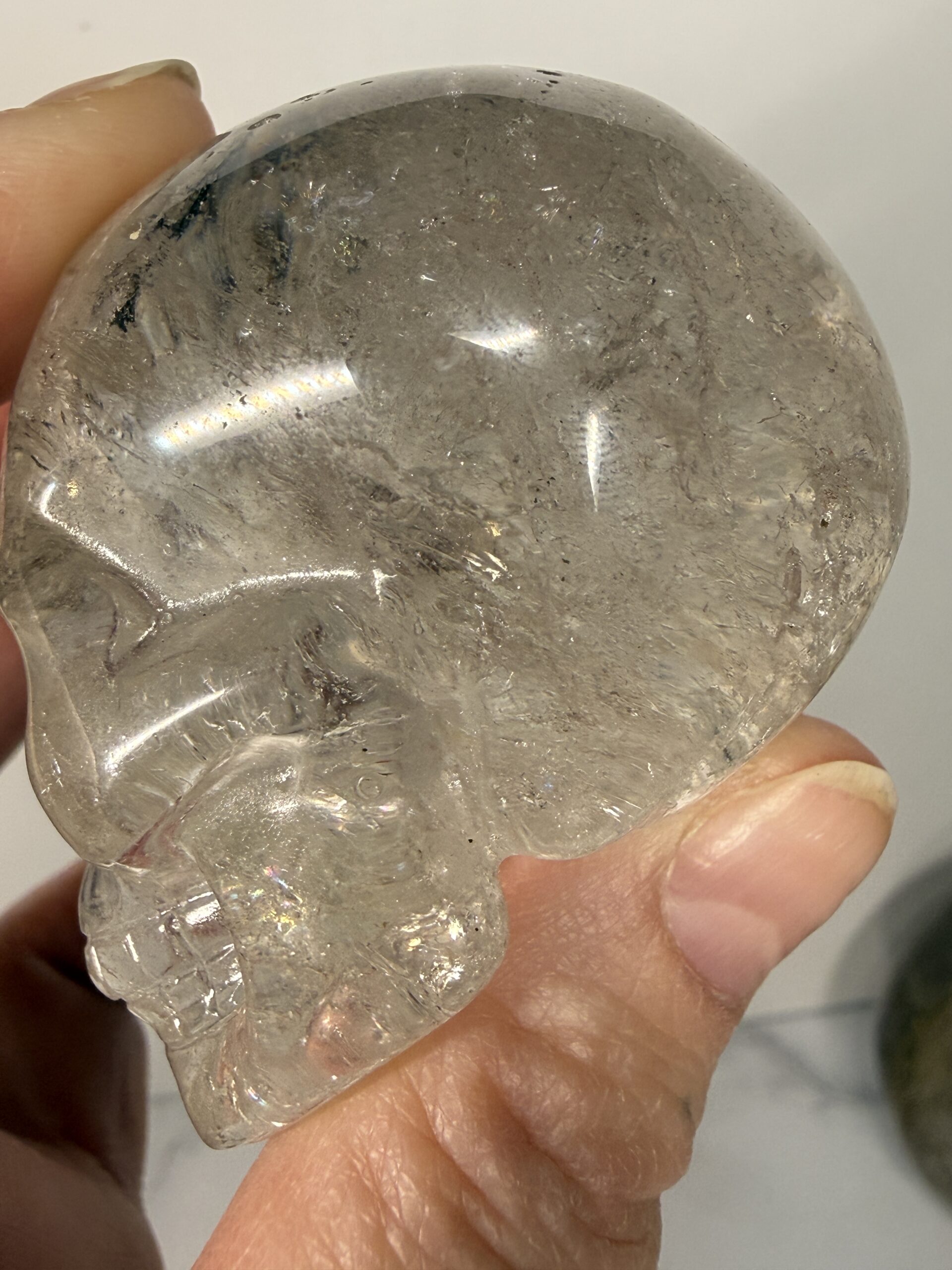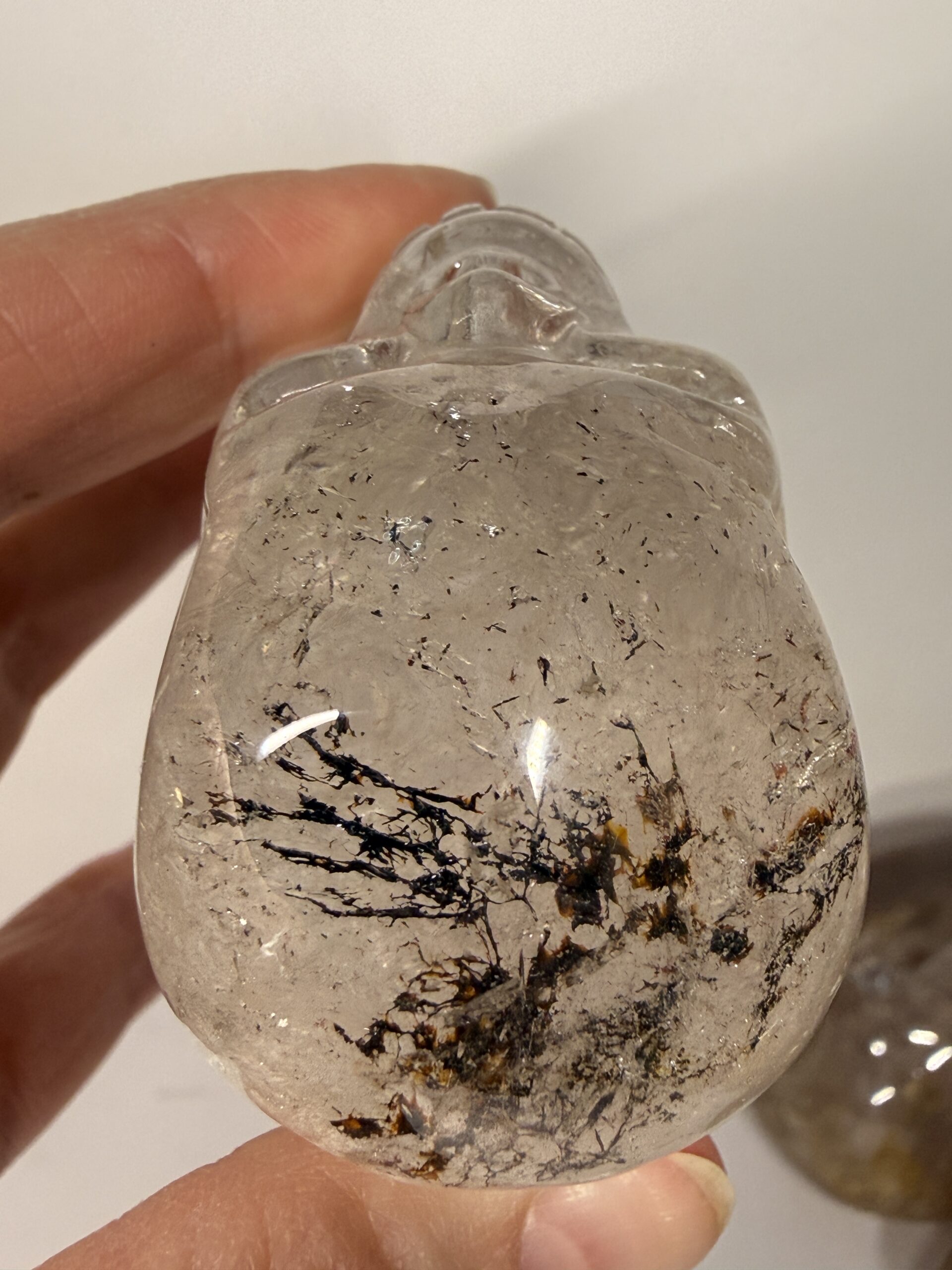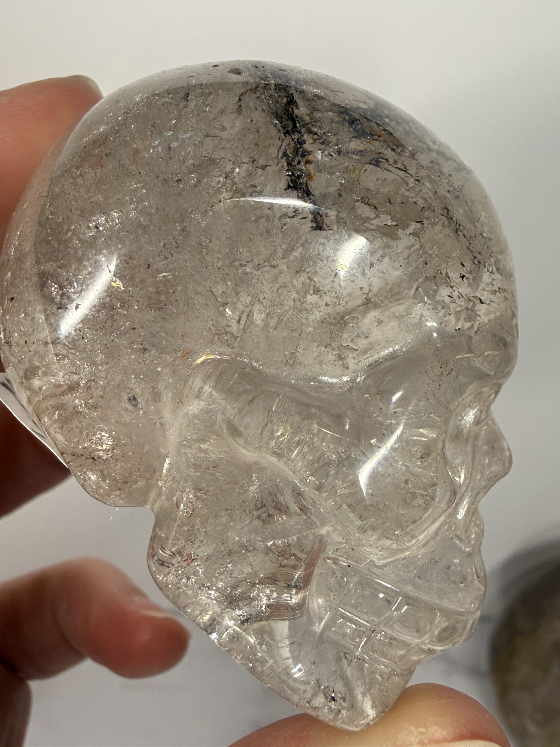 This beautifully carved clear Quartz skull carving has unusual metallic inclusions. Possibly hematite or Goethite.