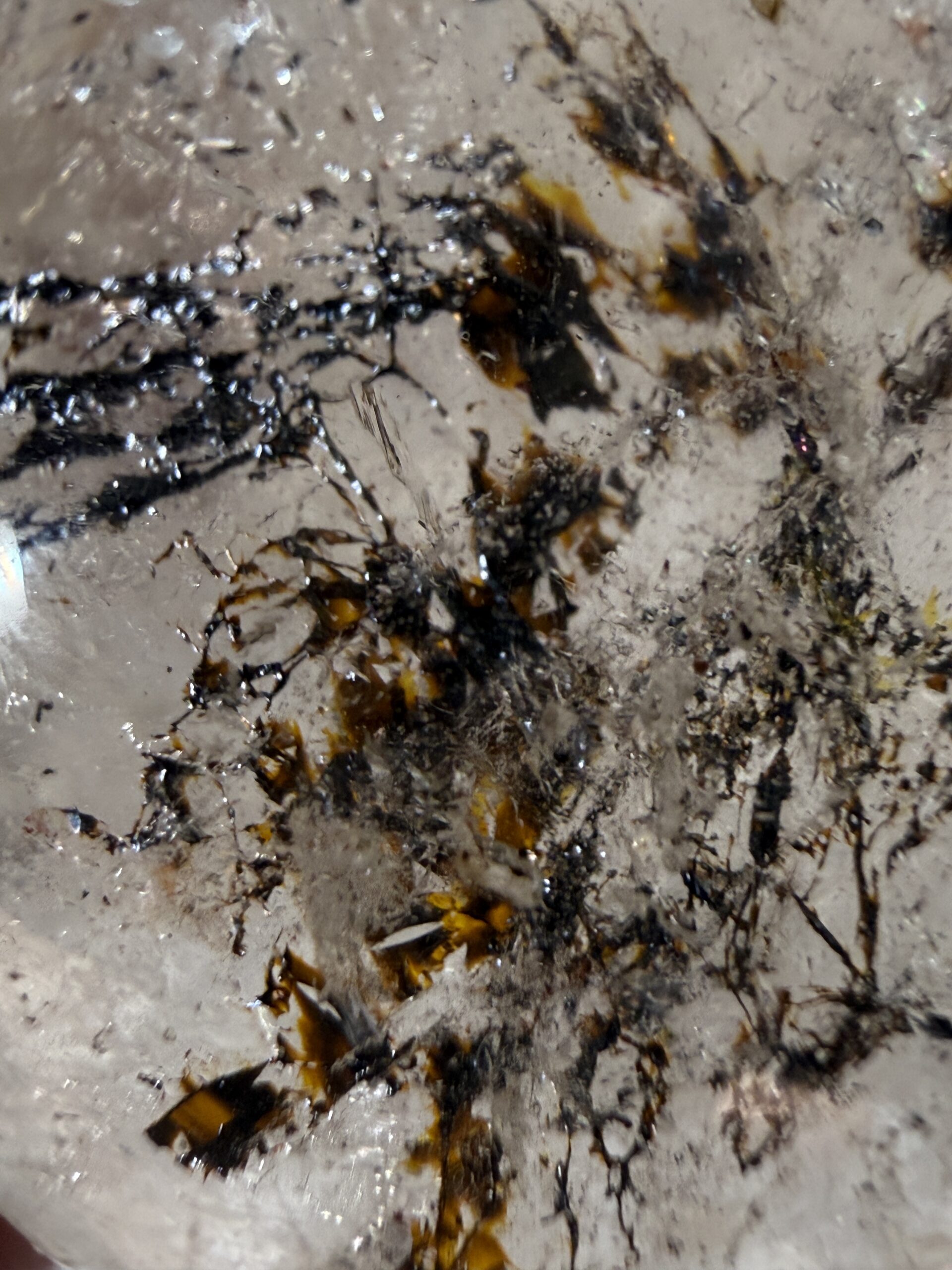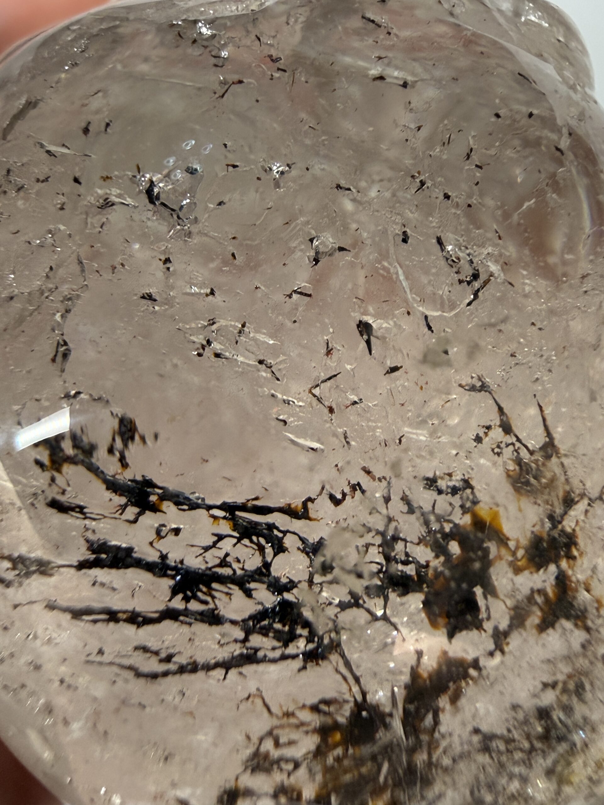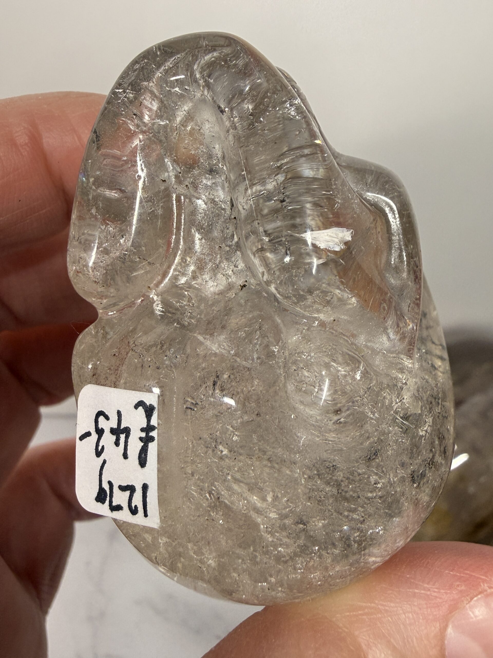This beautifully carved clear Quartz skull carving has unusual metallic inclusions. Possibly hematite or Goethite.