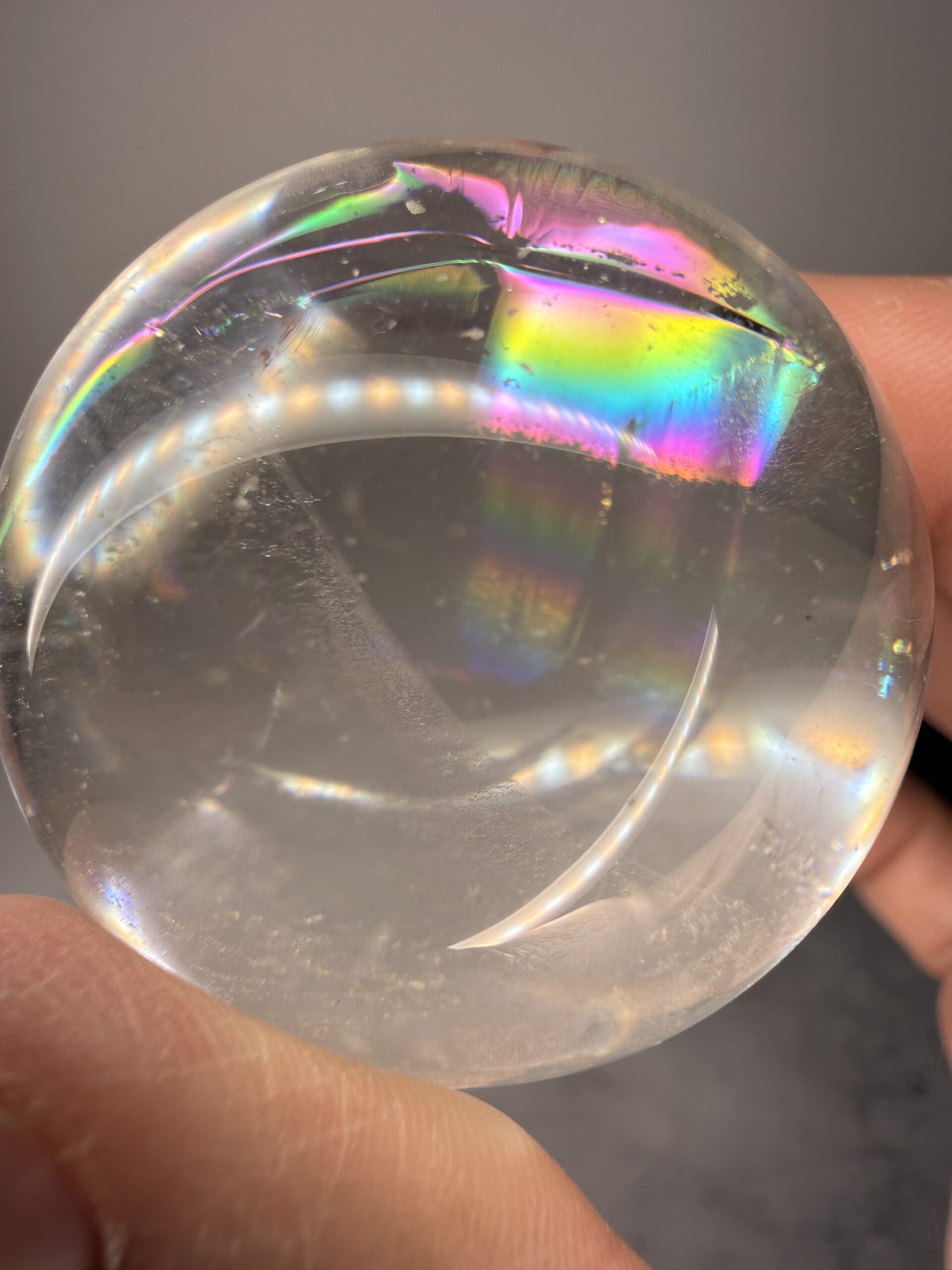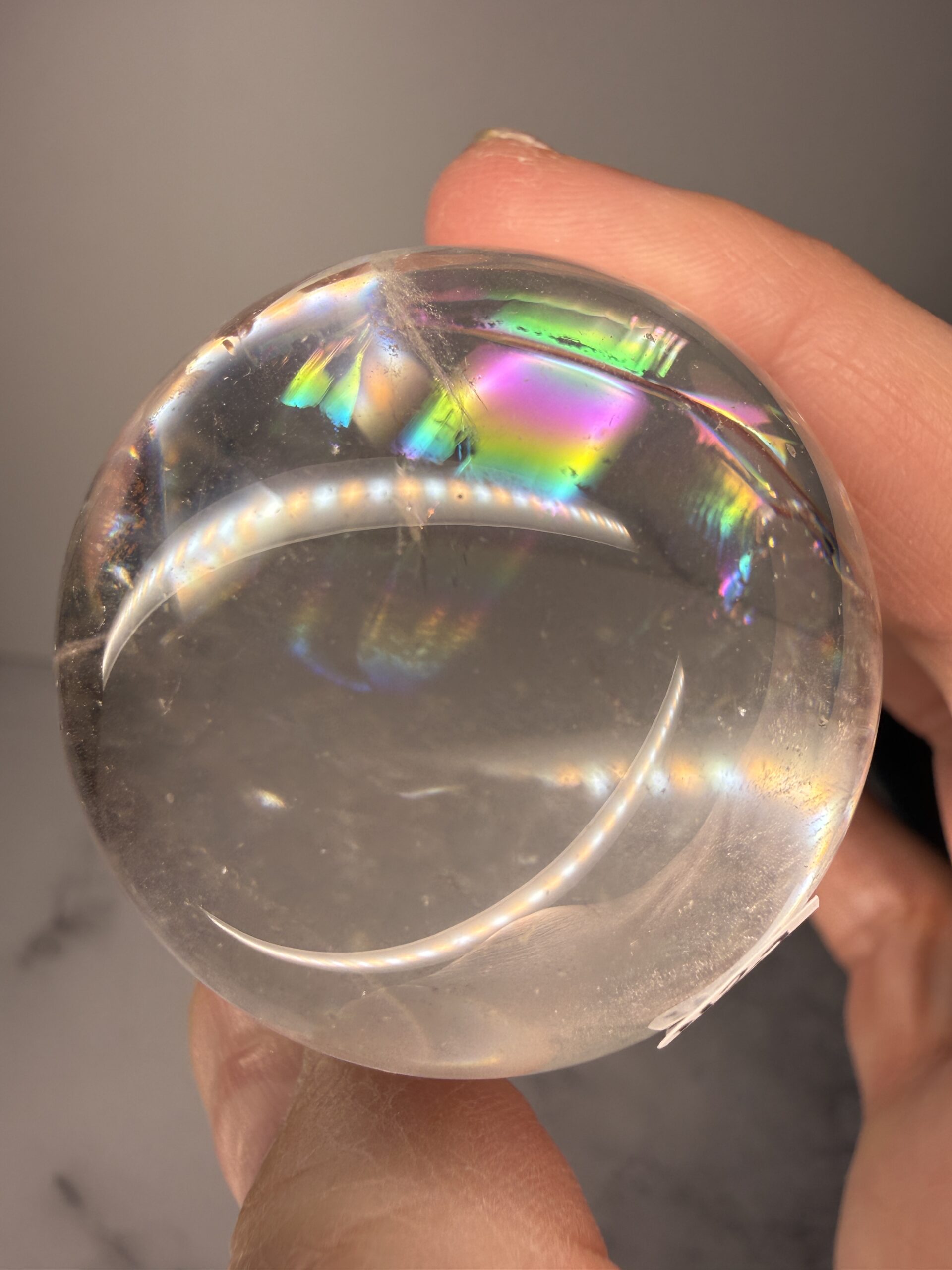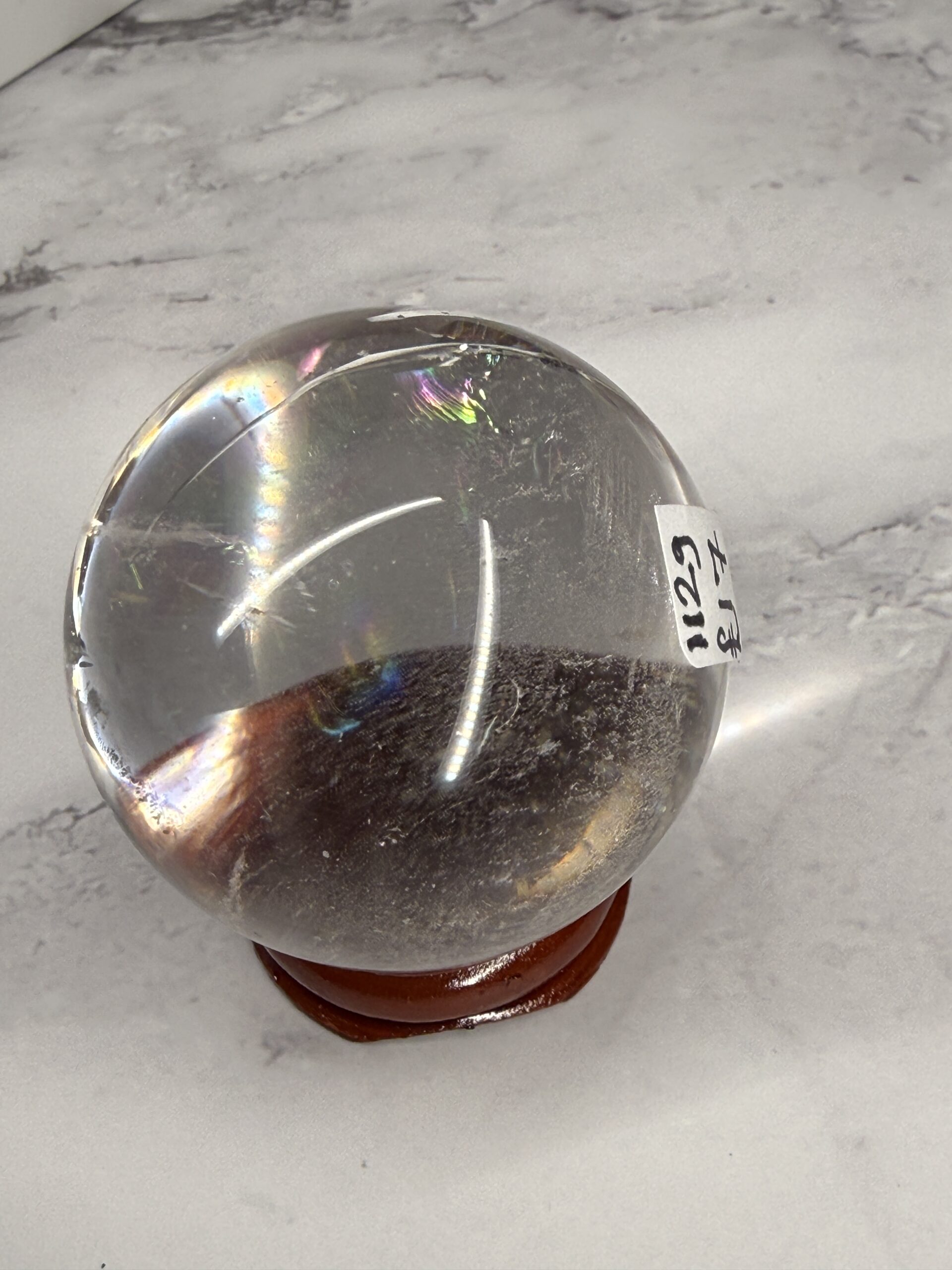 This is a lovely clear Quartz sphere with great clarity. It also features a lovely veil and a great rainbow when light passes through.