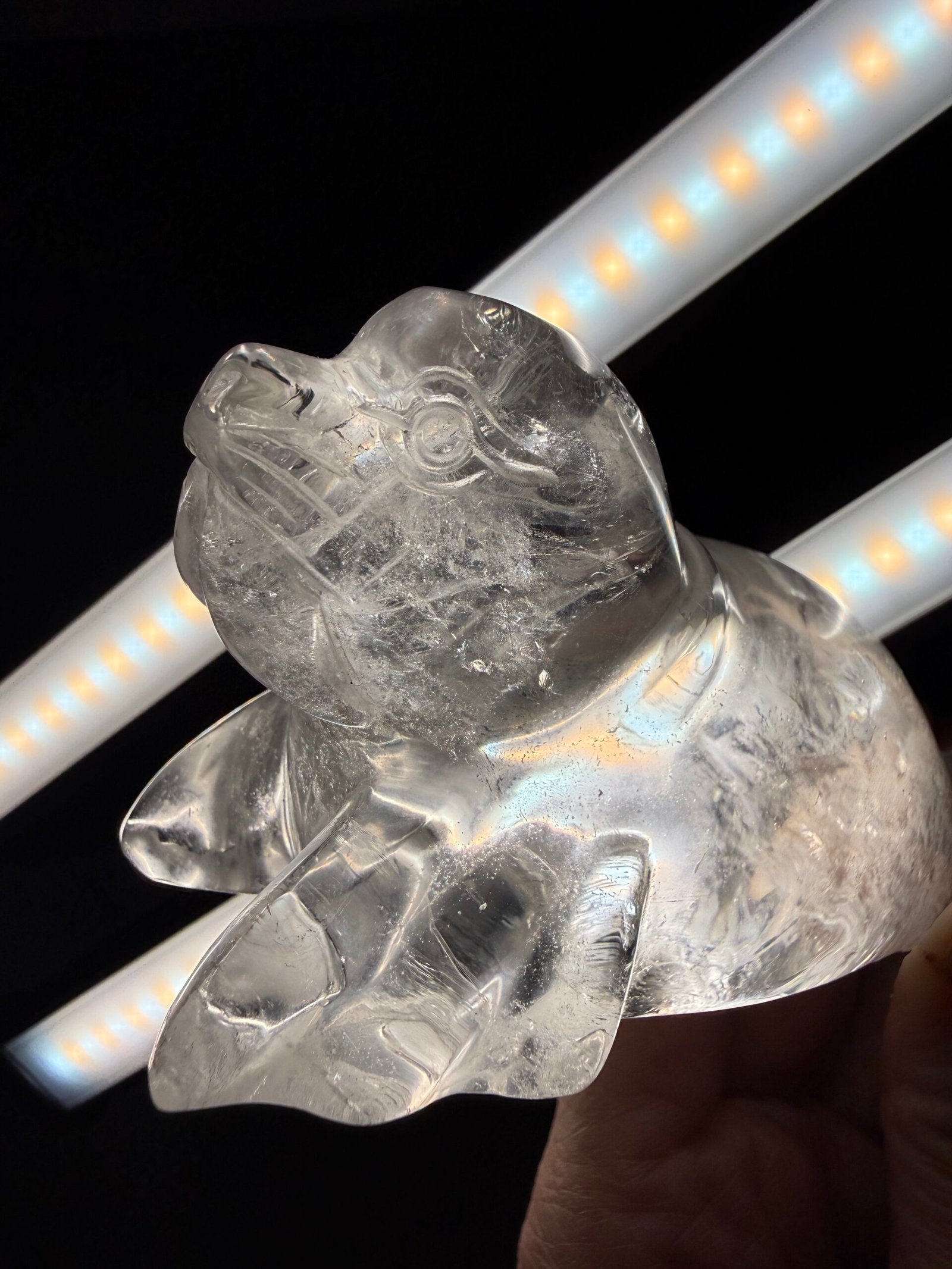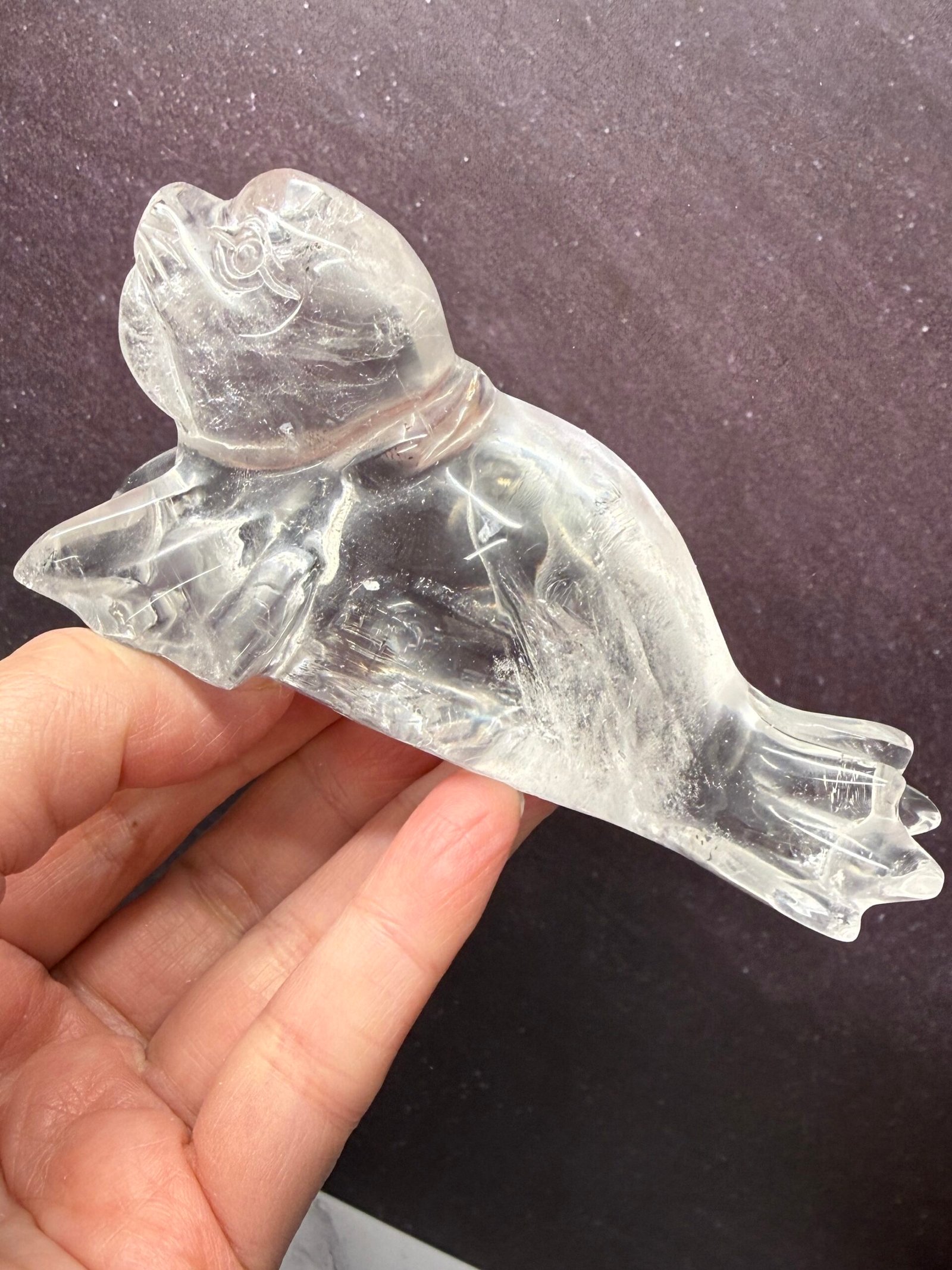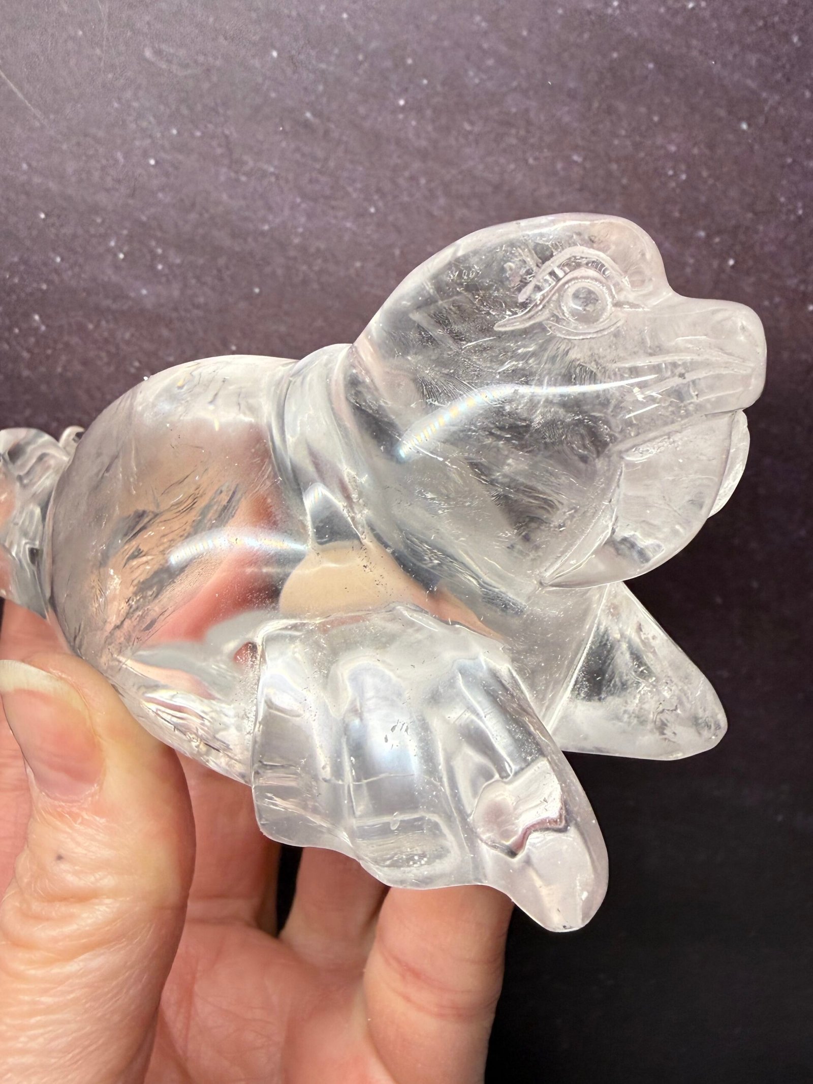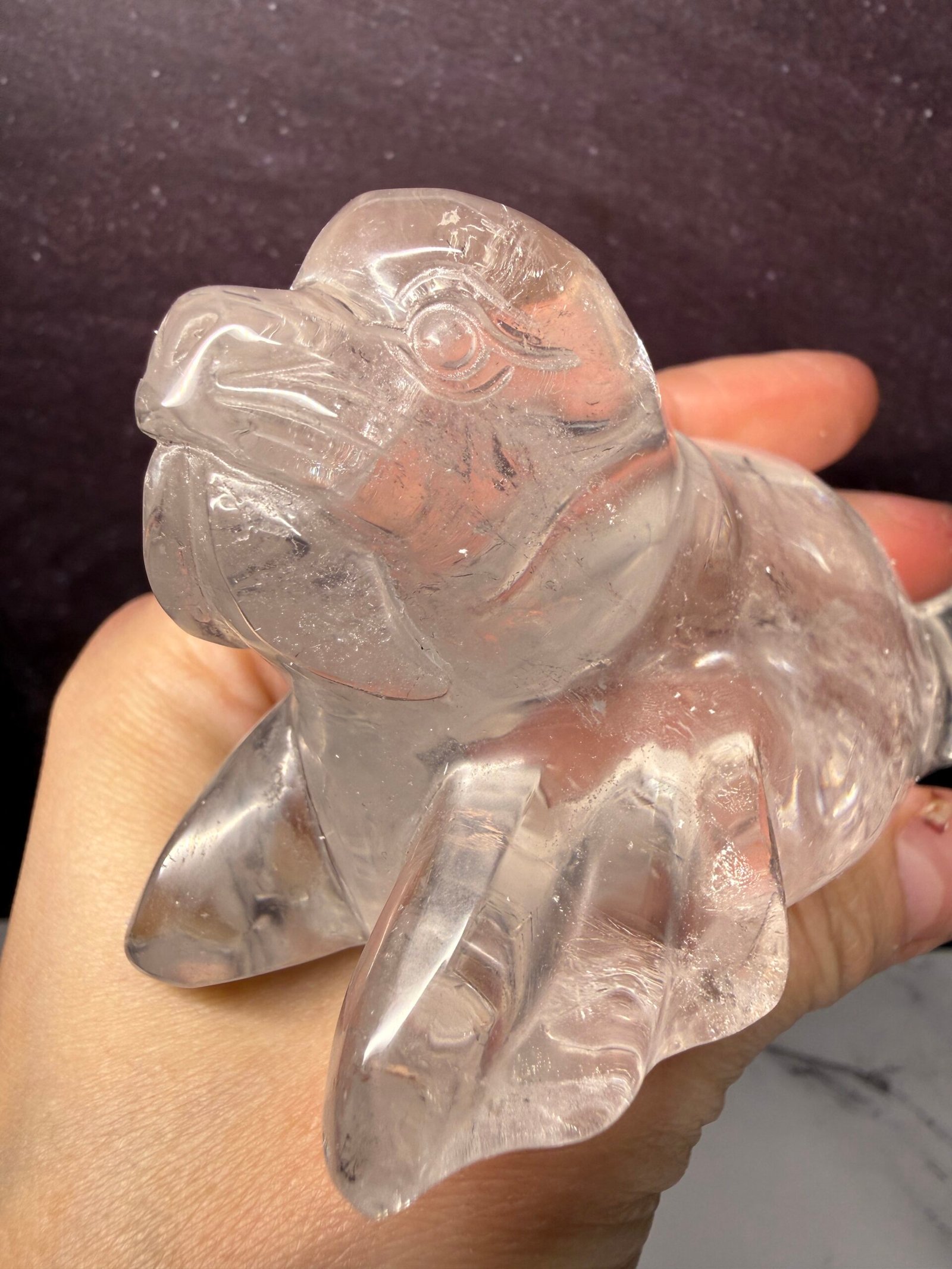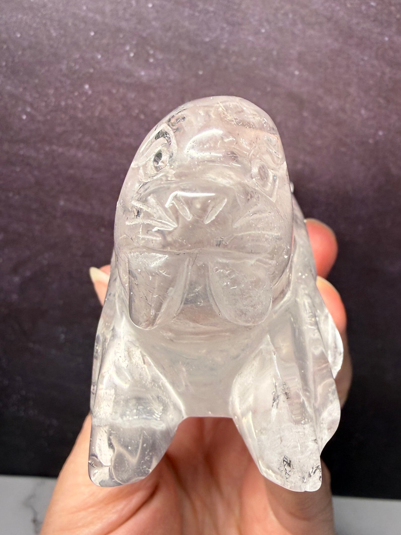 This hand carved clear Quartz walrus has so much character. This high quality clear Quartz has wonderful clarity.
