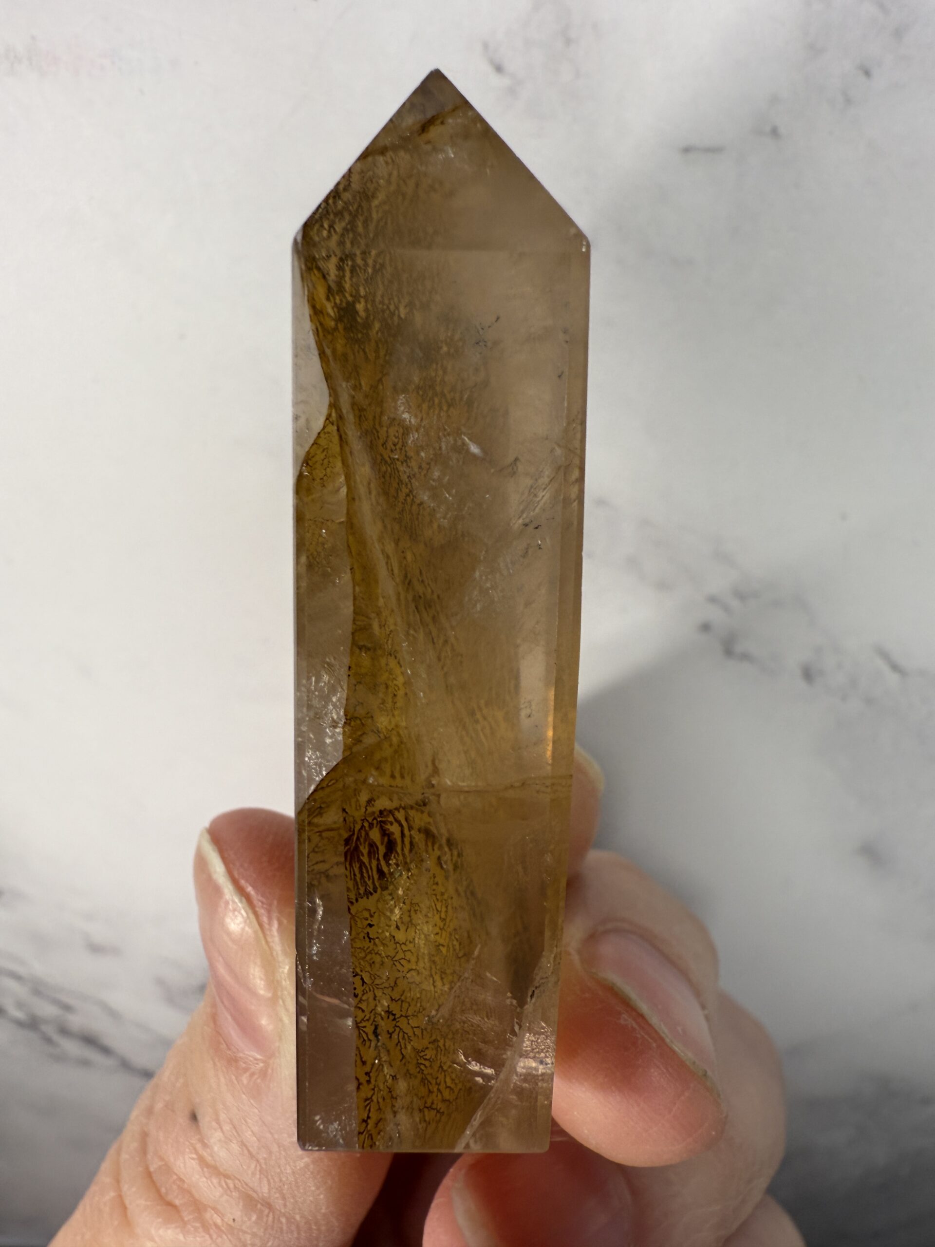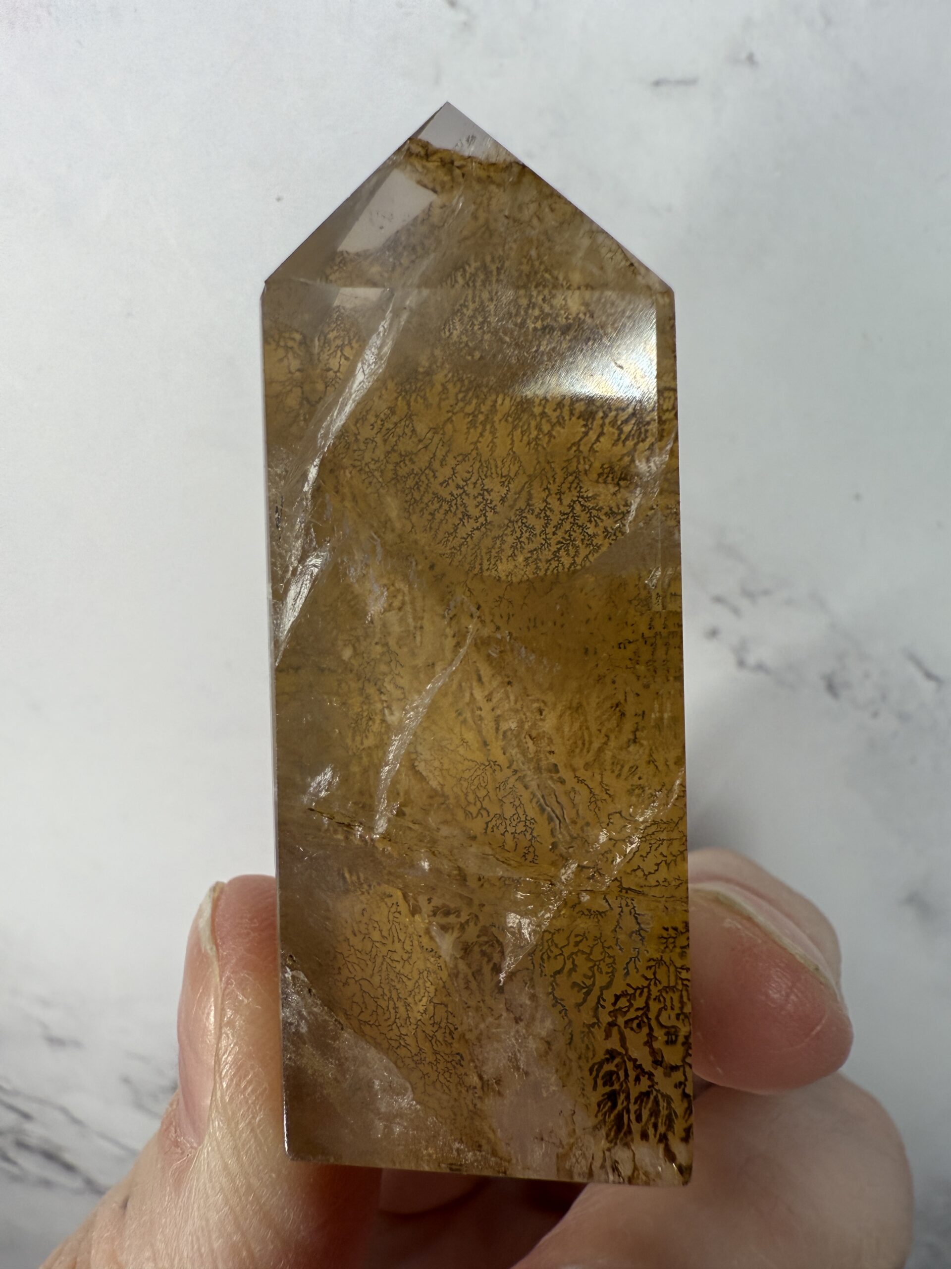 A Dendritic Golden Healer is a rare, beautiful variety of quartz crystal featuring fern-like inclusions (dendrites) of iron/manganese within a golden-hued quartz, combining the potent healing energy of Golden Healer quartz with the earth connection of dendrites, promoting transformation, spiritual growth, joy, and self-confidence by clearing blockages and inviting natural patterns into one’s life.Â