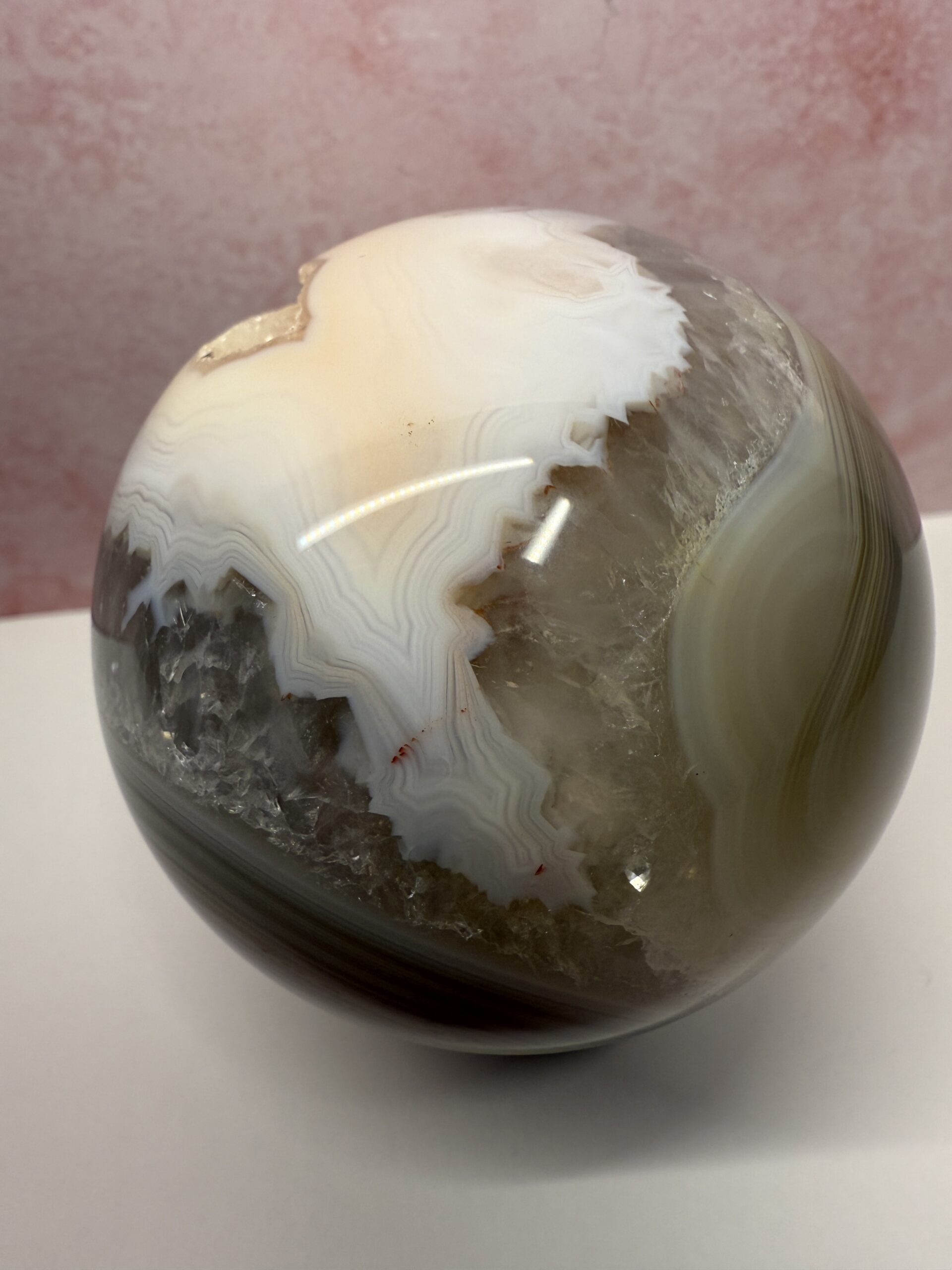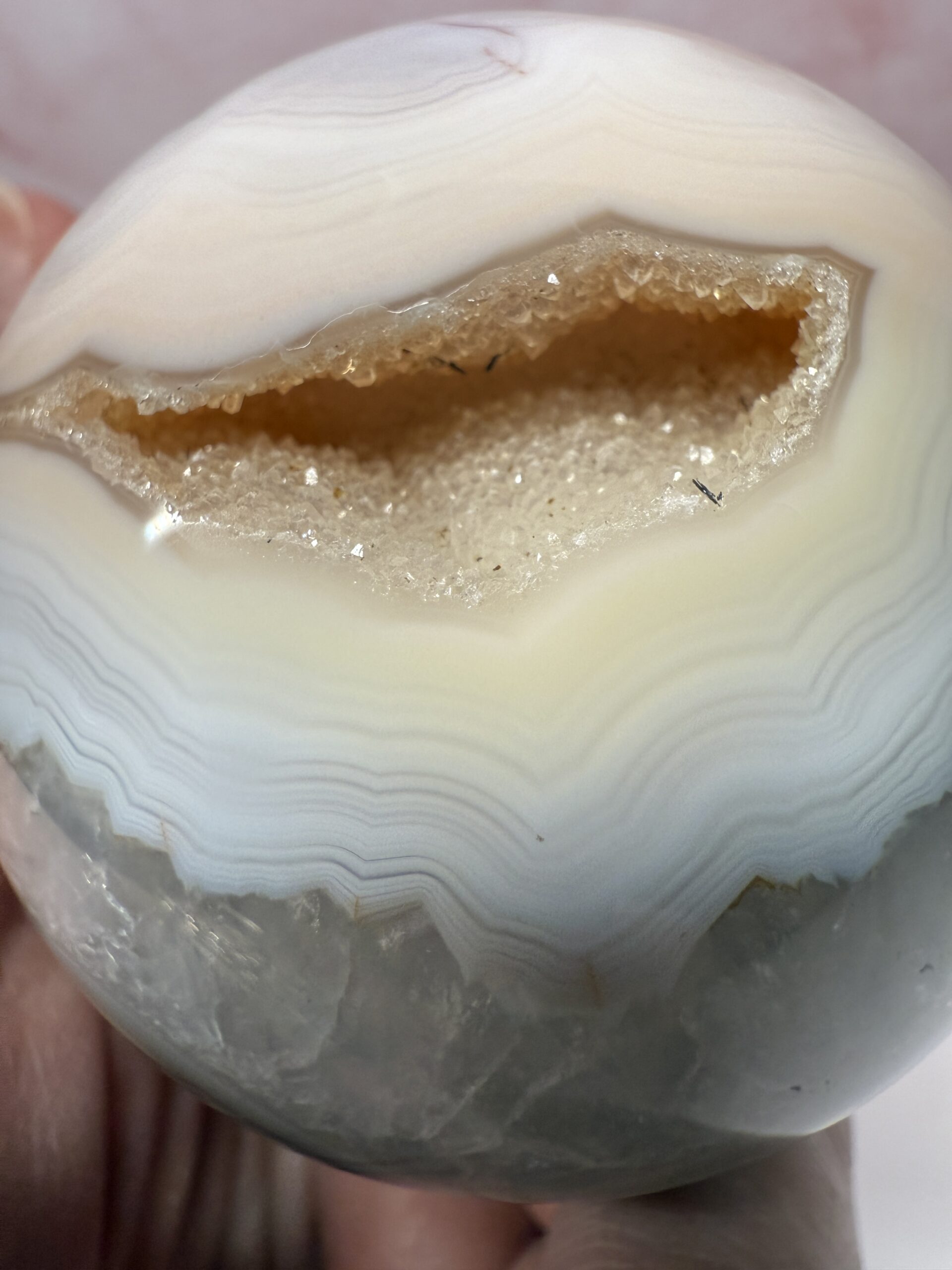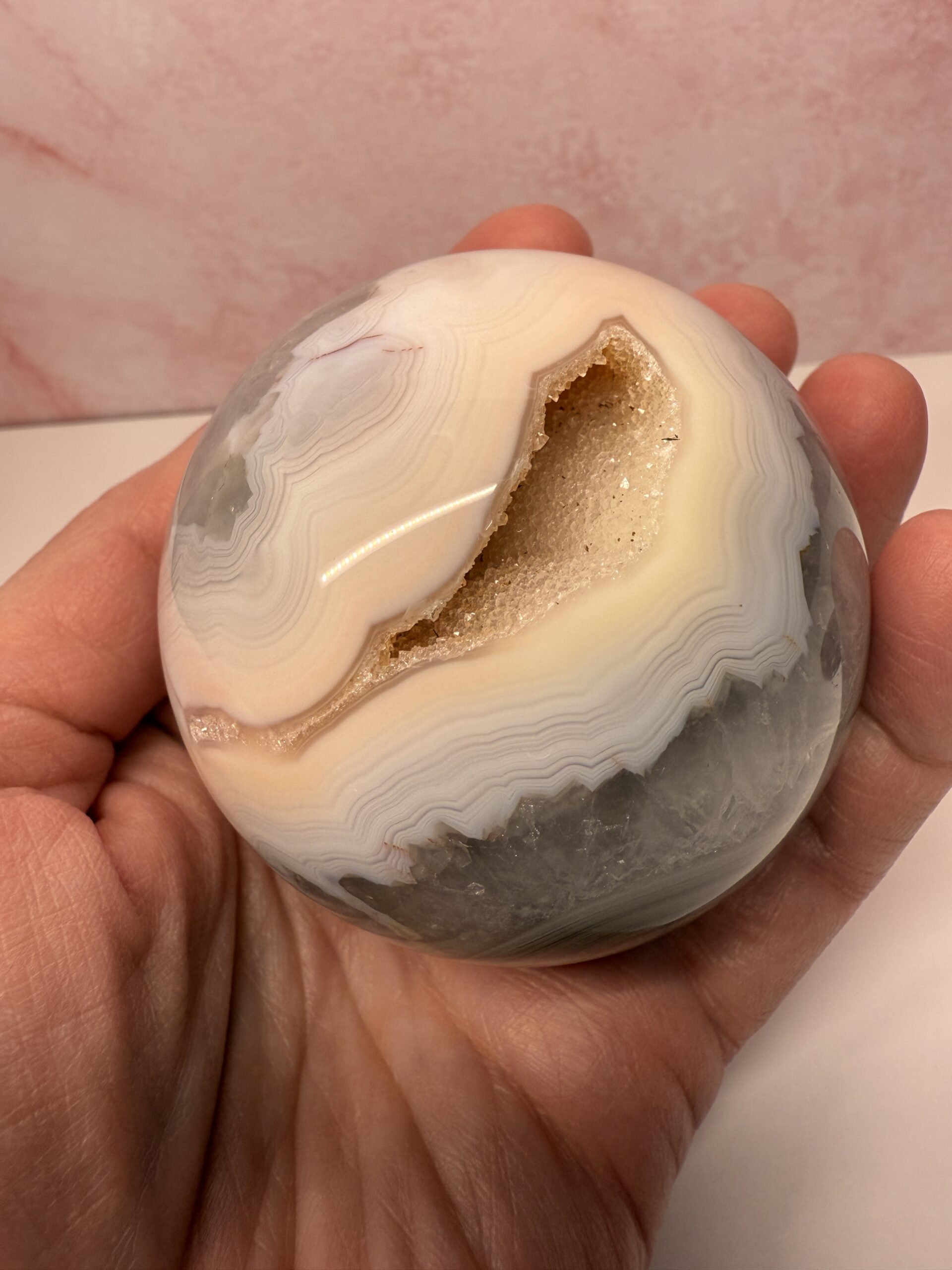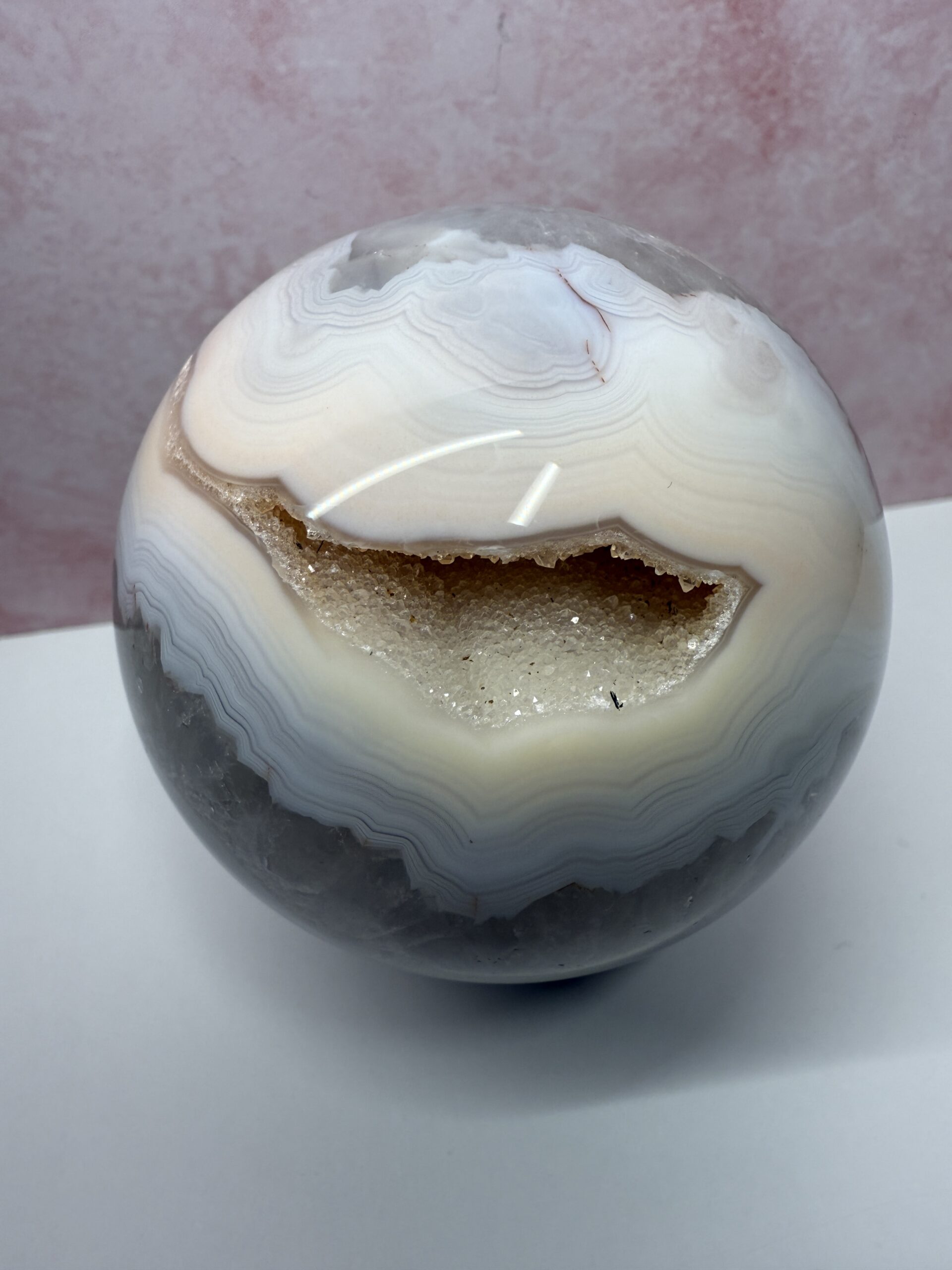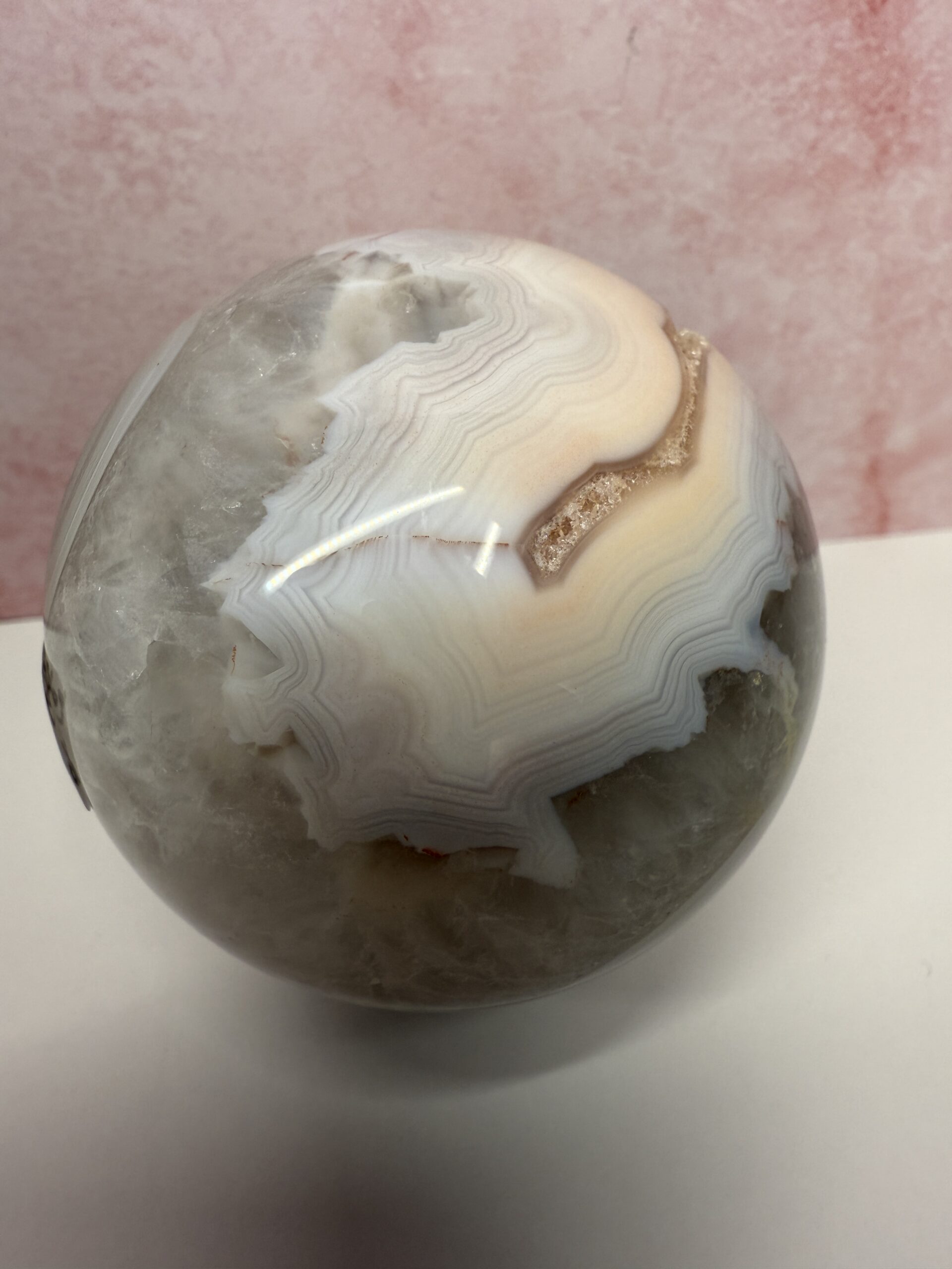 Soft grey tones, with quartz bands then wonderful peaches and white banding, finished off with a peachy sugary drusy pocket. Simply stunning. This gorgeous sphere would be perfect in any crystal collection.