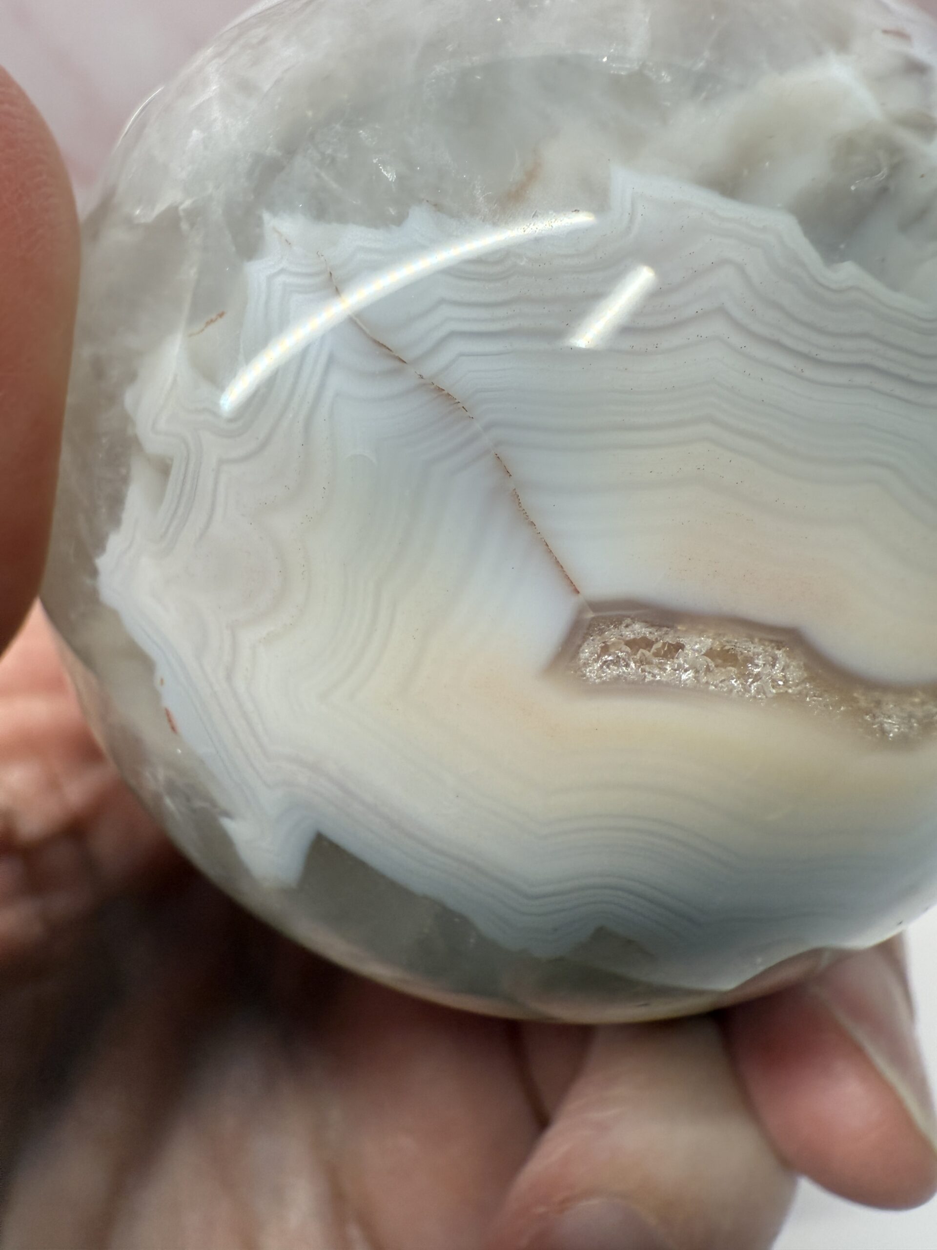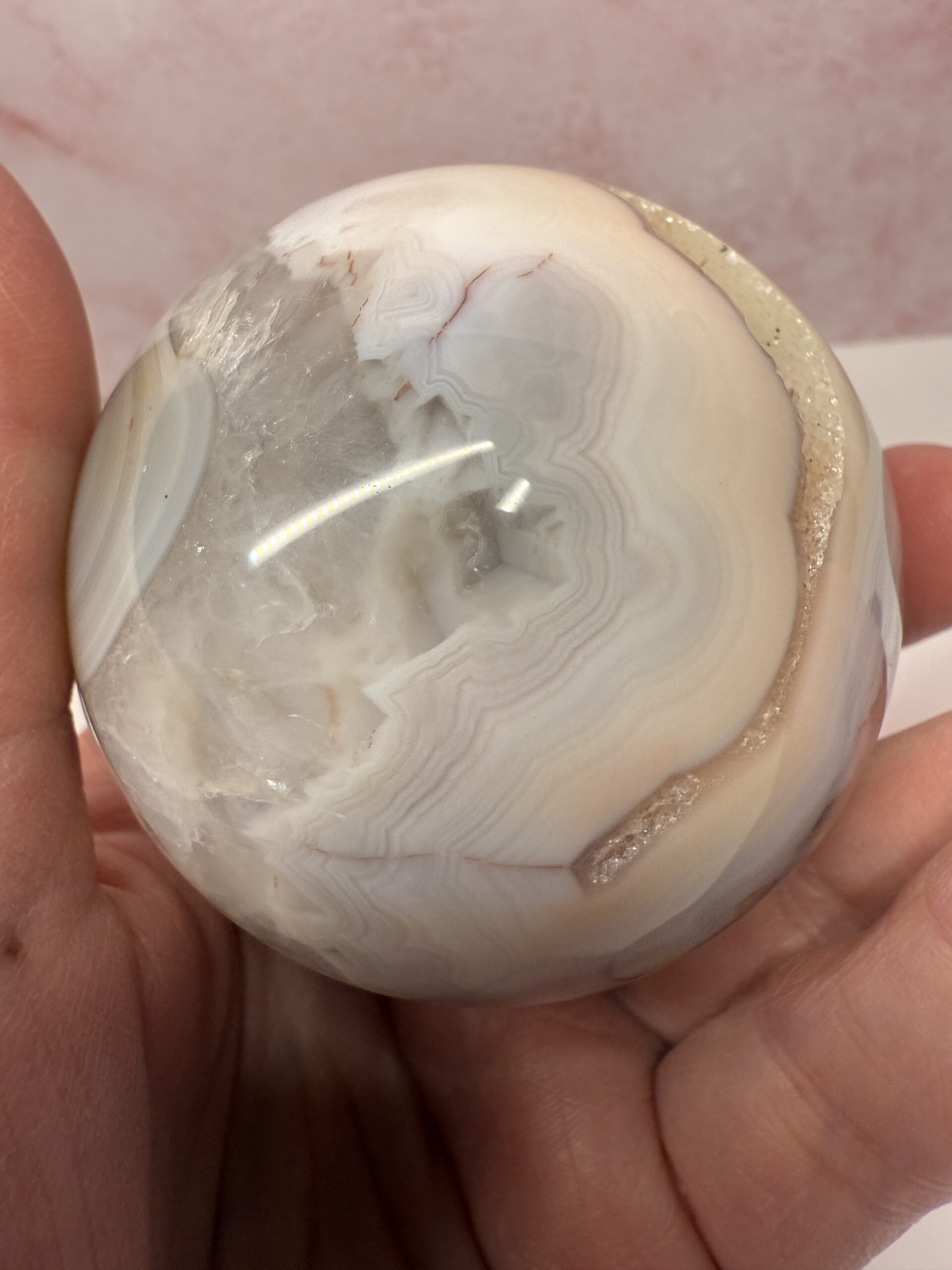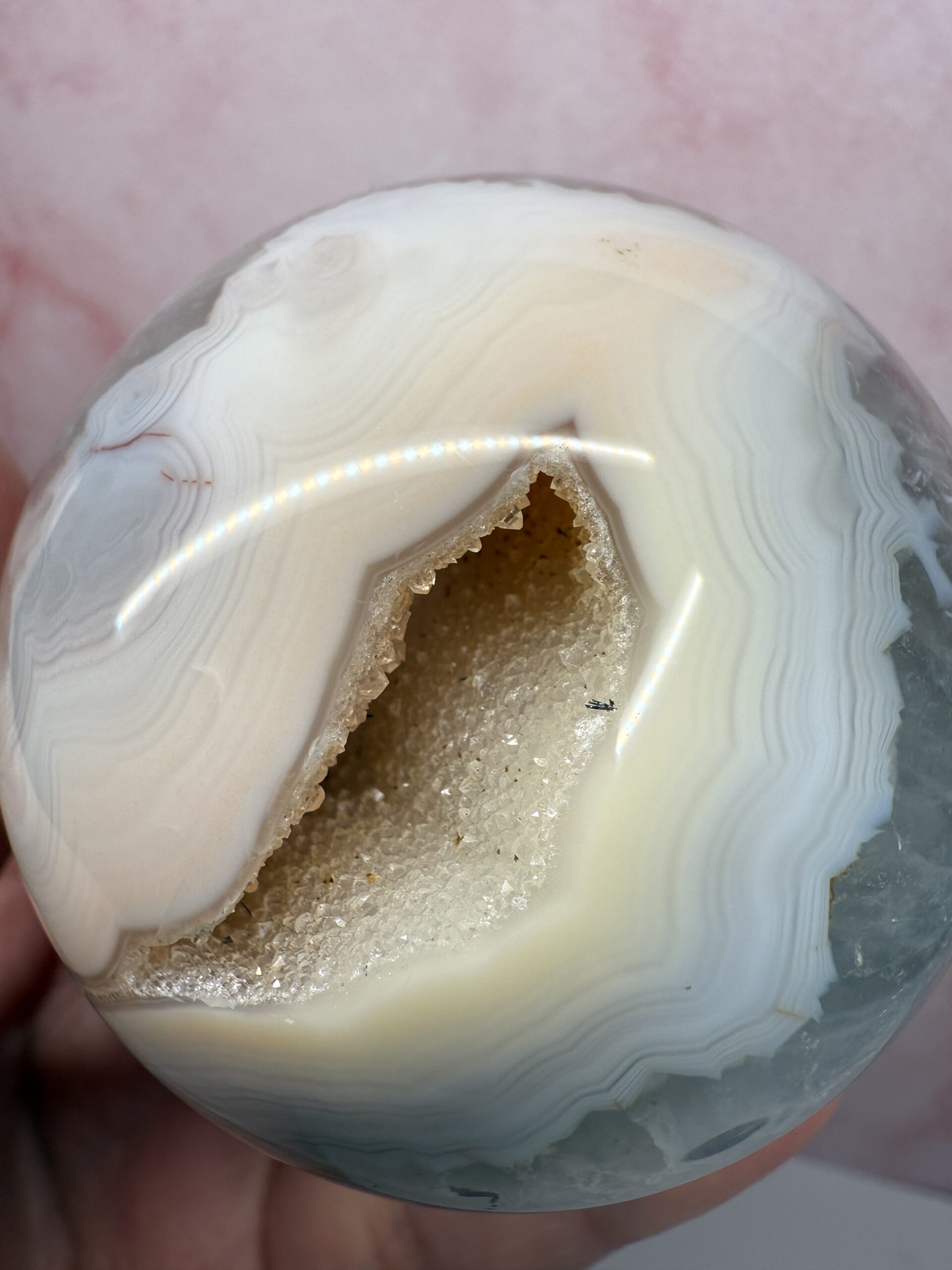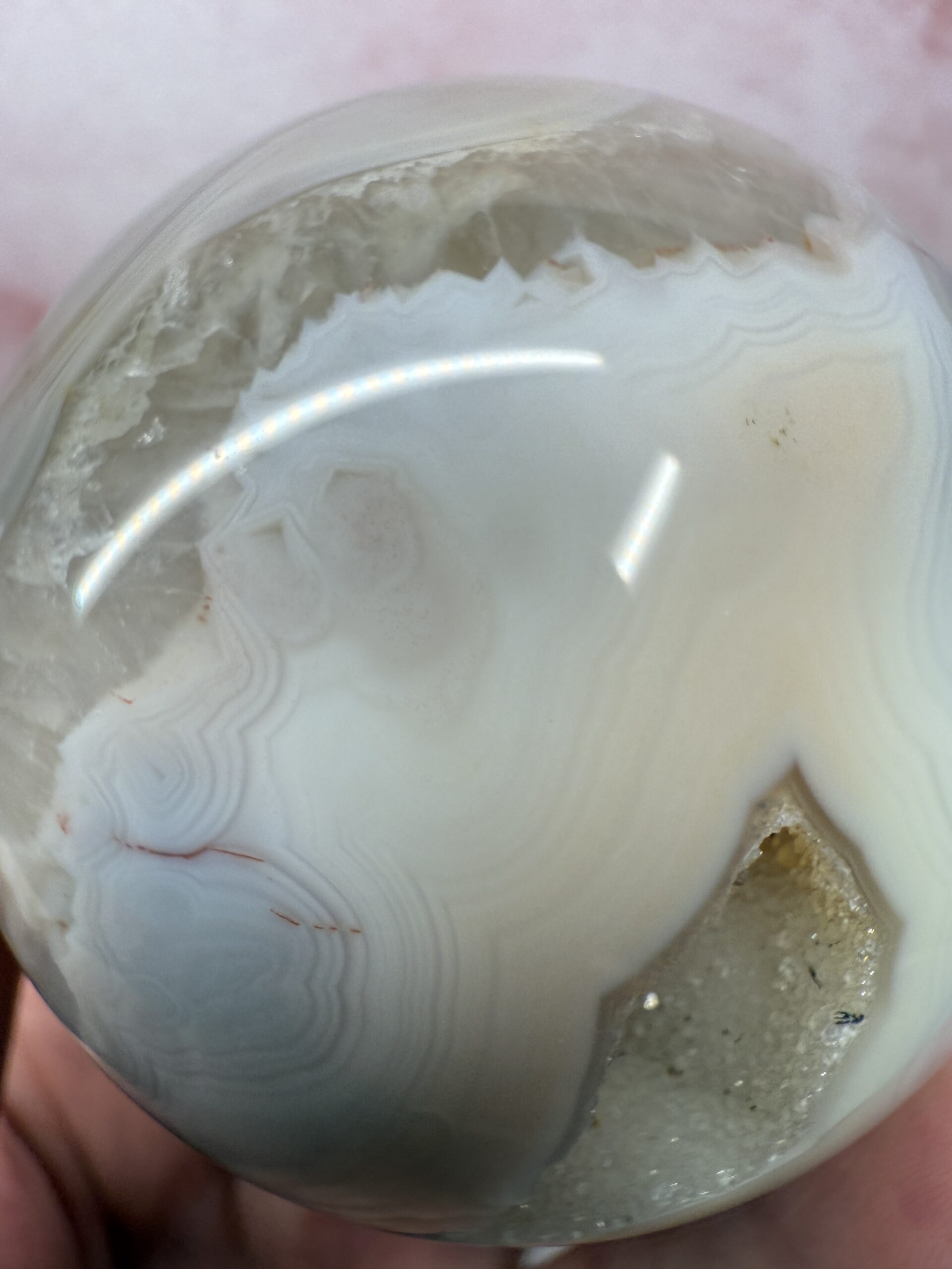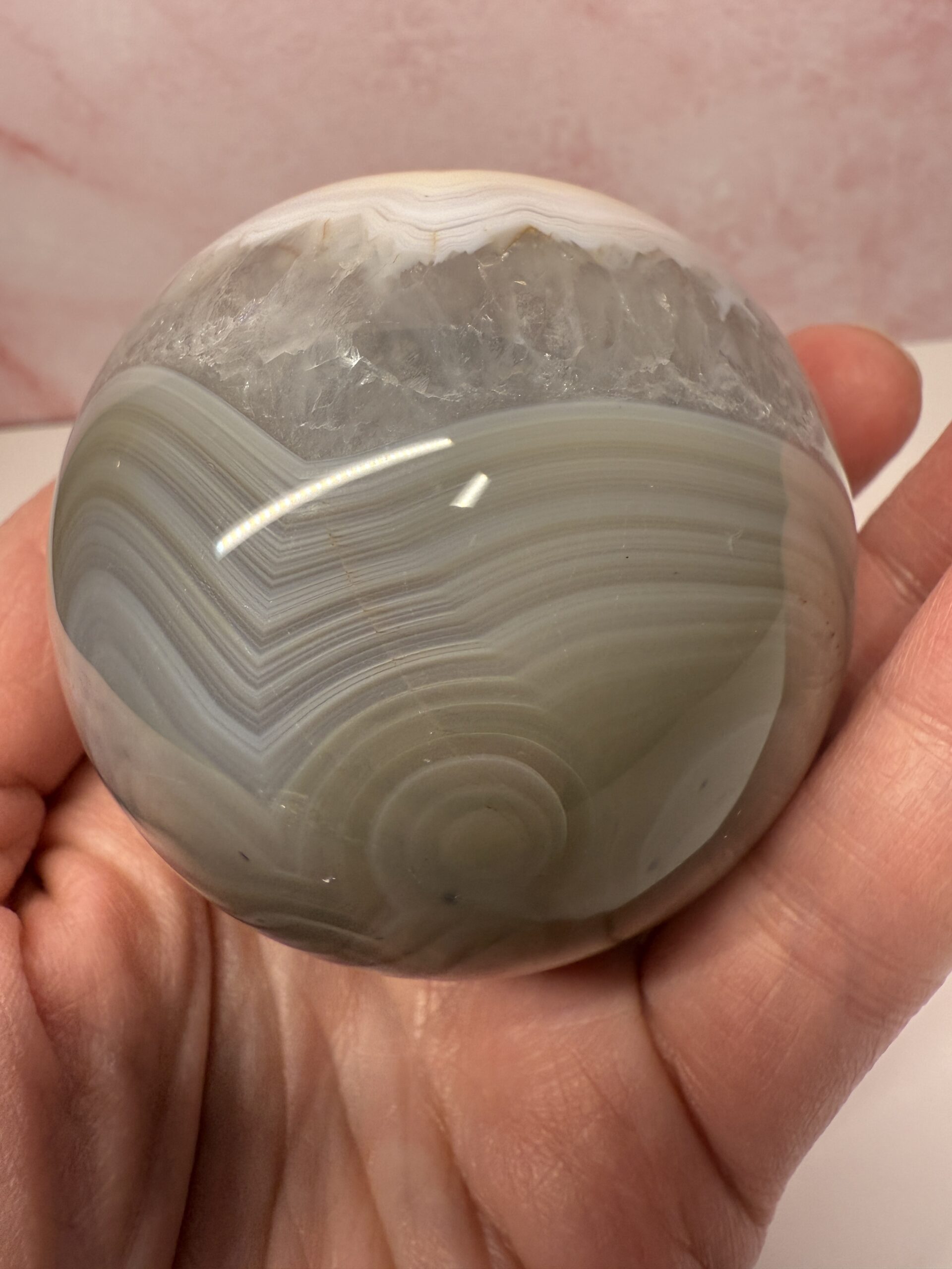 Soft grey tones, with quartz bands then wonderful peaches and white banding, finished off with a peachy sugary drusy pocket. Simply stunning. This gorgeous sphere would be perfect in any crystal collection.