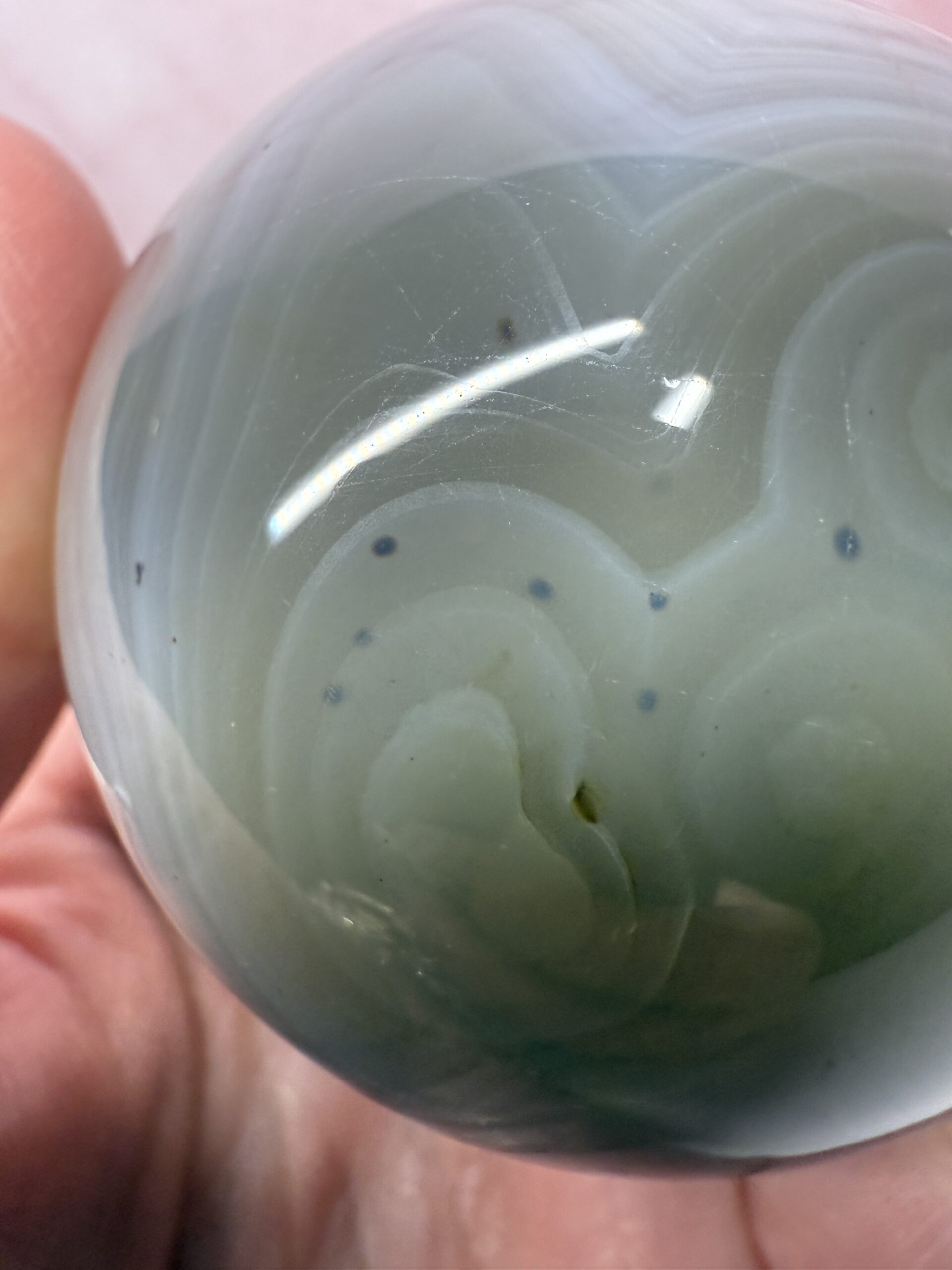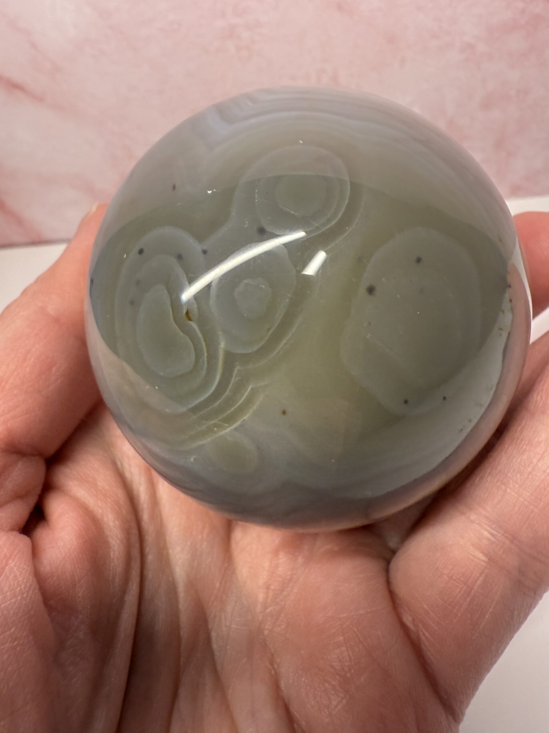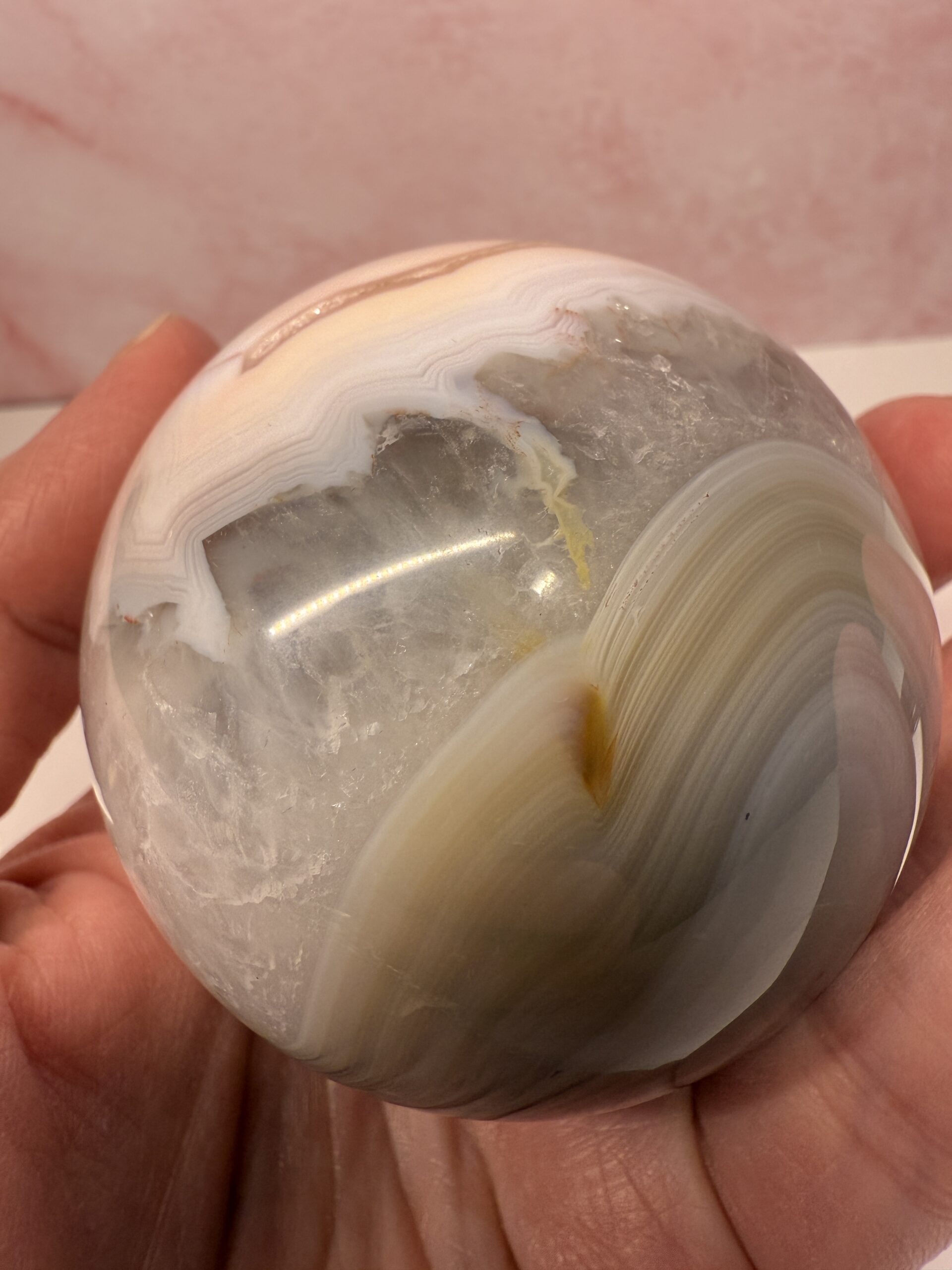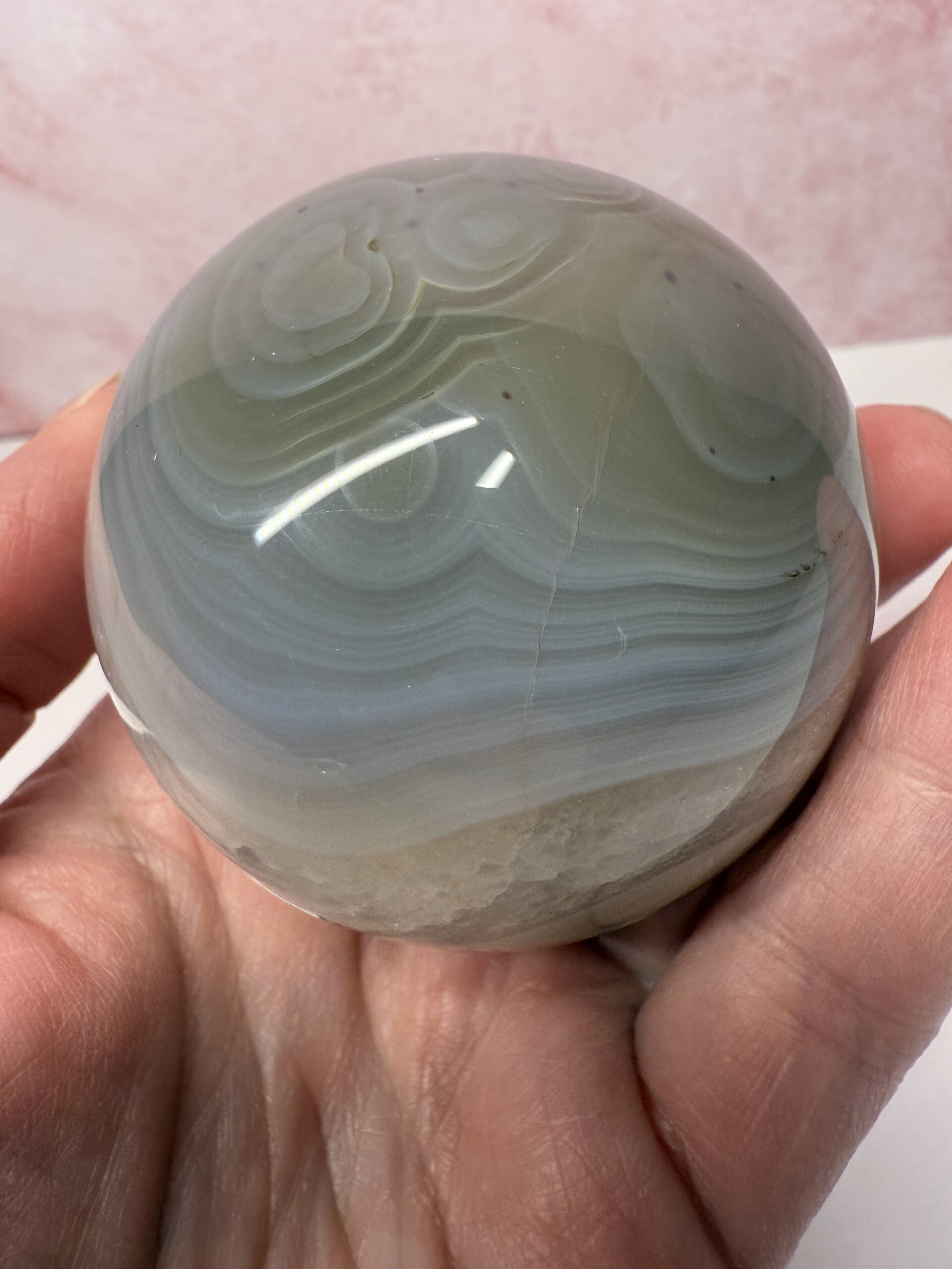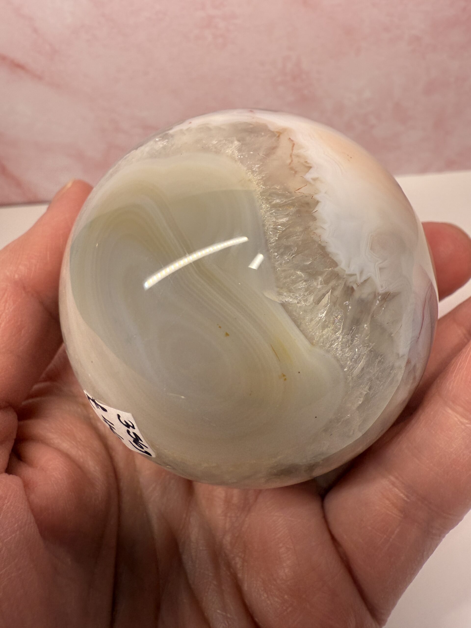 Soft grey tones, with quartz bands then wonderful peaches and white banding, finished off with a peachy sugary drusy pocket. Simply stunning. This gorgeous sphere would be perfect in any crystal collection.