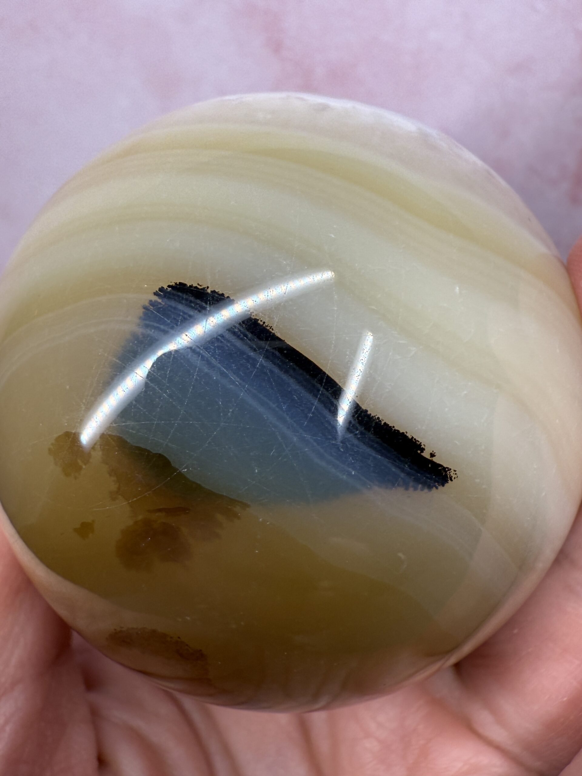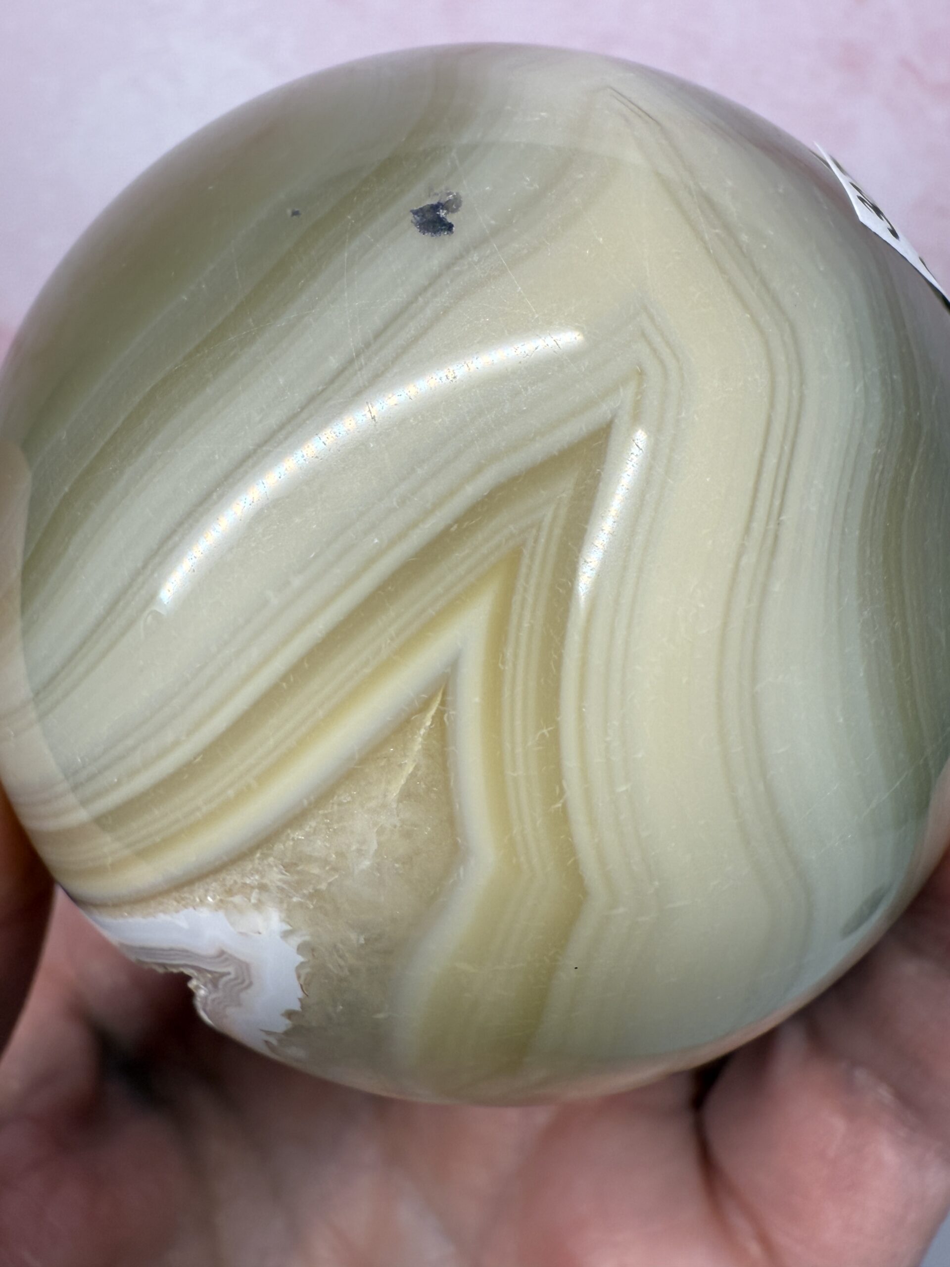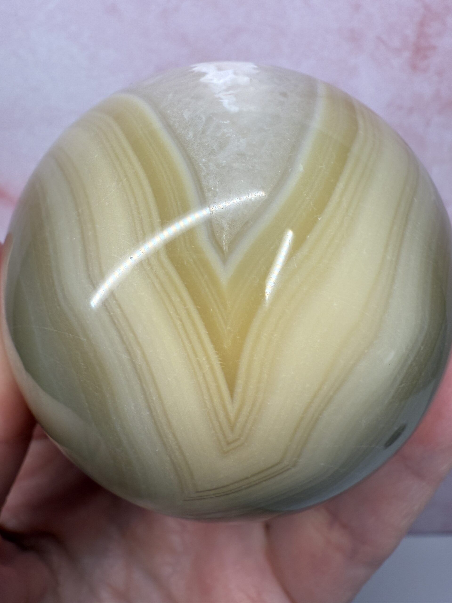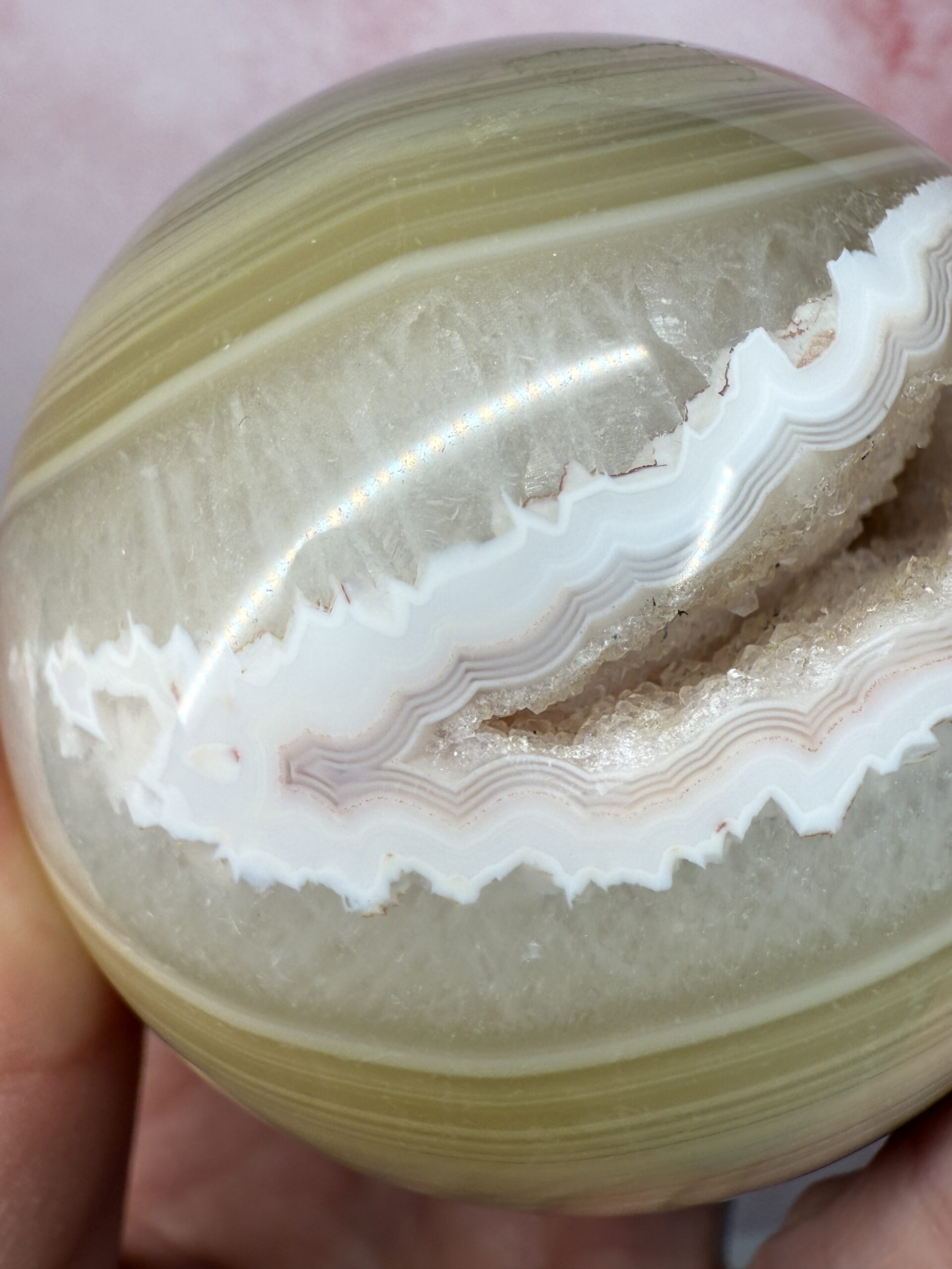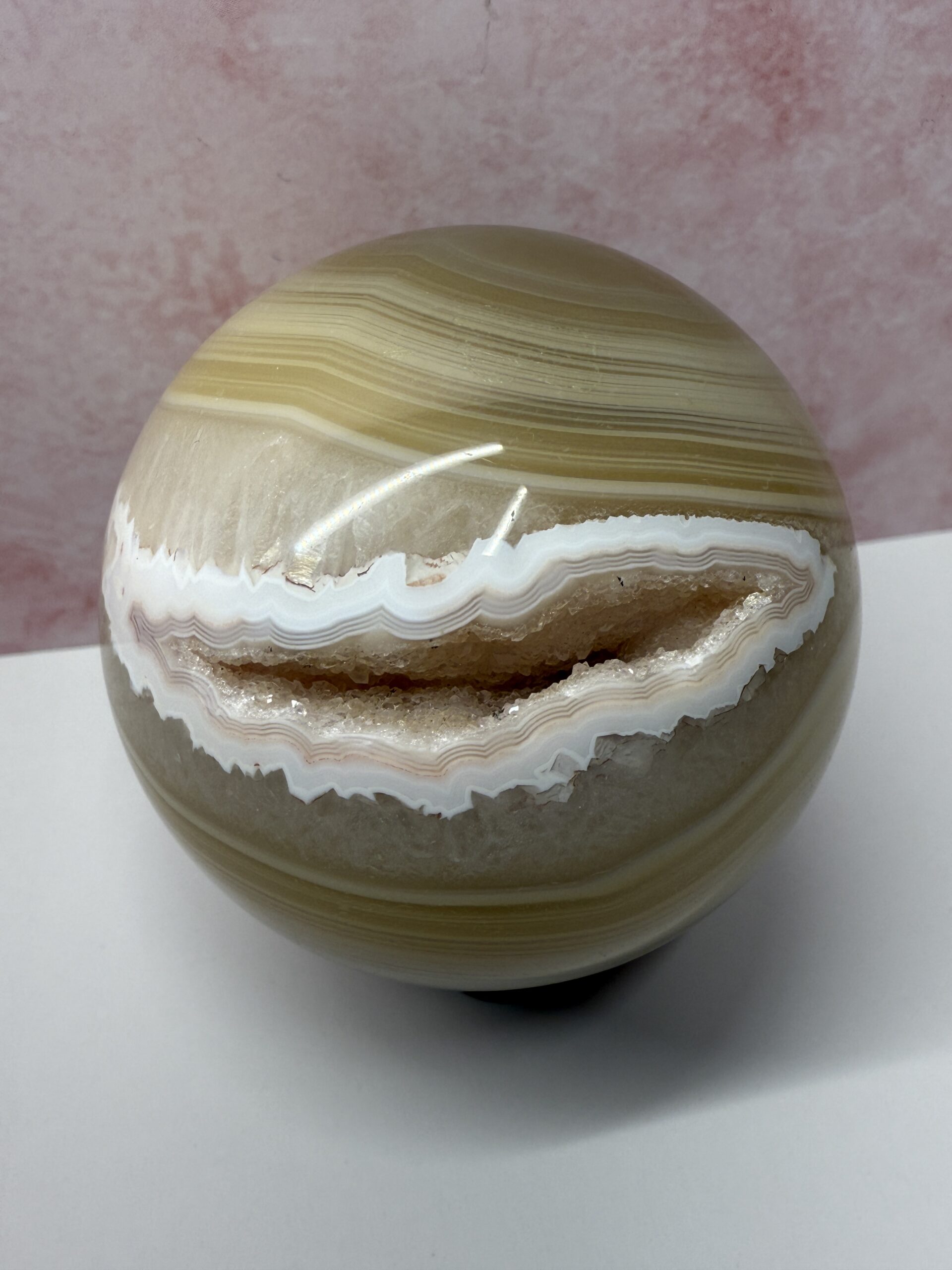 This stunning caramel toned agate sphere has a beautiful peachy-pink drusy pocket with a lovely white band around it. Well defined banding and soft tones, make this sphere an ideal addition to any collection.