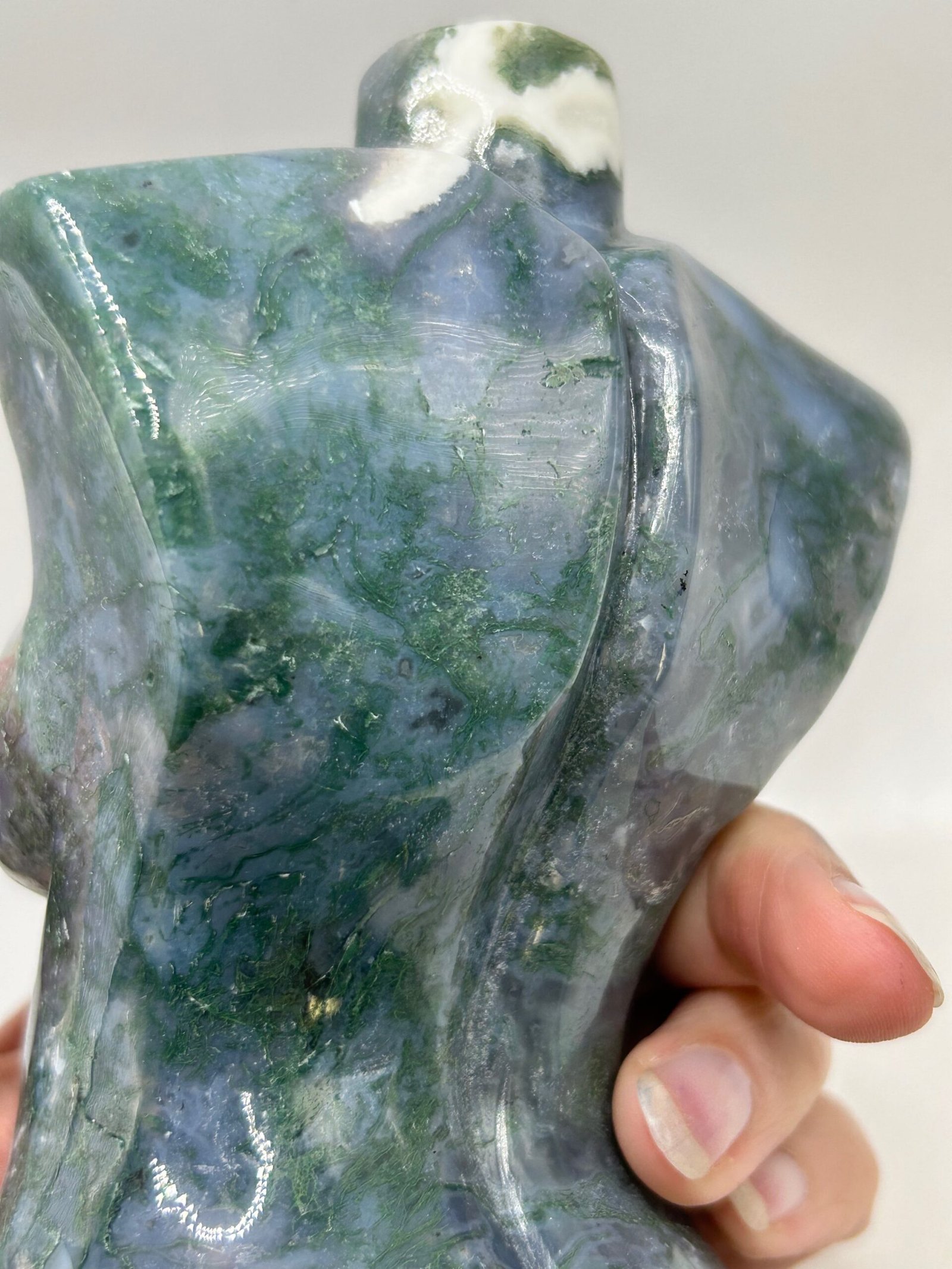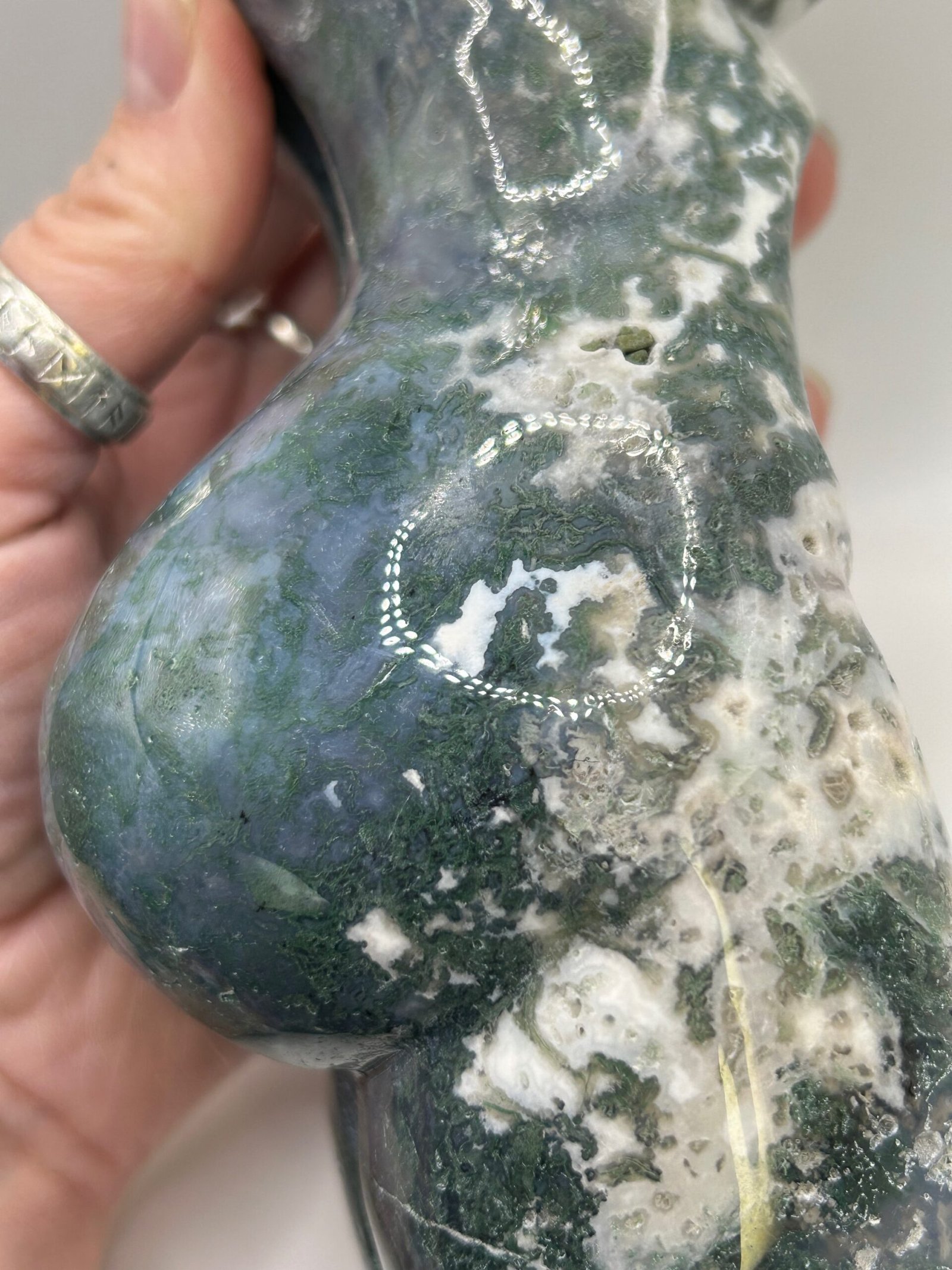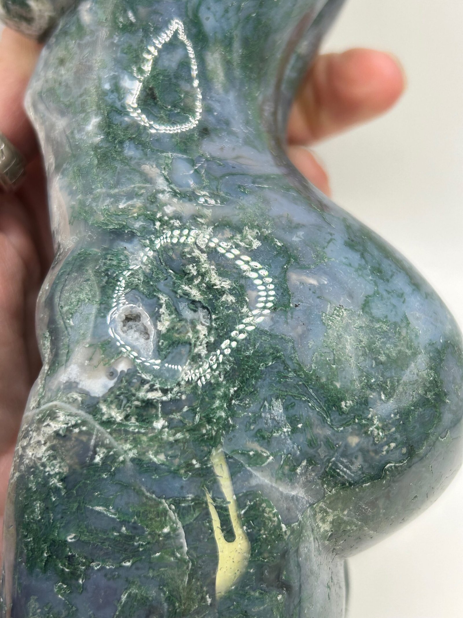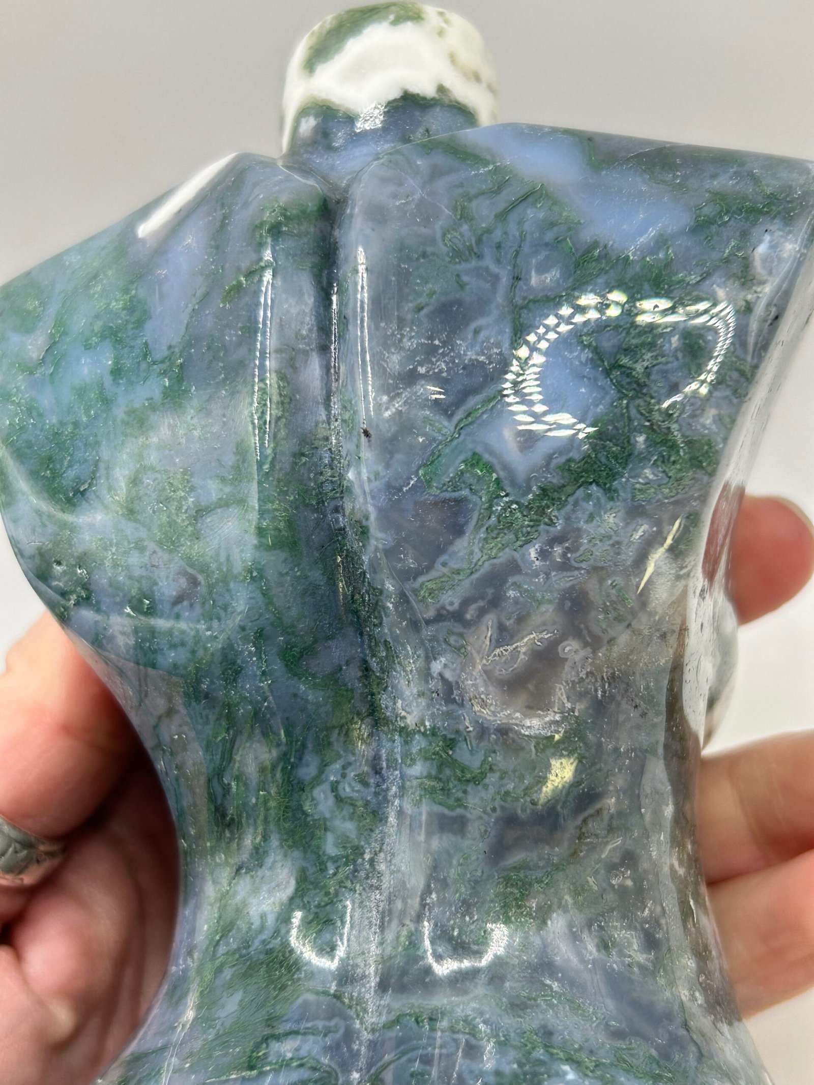 An absolutely beautiful moss agate goddess, exquisitely carved.