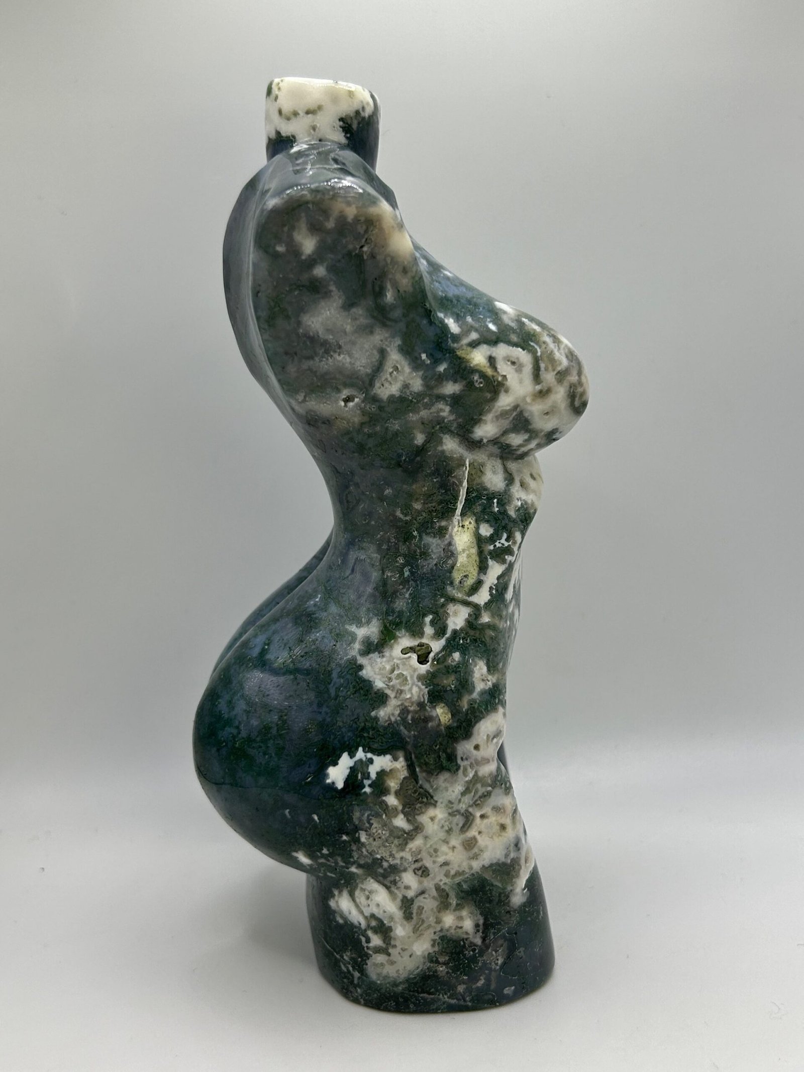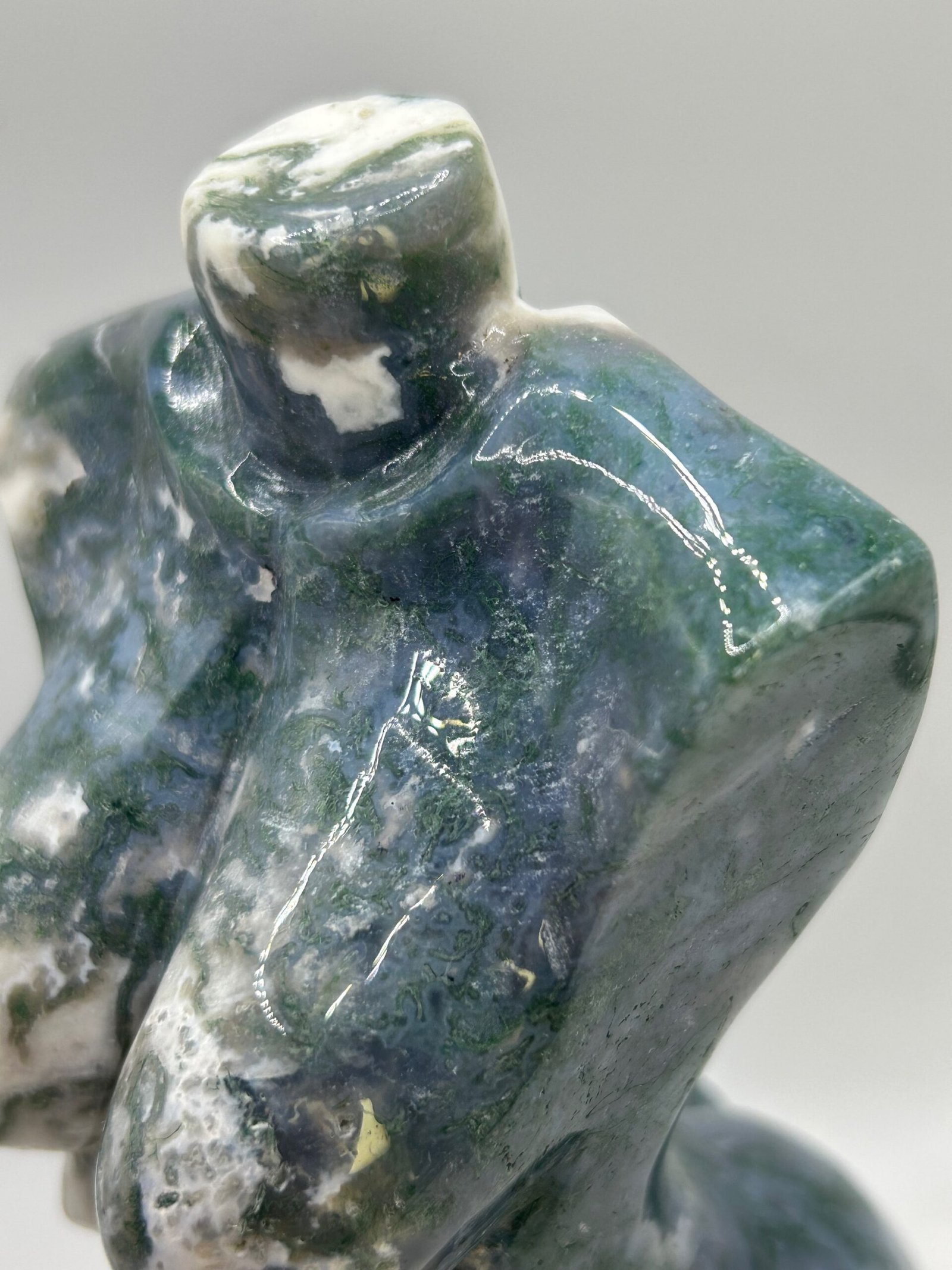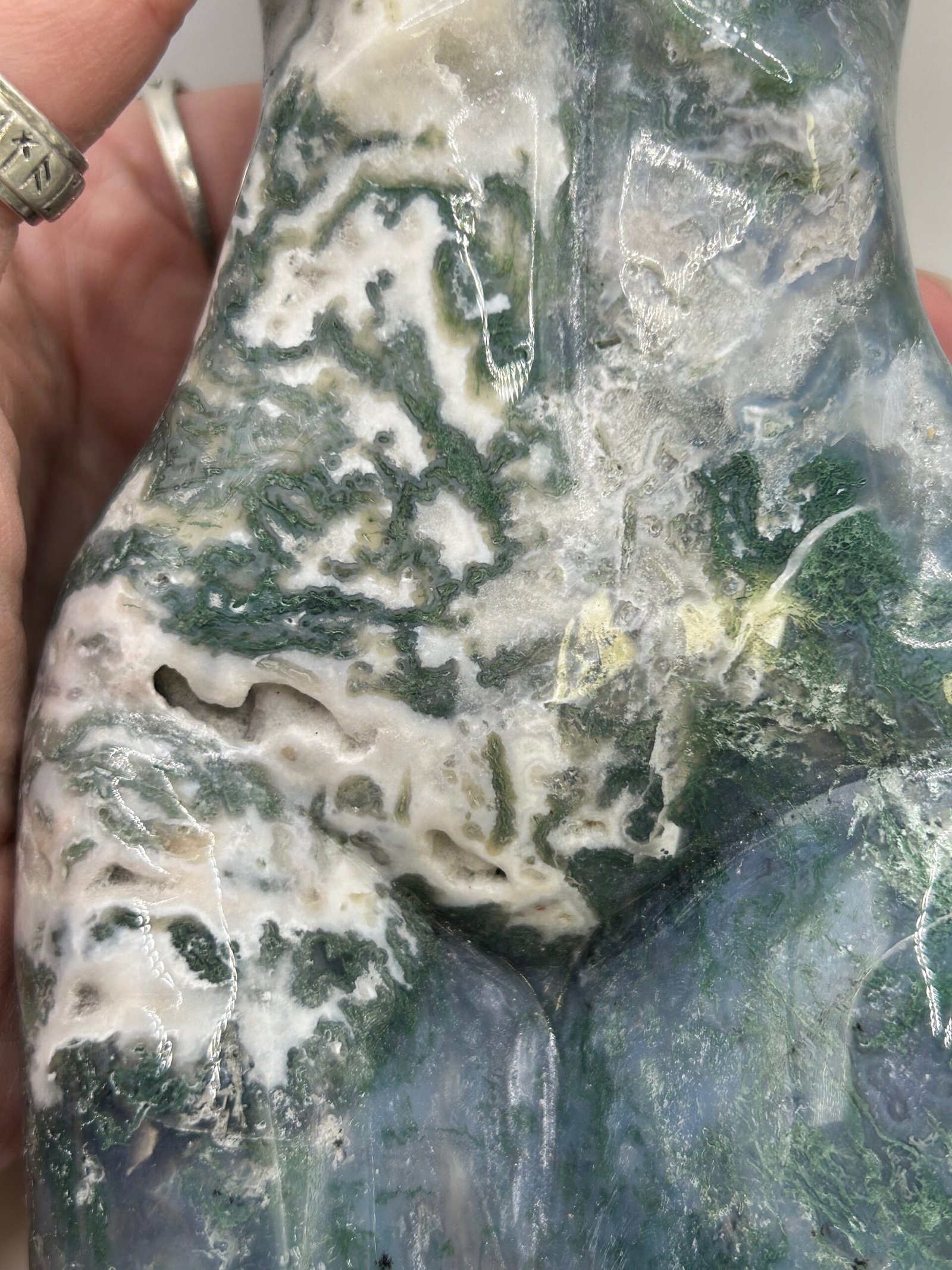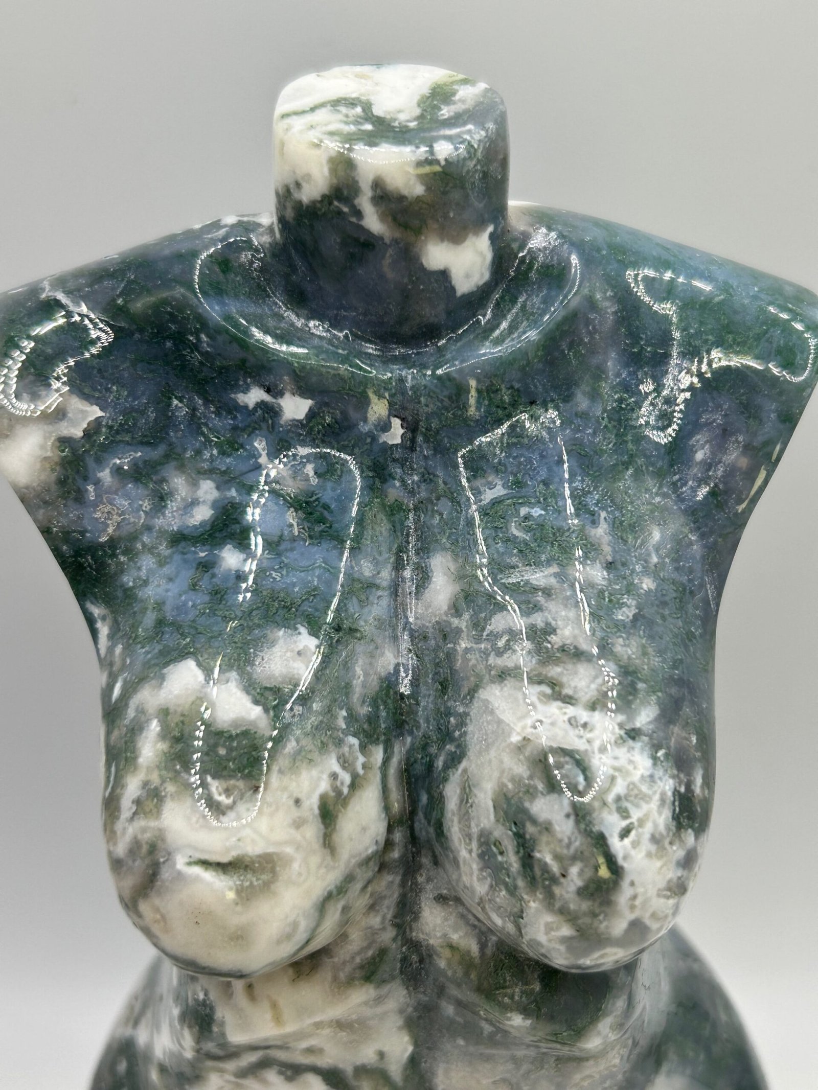 An absolutely beautiful moss agate goddess, exquisitely carved.
