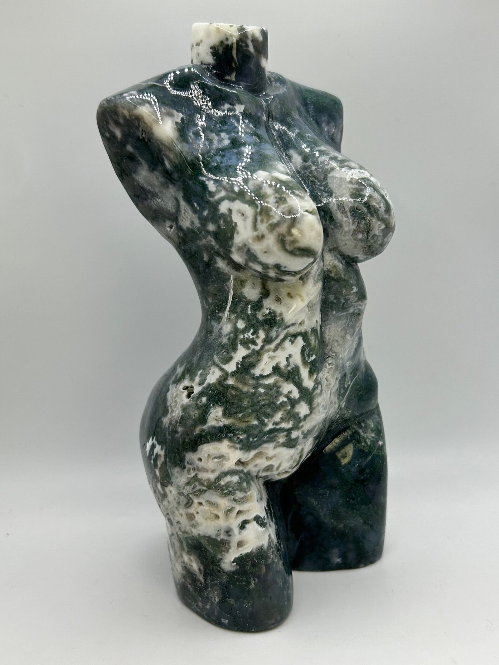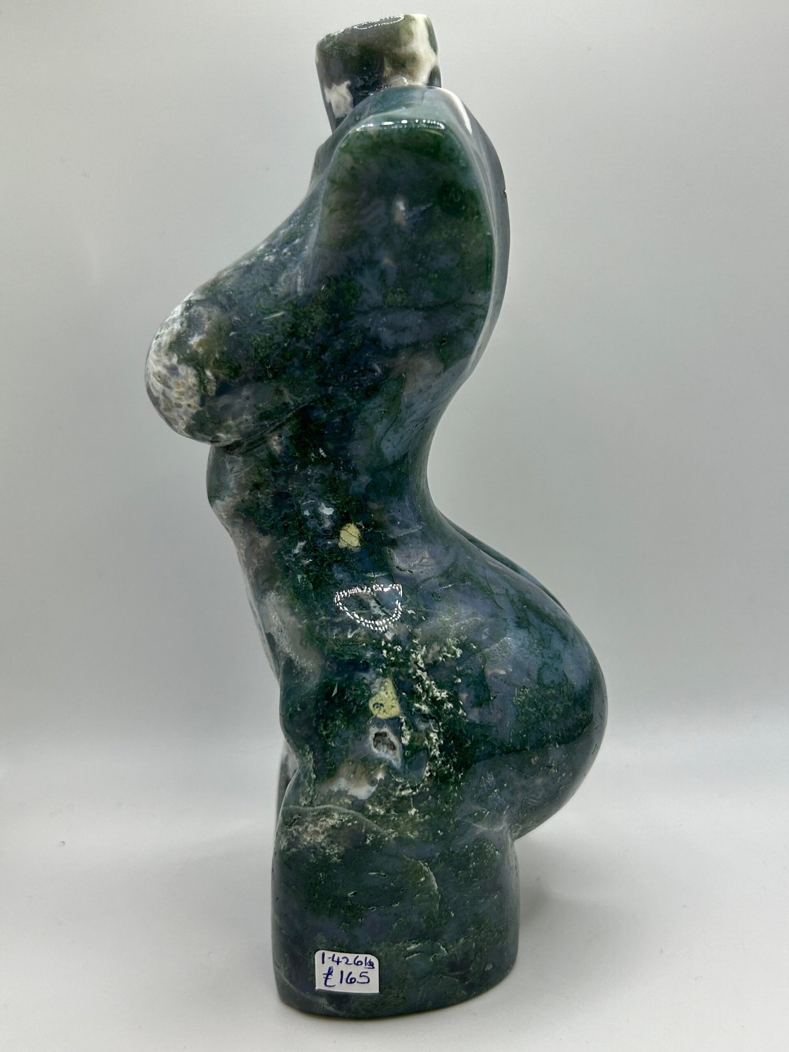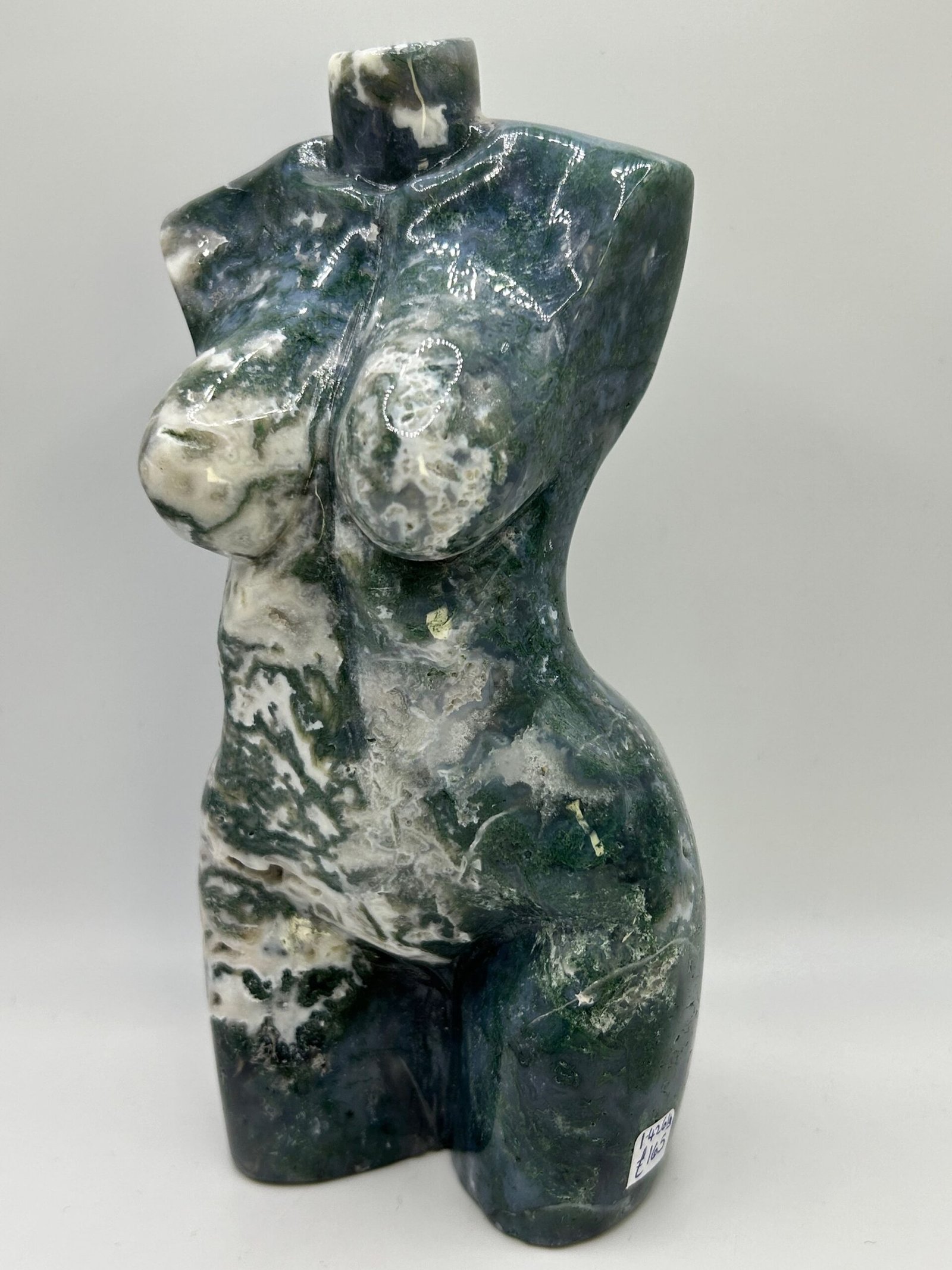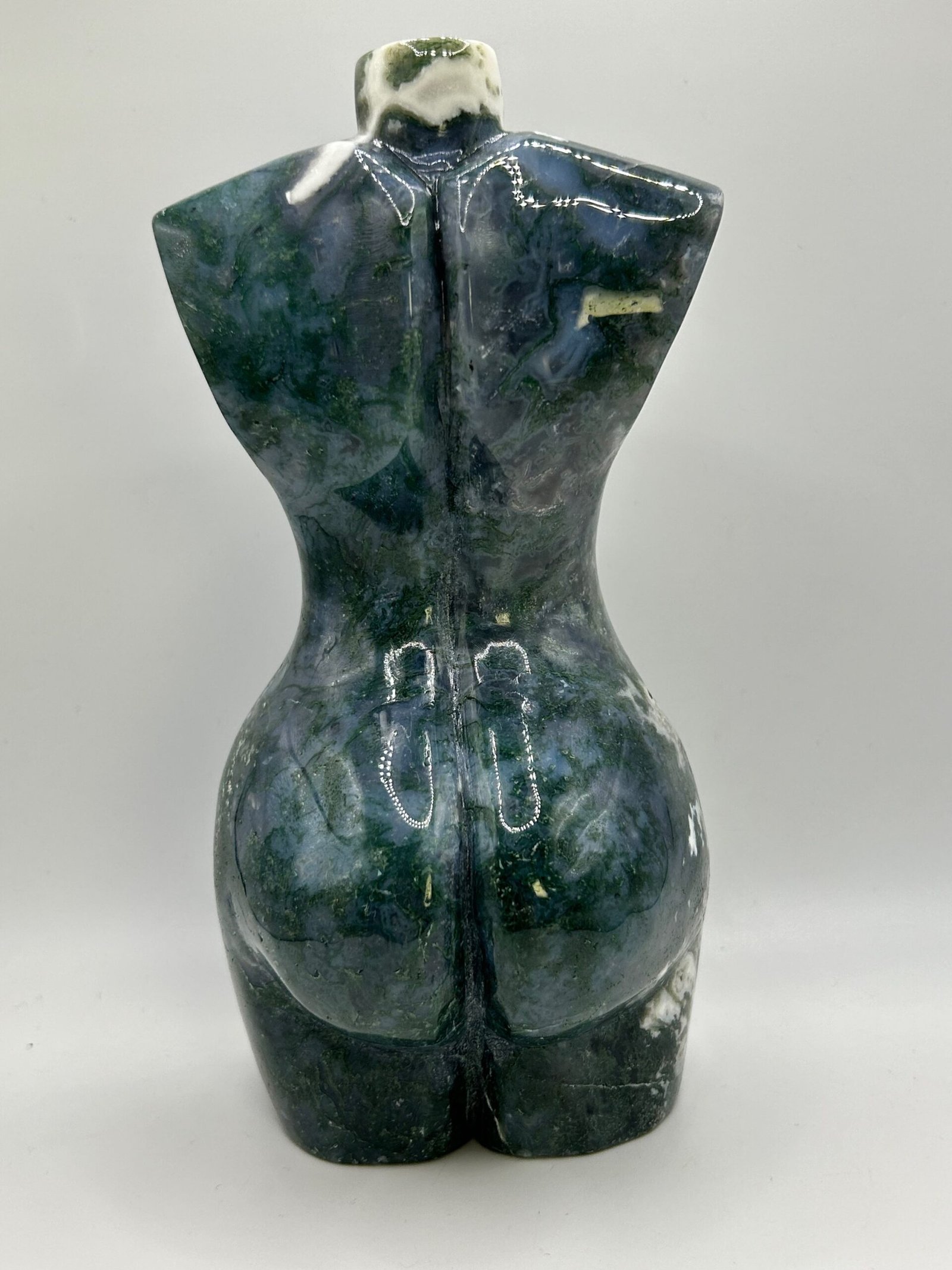An absolutely beautiful moss agate goddess, exquisitely carved.