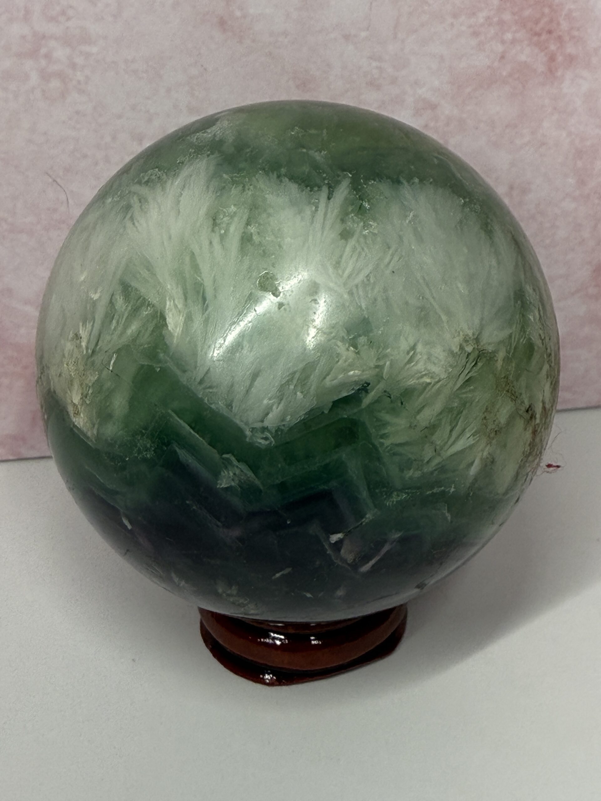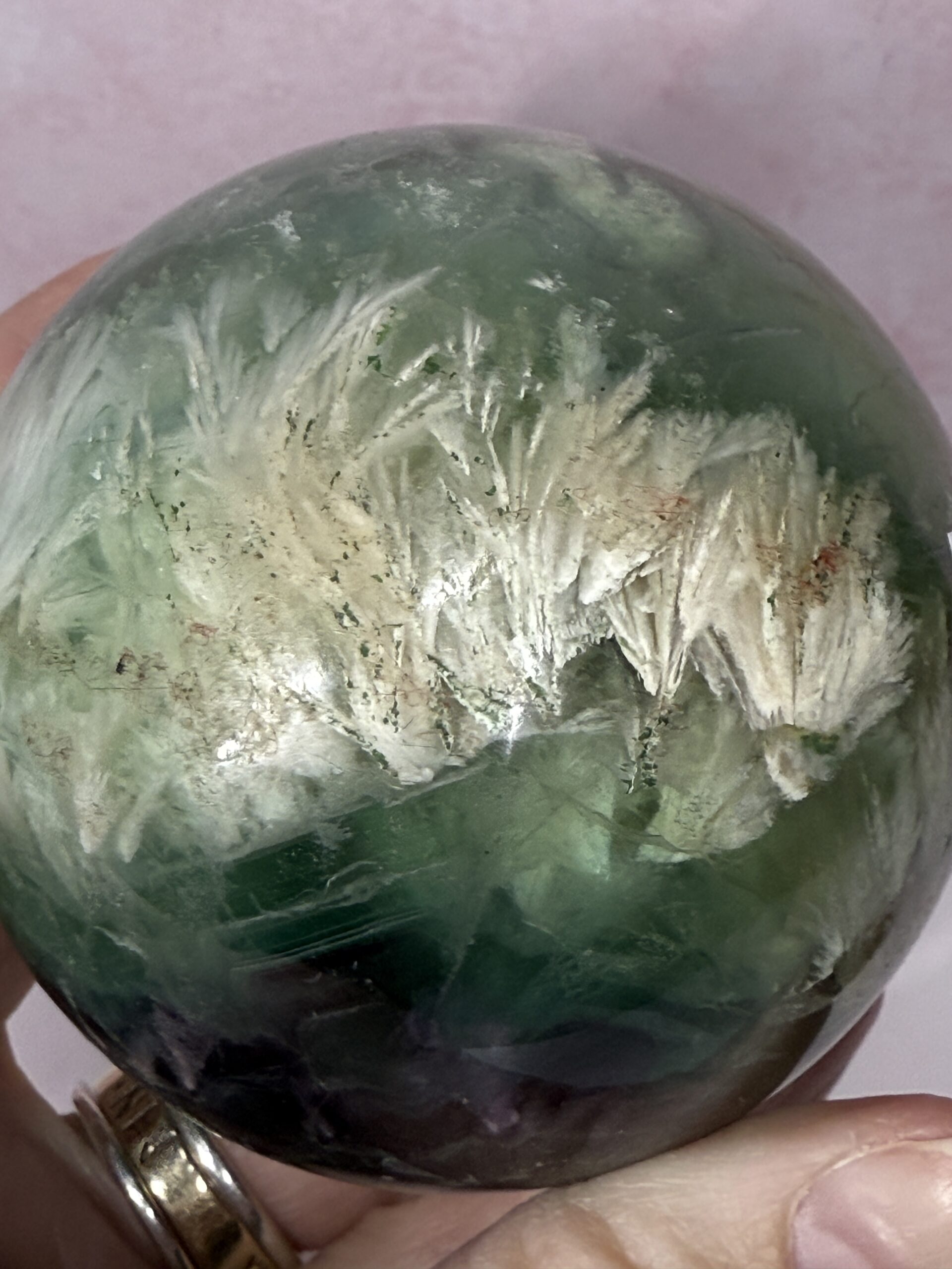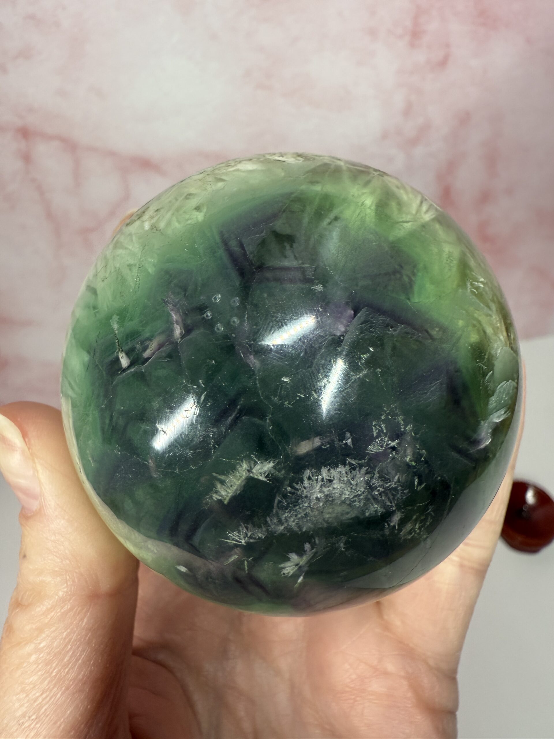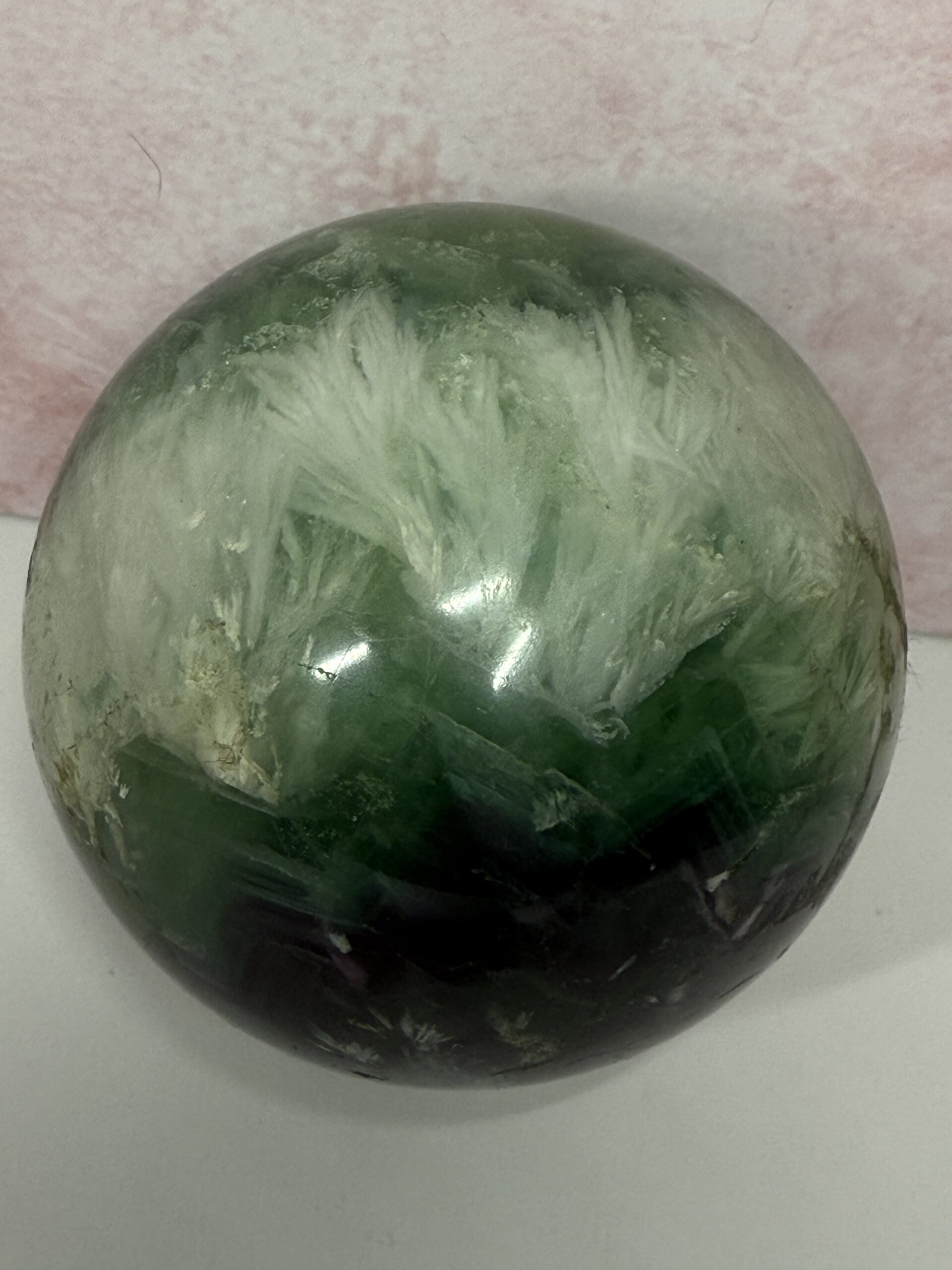 This beautiful feather fluorite sphere has wonderful depth, clearly showing the unusual characteristics of this type of fluorite.