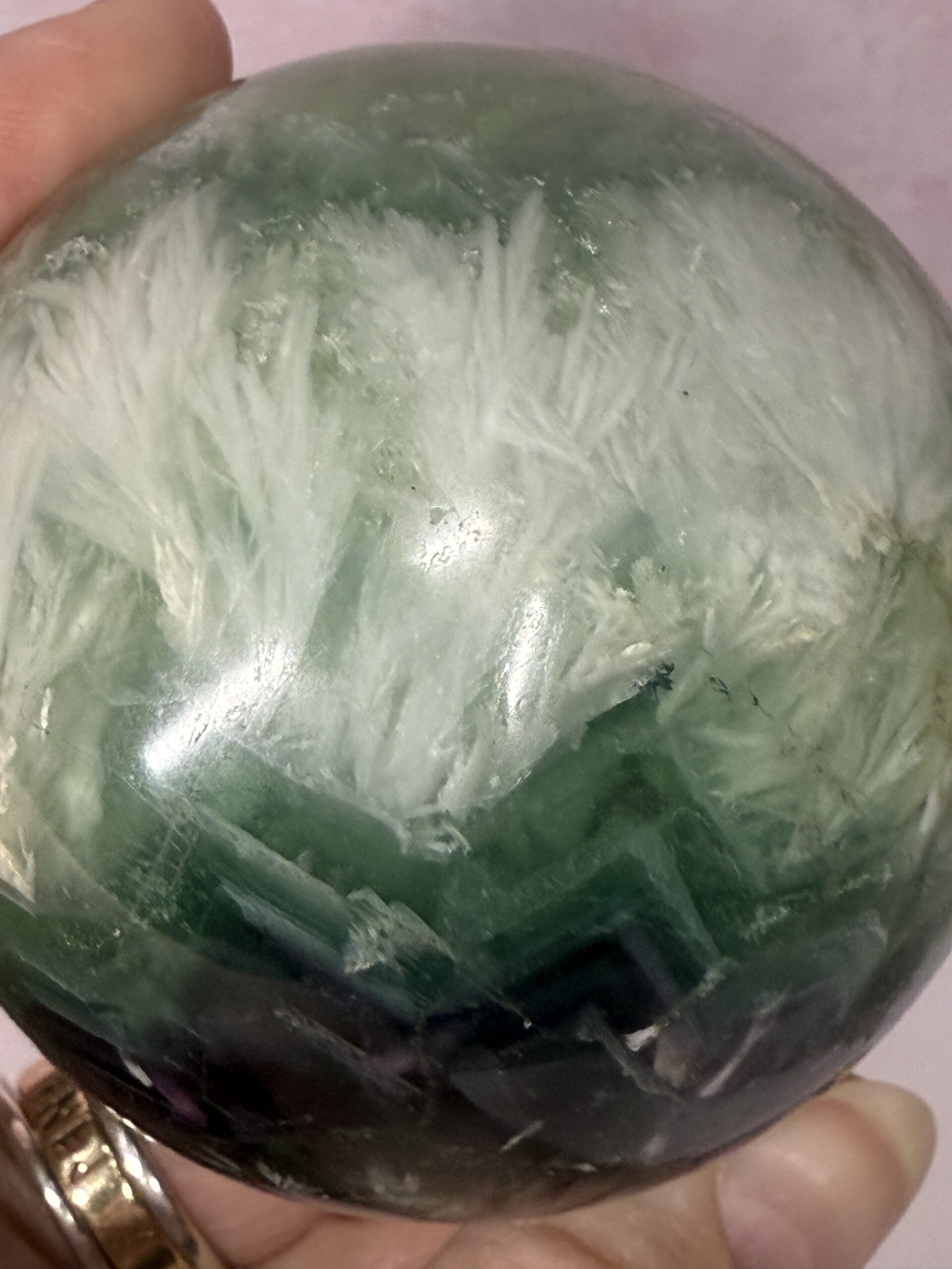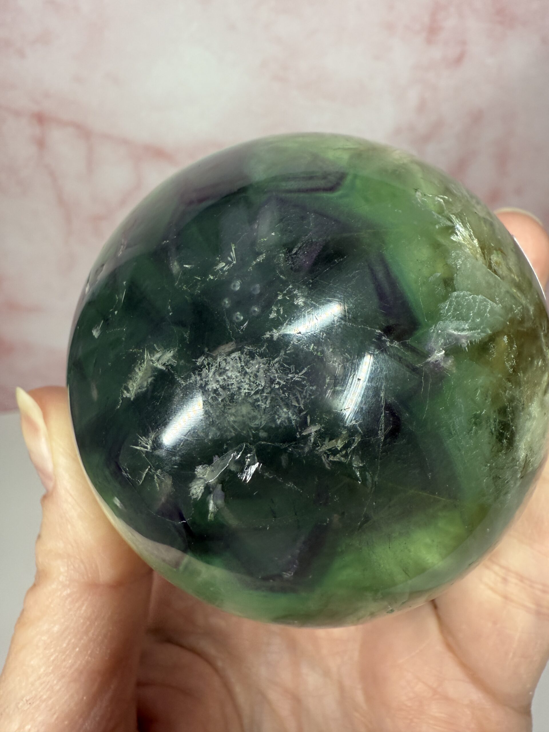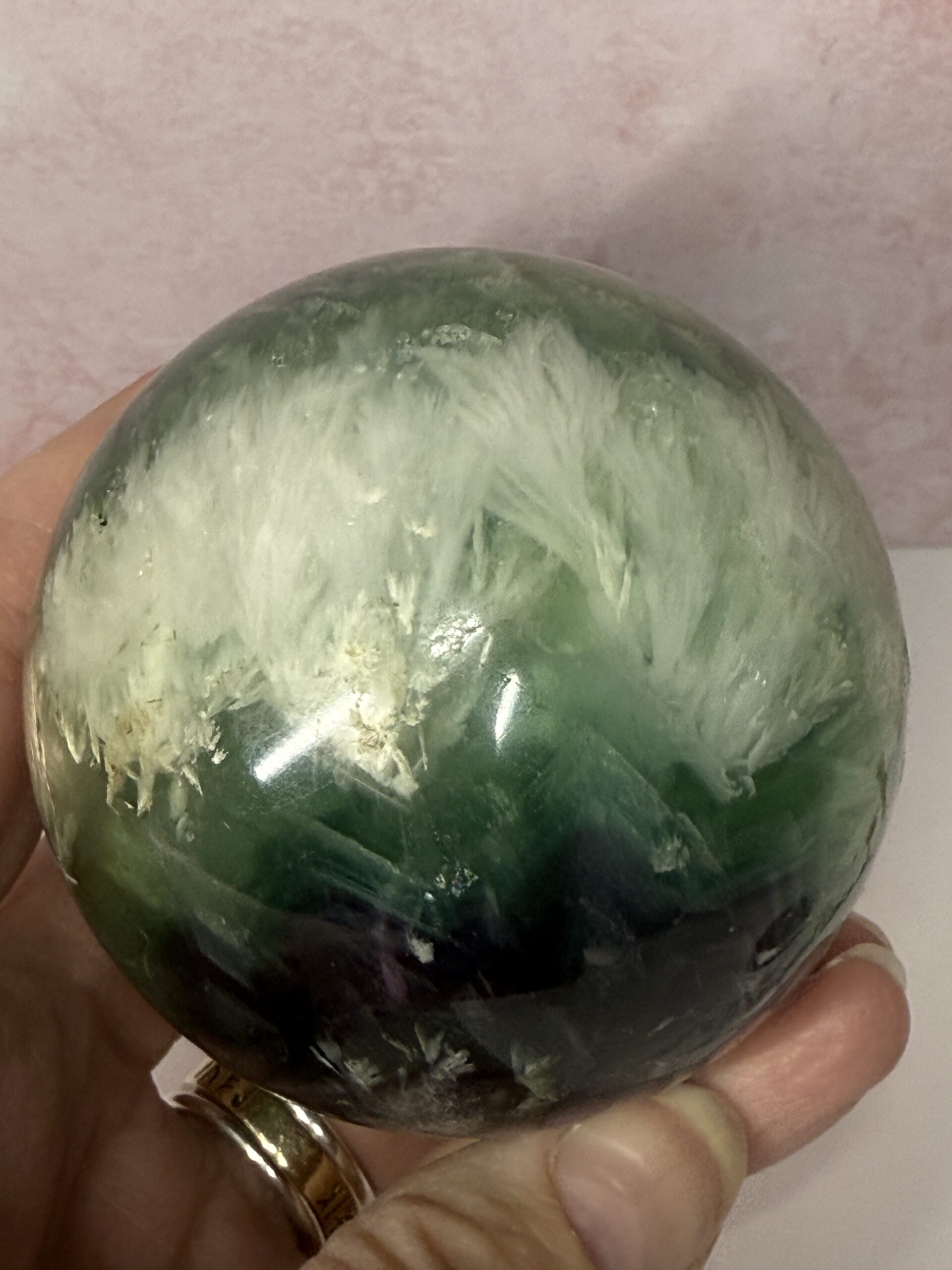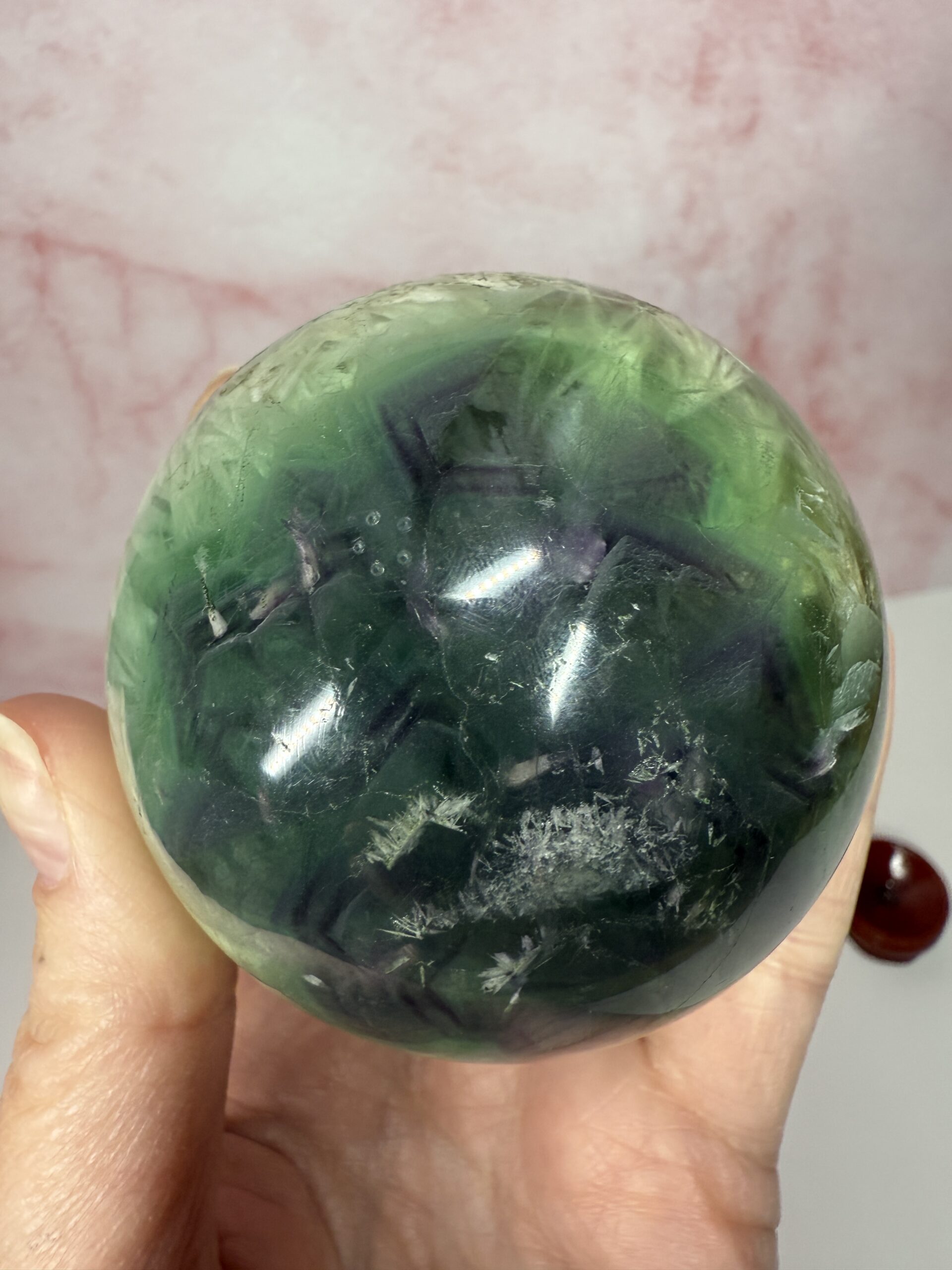 This beautiful feather fluorite sphere has wonderful depth, clearly showing the unusual characteristics of this type of fluorite.