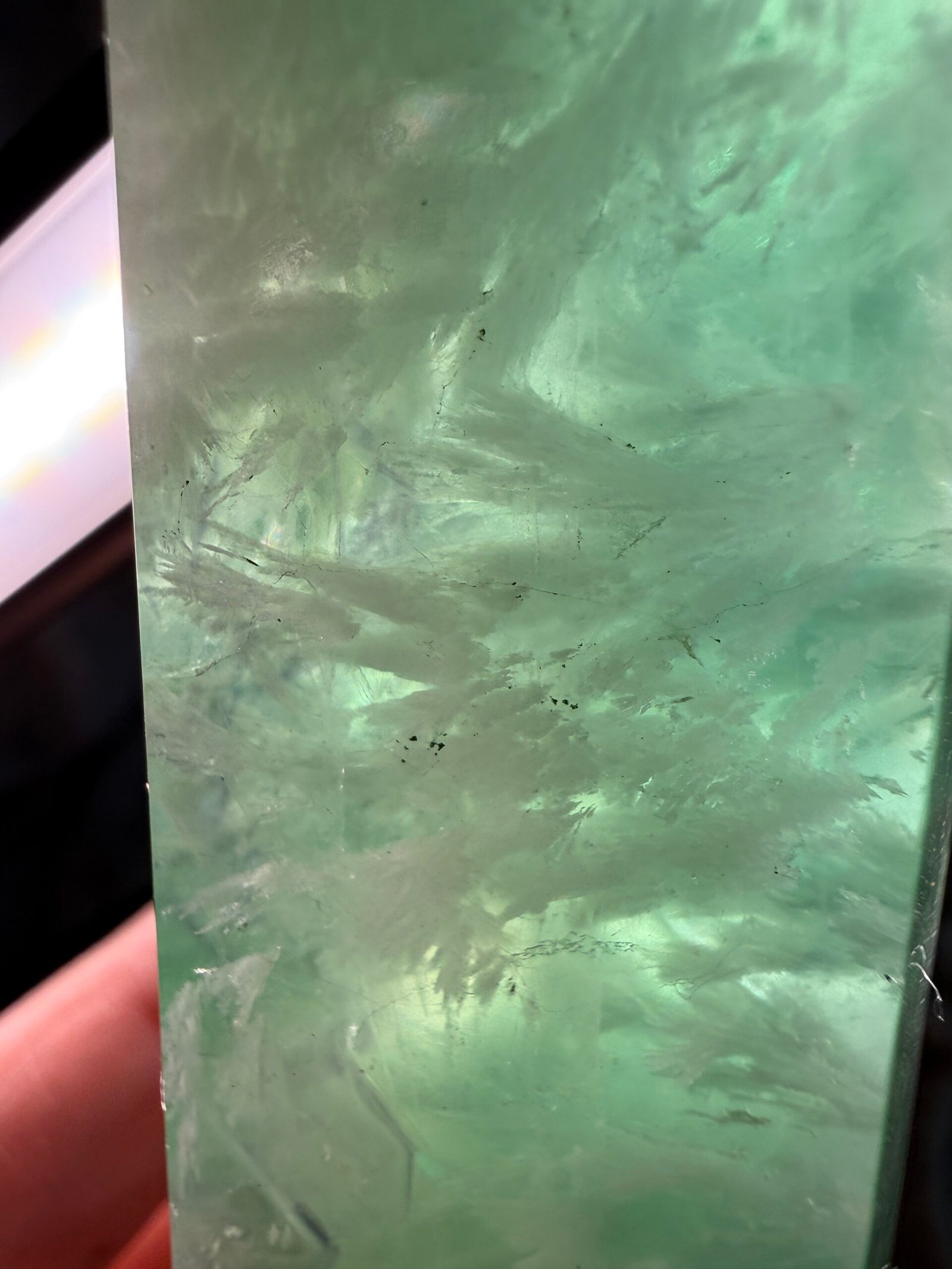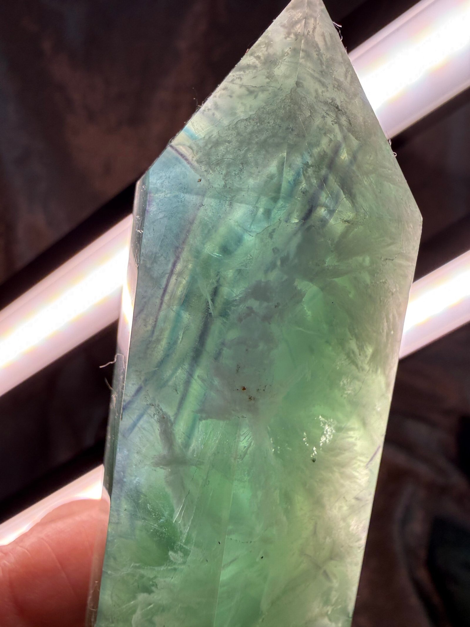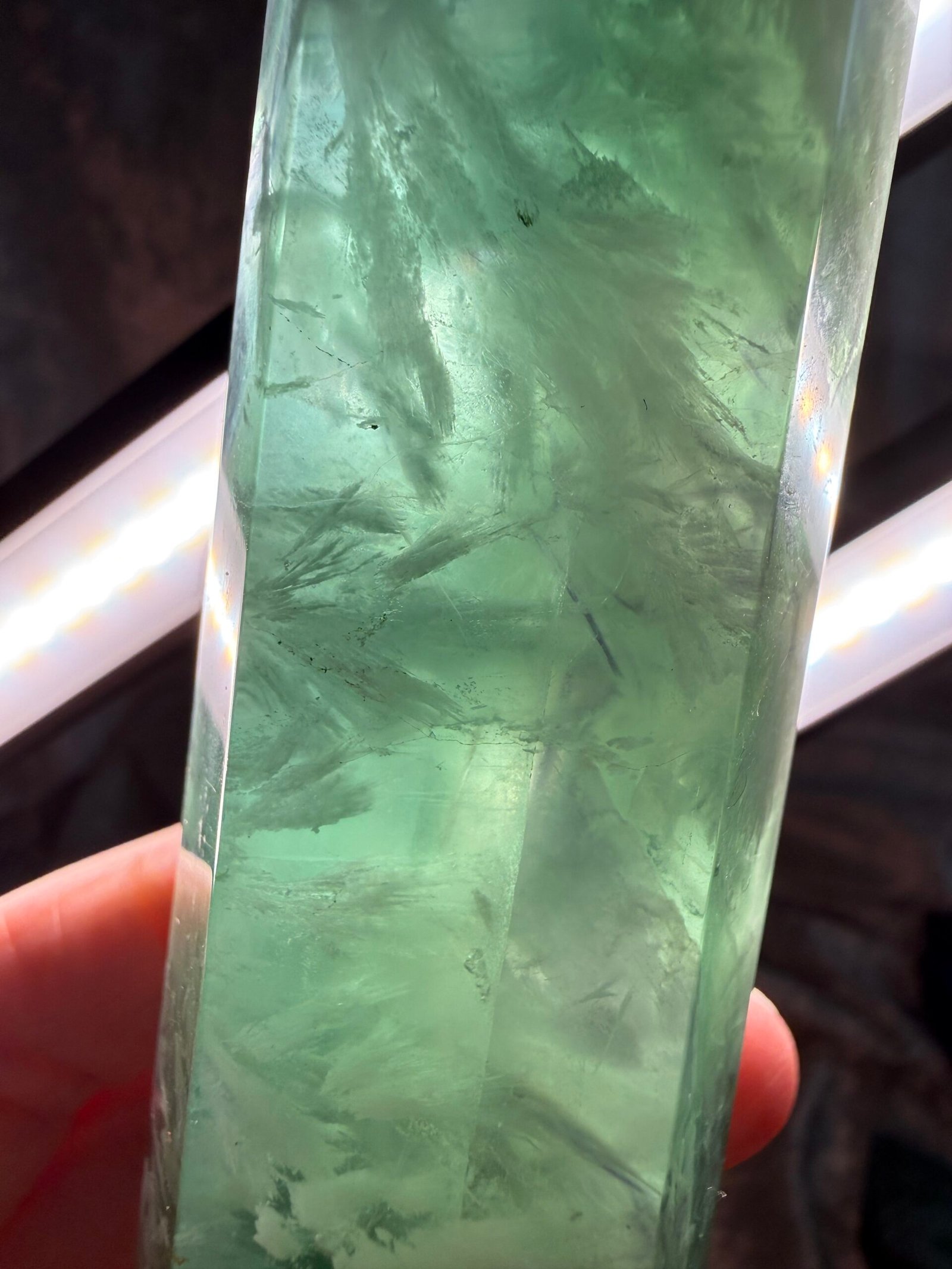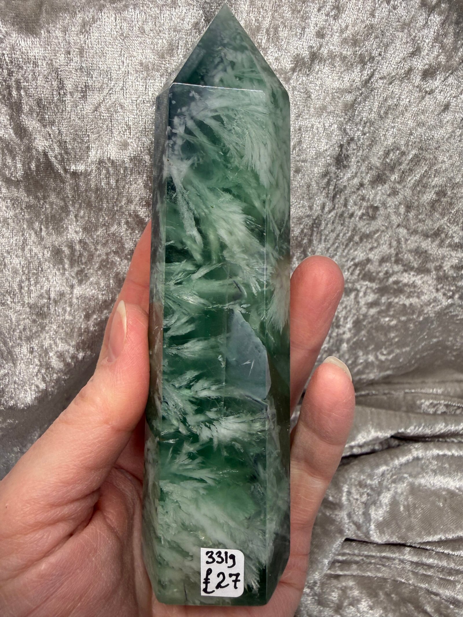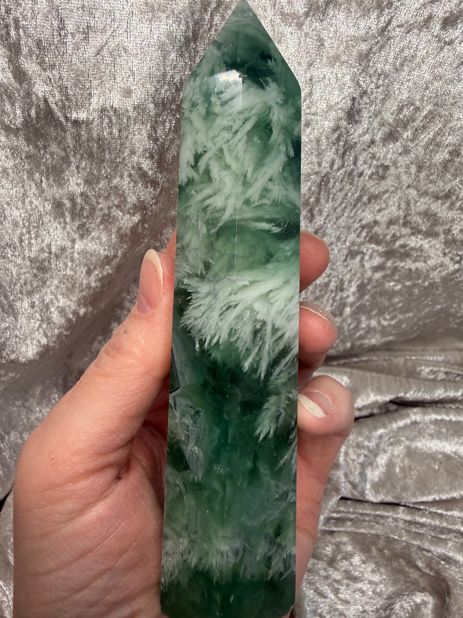 This is a beautiful green fluorite tower with white ‘feathering’ (thought to be Scolecite but this isn’t conclusive) inclusions throughout.