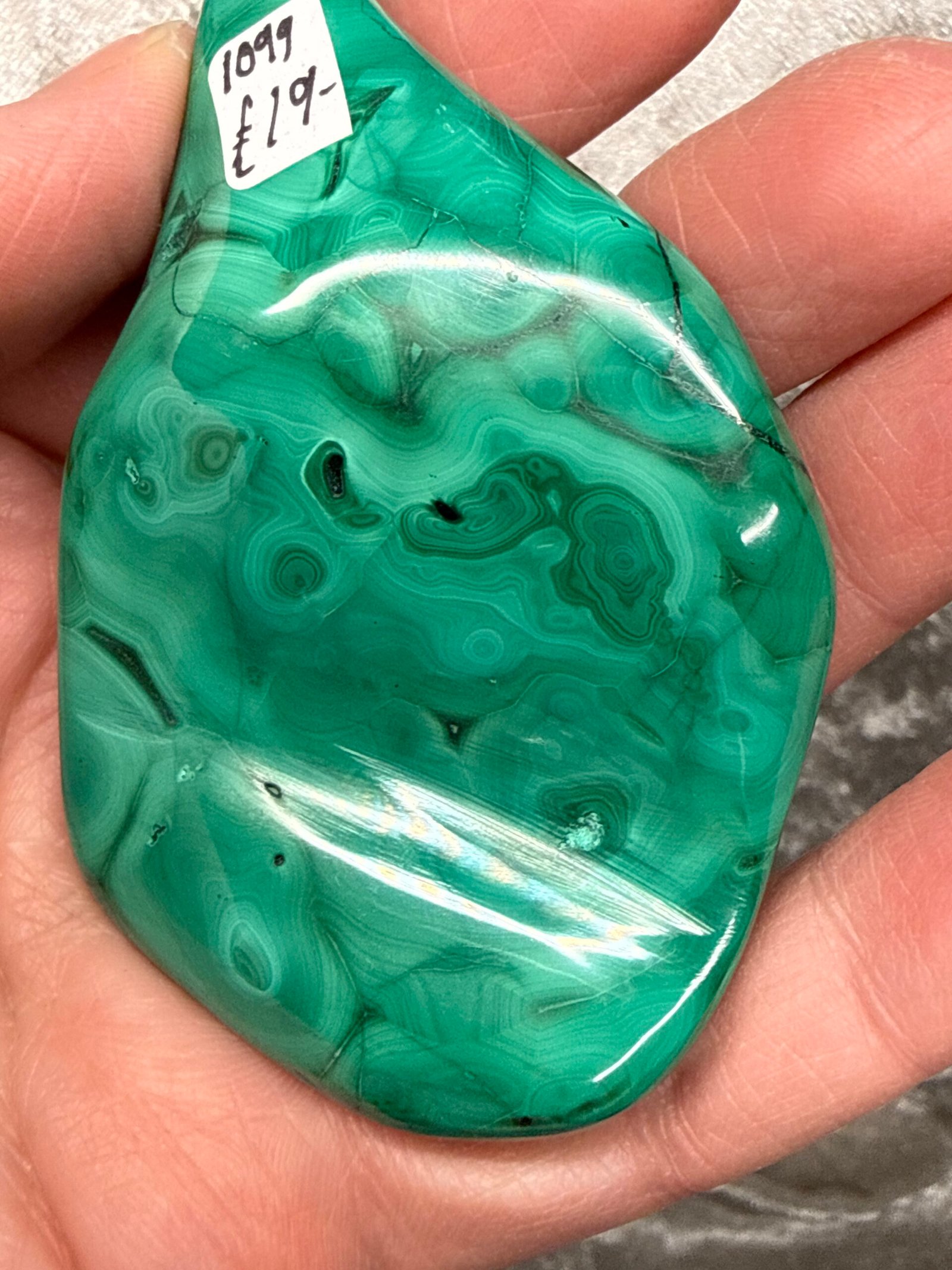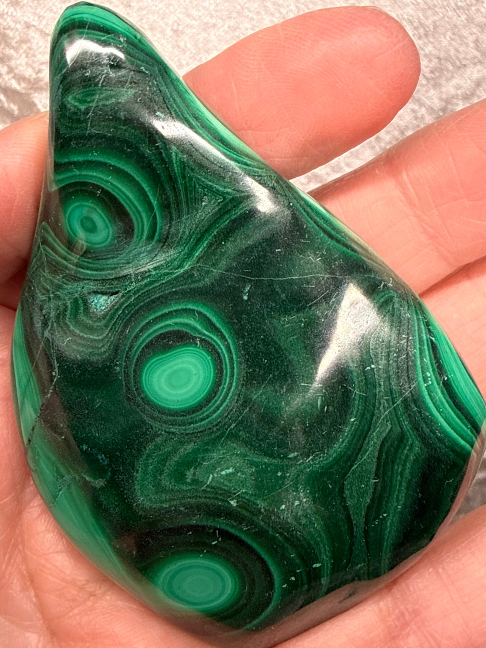 Freeform polished flower banded Malachite from Congo, South Africa.