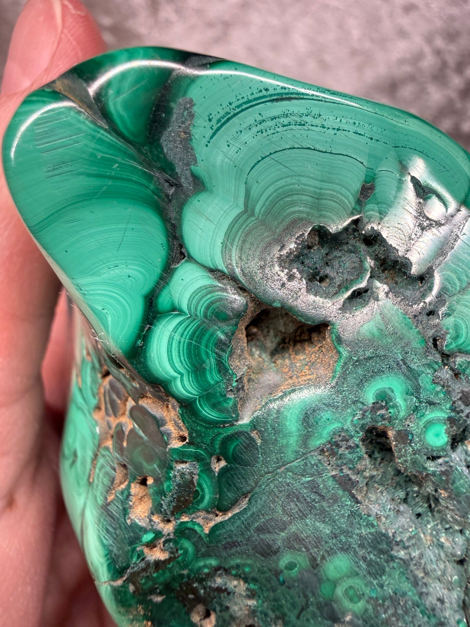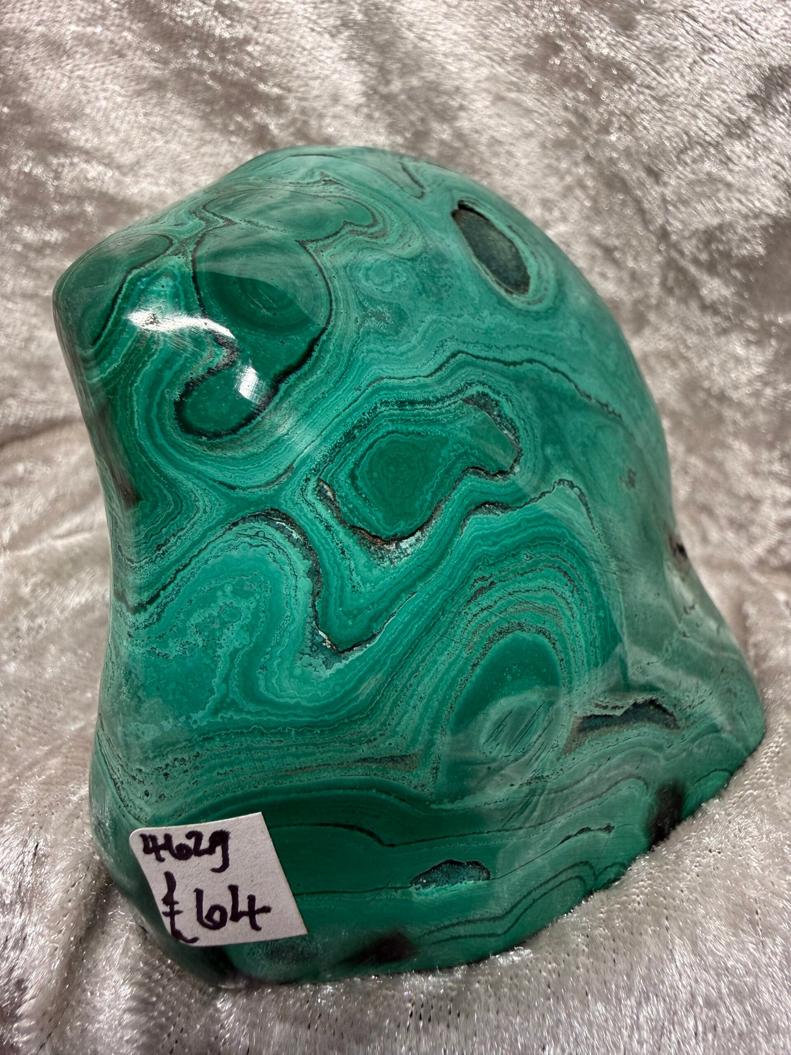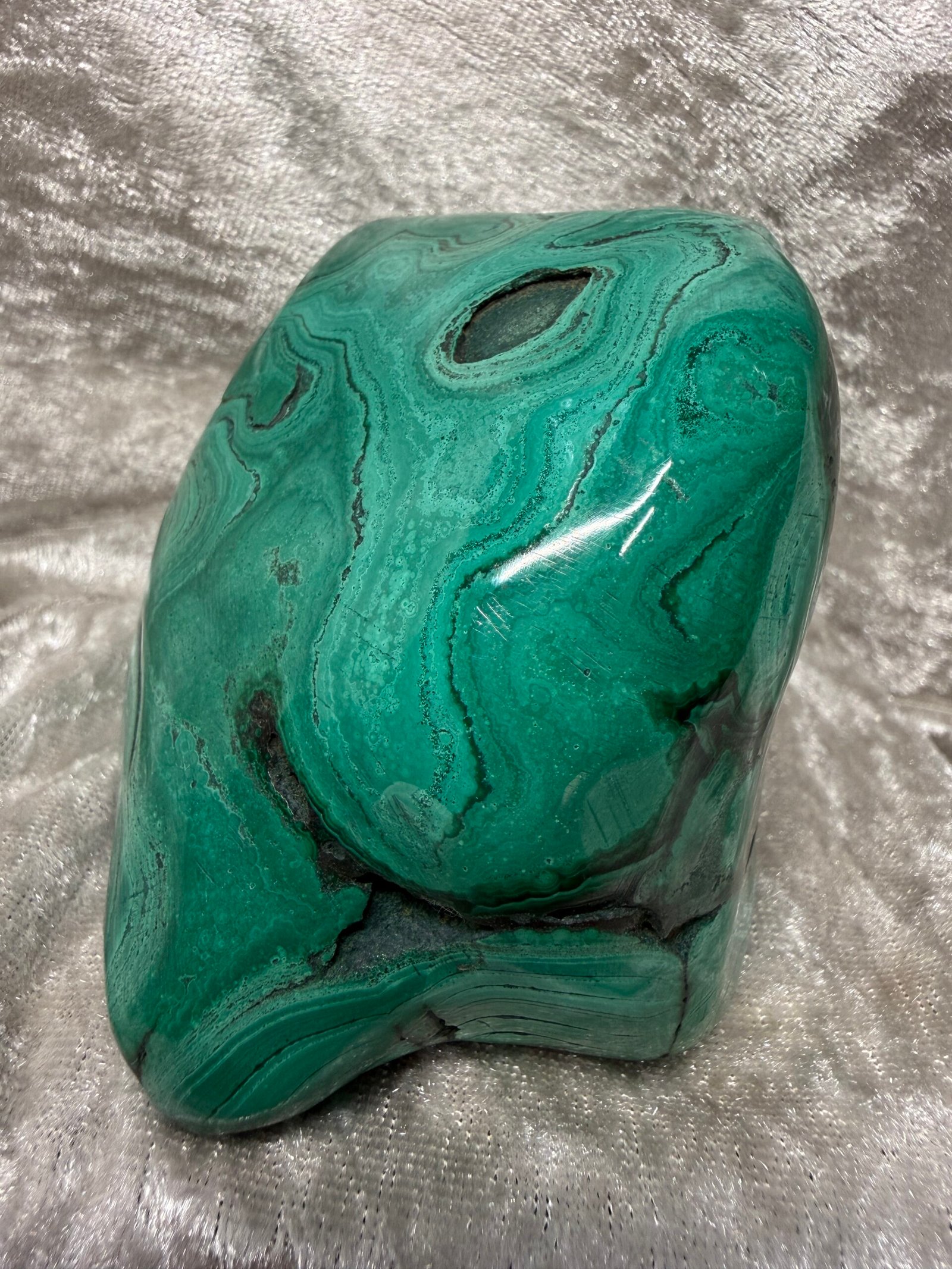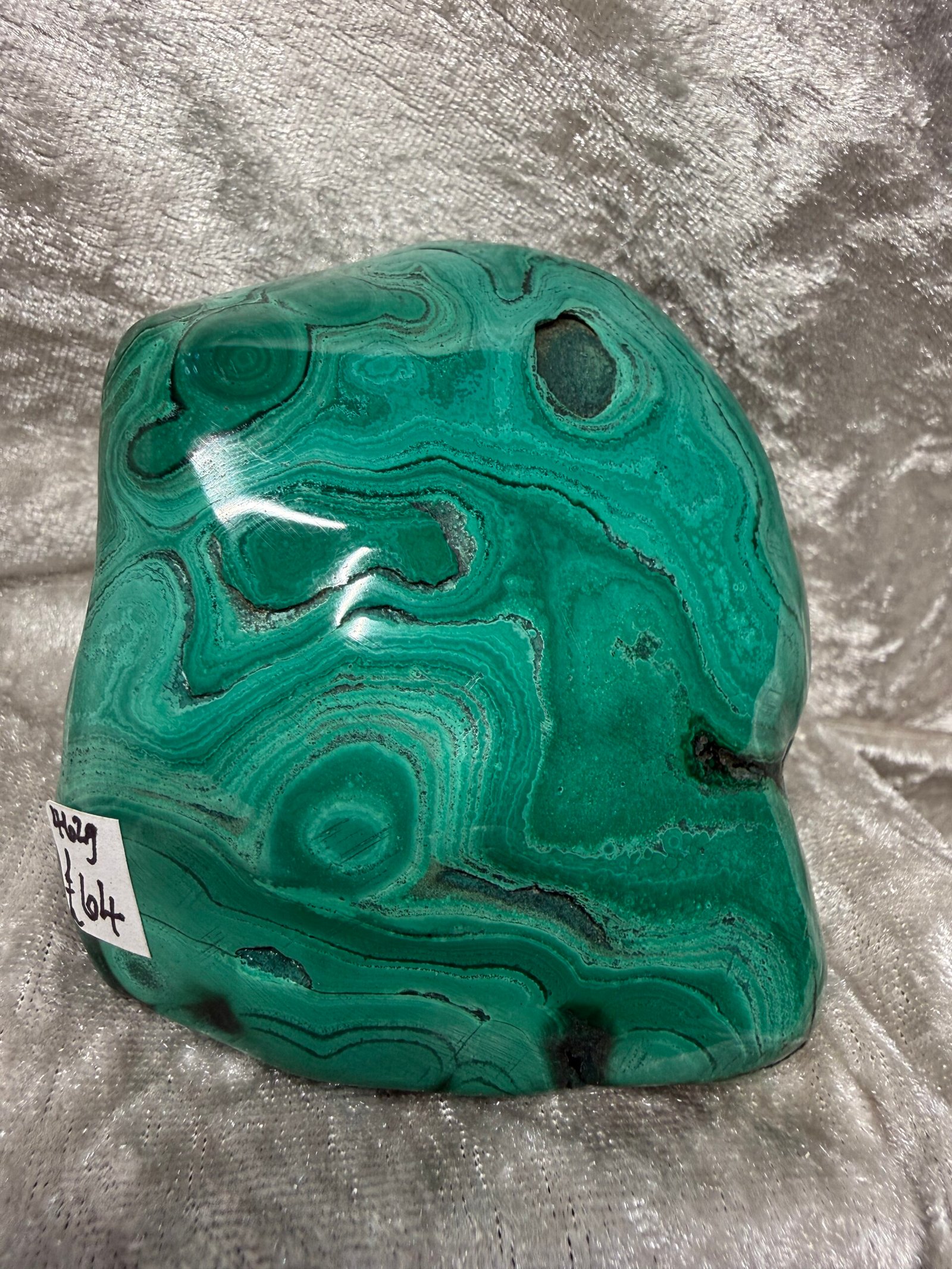 Free standing polished flower banded Malachite from Congo, South Africa.