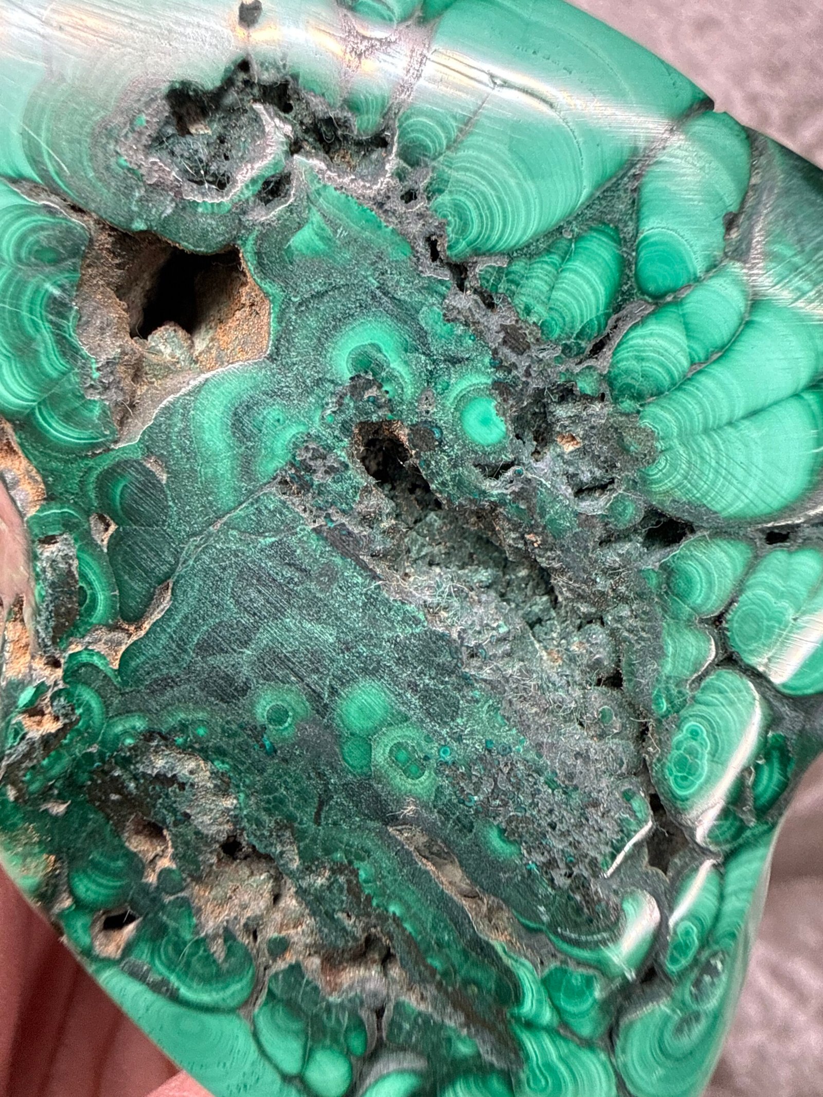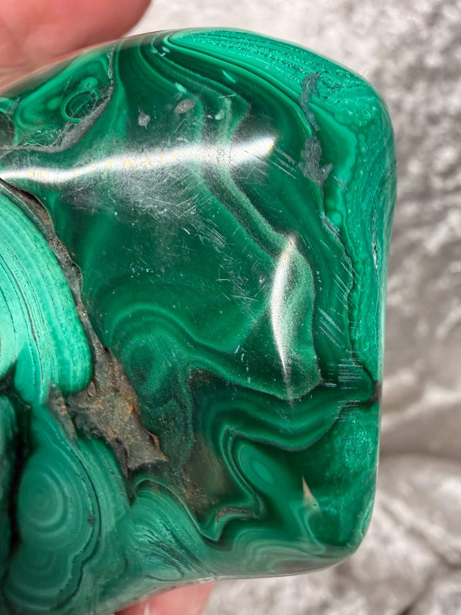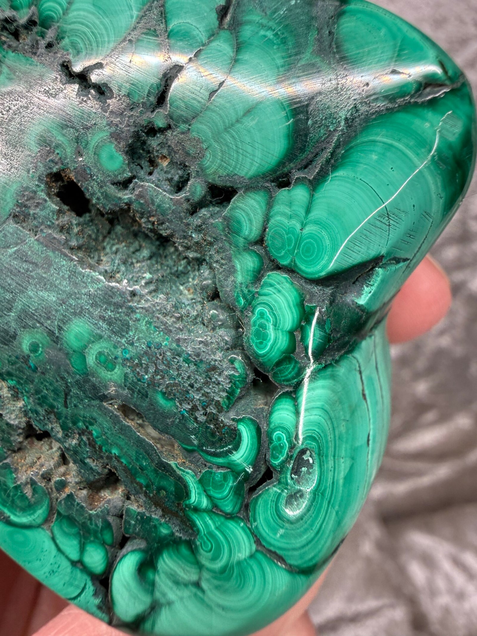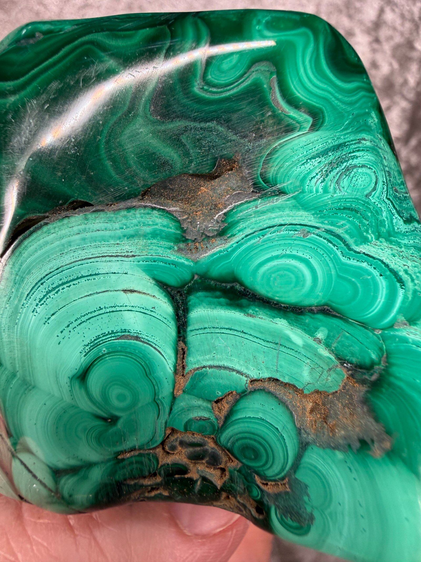 Free standing polished flower banded Malachite from Congo, South Africa.