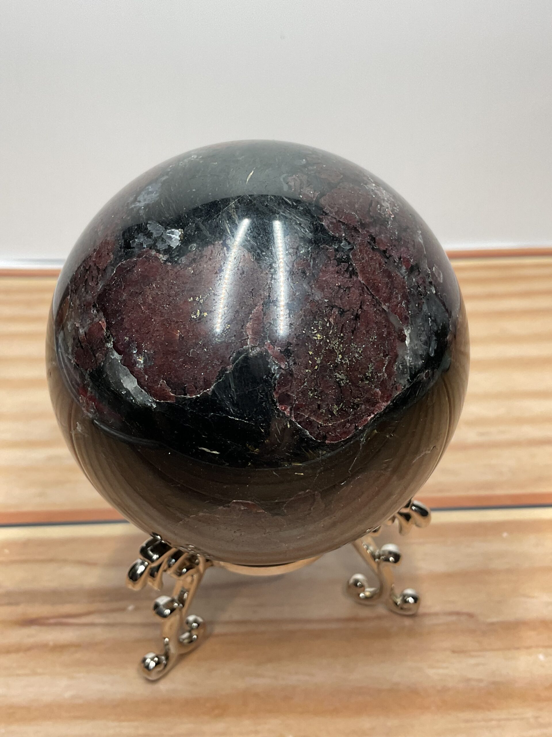 With its golden brownish needle like structures radiating throughout, this beautiful garnet sphere has a unique sparkle throughout.