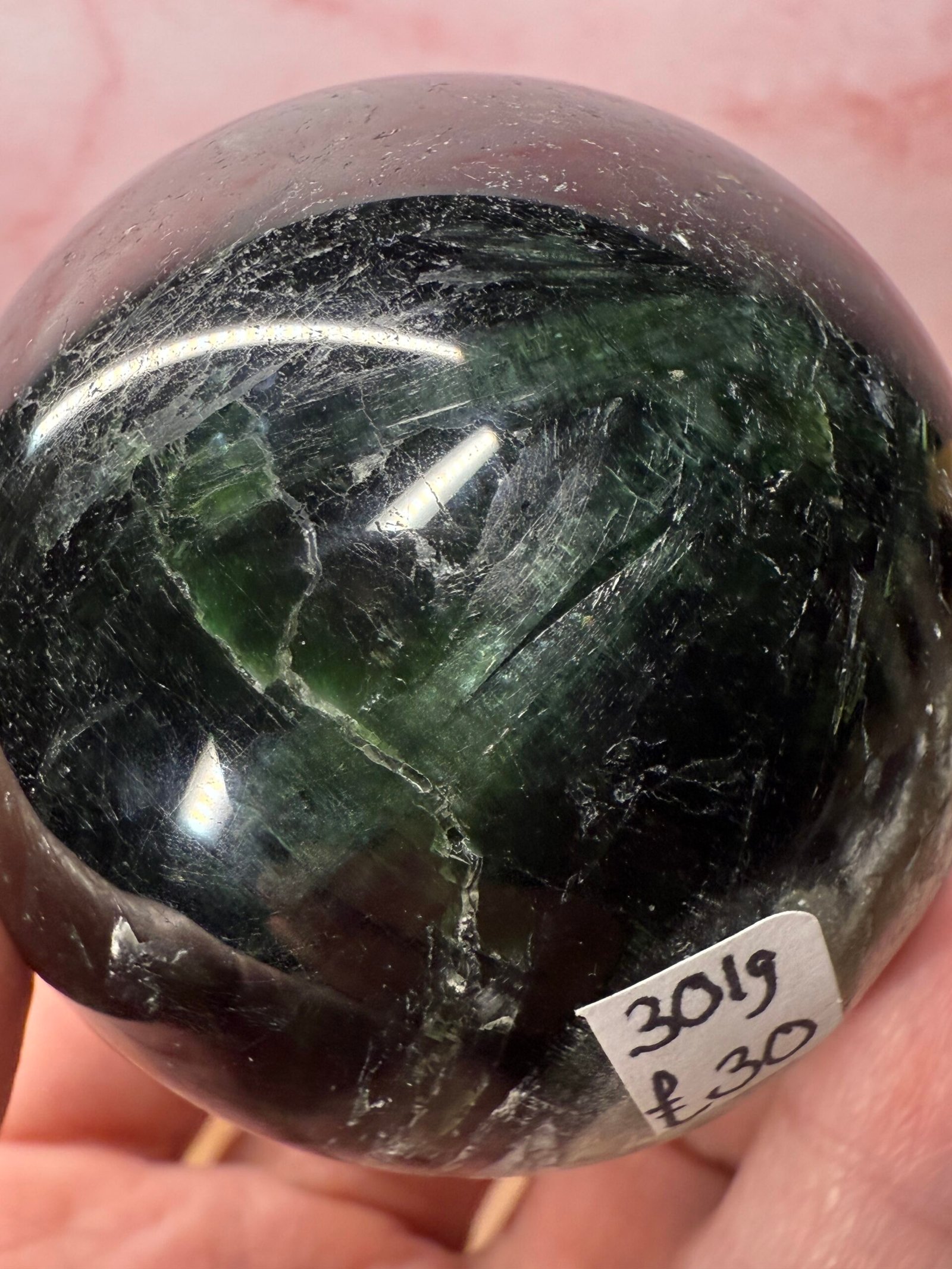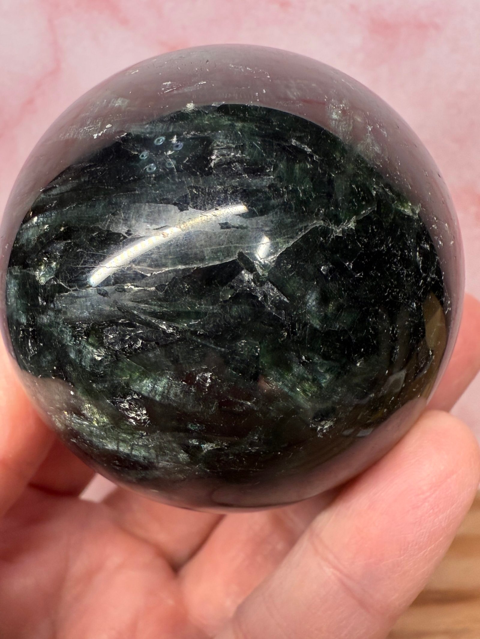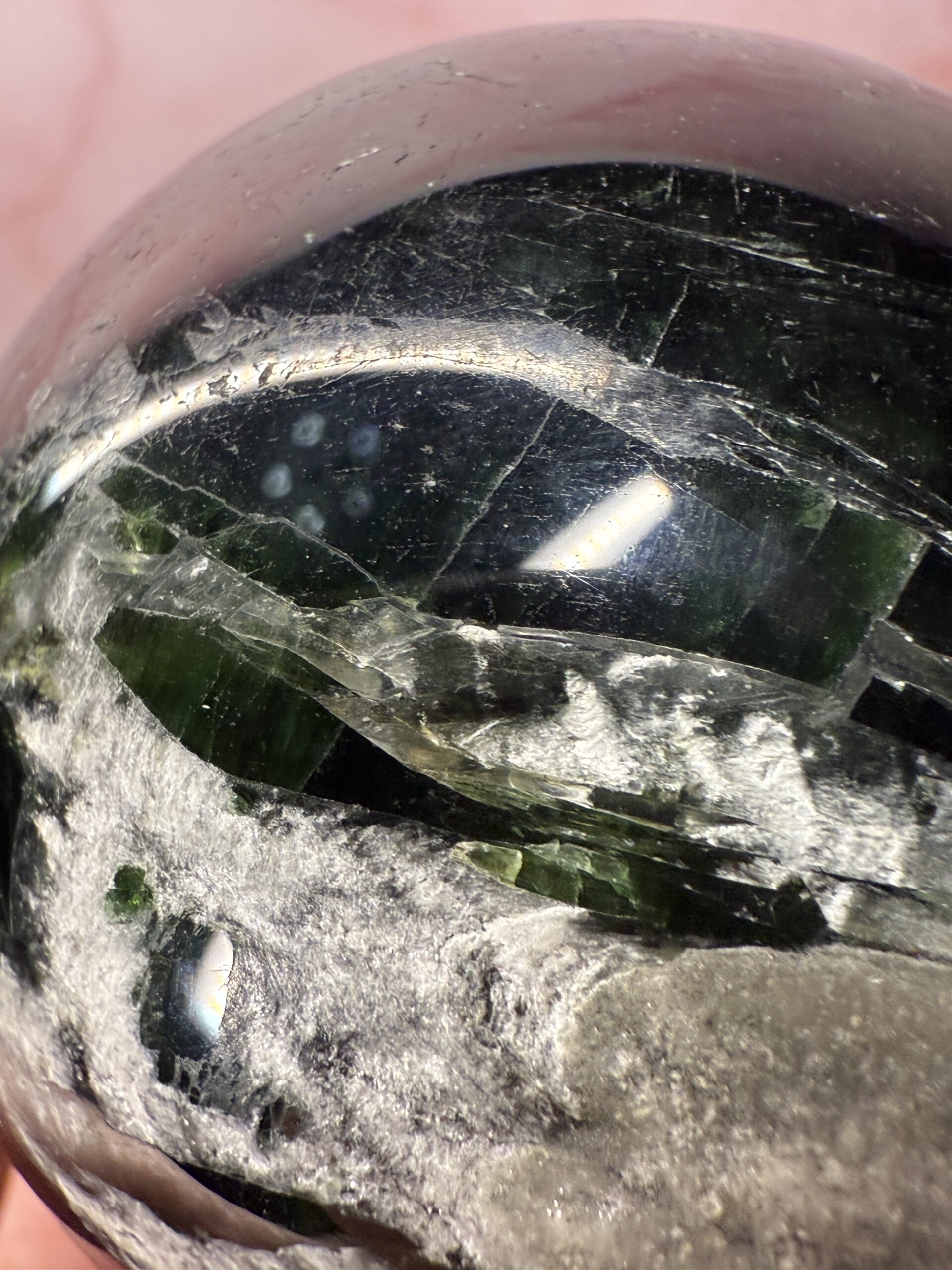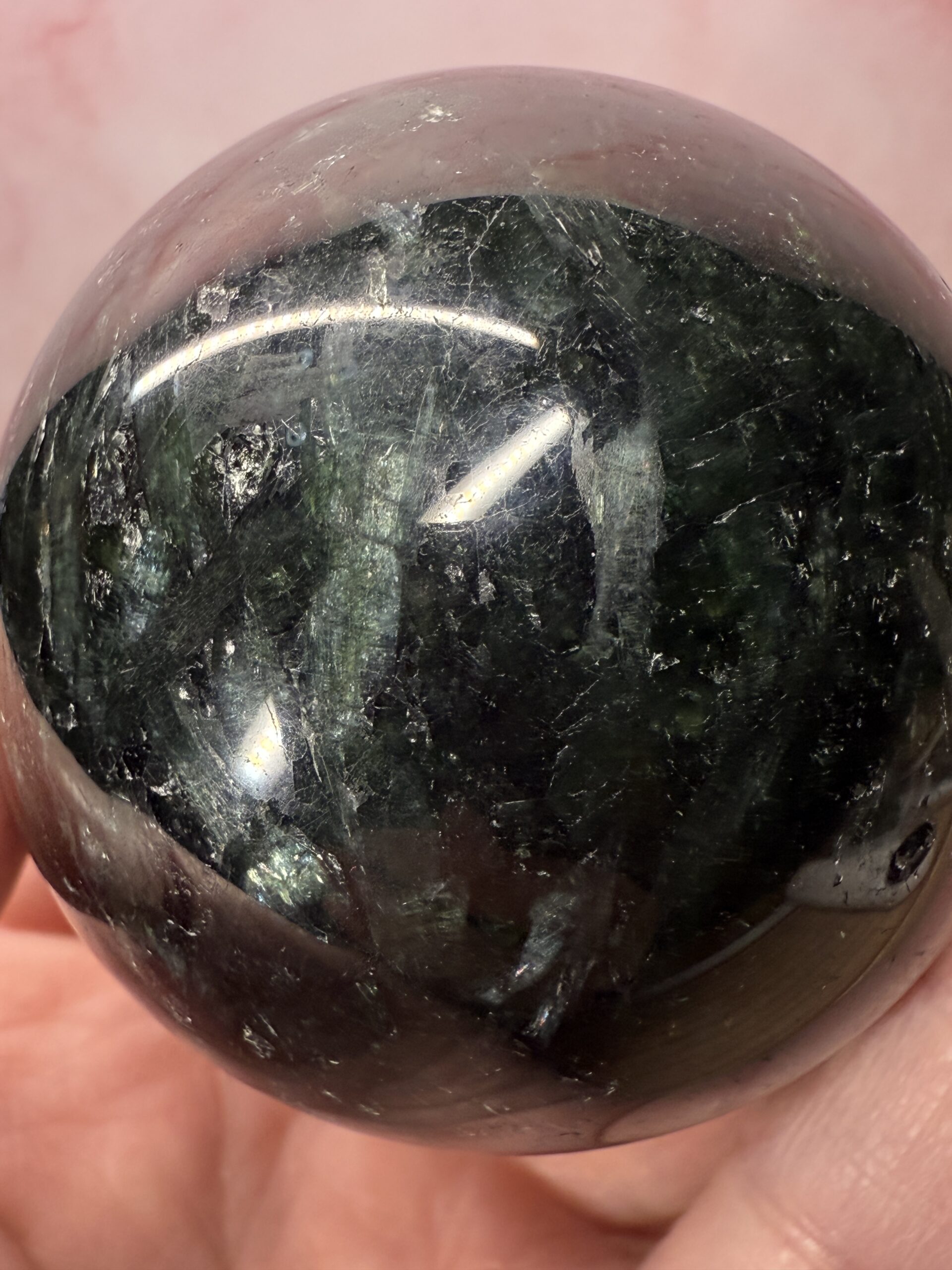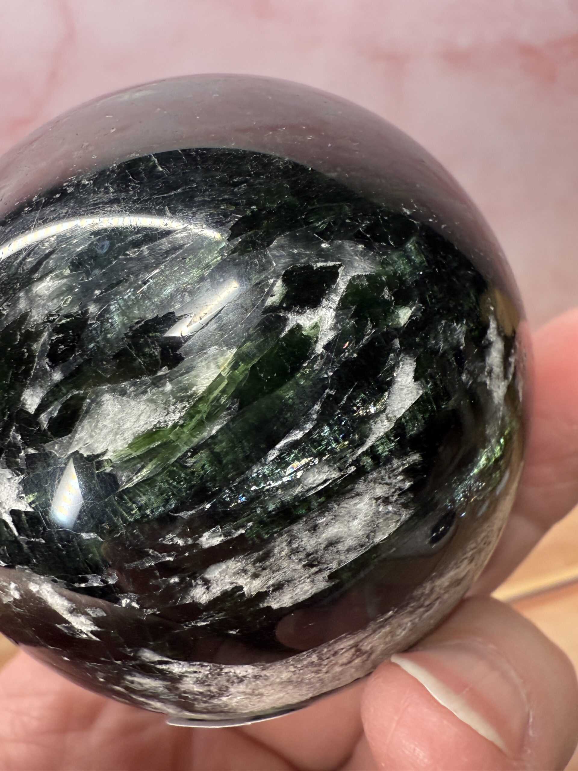 With beautiful blades of chatoyant green, this is a lovely sphere.