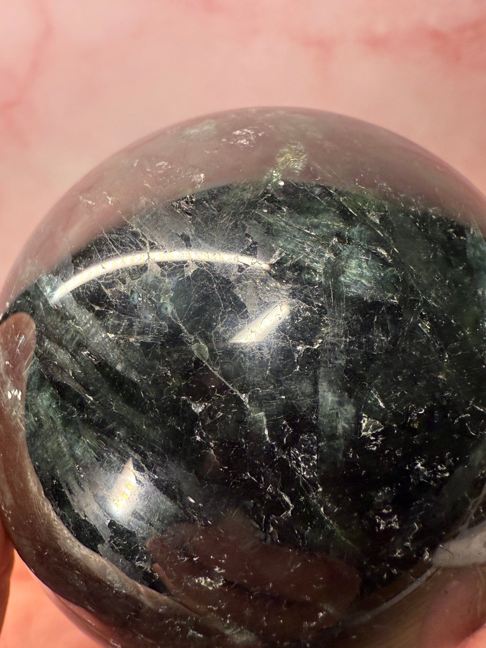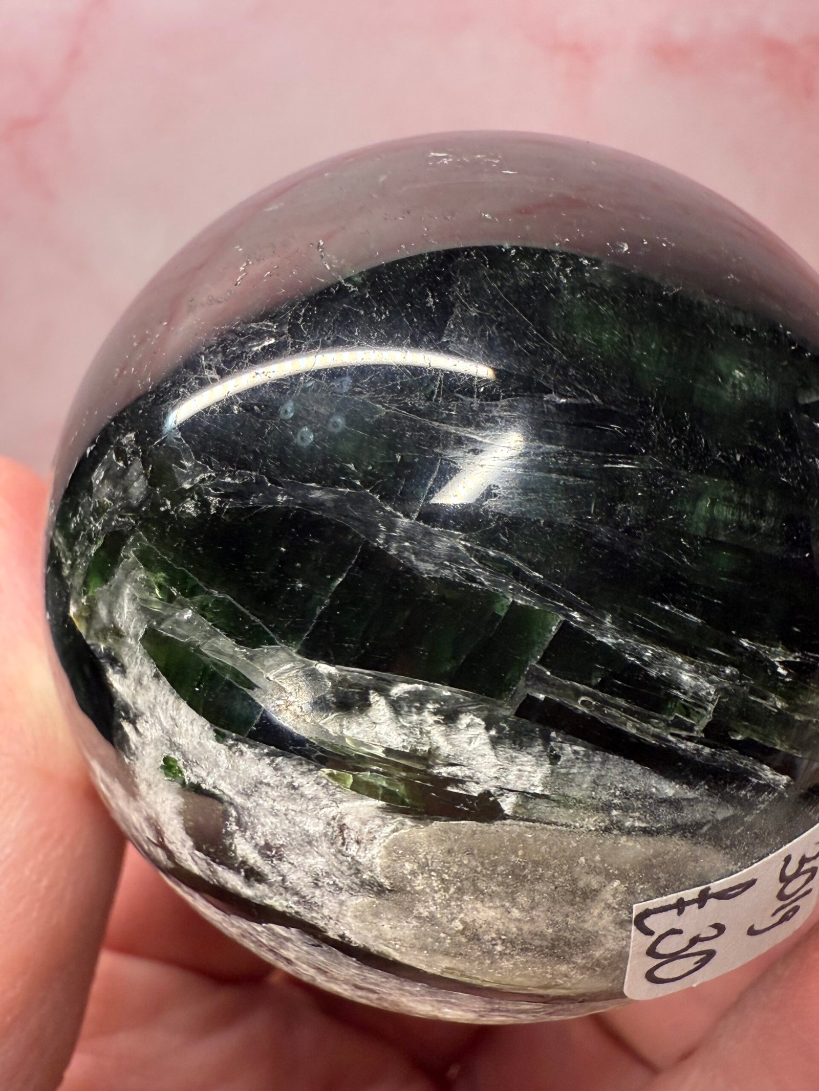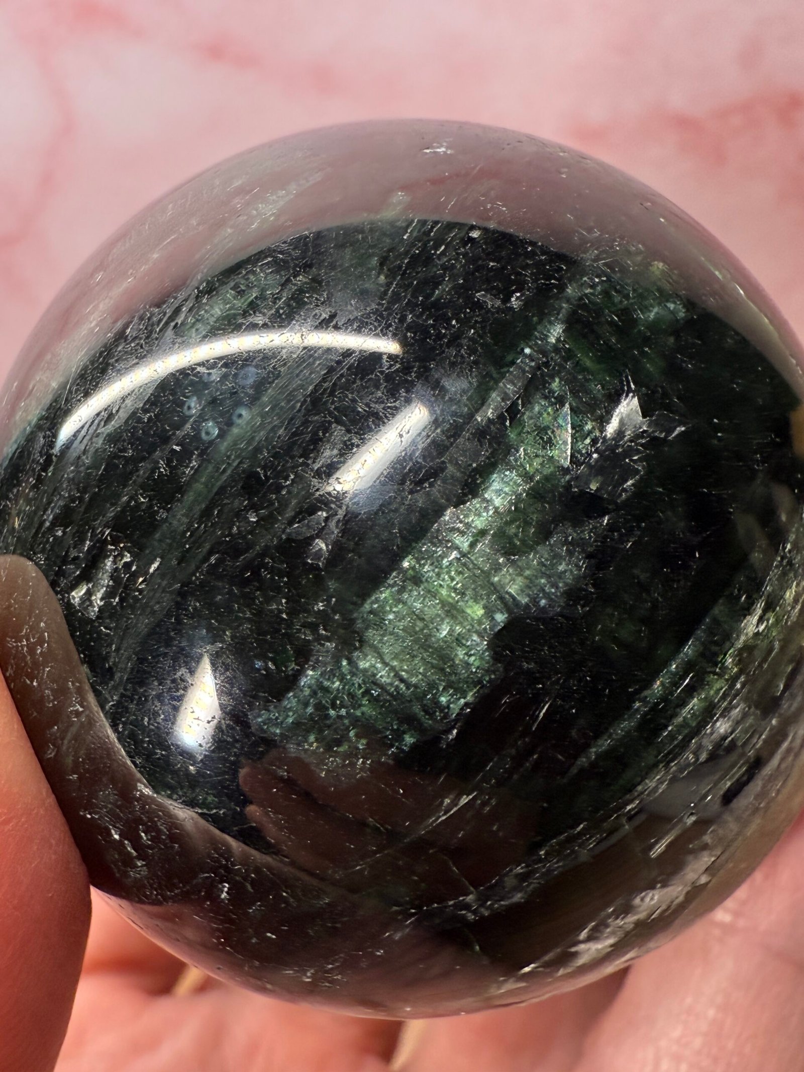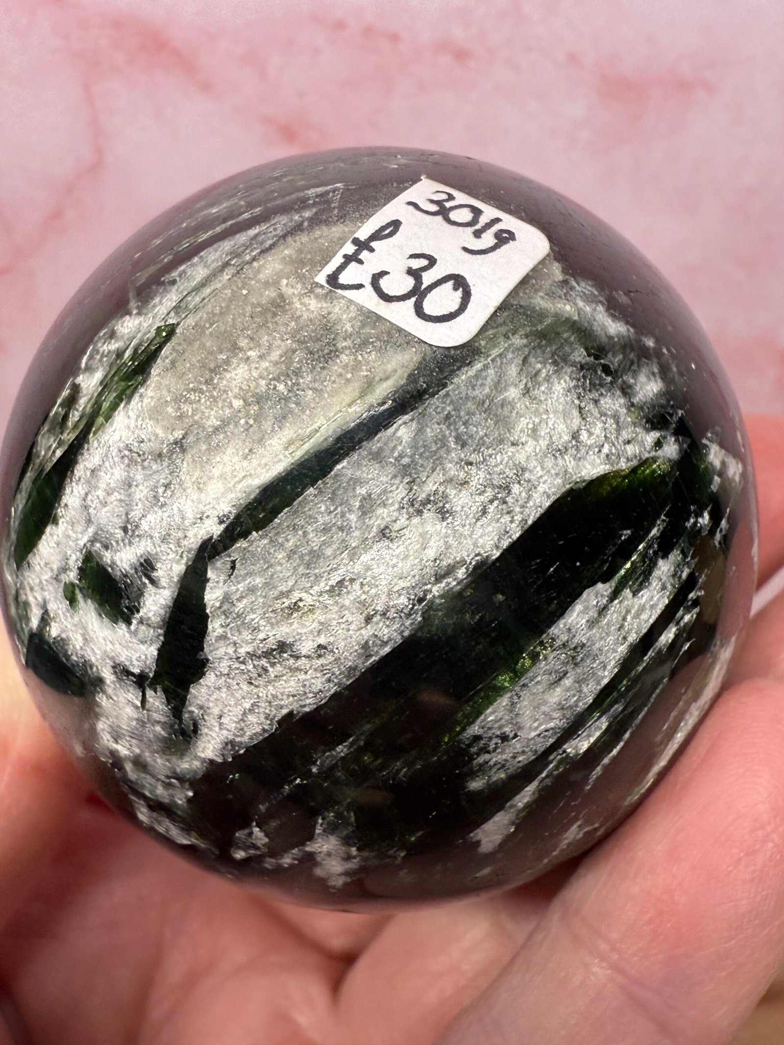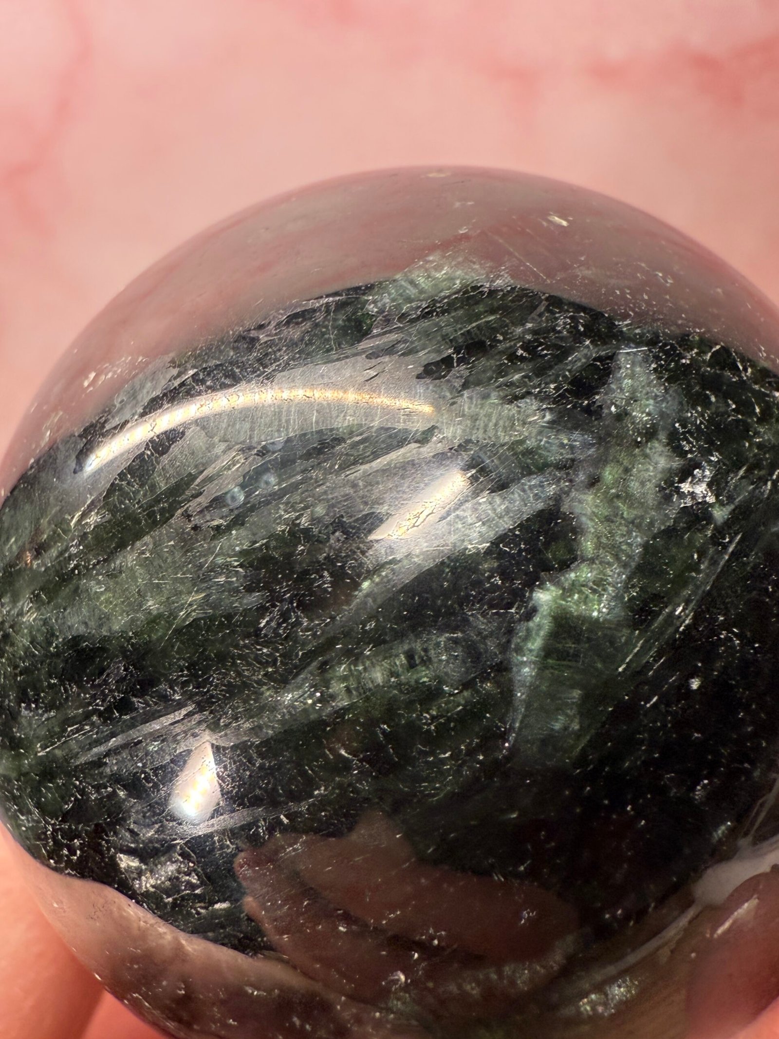 With beautiful blades of chatoyant green, this is a lovely sphere.