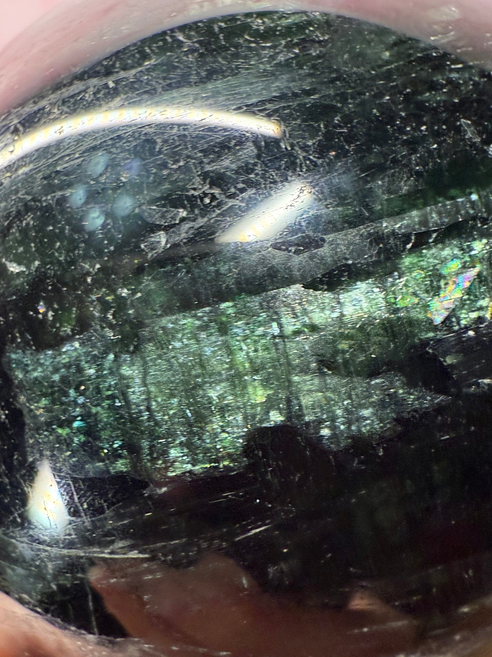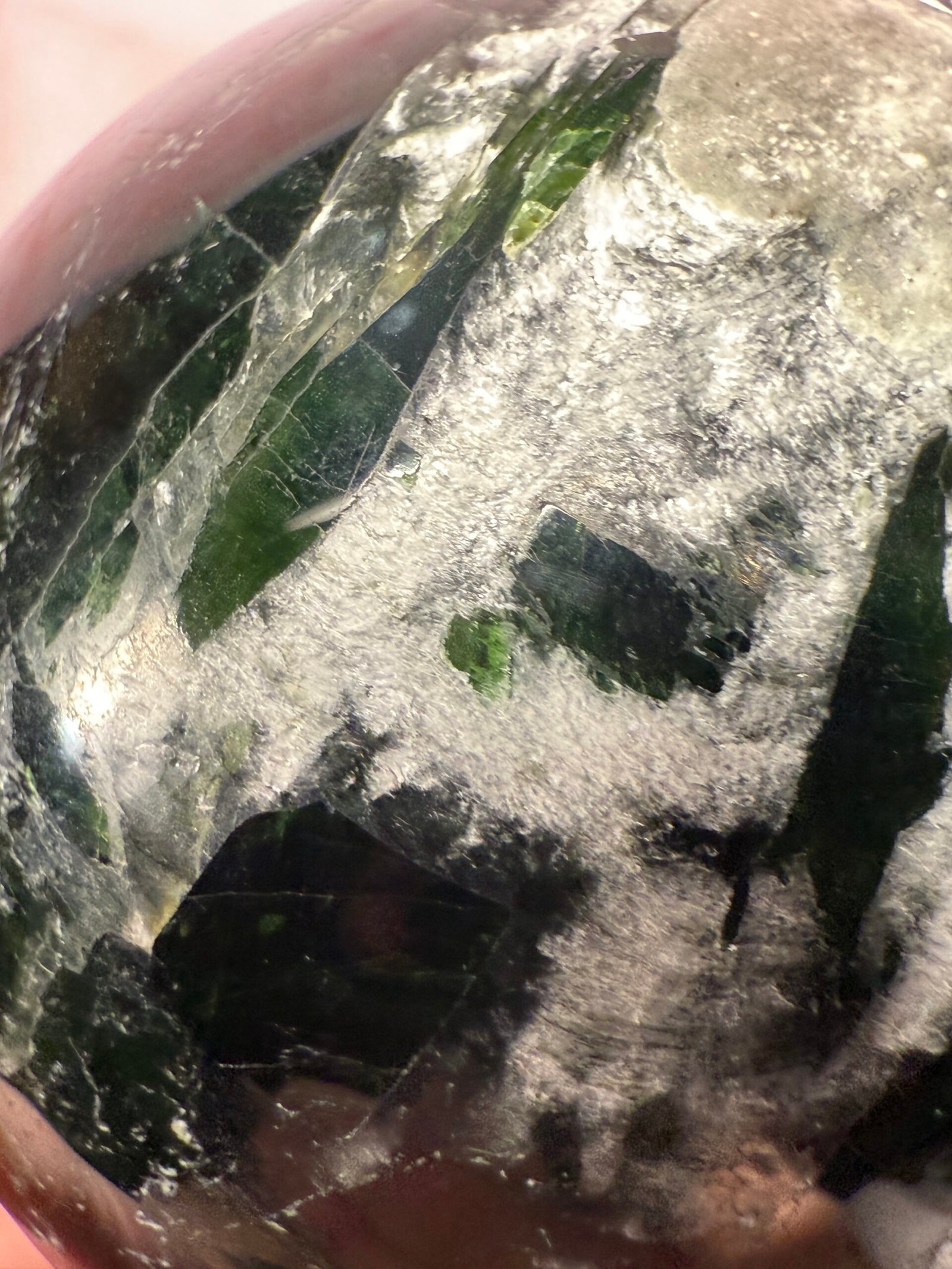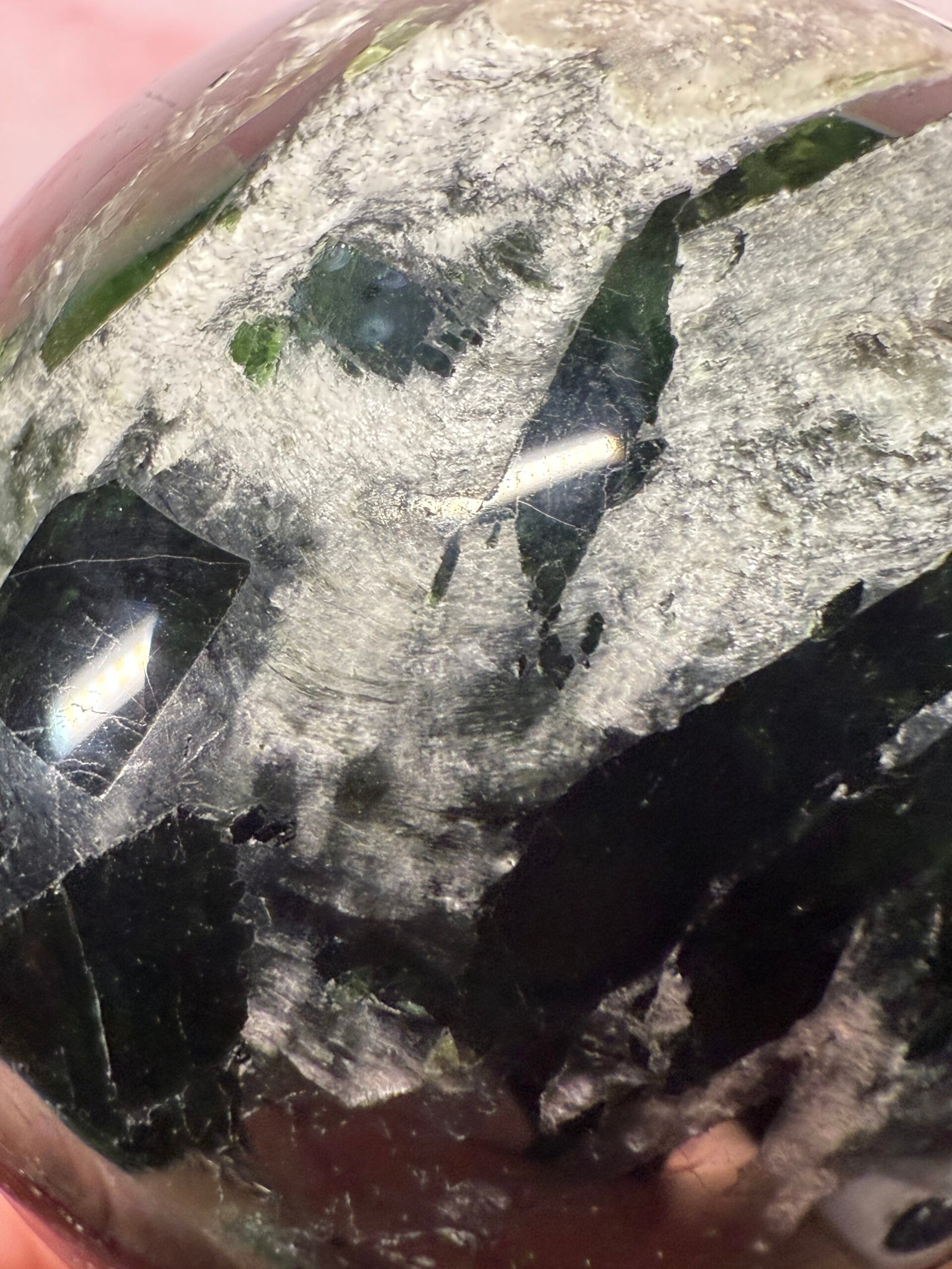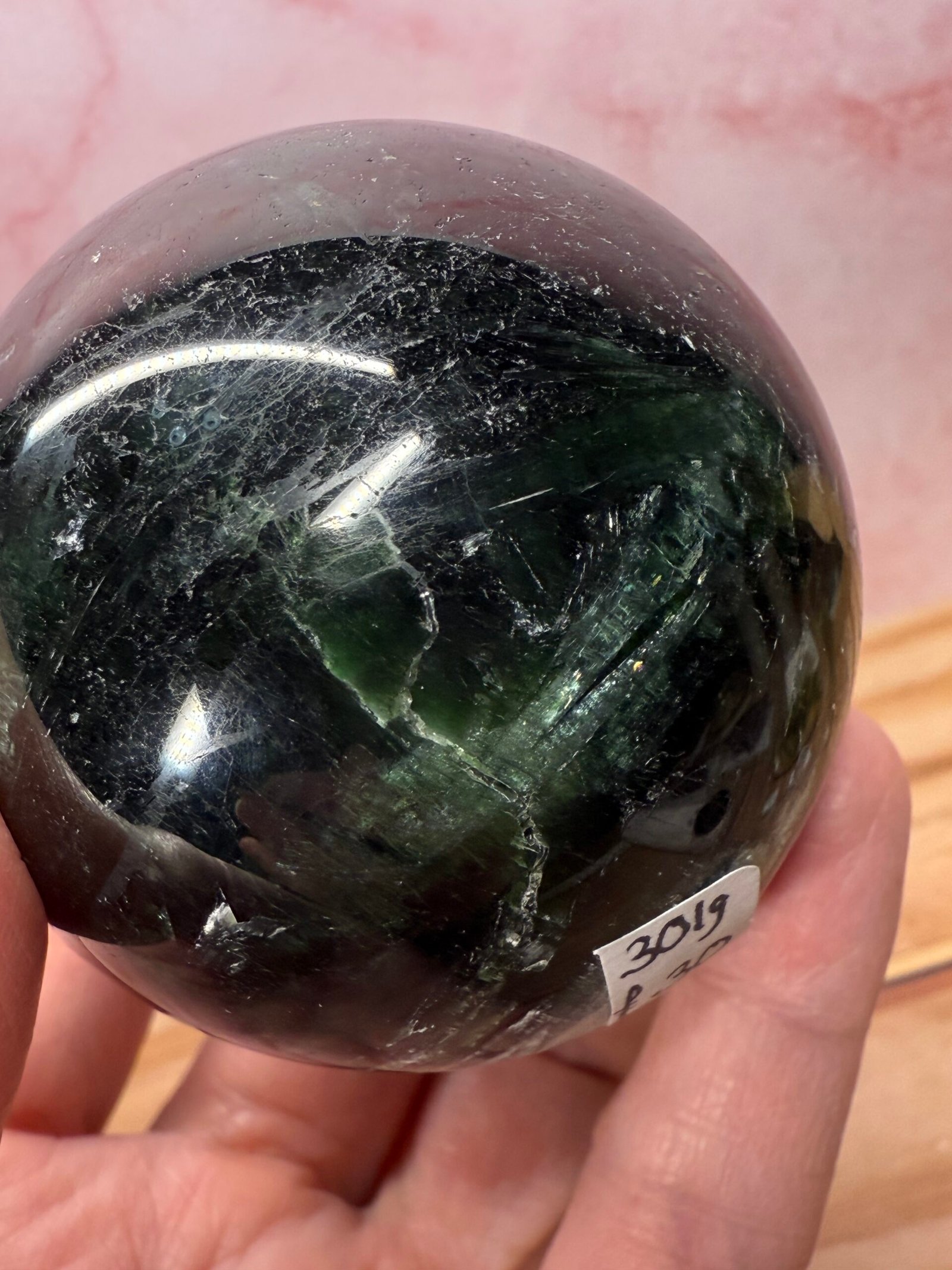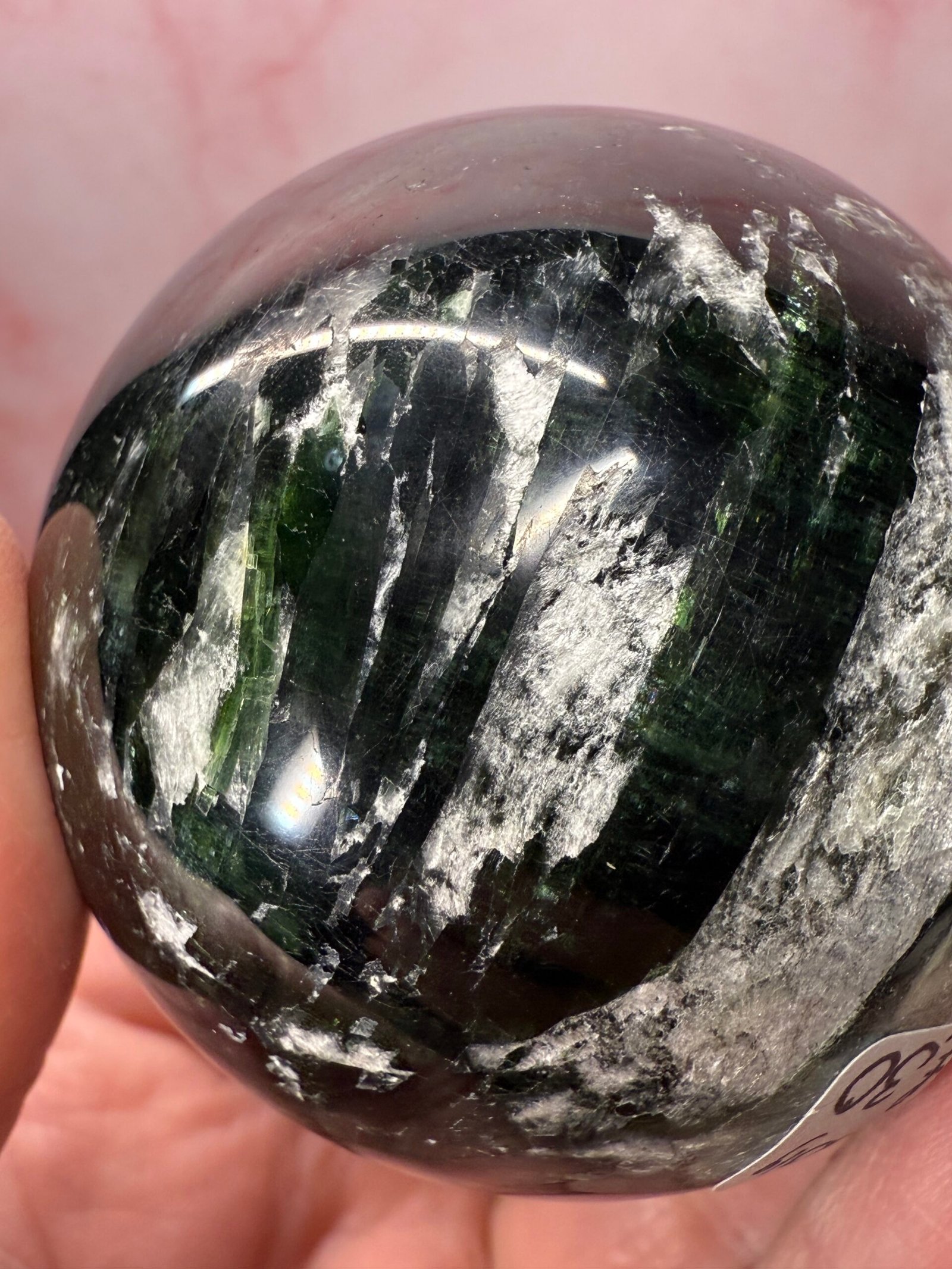With beautiful blades of chatoyant green, this is a lovely sphere.