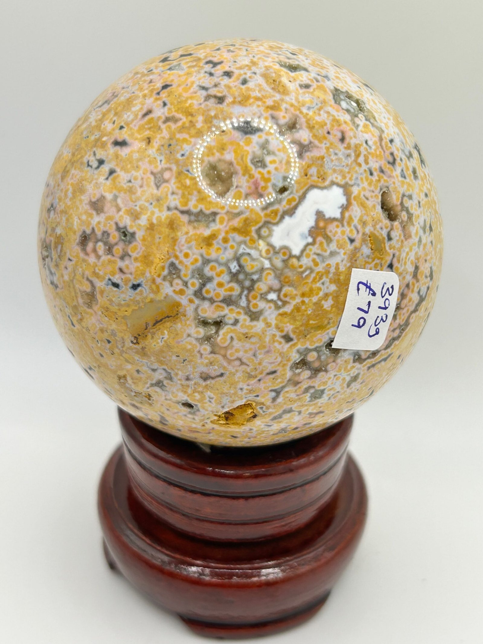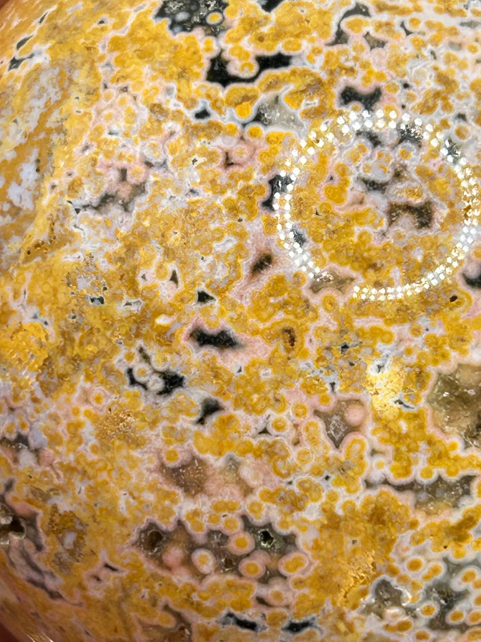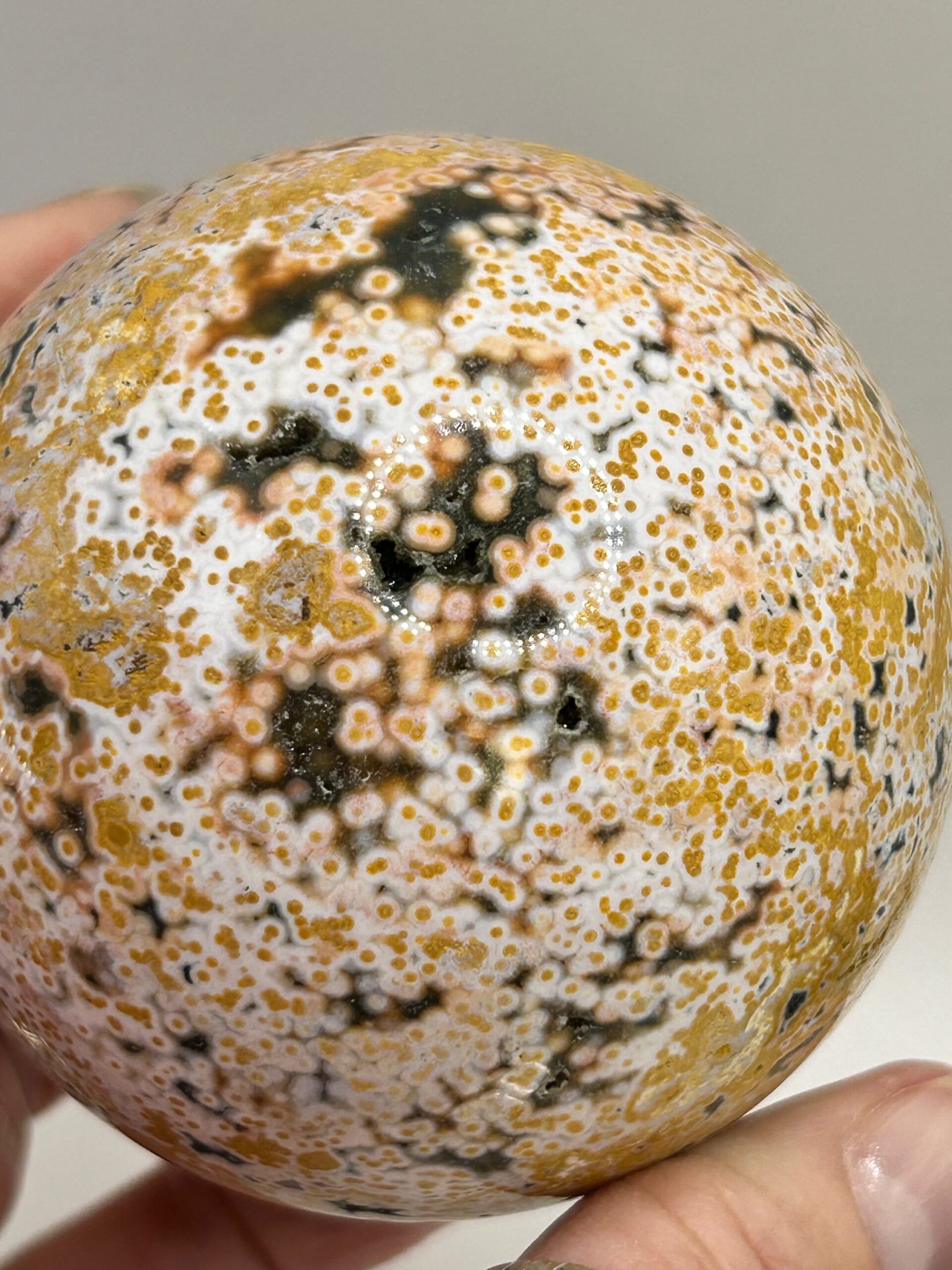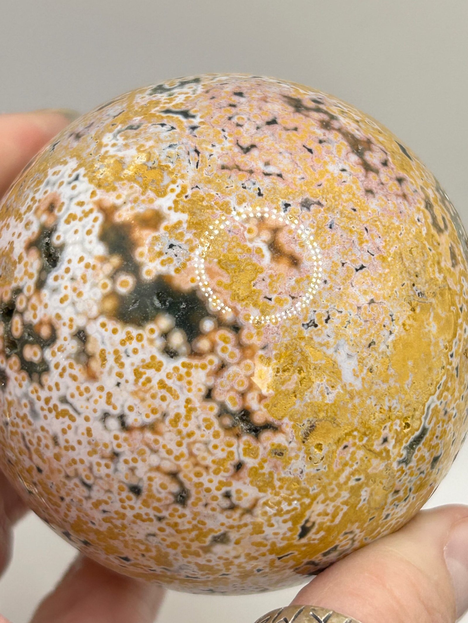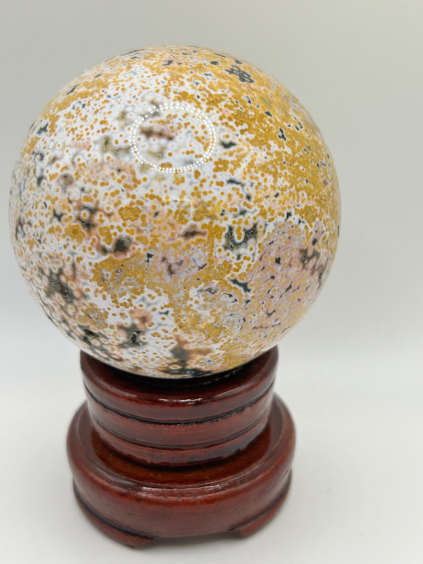 This beautiful high quality ocean Jasper sphere has amazing orbicular patterning and a beautiful colouring.