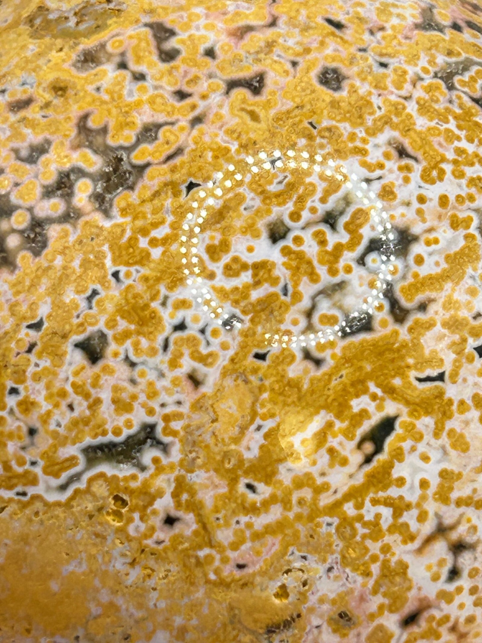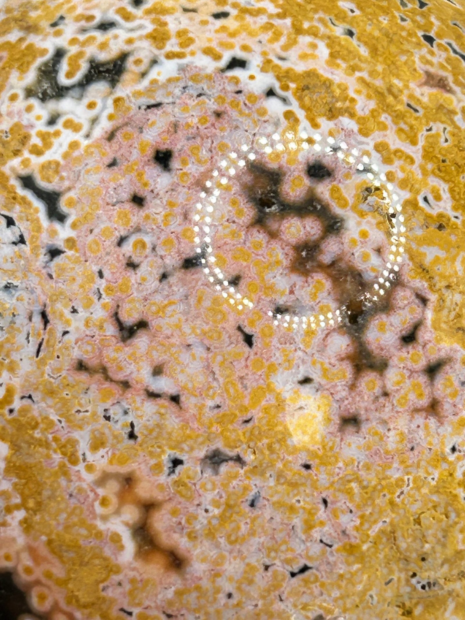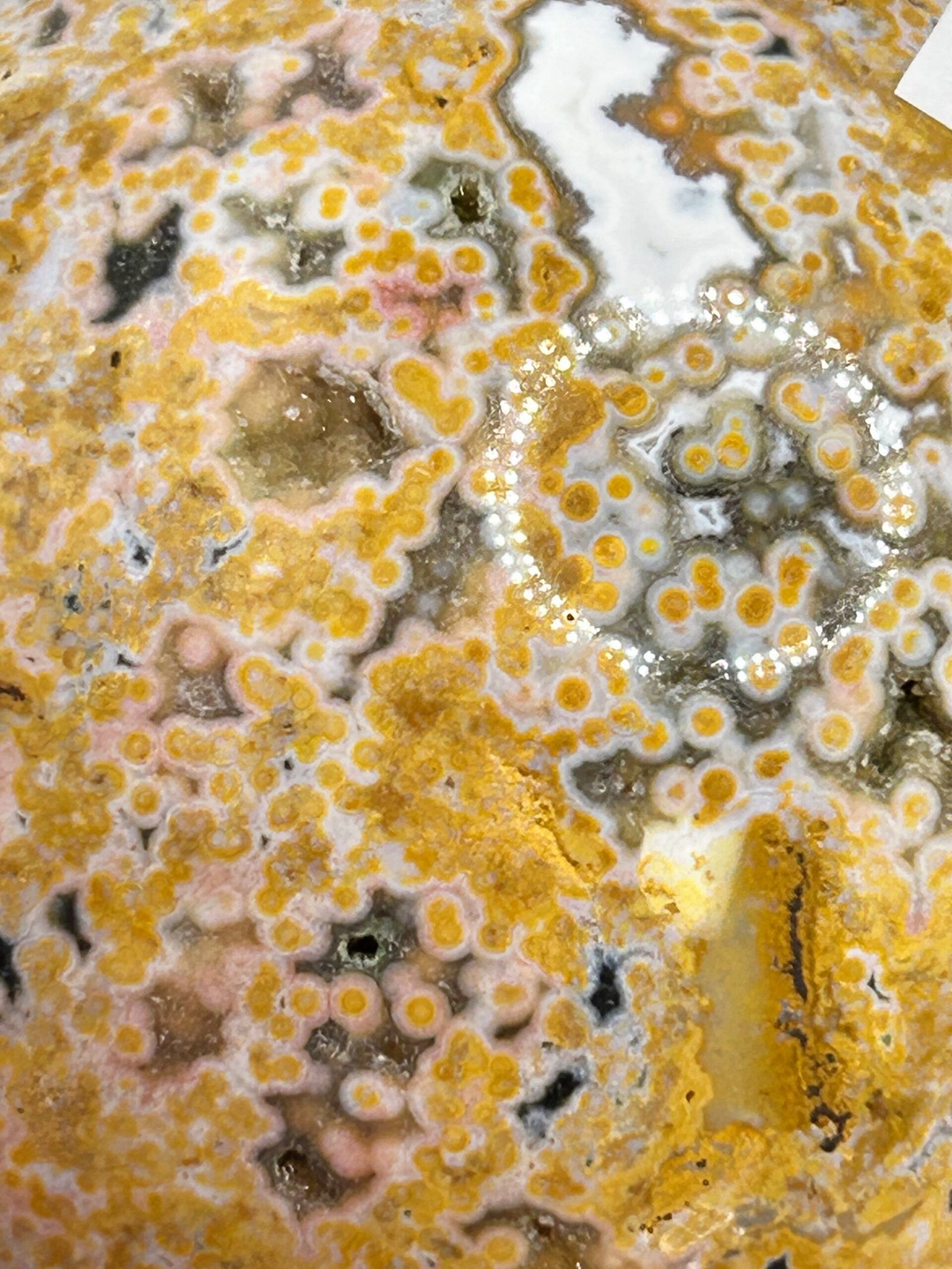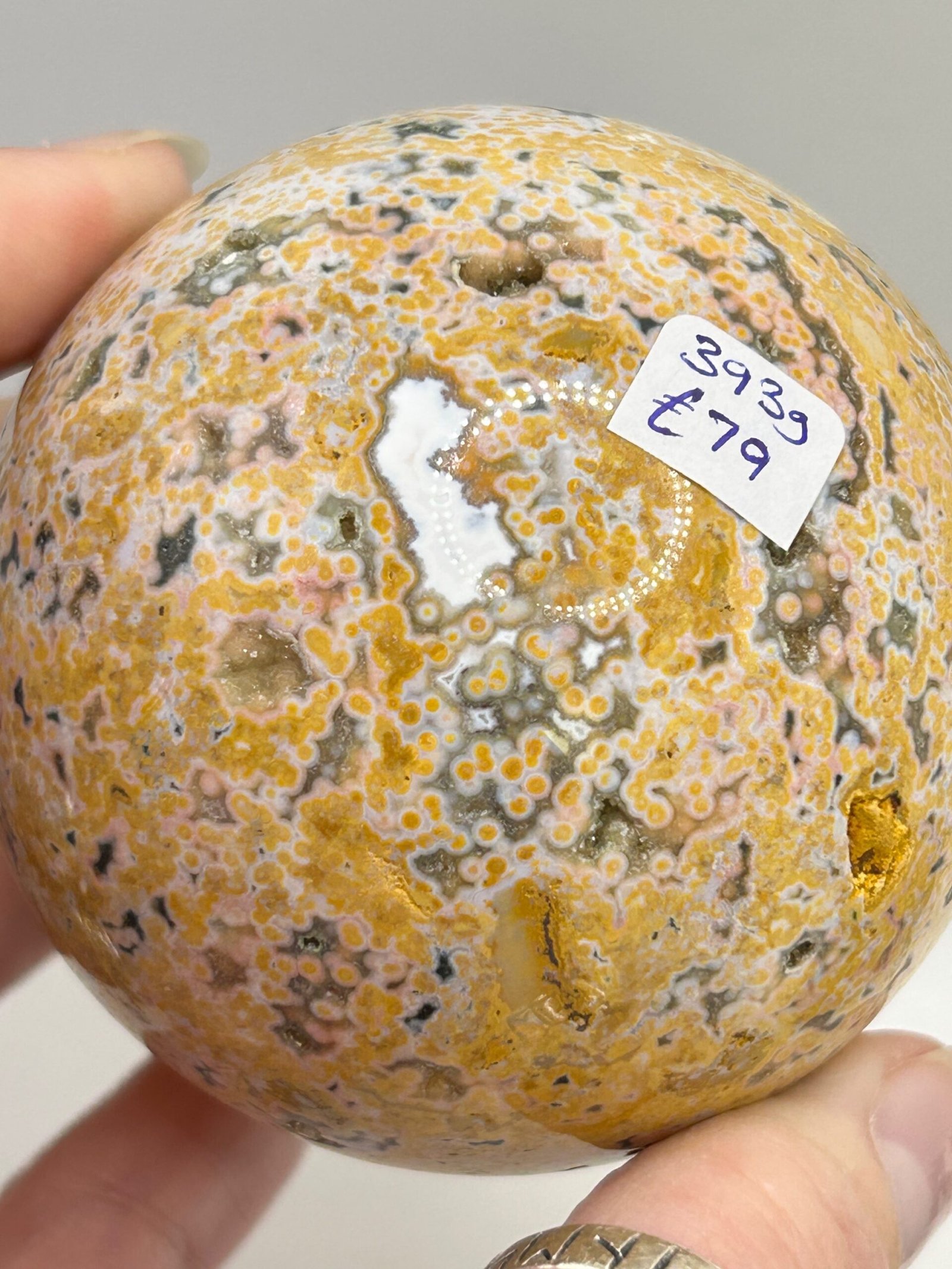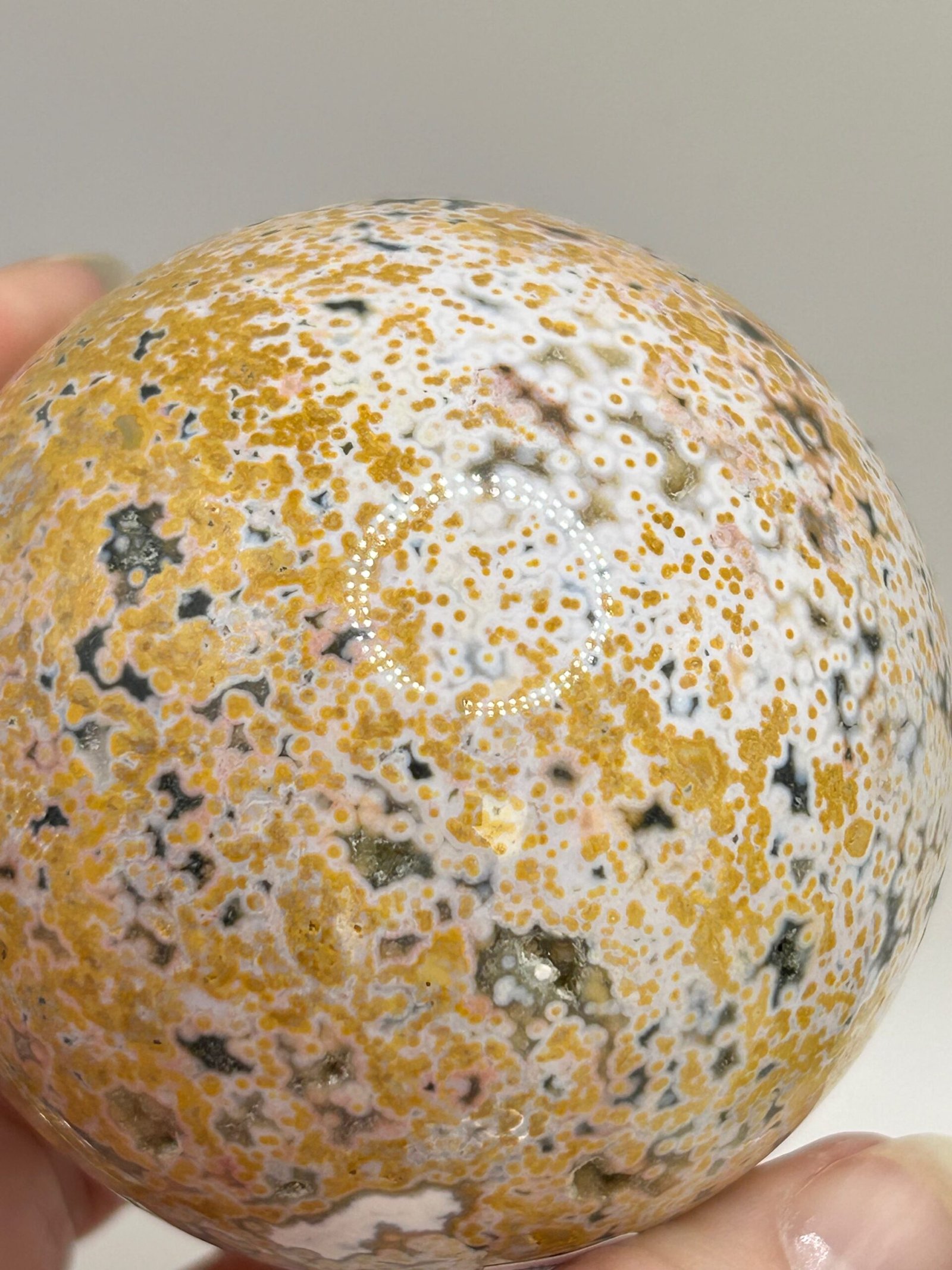 This beautiful high quality ocean Jasper sphere has amazing orbicular patterning and a beautiful colouring.