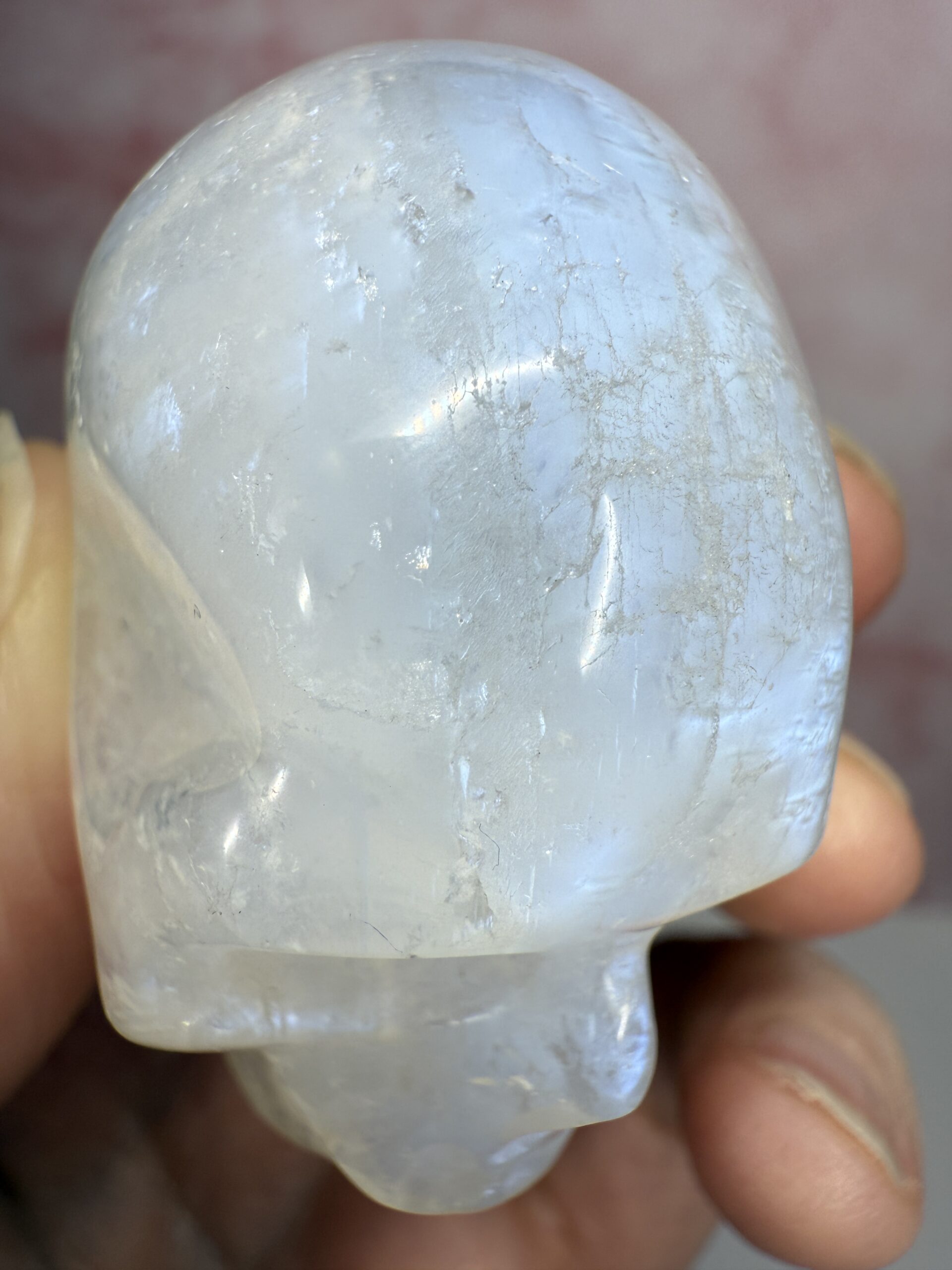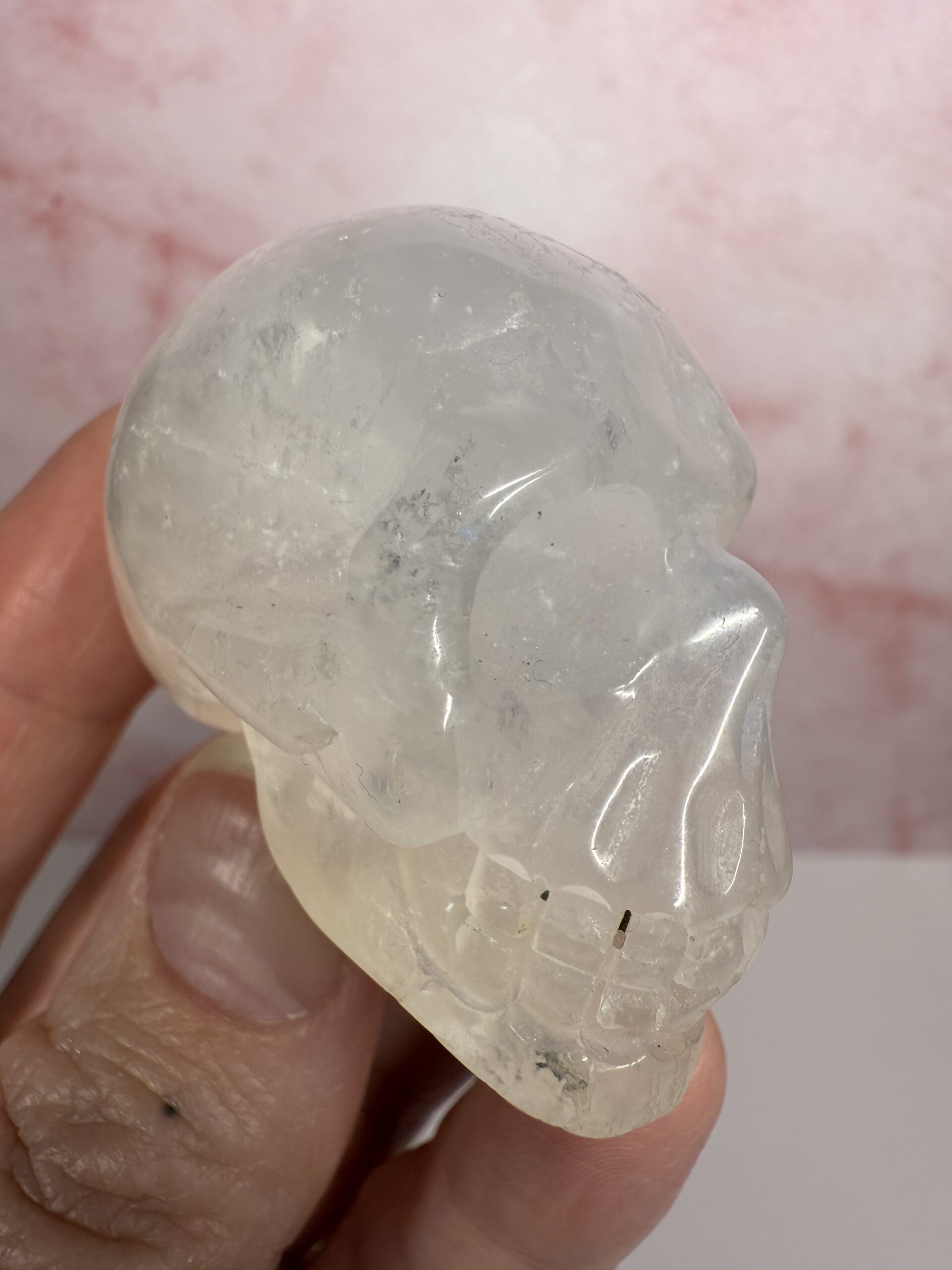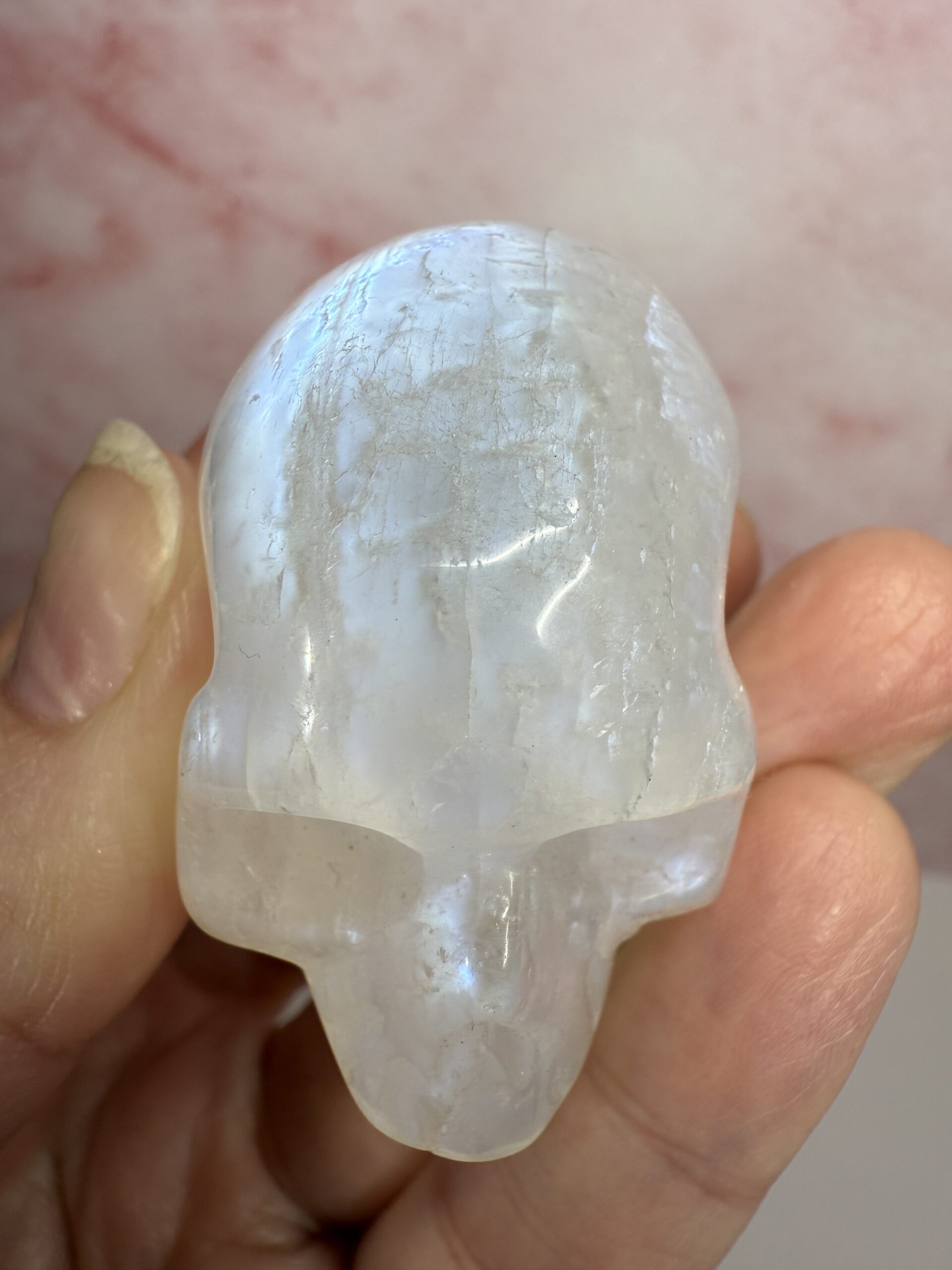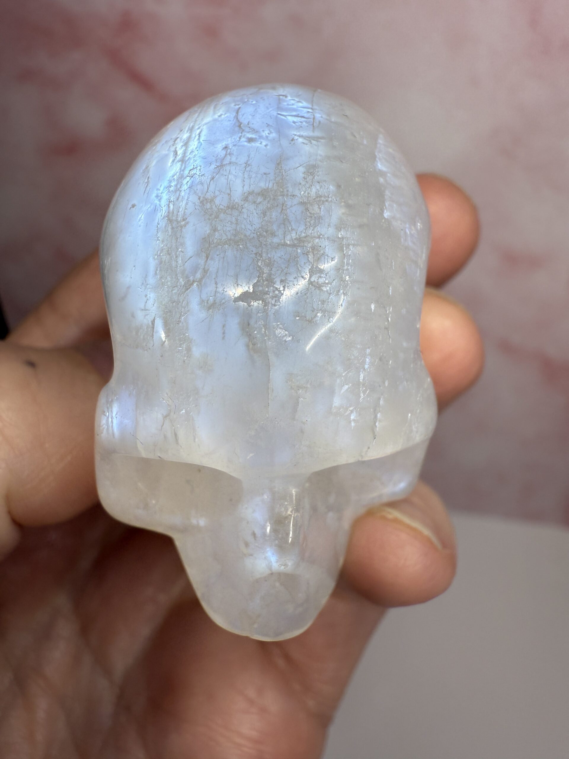 This small but mighty high quality white moonstone skull has a vibrant blue flash. Beautifully carved, with stunning blue flash and shimmering white, a fabulous addition to a skull collection.