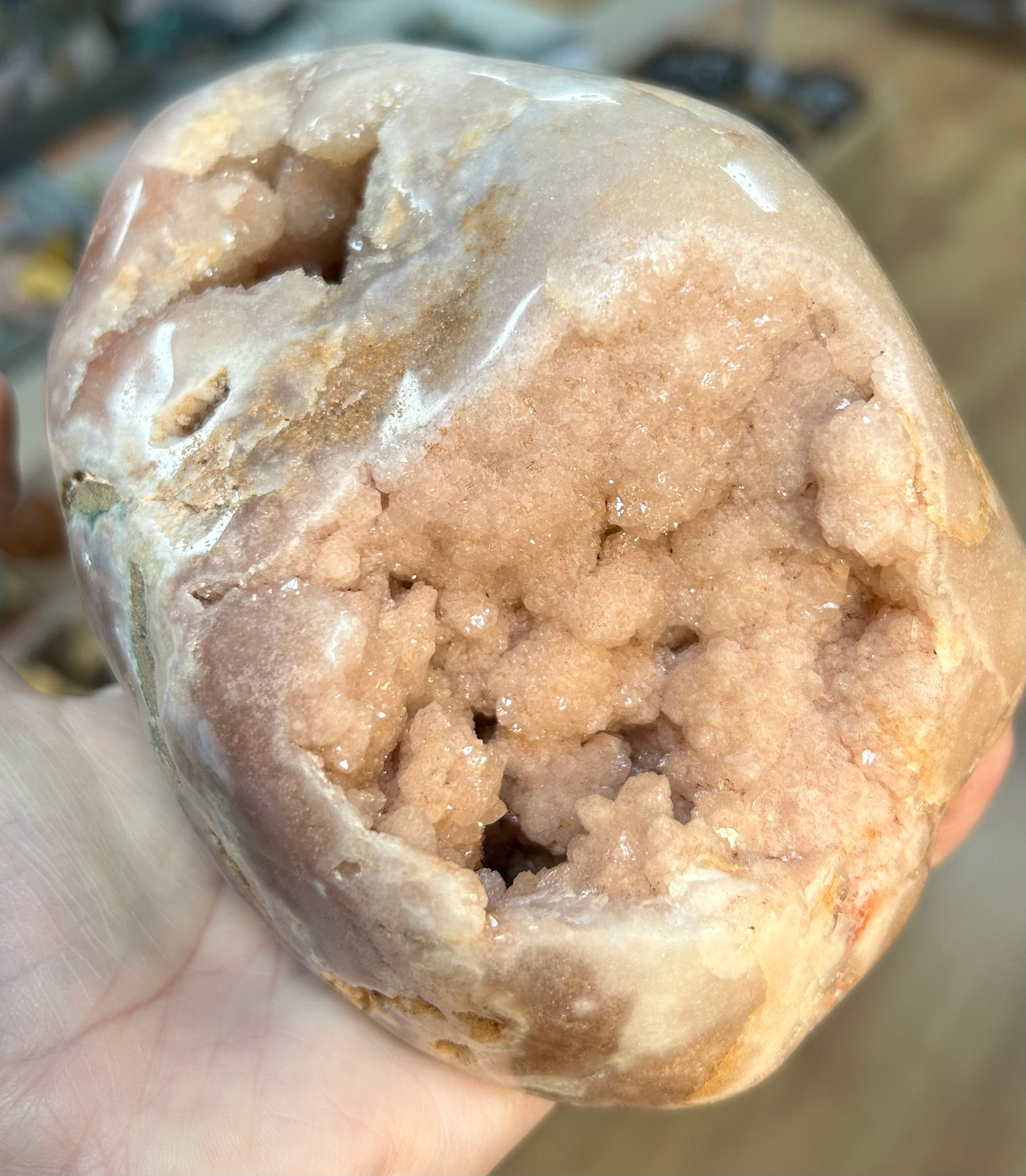 This beautiful freeform is a wonderful soft pink. It’s packed with druse pockets and looks stunning from all sides. The green jasper banding adds a pop of colour, which enhances that wonderful pink.