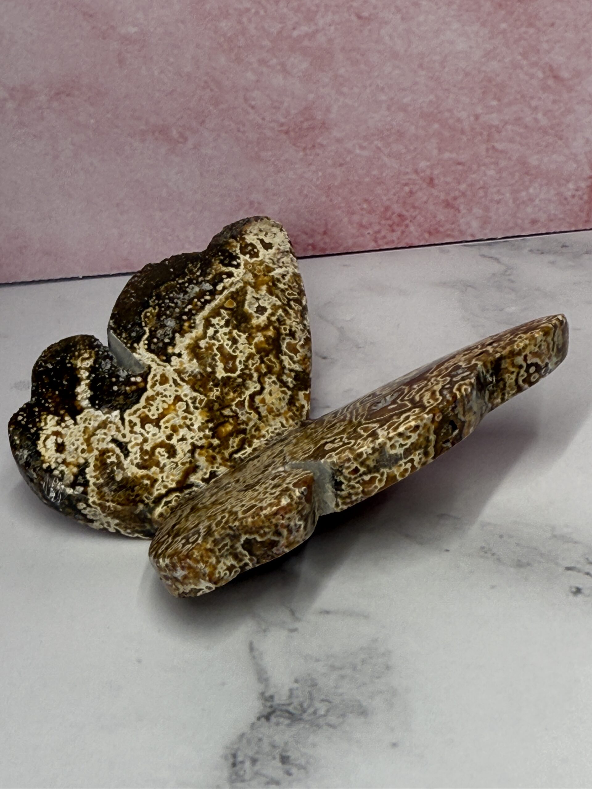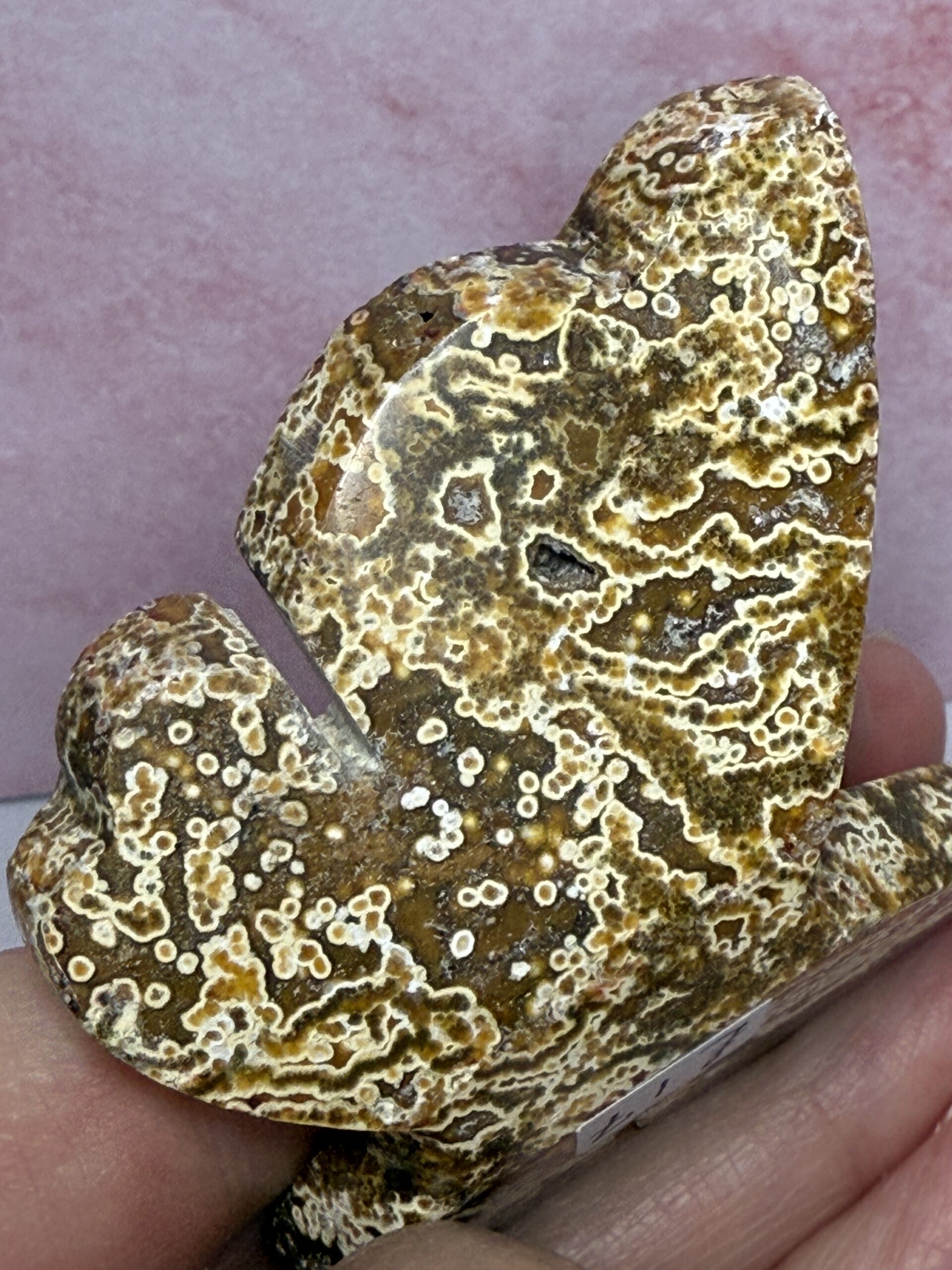 Beautiful orbicular sea Jasper (know as ocean Jasper, which is just a trade name for a similar material found in Madagascar) 3D butterfly. This handcrafted butterfly is cut flat at the bottom to allow it to free stand. Gorgeous colours and patterns.