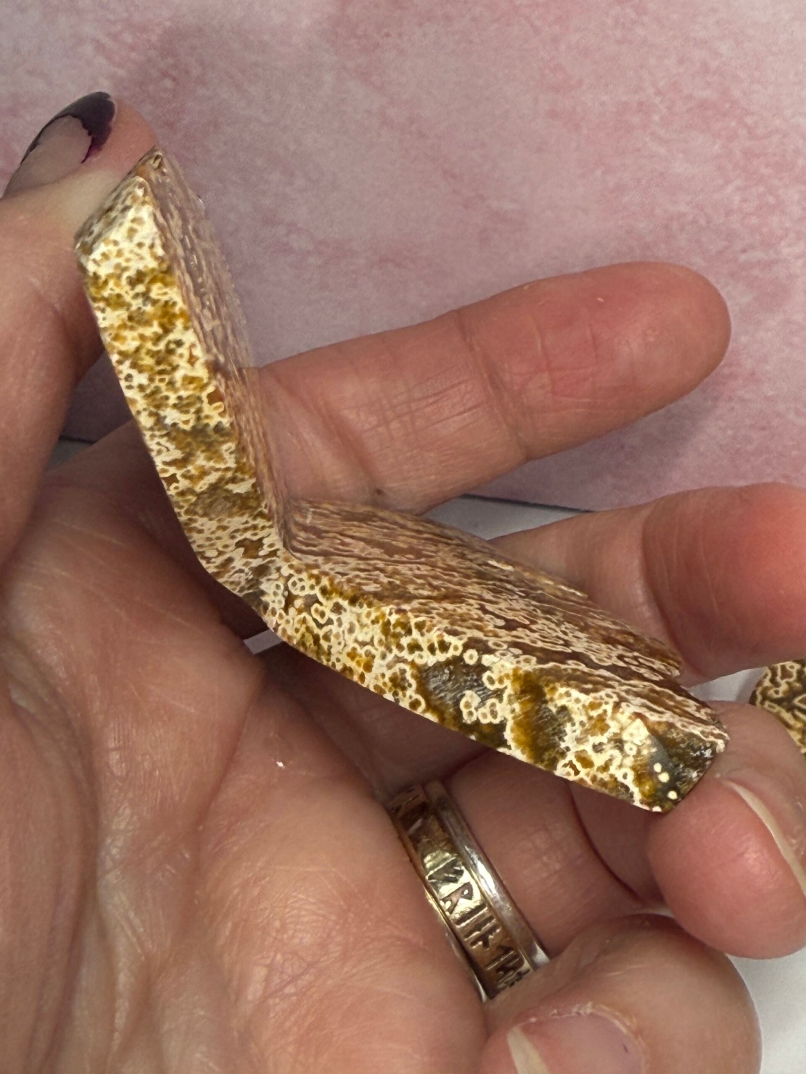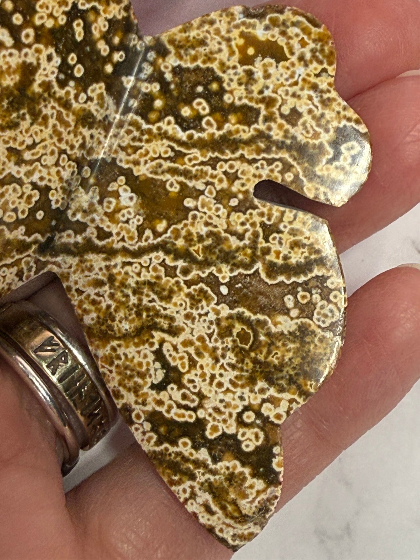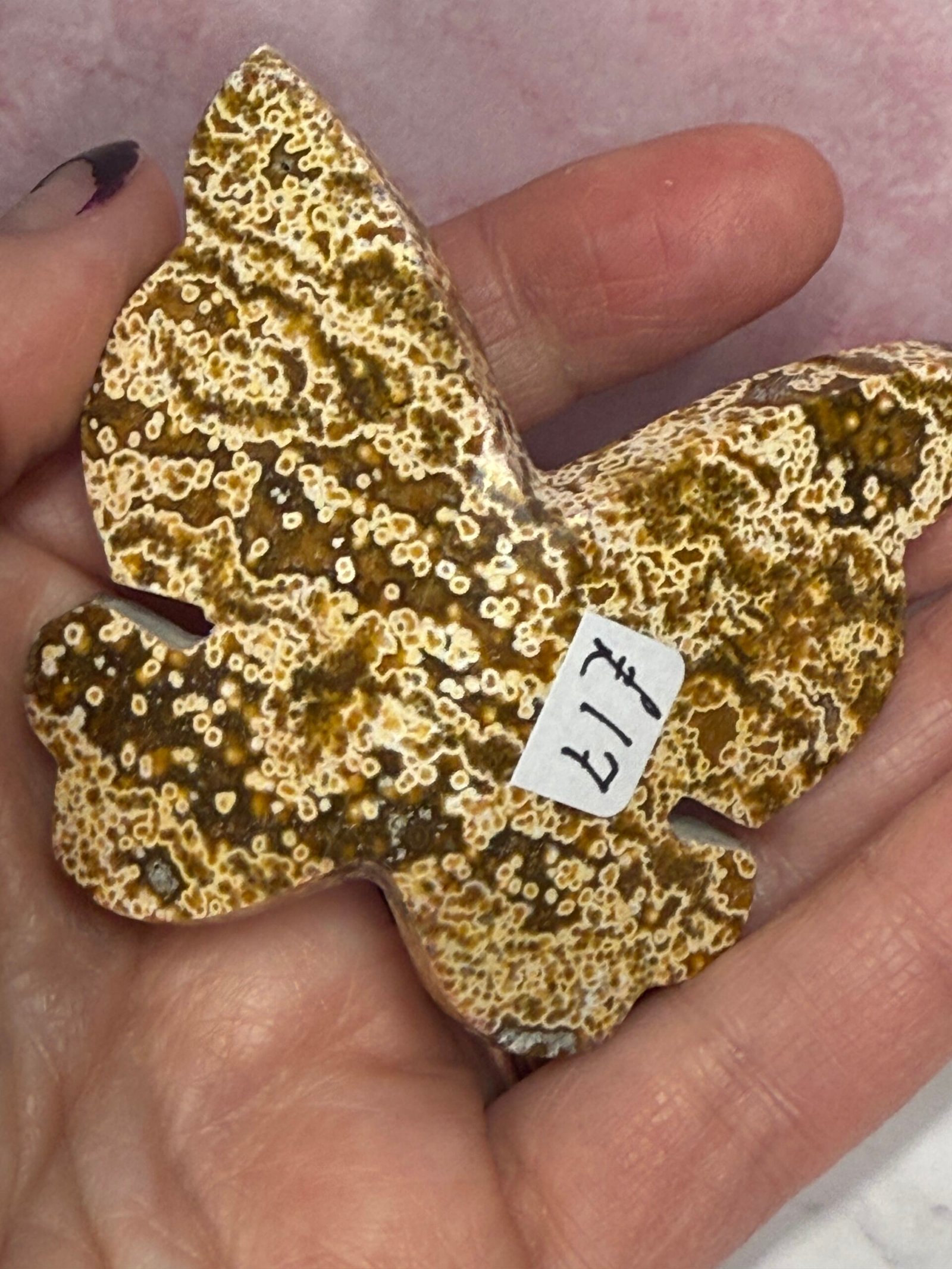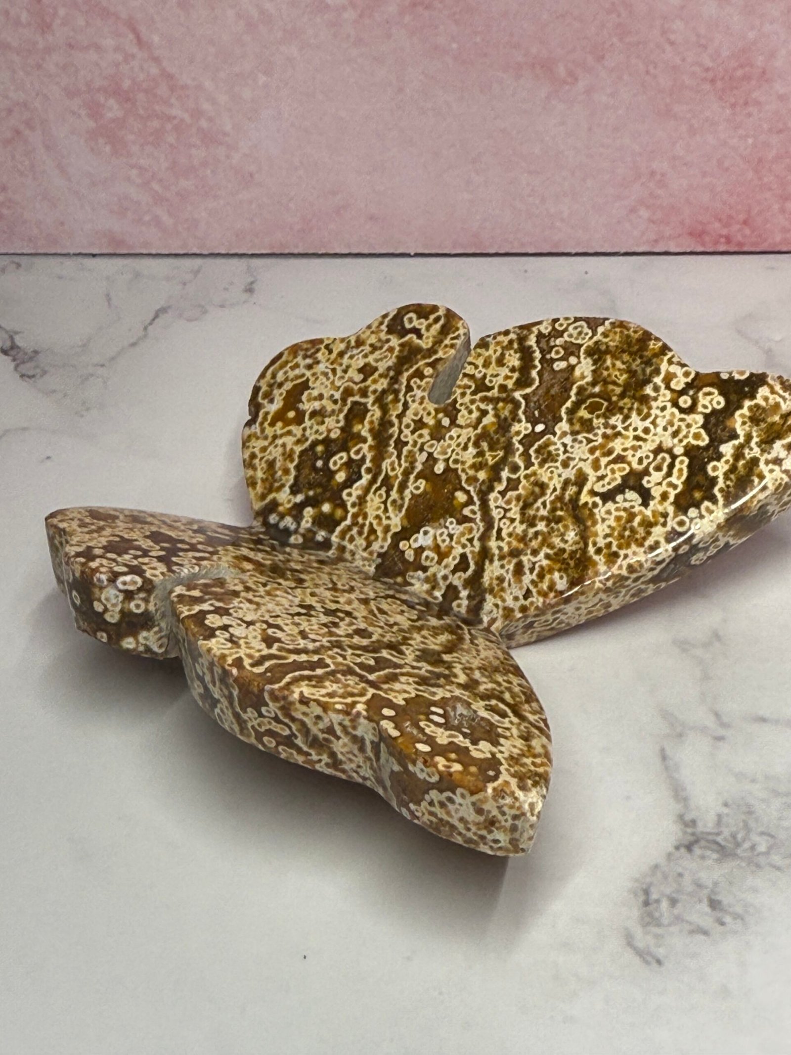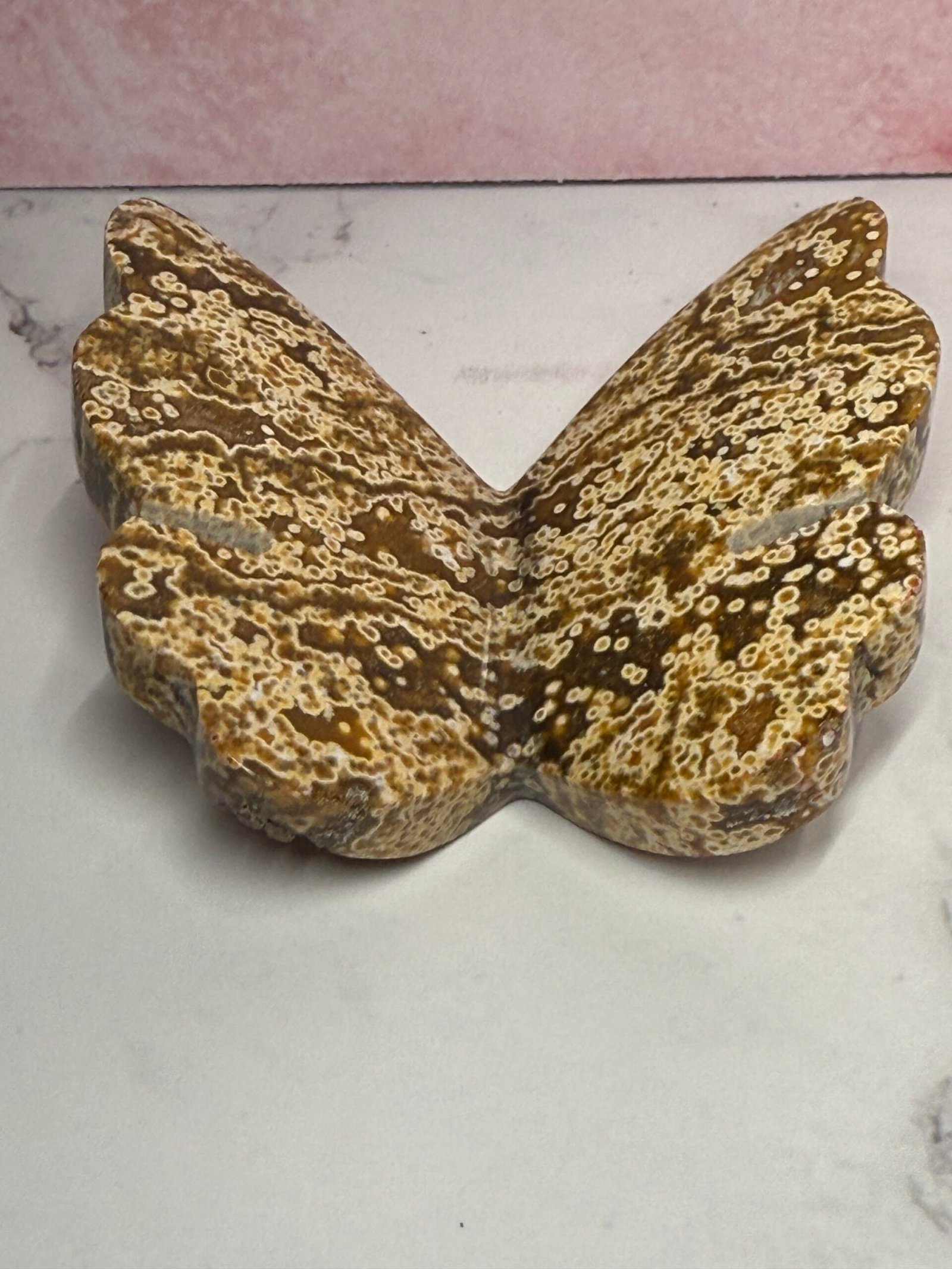 Beautiful orbicular sea Jasper (know as ocean Jasper, which is just a trade name for a similar material found in Madagascar) 3D butterfly. This handcrafted butterfly is cut flat at the bottom to allow it to free stand. Gorgeous colours and patterns.