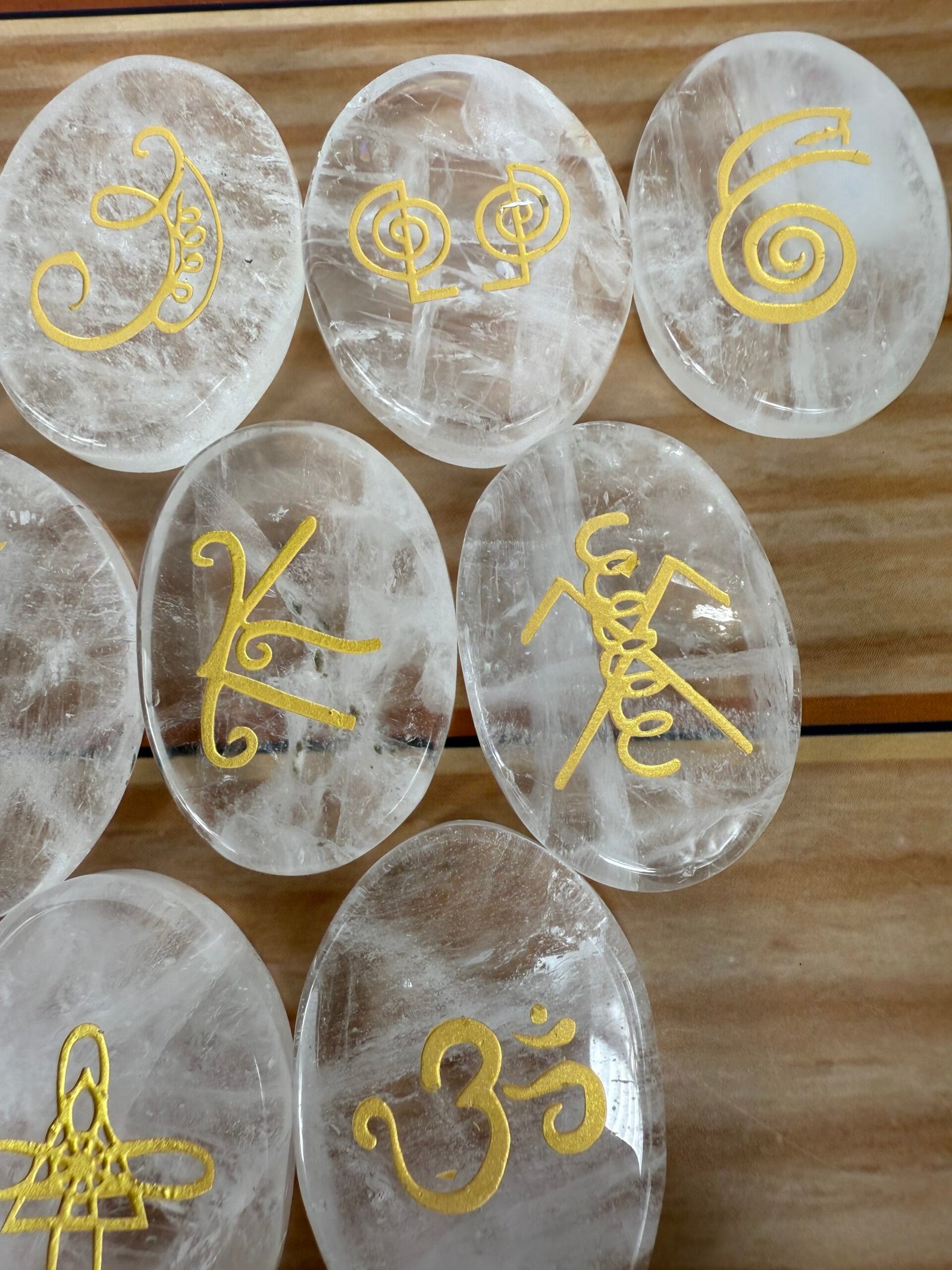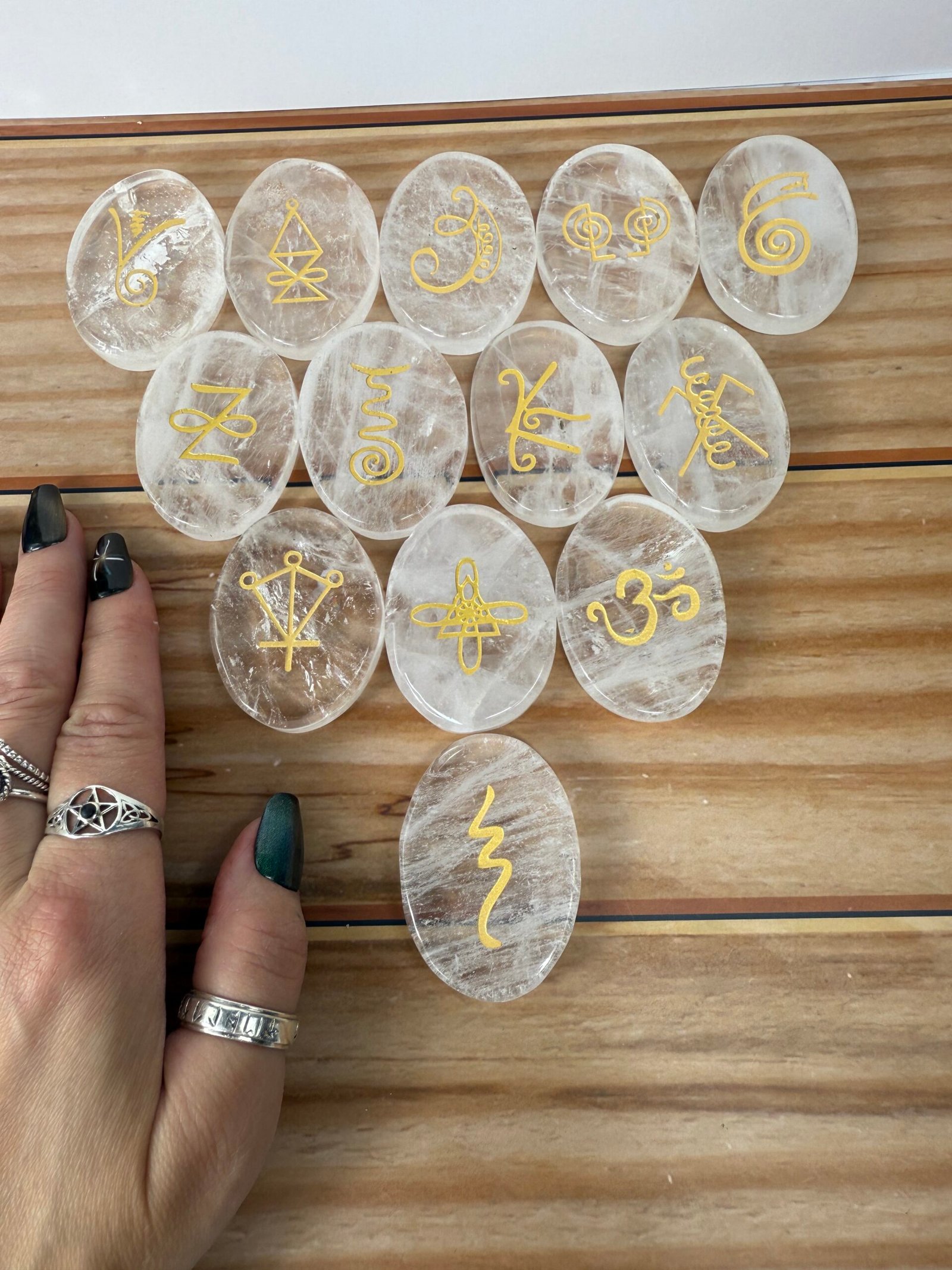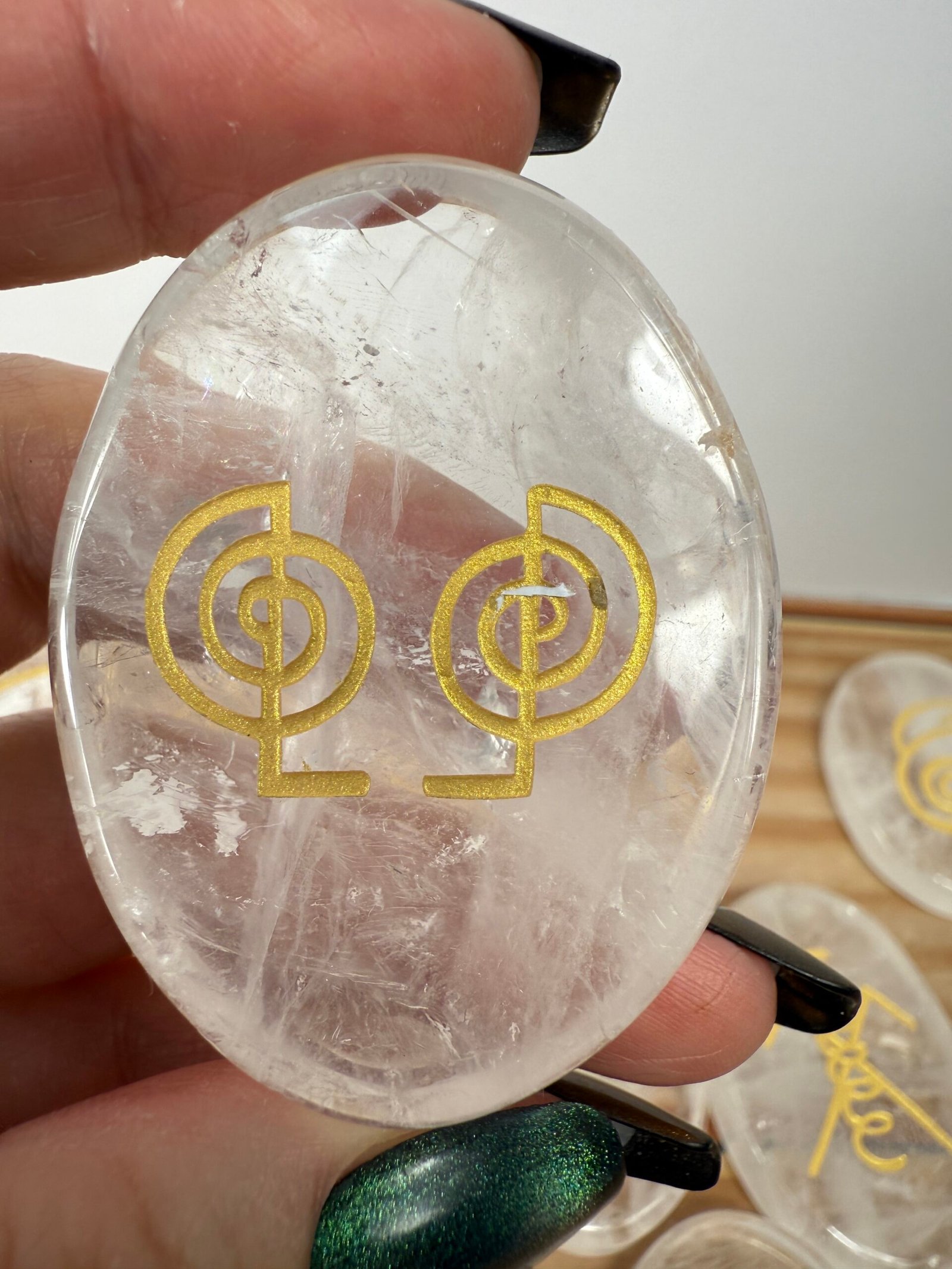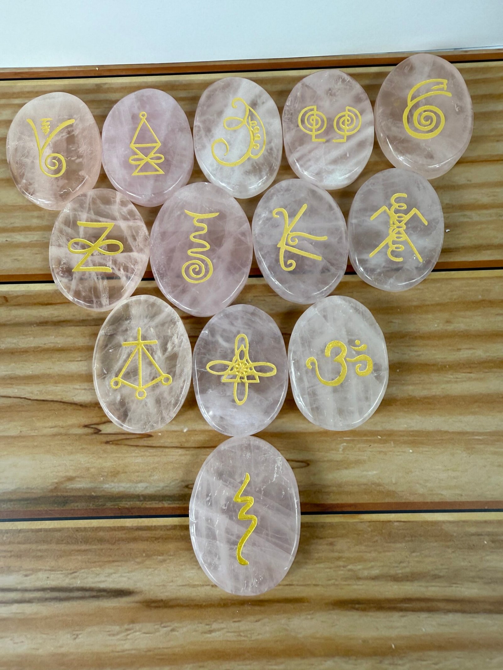 A set of 13 high quality rose quartz or high quality clear quartz flat palm stones, engraved with the Karuna reiki symbols.