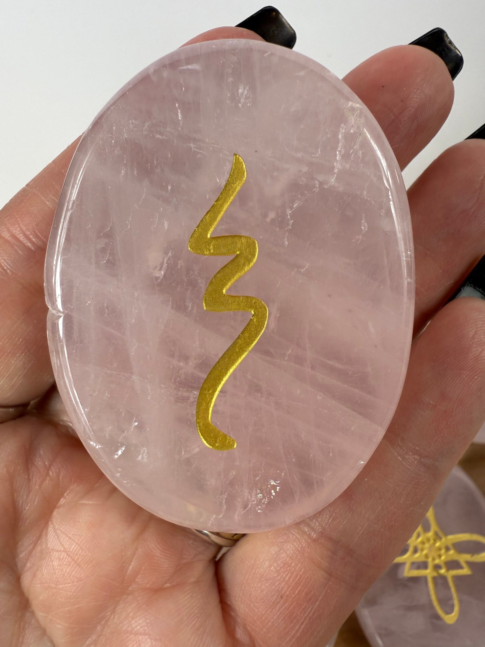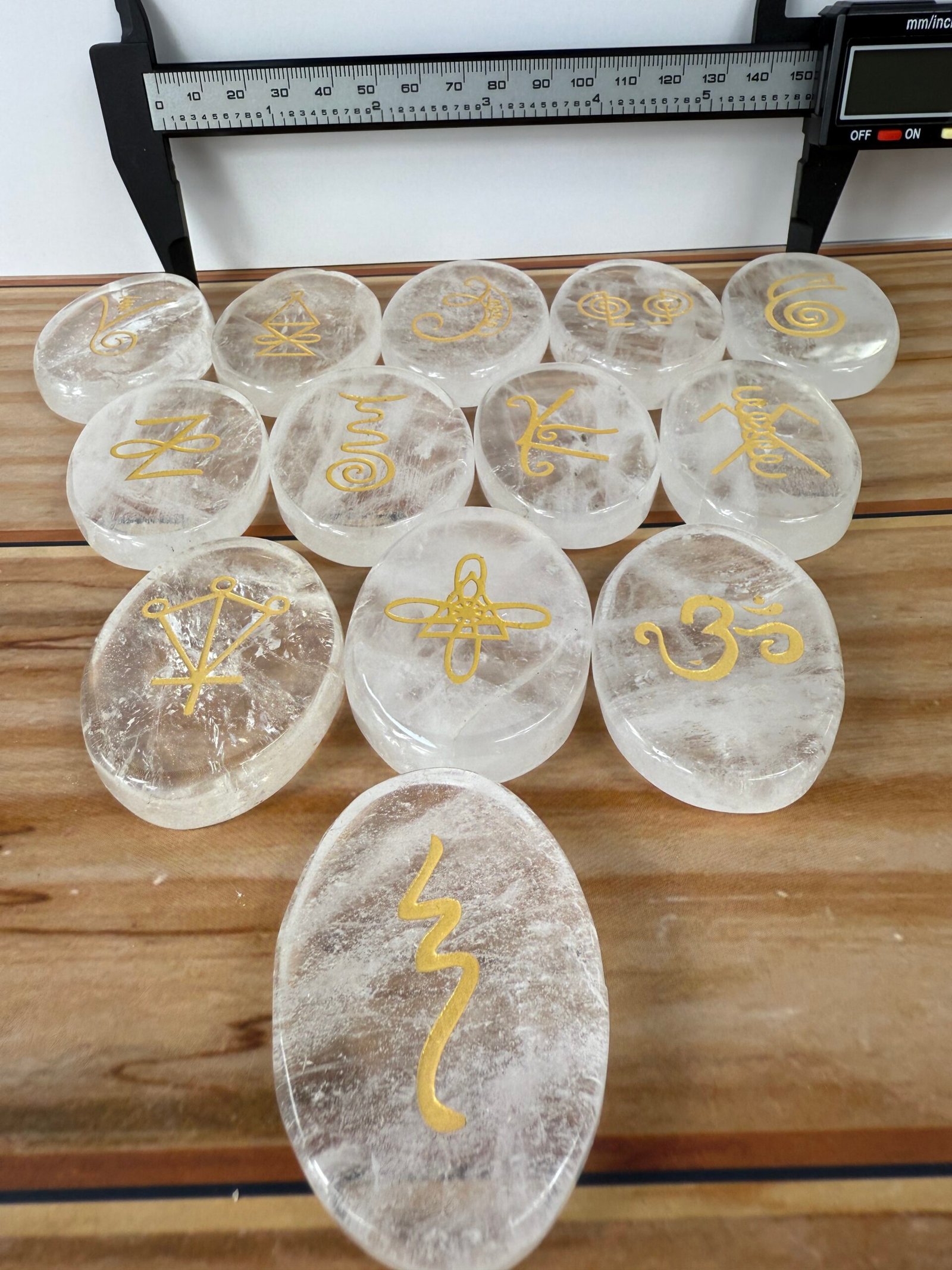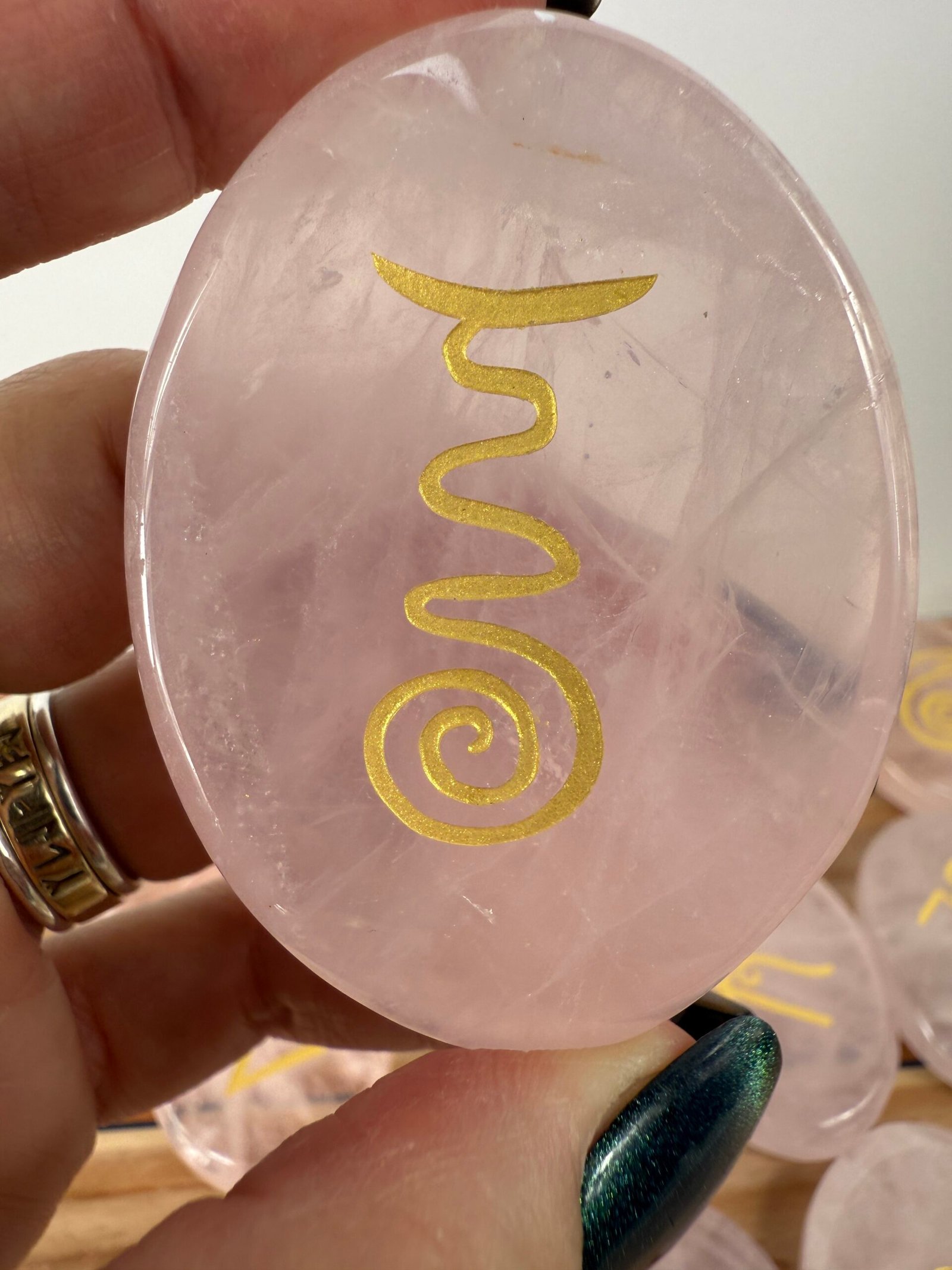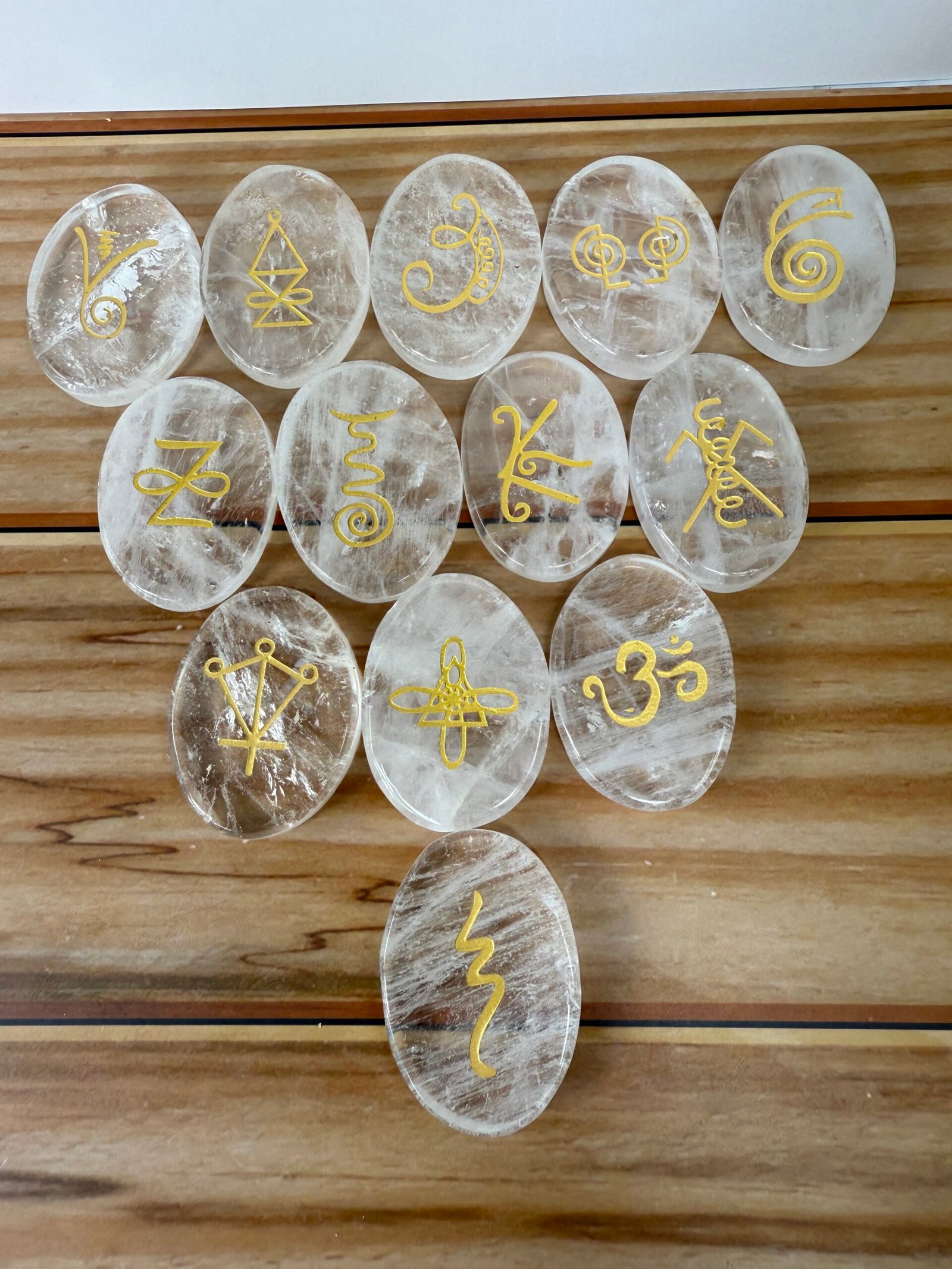 A set of 13 high quality rose quartz or high quality clear quartz flat palm stones, engraved with the Karuna reiki symbols.